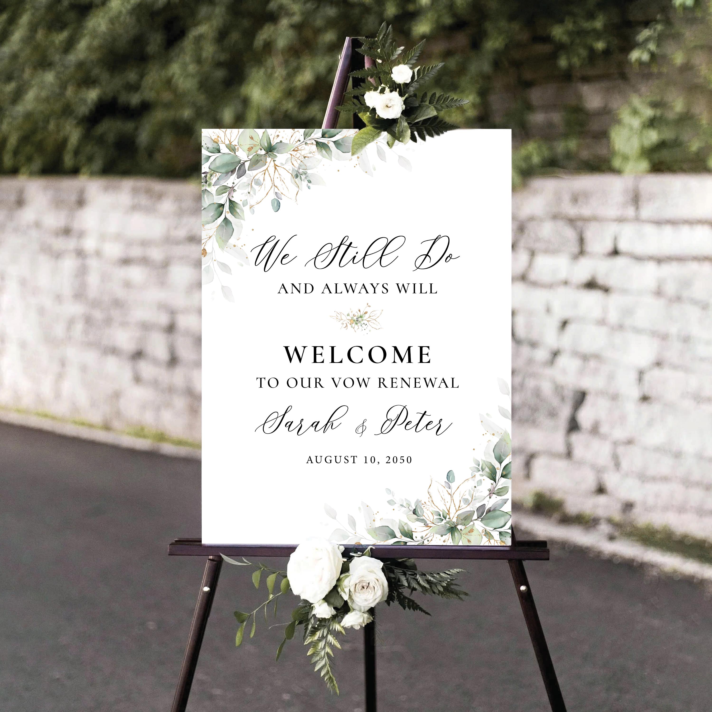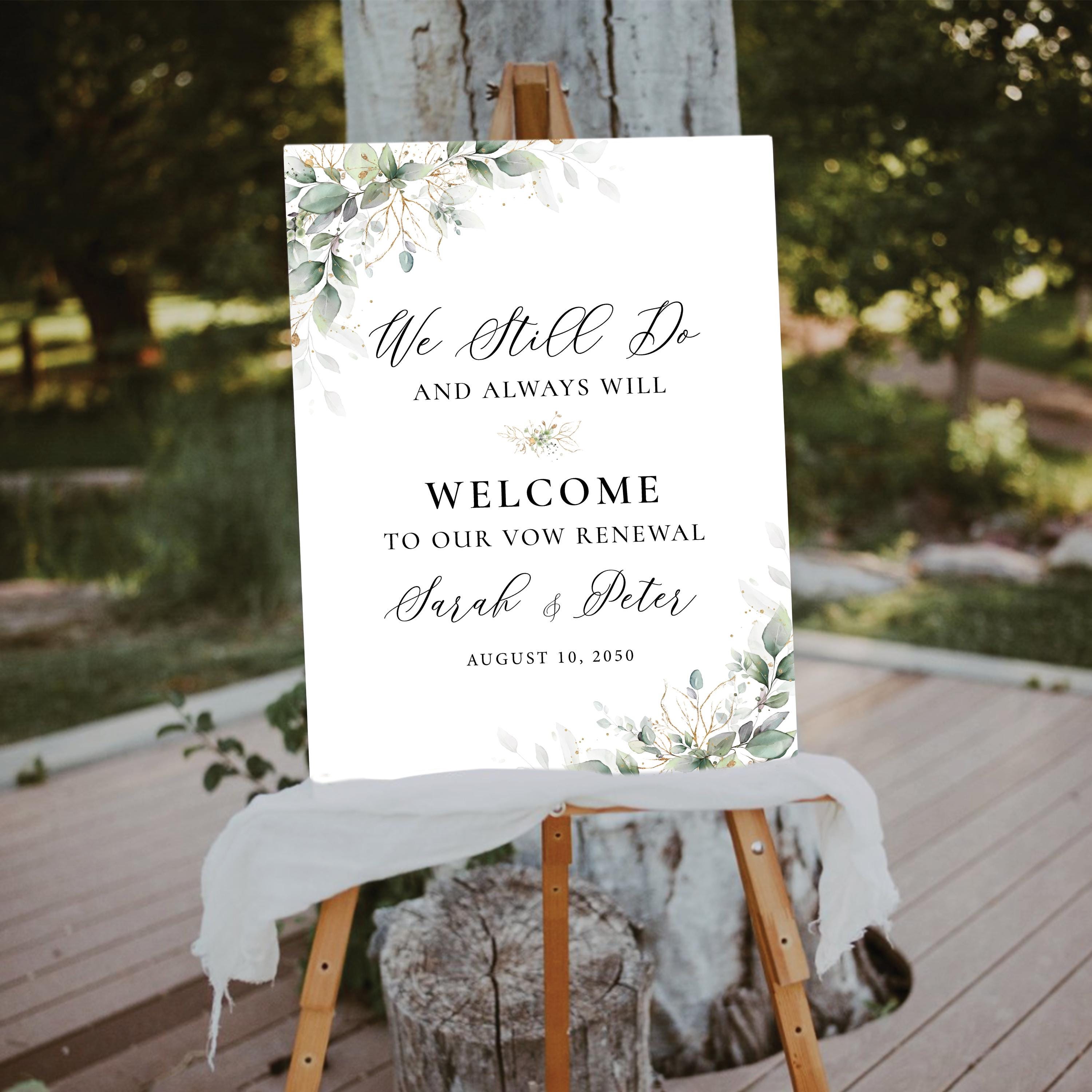 Celebrate your special moments with our "We Still Do" printable sign, perfect for your wedding vow renewal or anniversary party. Featuring a beautiful greenery design, this welcome sign is personalized with your party details and styled with an elegant script font.
