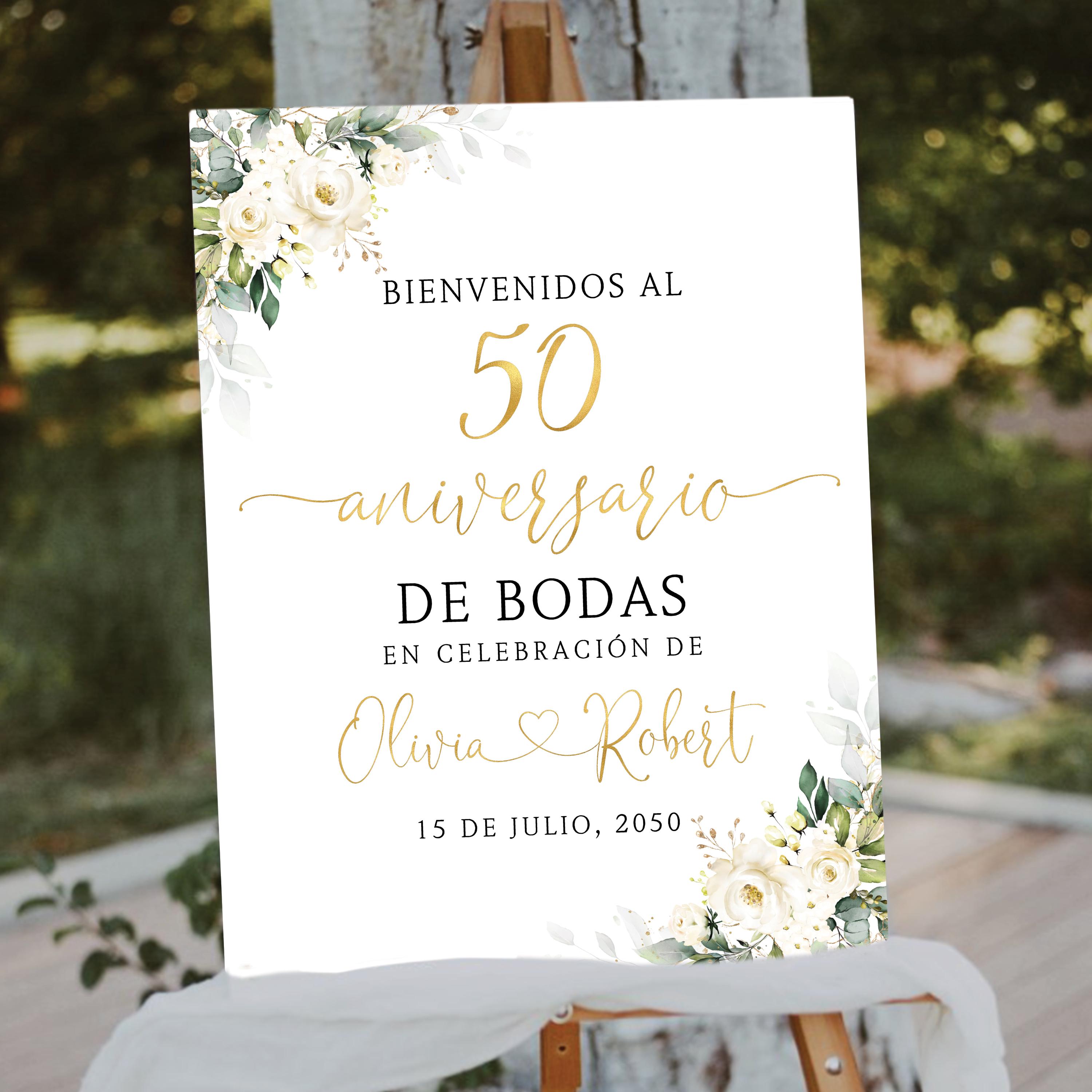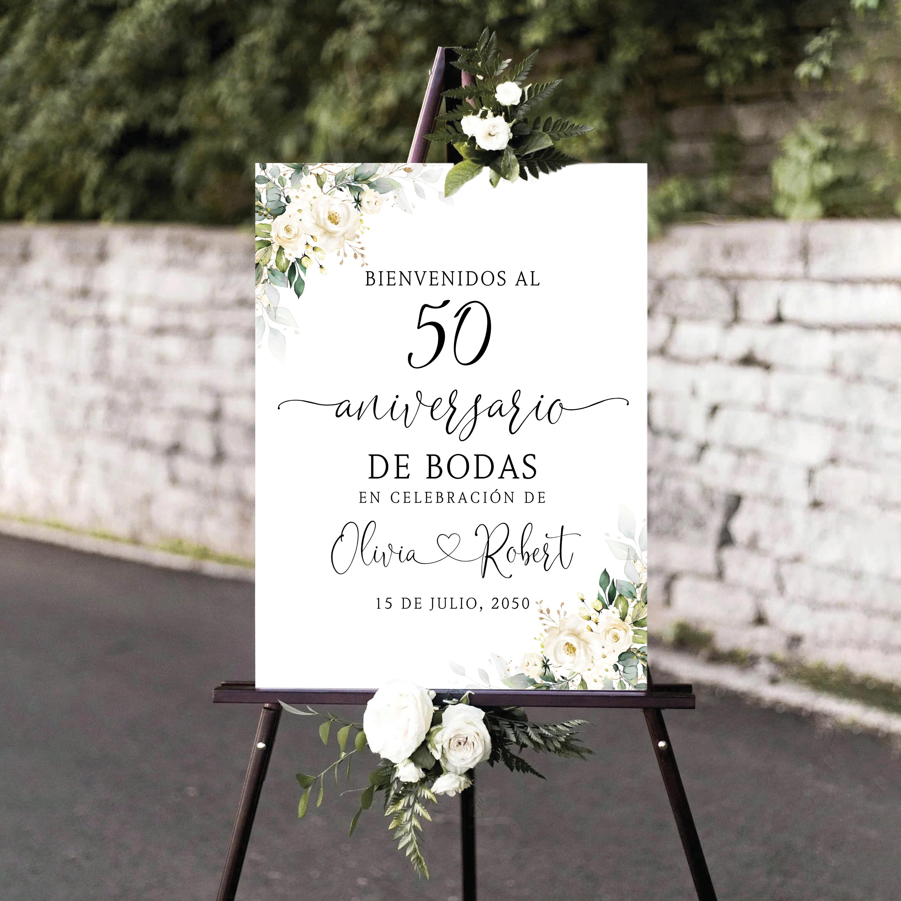 The Floral Spanish 50th Anniversary Welcome Sign features an elegant and warm design with delicate white flowers paired with fresh eucalyptus greenery, creating a refined and welcoming atmosphere for your 50th anniversary celebration. The soft handwritten font adds a romantic and personal touch while allowing easy customization with your event details. This sign is provided as a high quality digital file, making it convenient to print and display for a truly memorable anniversary.