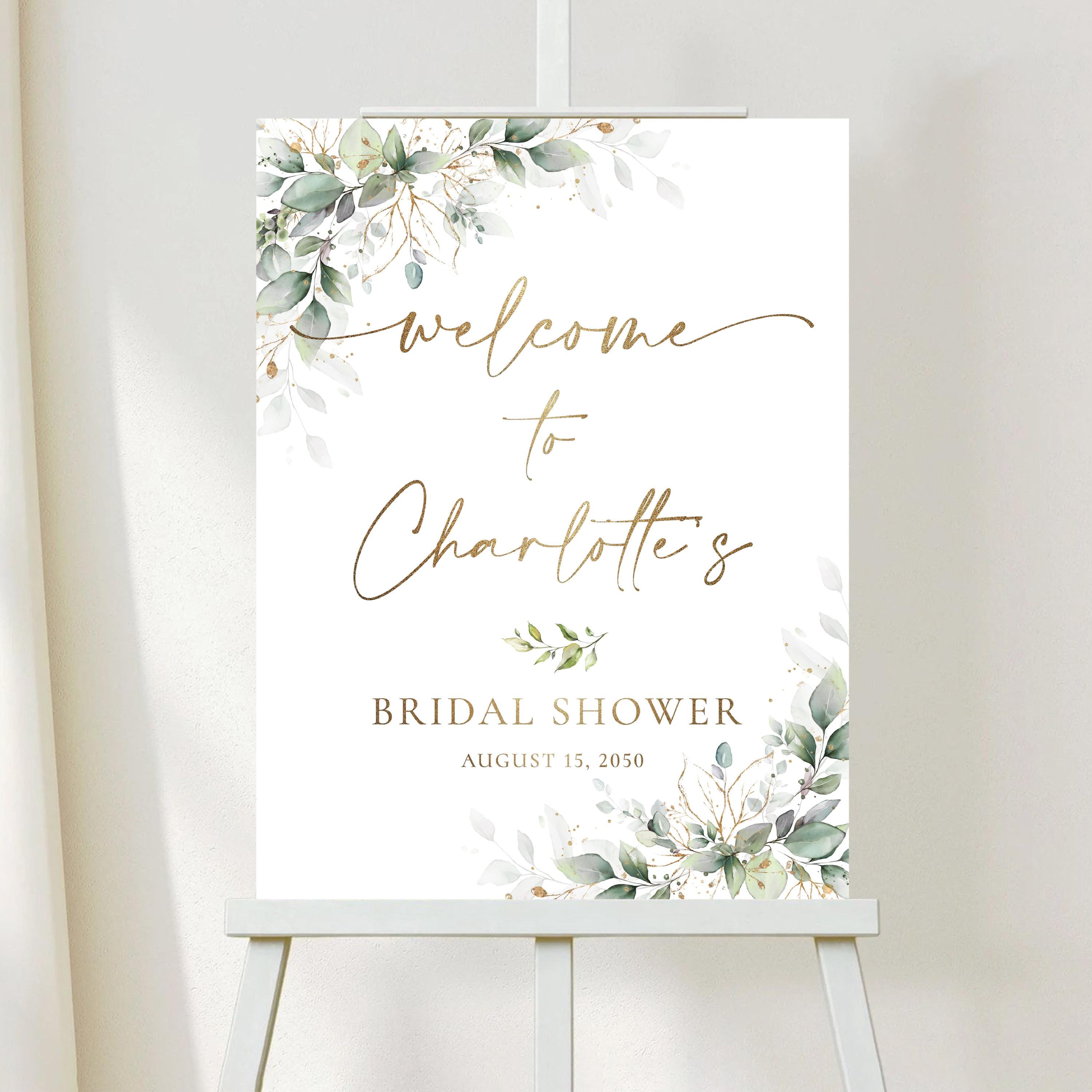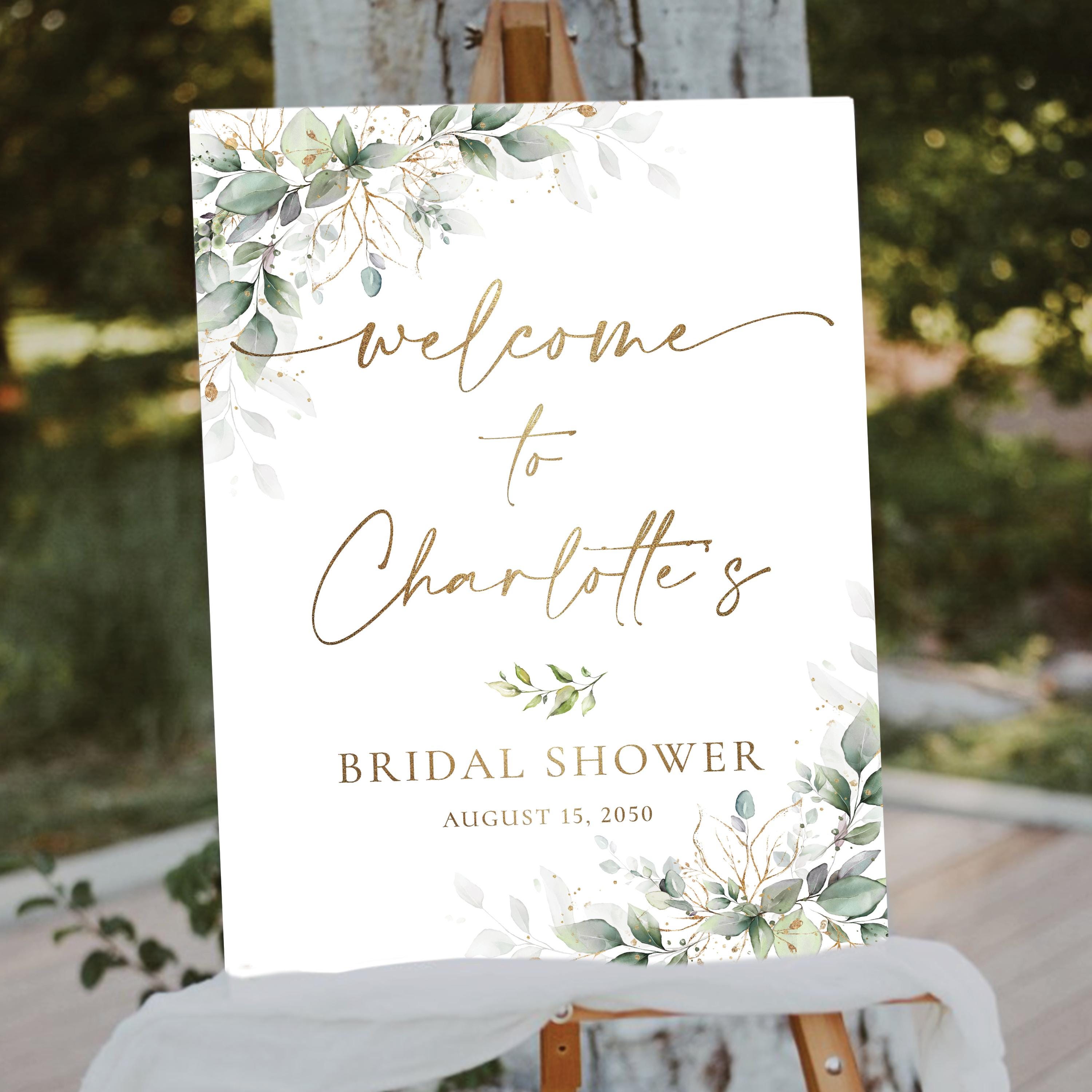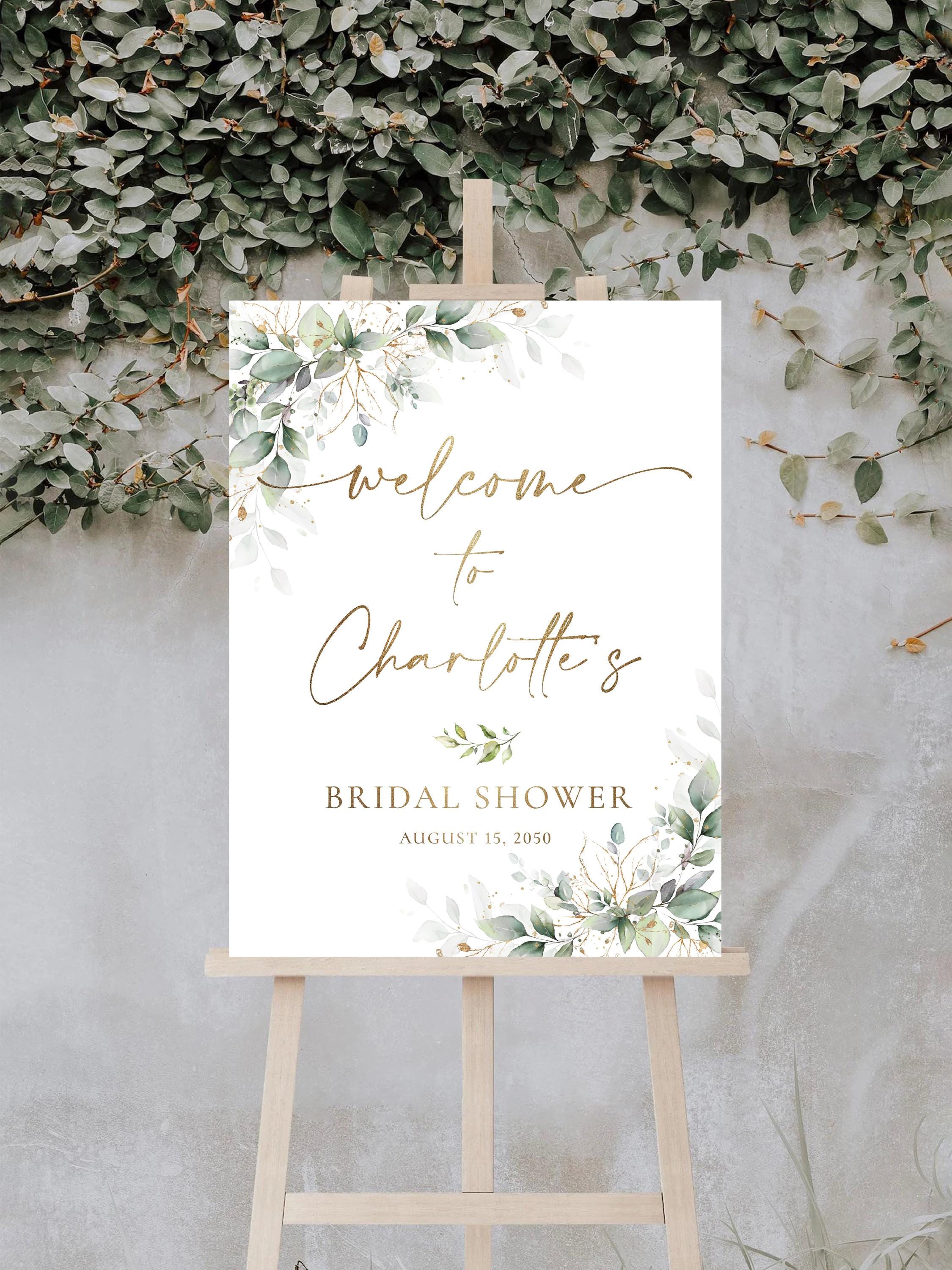 This greenery-themed bridal shower welcome sign is available as a printed or digital file. Designed with soft watercolor leaves and elegant calligraphy, it’s a lovely way to welcome your guests and add a natural touch to your special day.