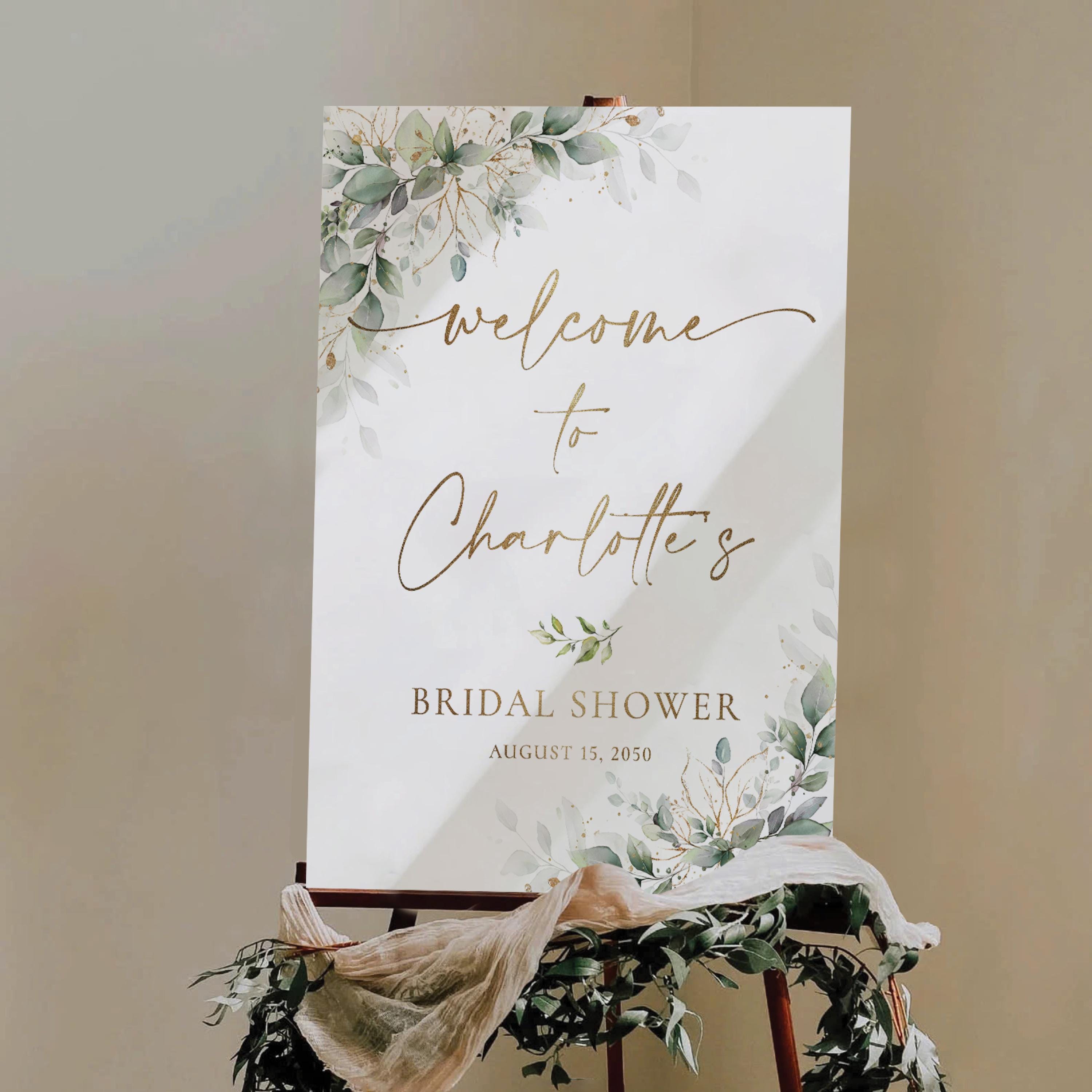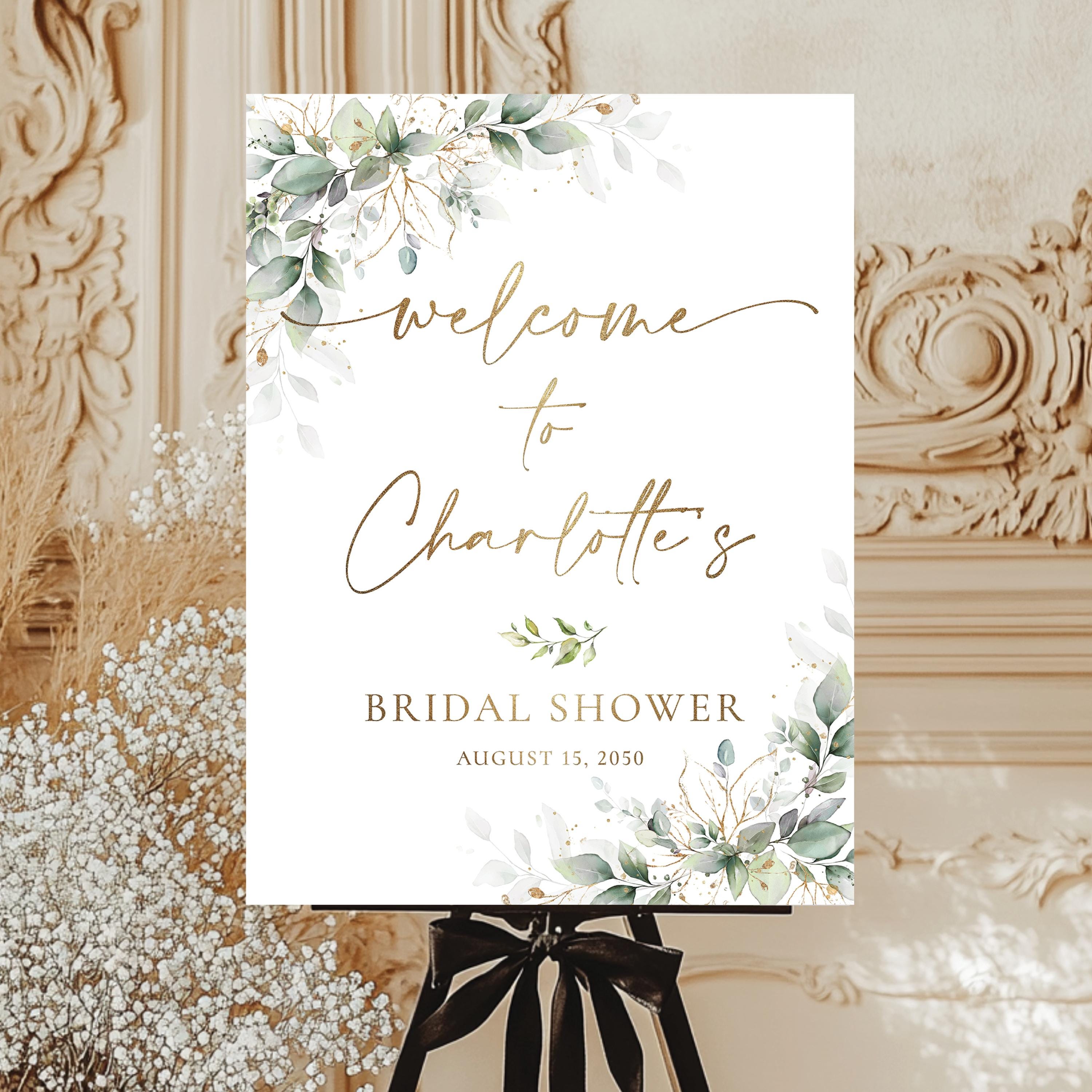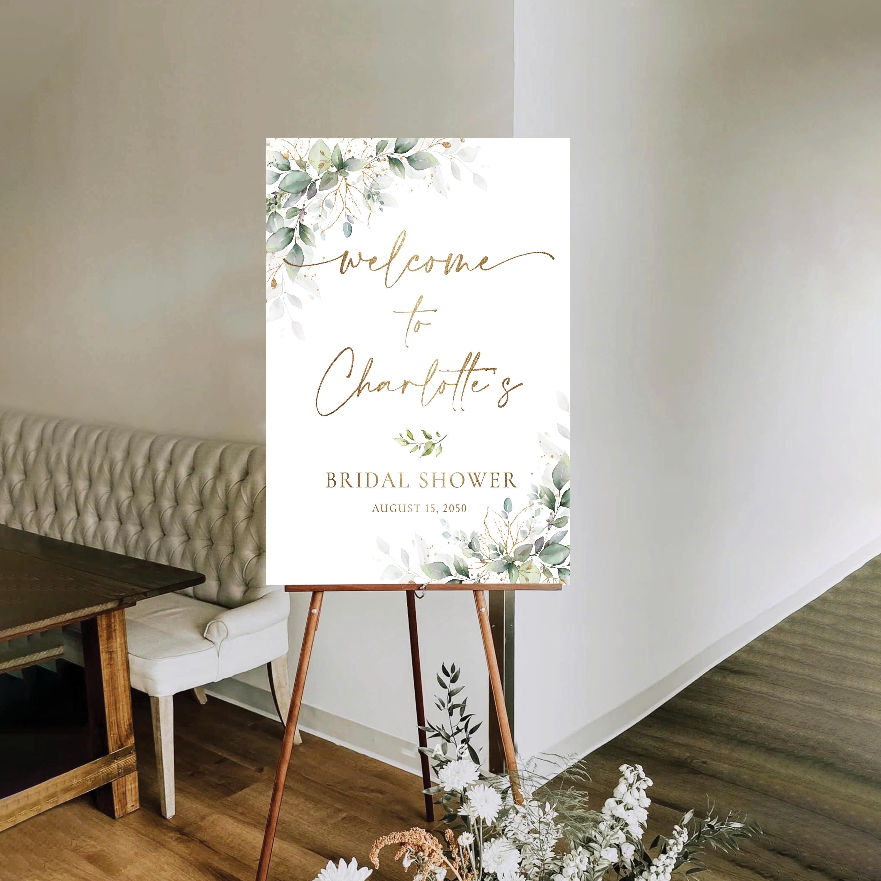 This greenery-themed bridal shower welcome sign is available as a printed or digital file. Designed with soft watercolor leaves and elegant calligraphy, it’s a lovely way to welcome your guests and add a natural touch to your special day.