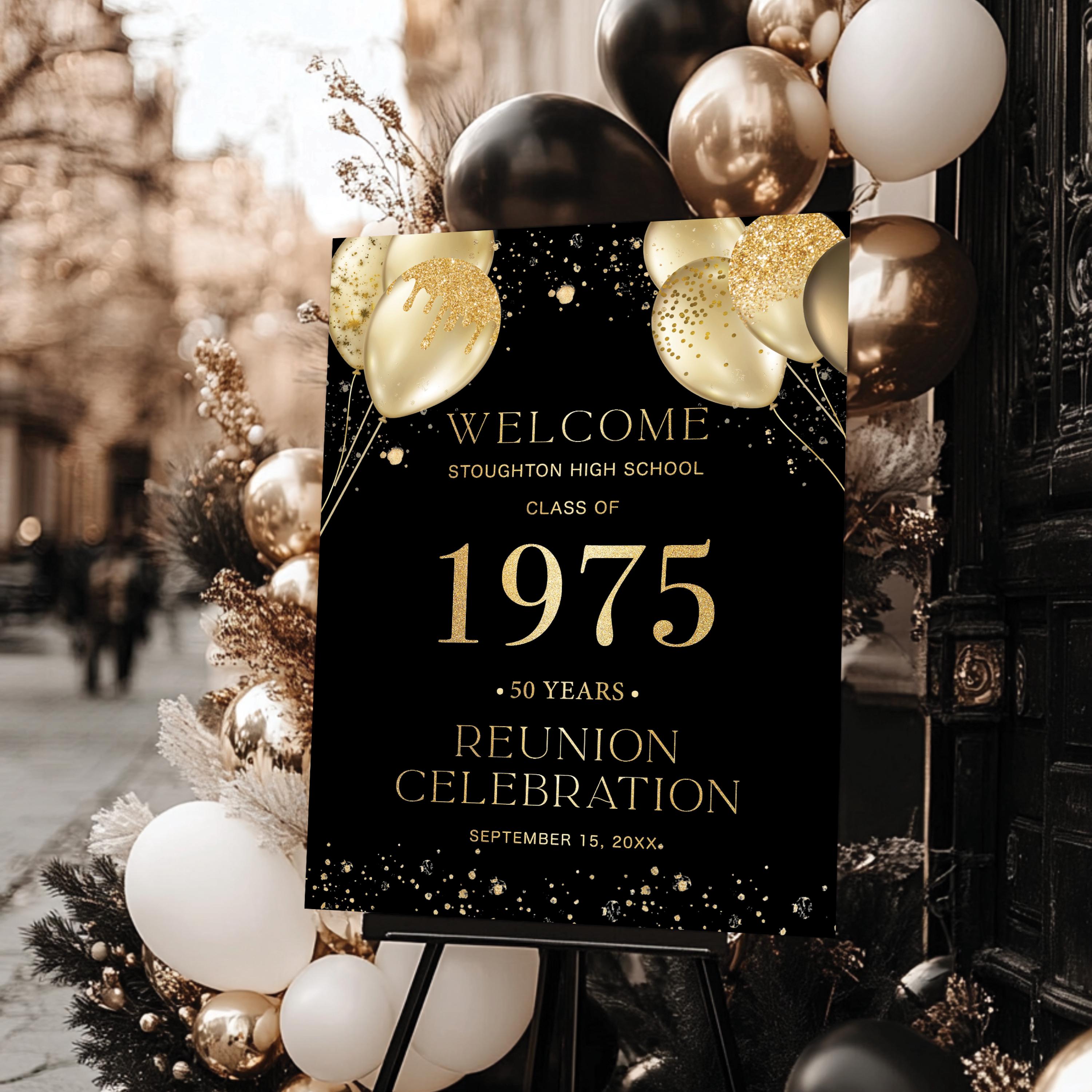 Navy Class Reunion Welcome Sign, Digital File – a refined and contemporary design featuring elegant silver balloons and sparkling confetti set against a deep navy background. This personalized digital file adds a stylish and festive touch to your reunion celebration, making a memorable first impression as guests arrive!