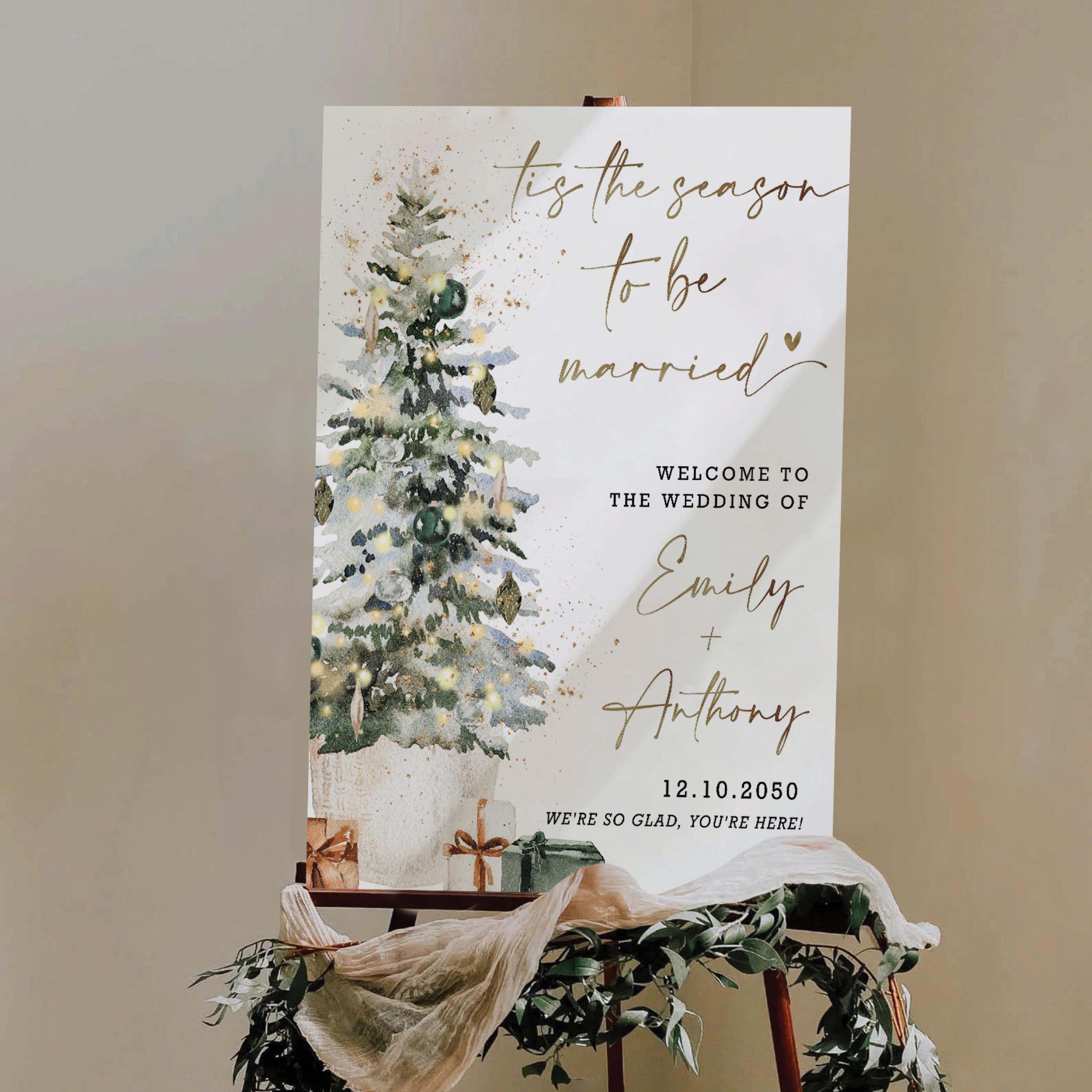 Christmas Wedding Welcome Sign – A warm and elegant winter-inspired welcome sign, designed with charming handwritten fonts. Featuring green pine trees combined with delicate little gift boxes, it brings both a festive and sophisticated touch. The sign can be personalized with your wedding details, making your celebration even more memorable and inviting.