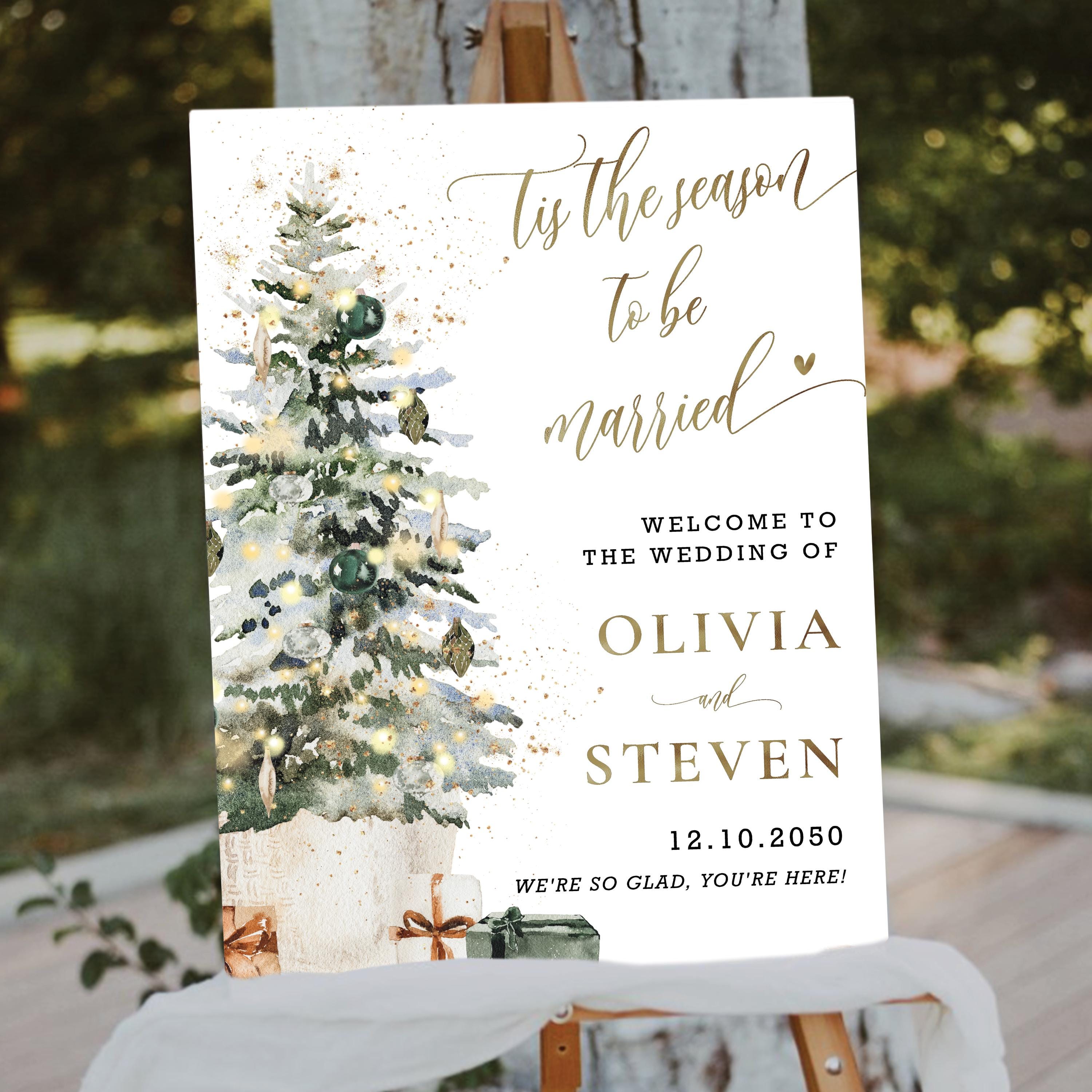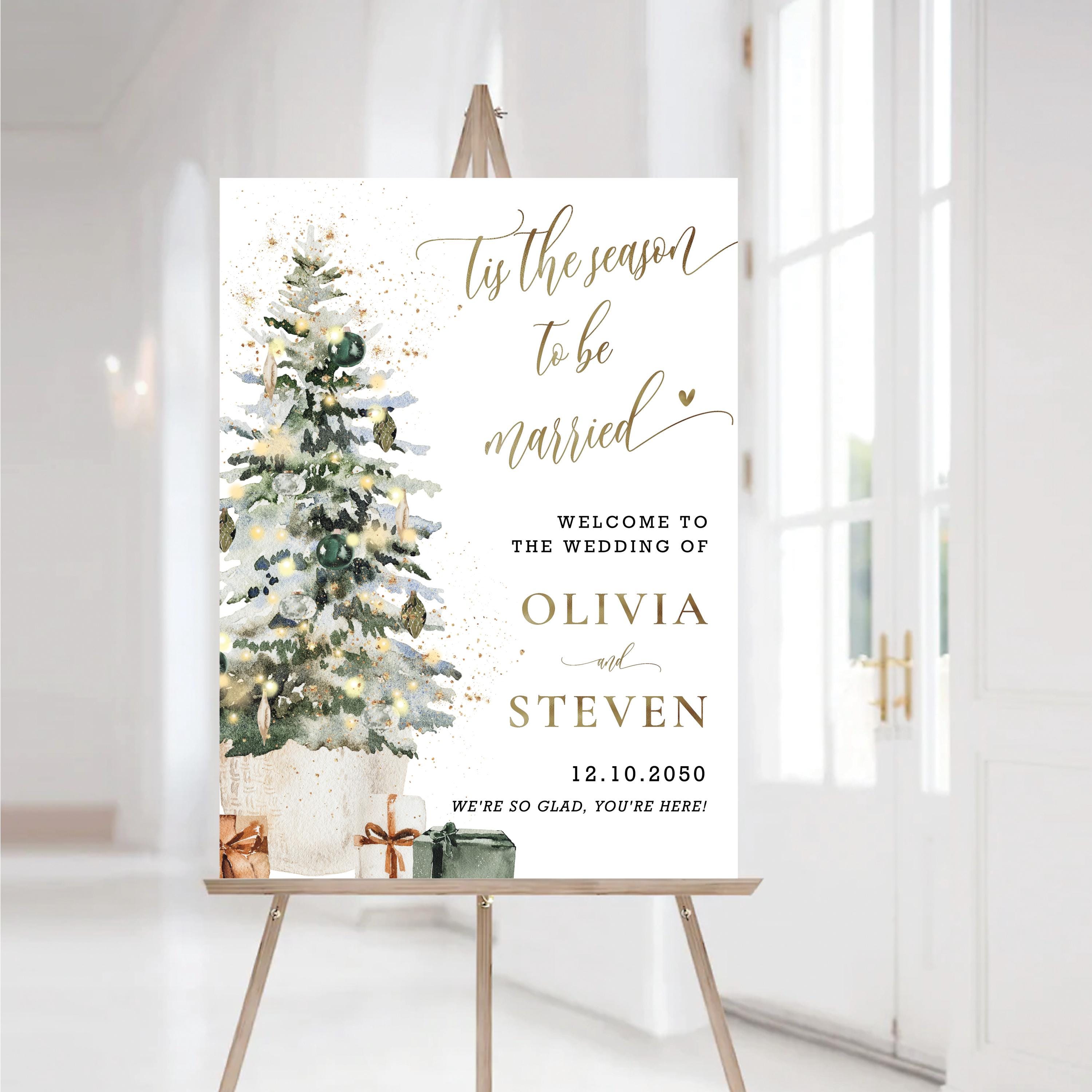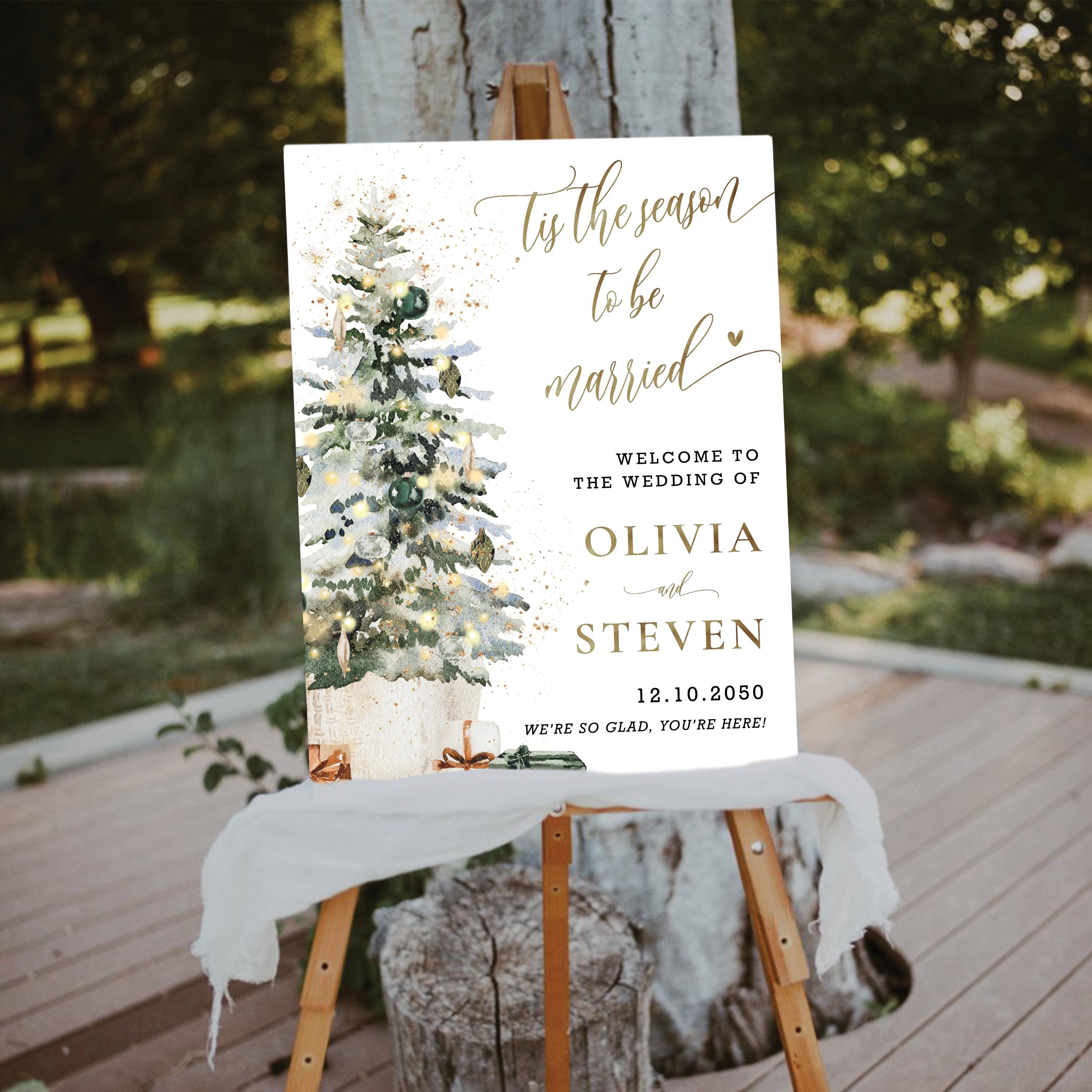 Christmas Wedding Welcome Sign brings a warm and romantic touch to your special day. Featuring elegant handwritten fonts, highlighted with a festive Christmas tree and charming gift boxes, it creates a joyful holiday atmosphere. This sign can be personalized with your wedding details and is available as a printed product or a digital file, making it perfect for any celebration.