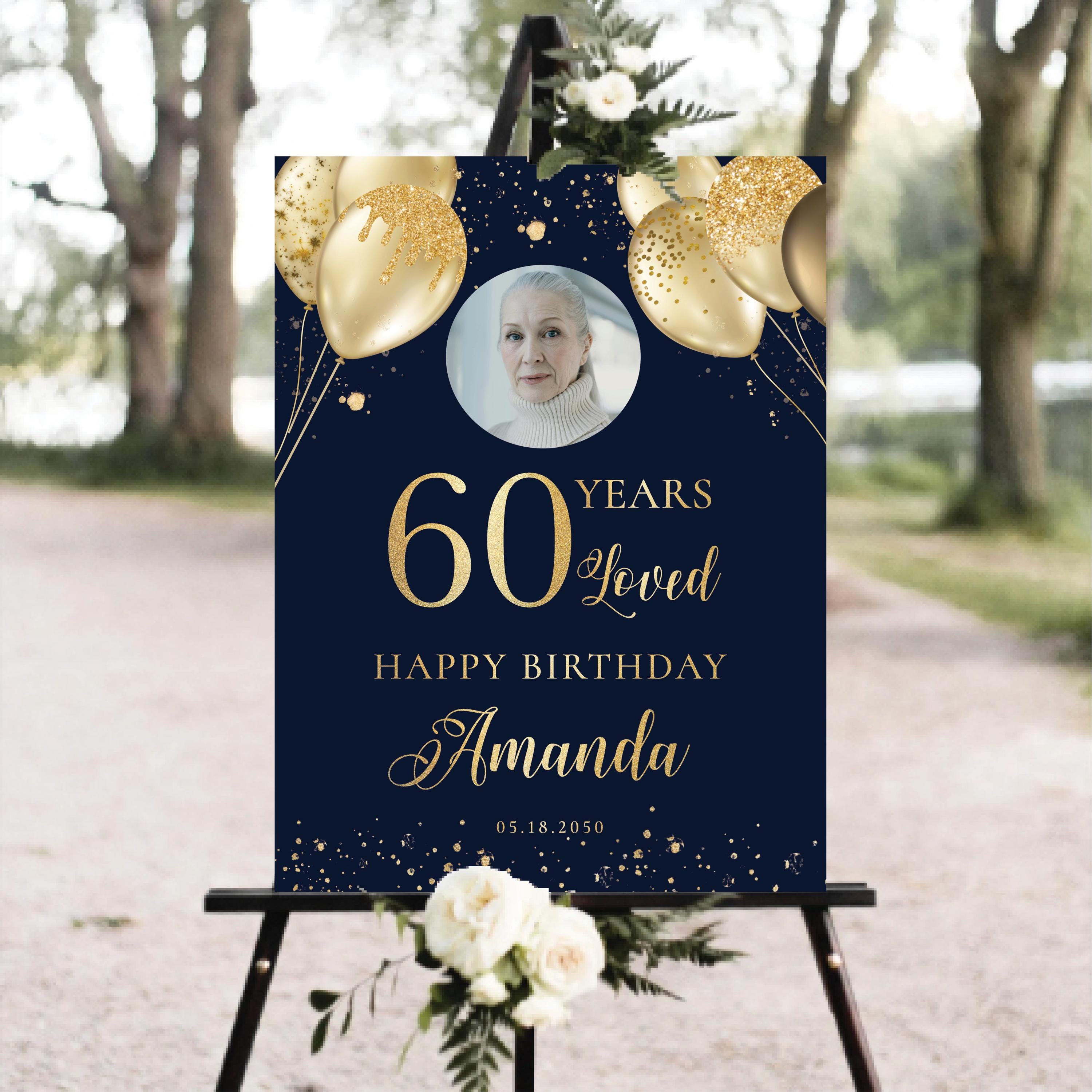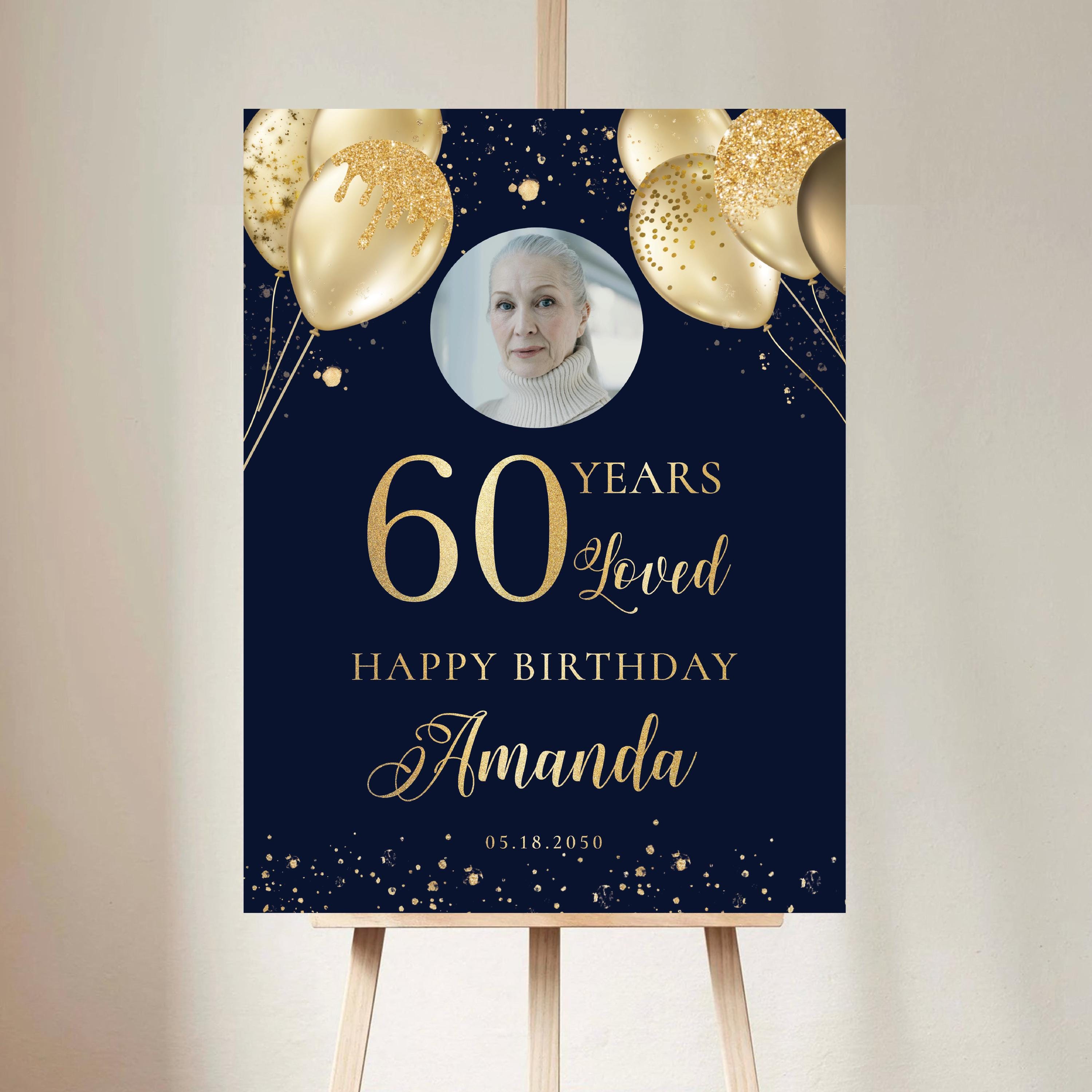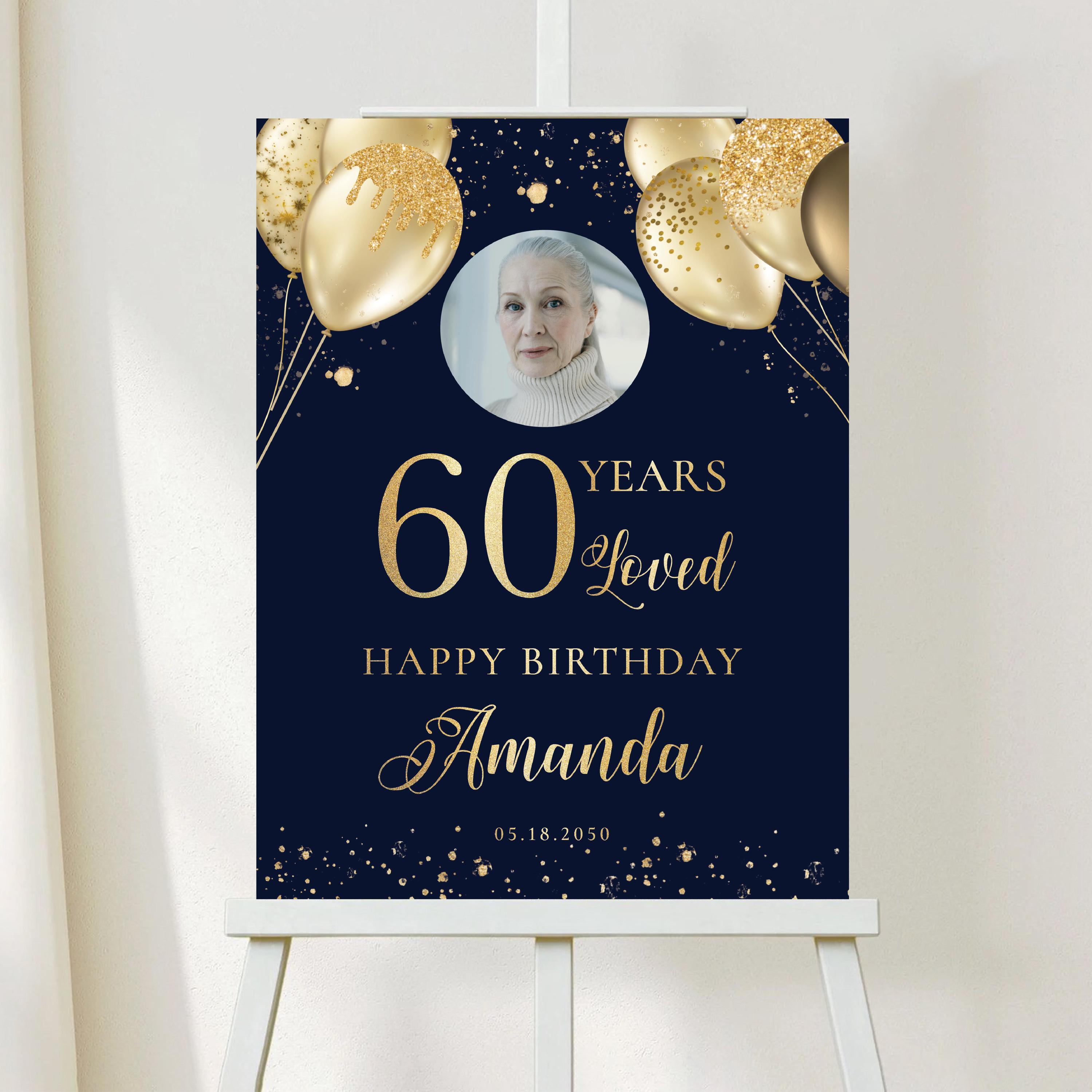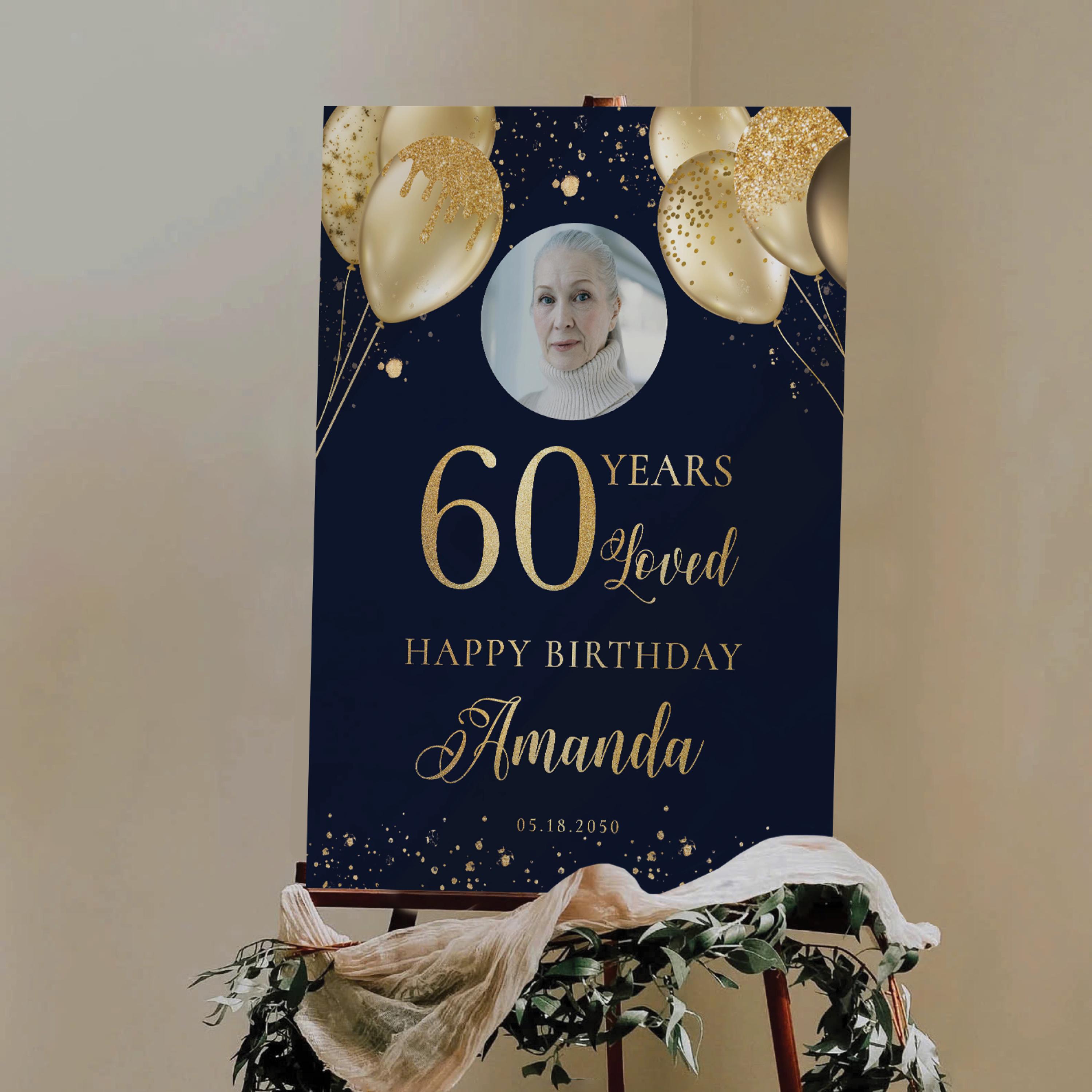 Modern 60th Birthday Welcome Sign with Photo features a stylish and elegant design with handwritten fonts, highlighted by gold balloons on a deep navy background. This sign can be personalized with your party details and photo, creating a warm and memorable welcome for your celebration. Available as a printed or digital file, it’s perfect for adding a modern touch to your 60th birthday decor.