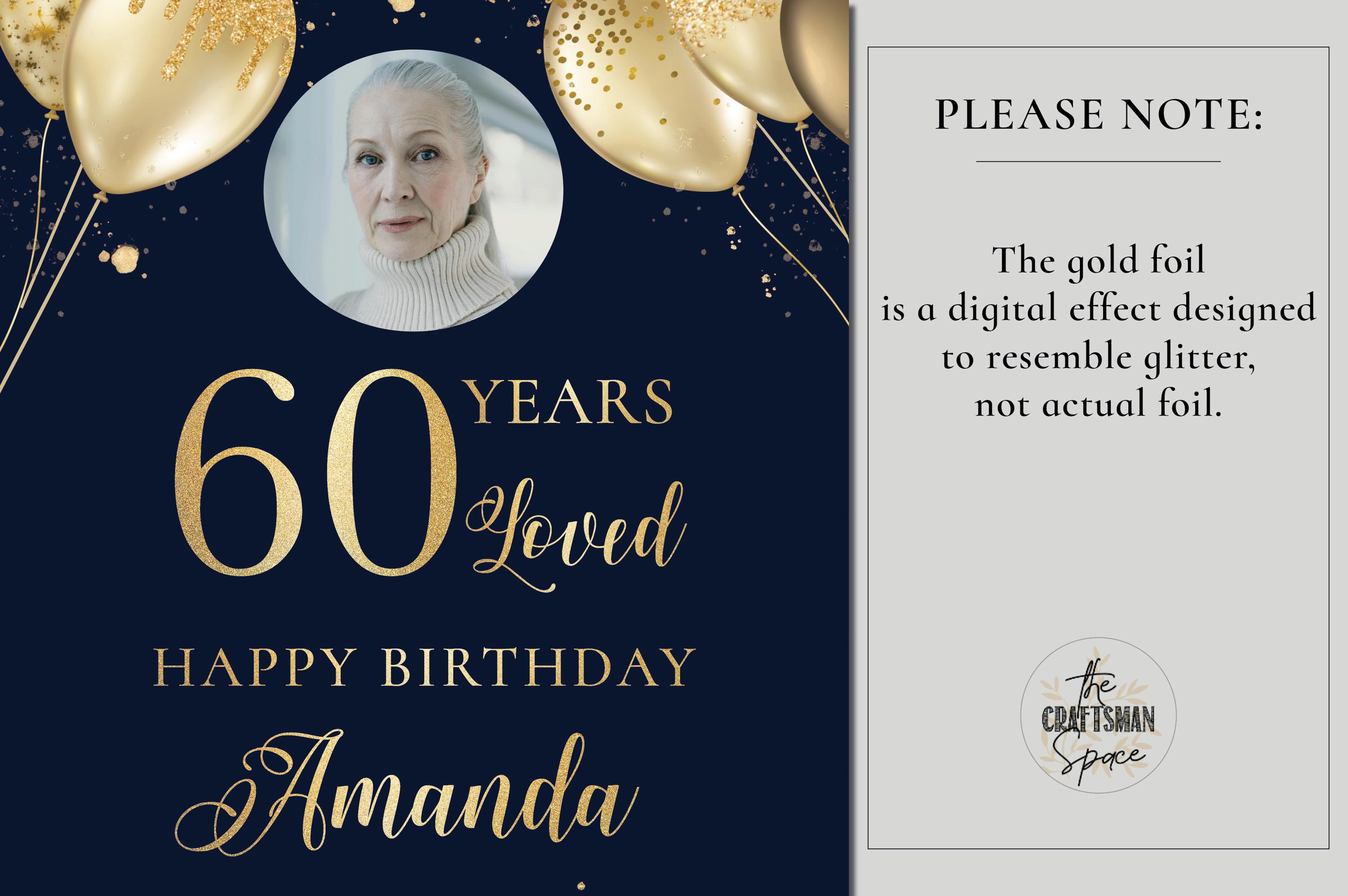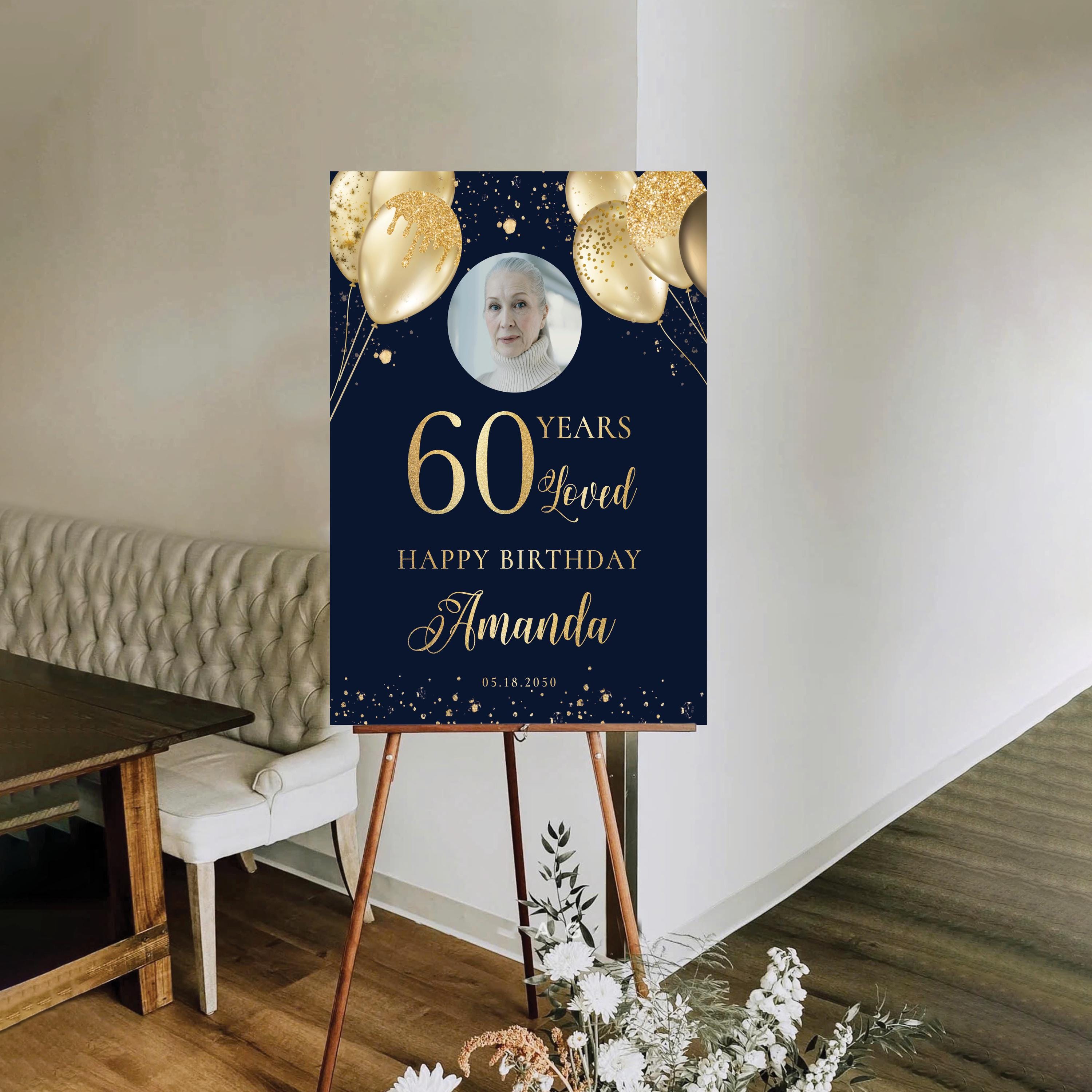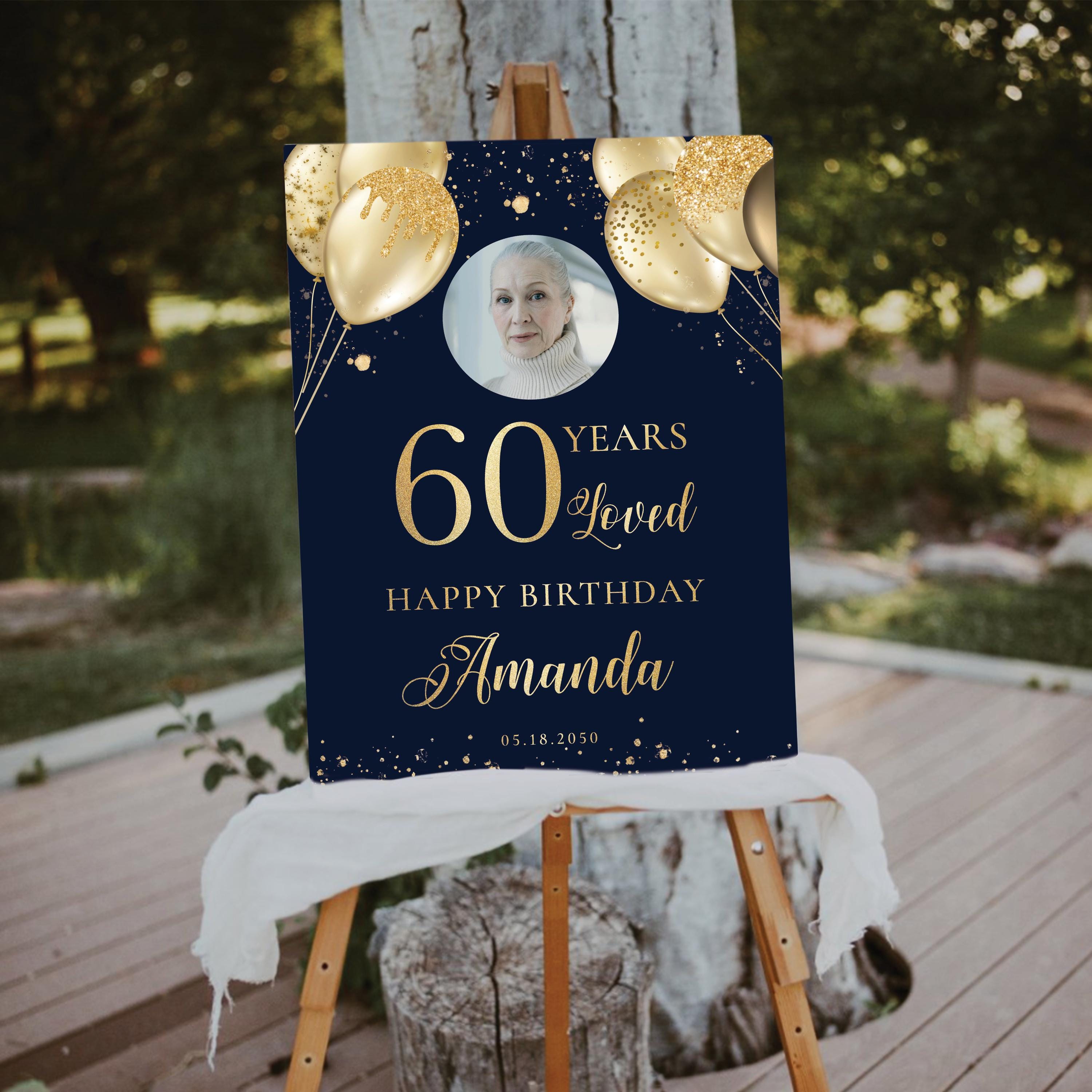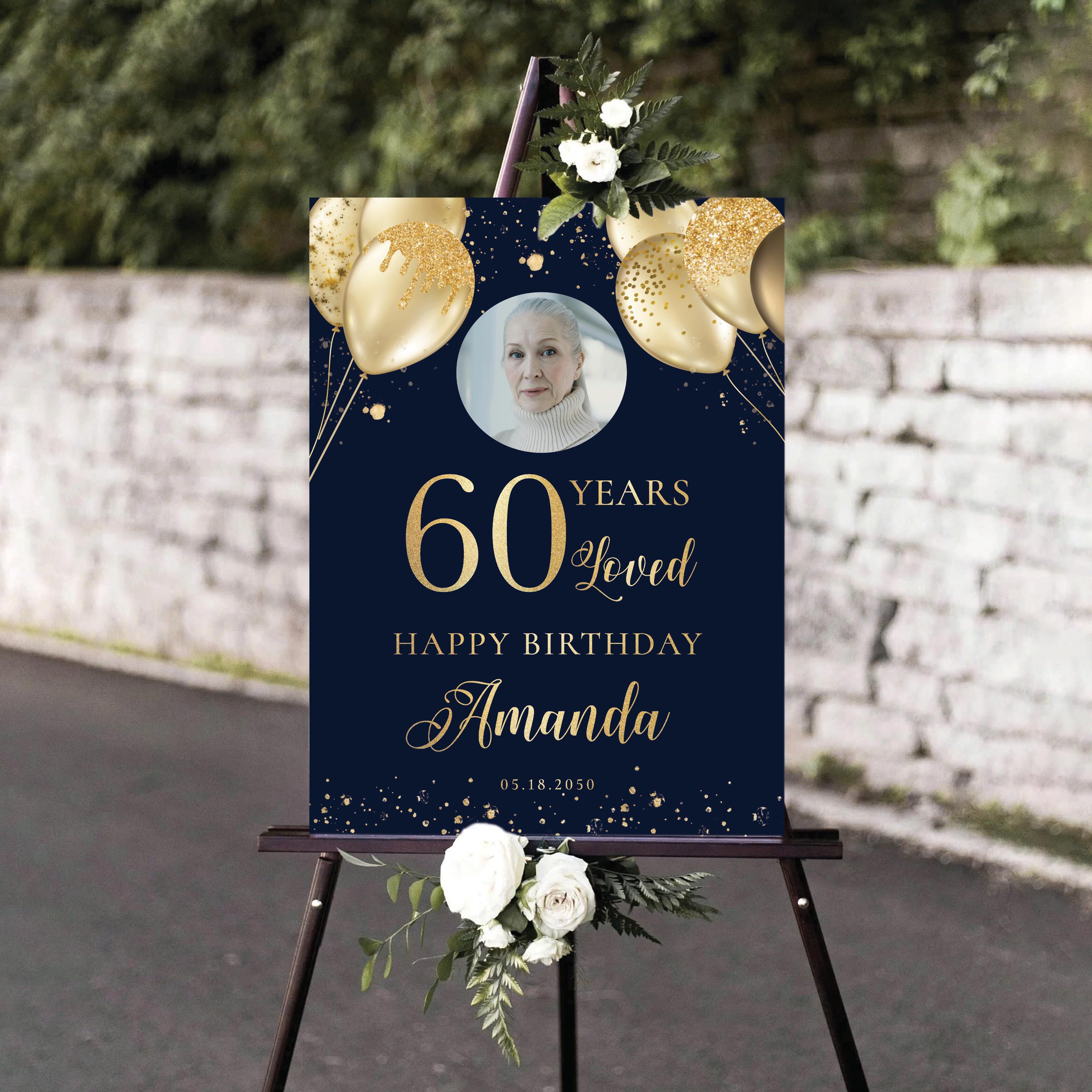 Modern 60th Birthday Welcome Sign with Photo features a stylish and elegant design with handwritten fonts, highlighted by gold balloons on a deep navy background. This sign can be personalized with your party details and photo, creating a warm and memorable welcome for your celebration. Available as a printed or digital file, it’s perfect for adding a modern touch to your 60th birthday decor.