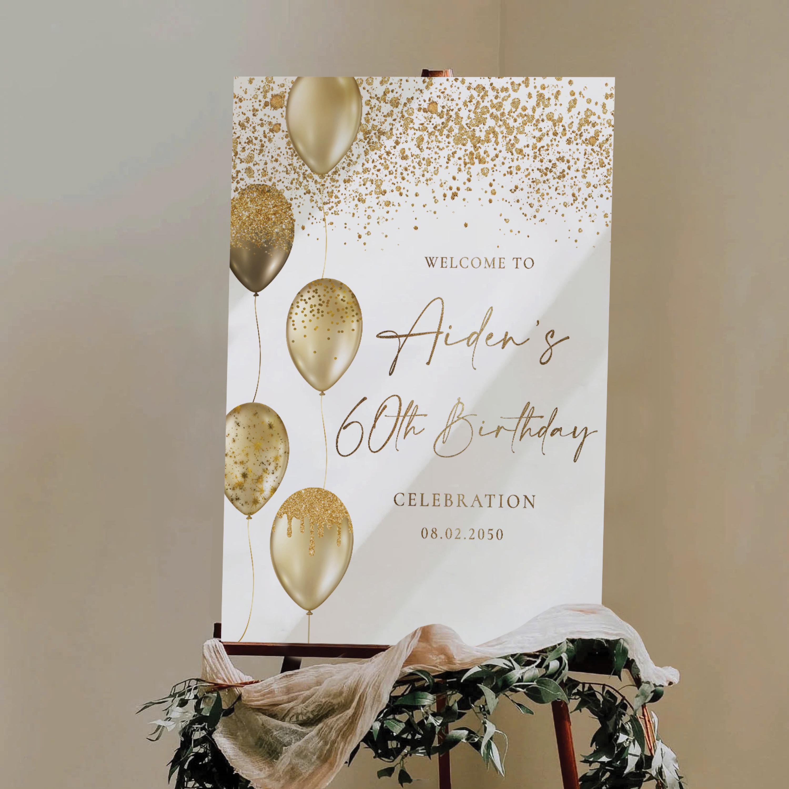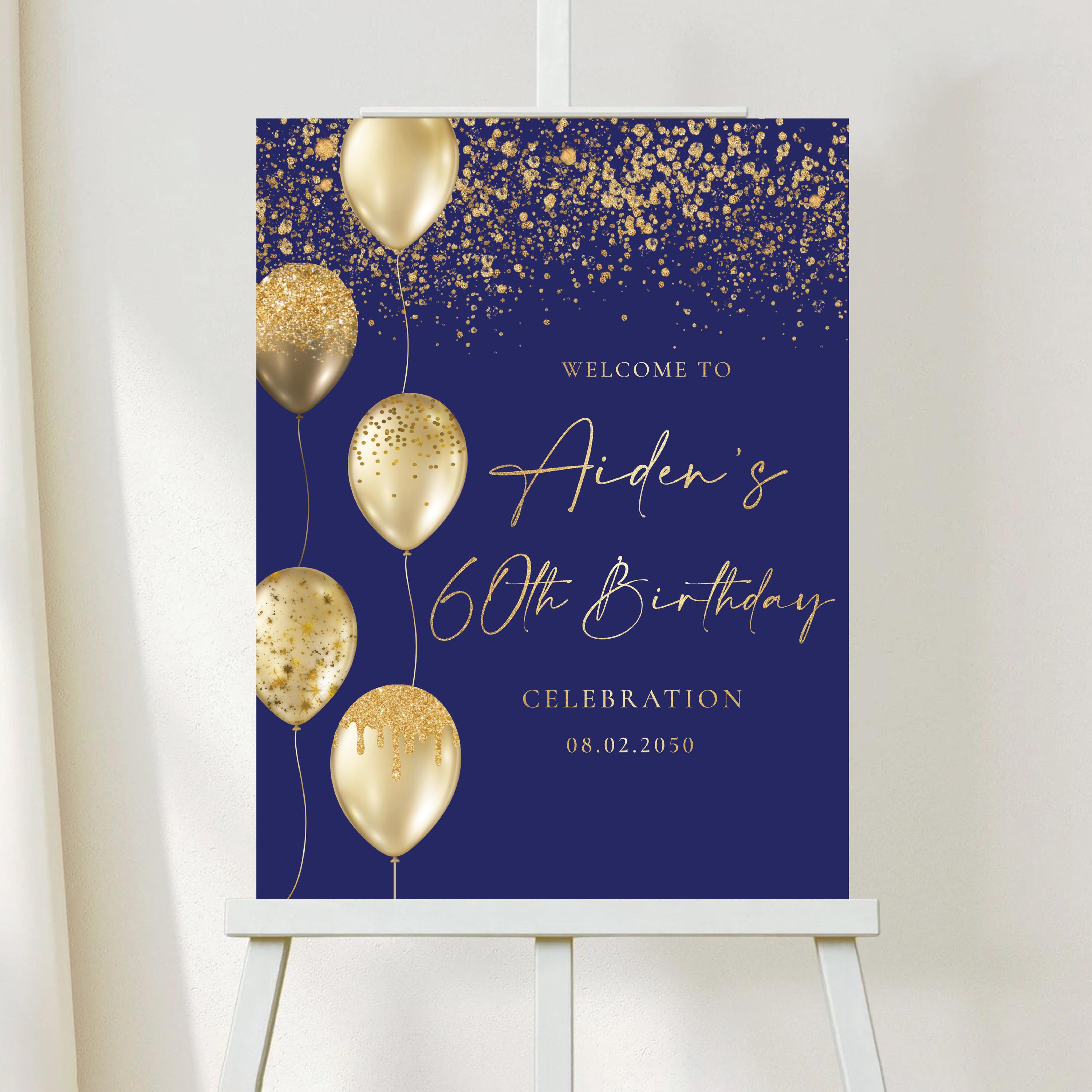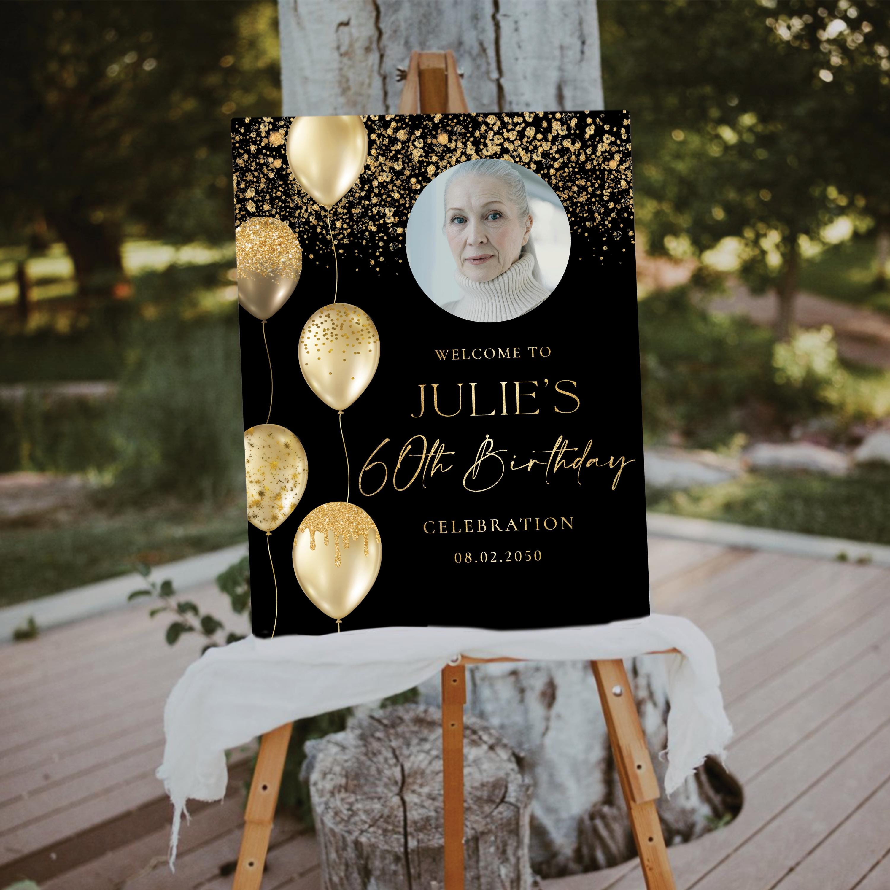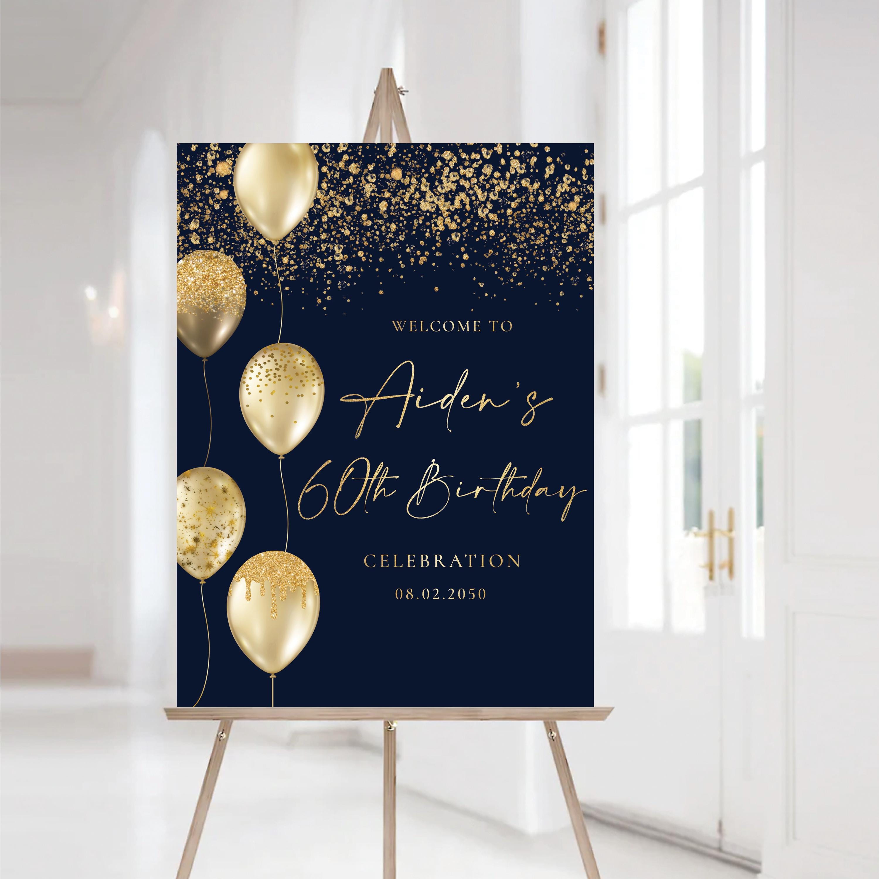 The Modern 60th Birthday Welcome Sign features elegant handwritten fonts, decorated with gold balloons and confetti on a sleek black background. This modern and sophisticated design adds a touch of celebration and style to any birthday event. The sign can be personalized with any name, age, or background color, making it a perfect custom touch for your special occasion.