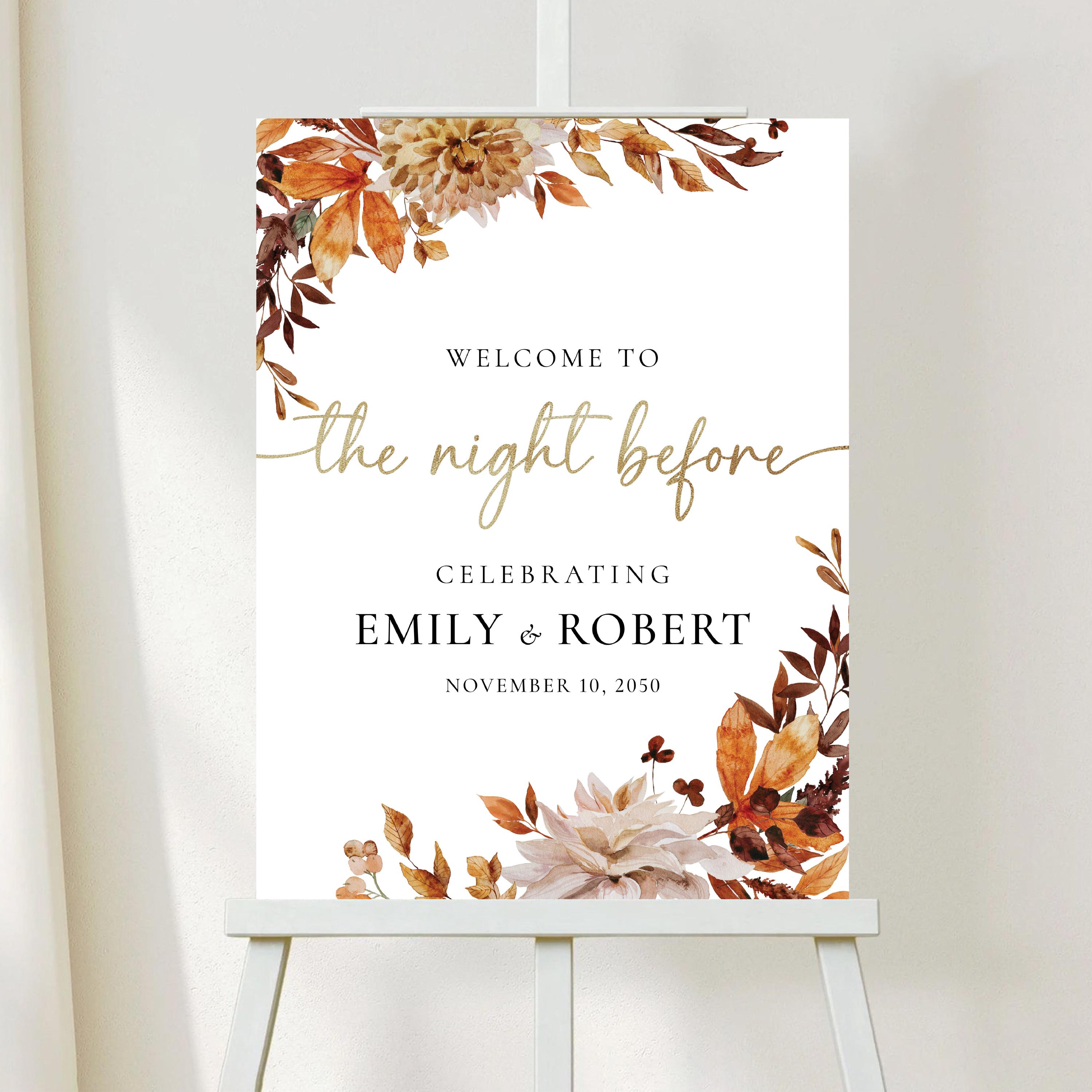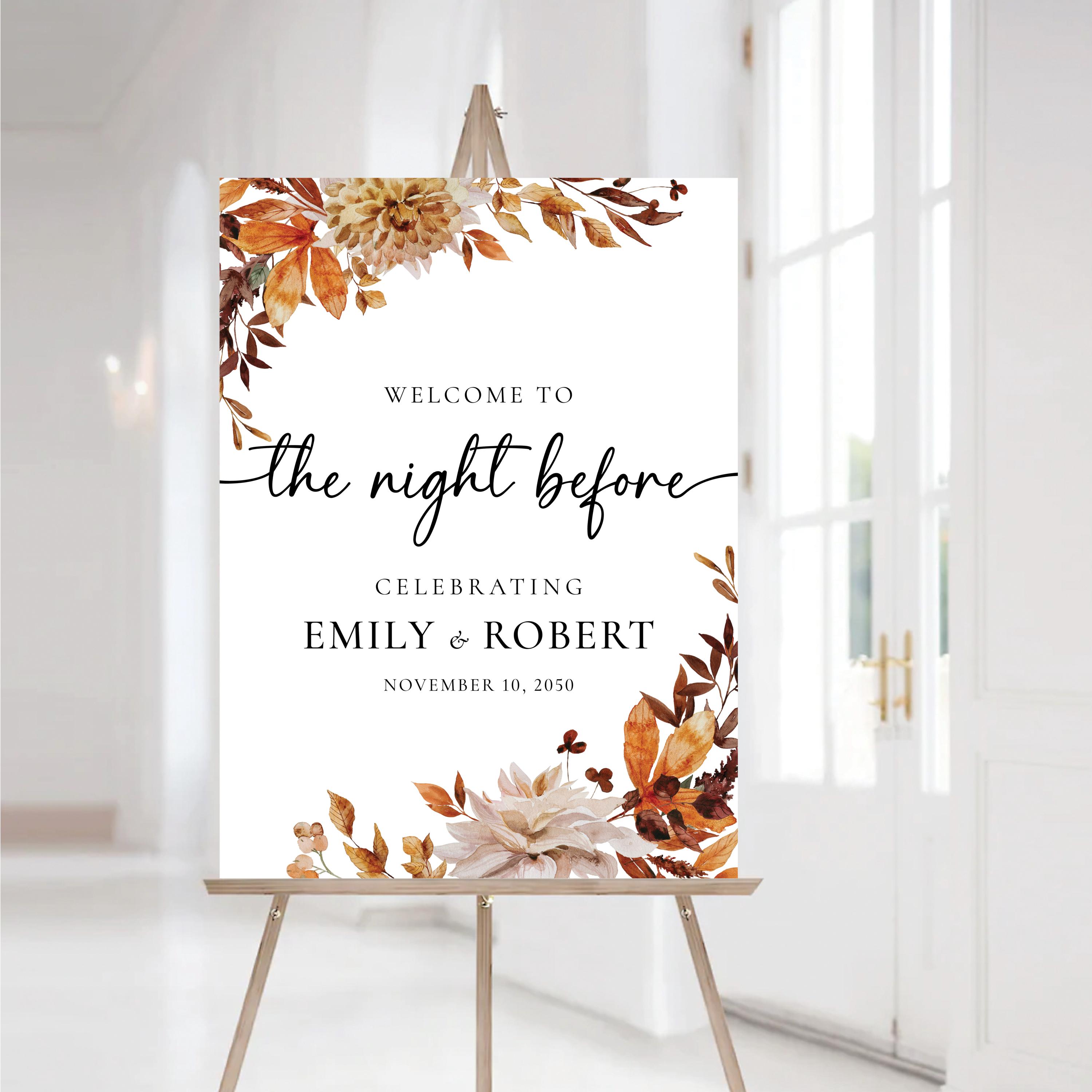 The Fall Leaves Rehearsal Dinner Welcome Sign brings the warm and elegant spirit of autumn with its rich earthy tones, burnt orange, and golden hues. Featuring delicate fall foliage and seasonal florals, the design creates a romantic and inviting atmosphere. This sign is personalized with your event details and the couple’s names, making it a beautiful statement piece for your rehearsal dinner. Perfect for rustic themes, autumn weddings, or outdoor celebrations.