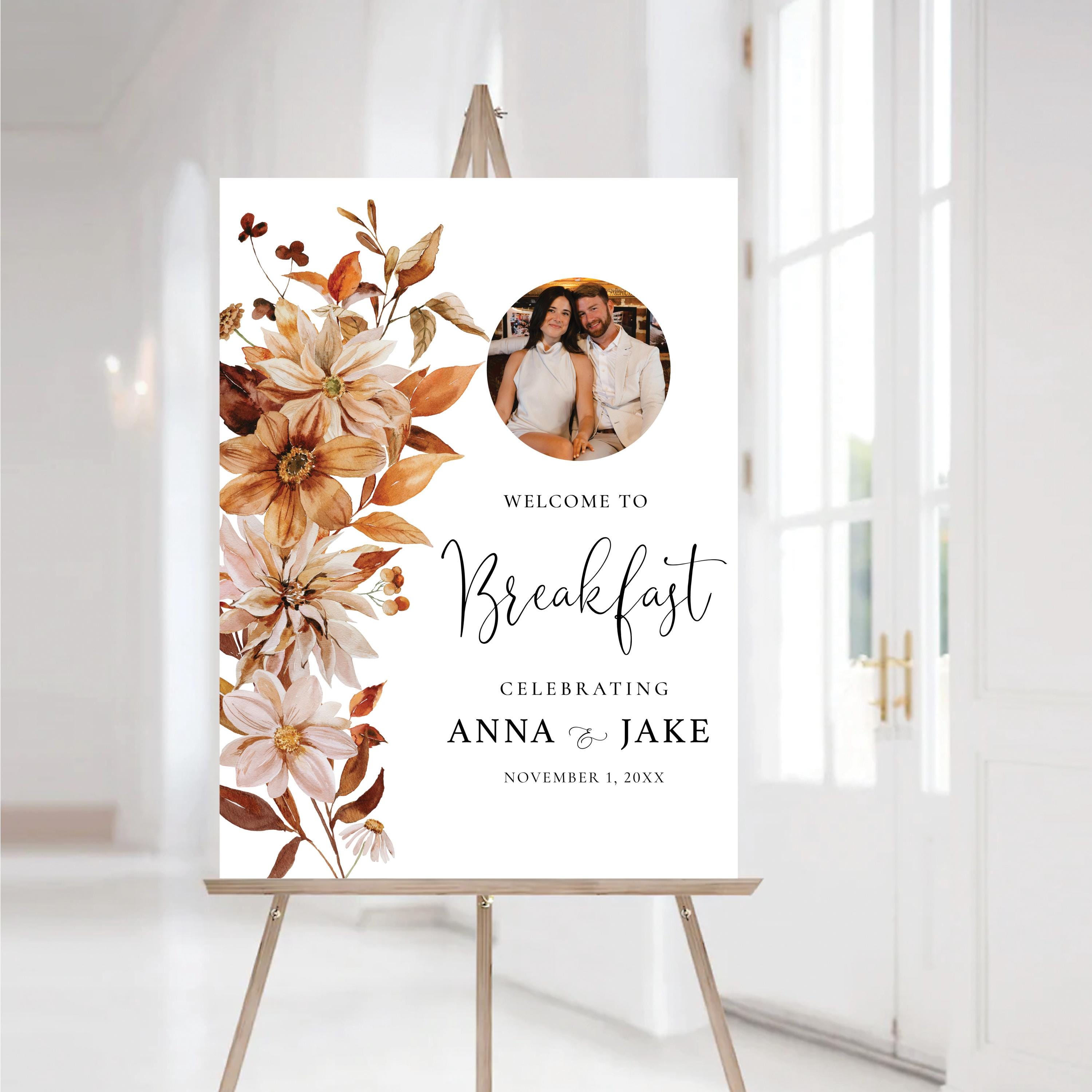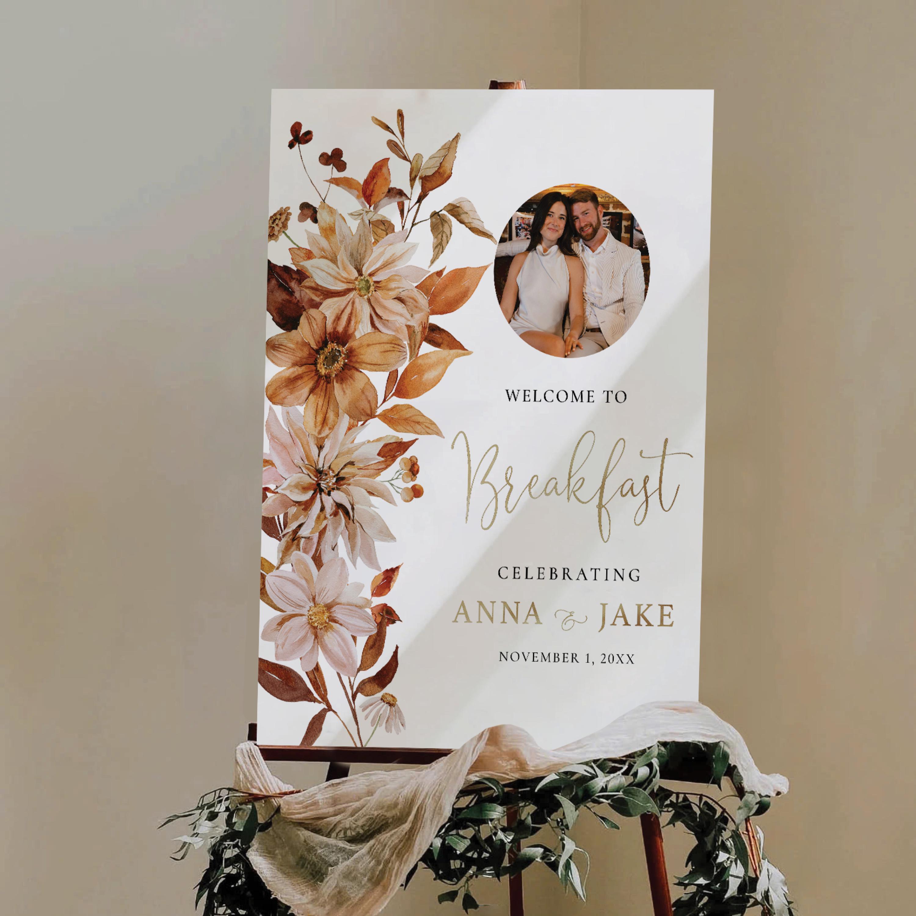 The Fall Leaves Photo Wedding Breakfast Welcome Sign brings the warm and romantic spirit of autumn with rich terracotta, deep brown, and golden tones. Featuring your personal photo, this design adds a meaningful and intimate touch to your Wedding Breakfast celebration. Delicate fall foliage and an elegant layout create a stylish and inviting atmosphere. This sign is personalized with your event details, making it a unique and charming addition to your special day. Perfect for rustic themes or autumn weddings.