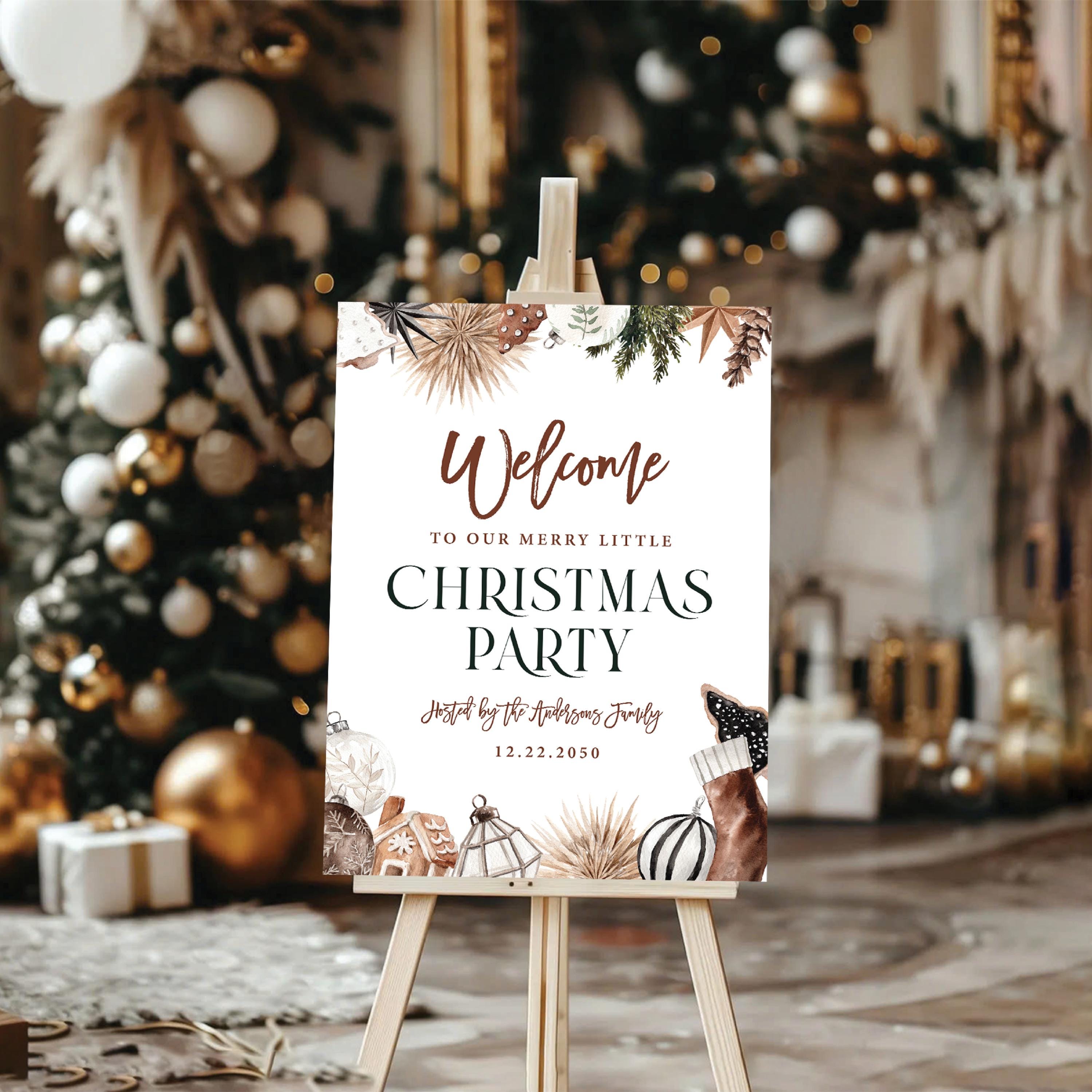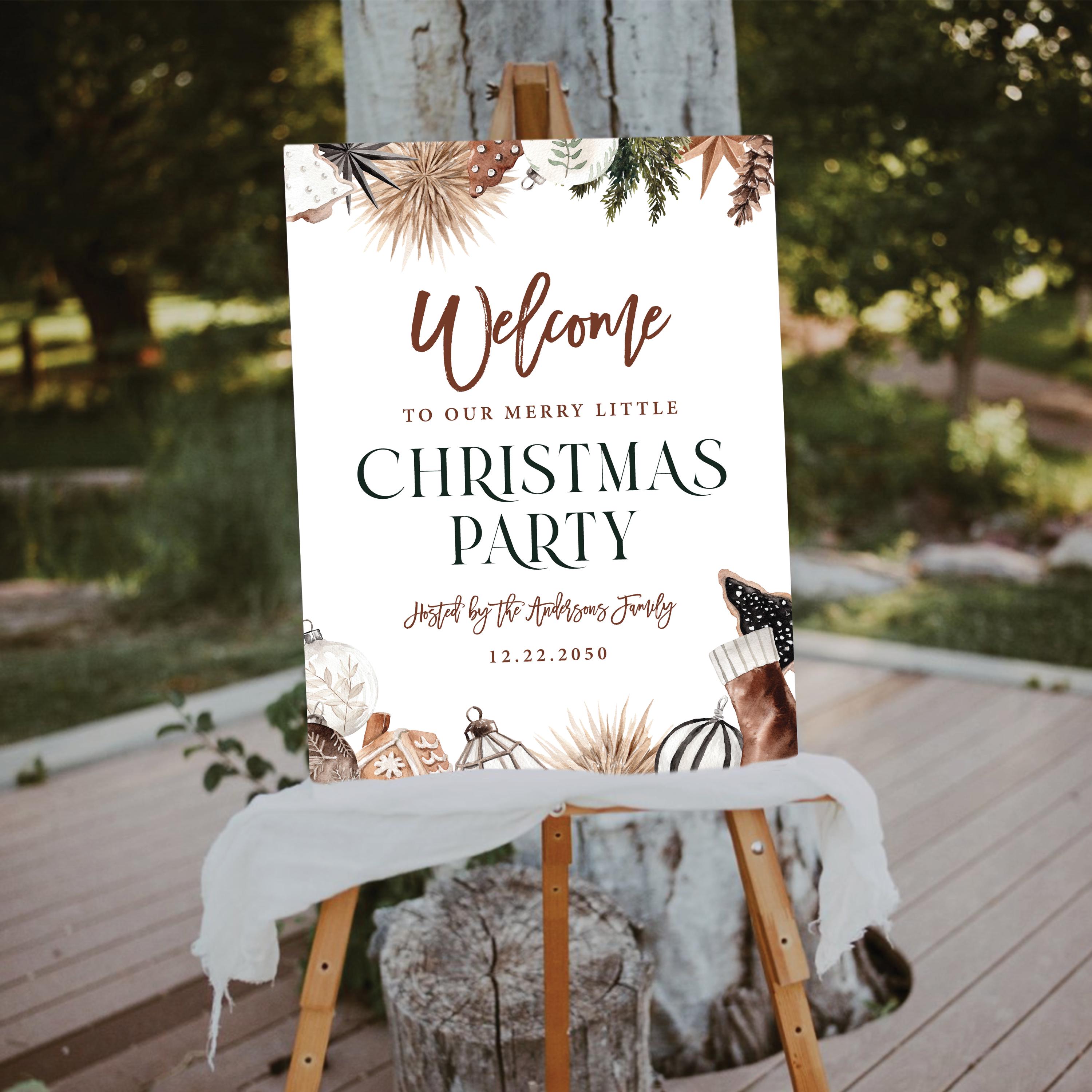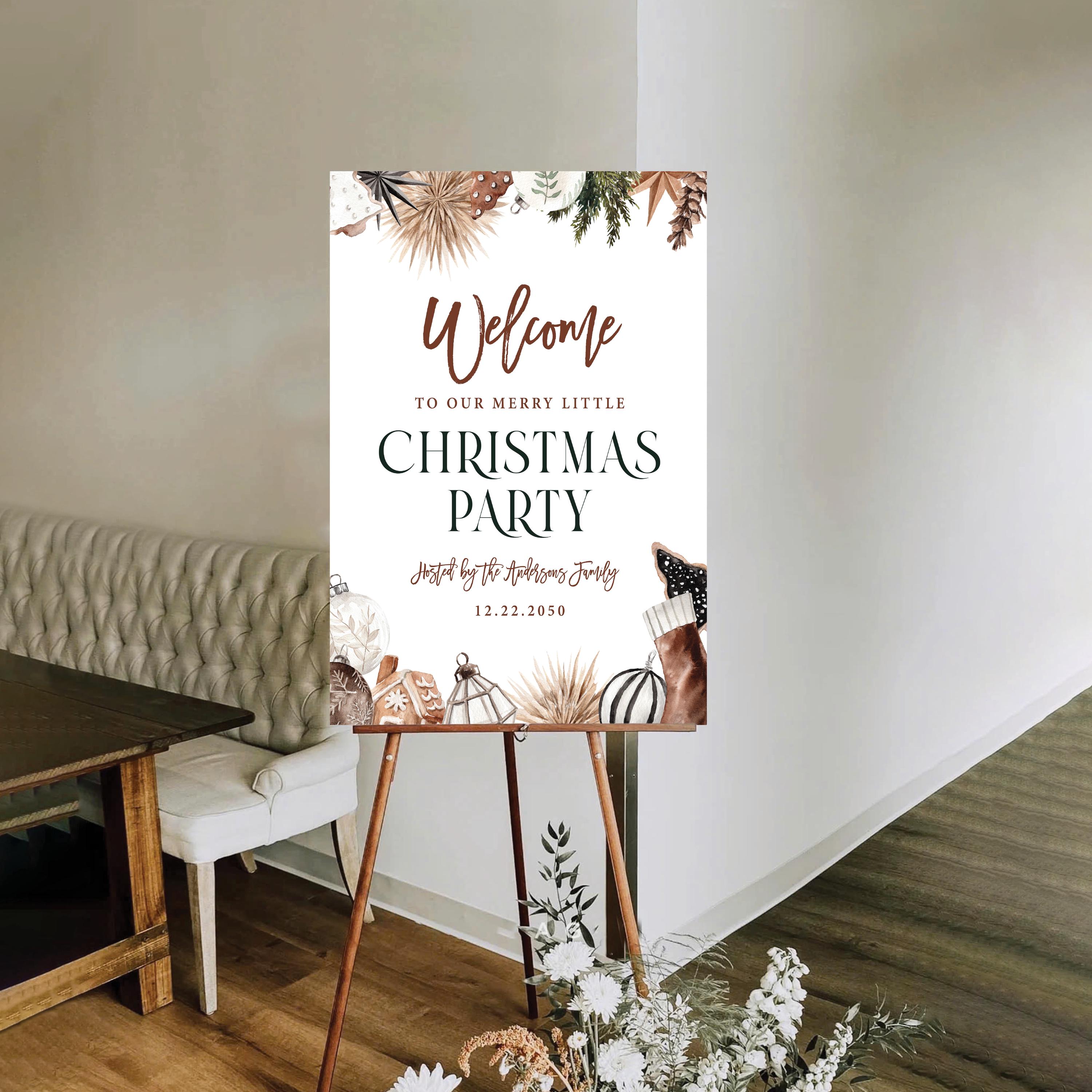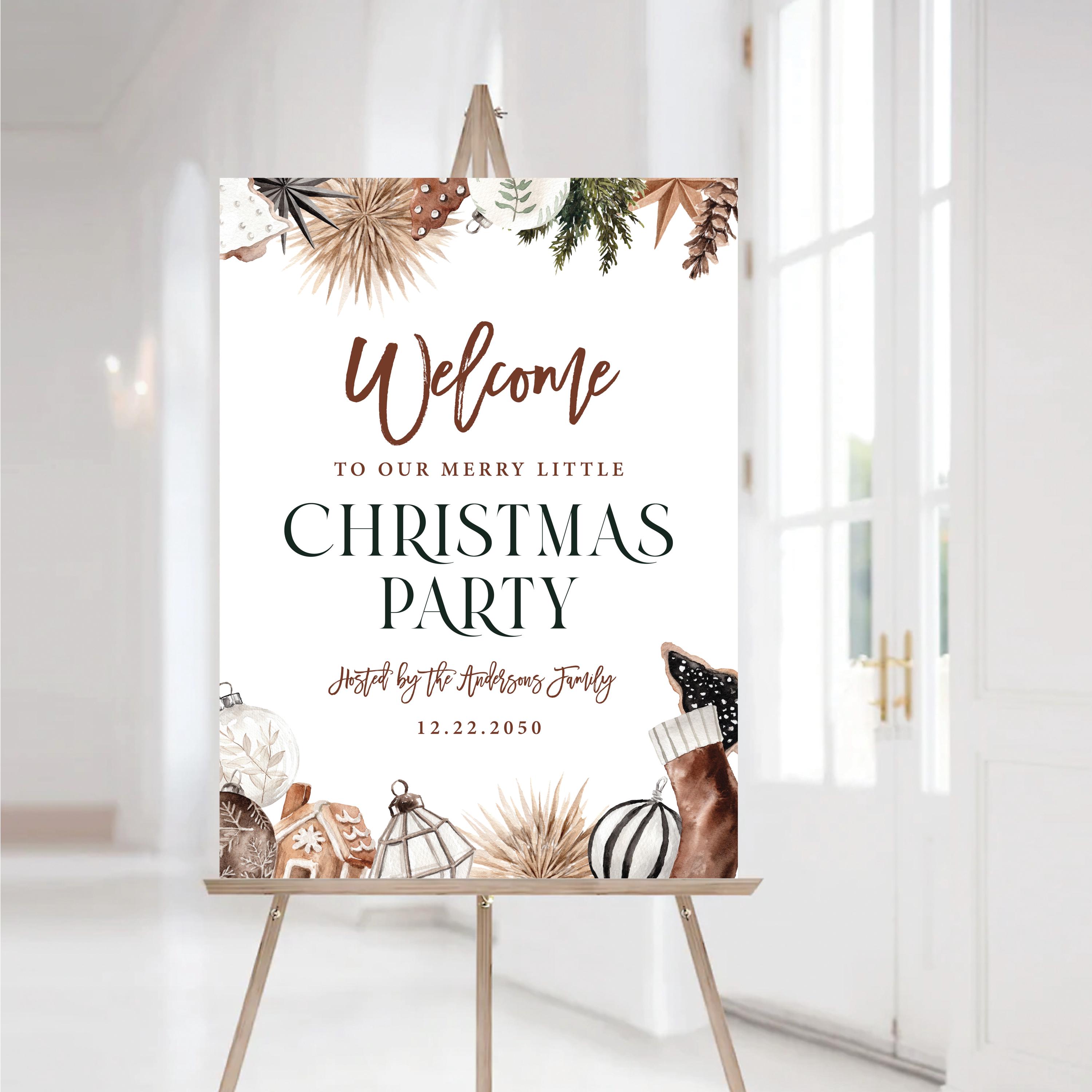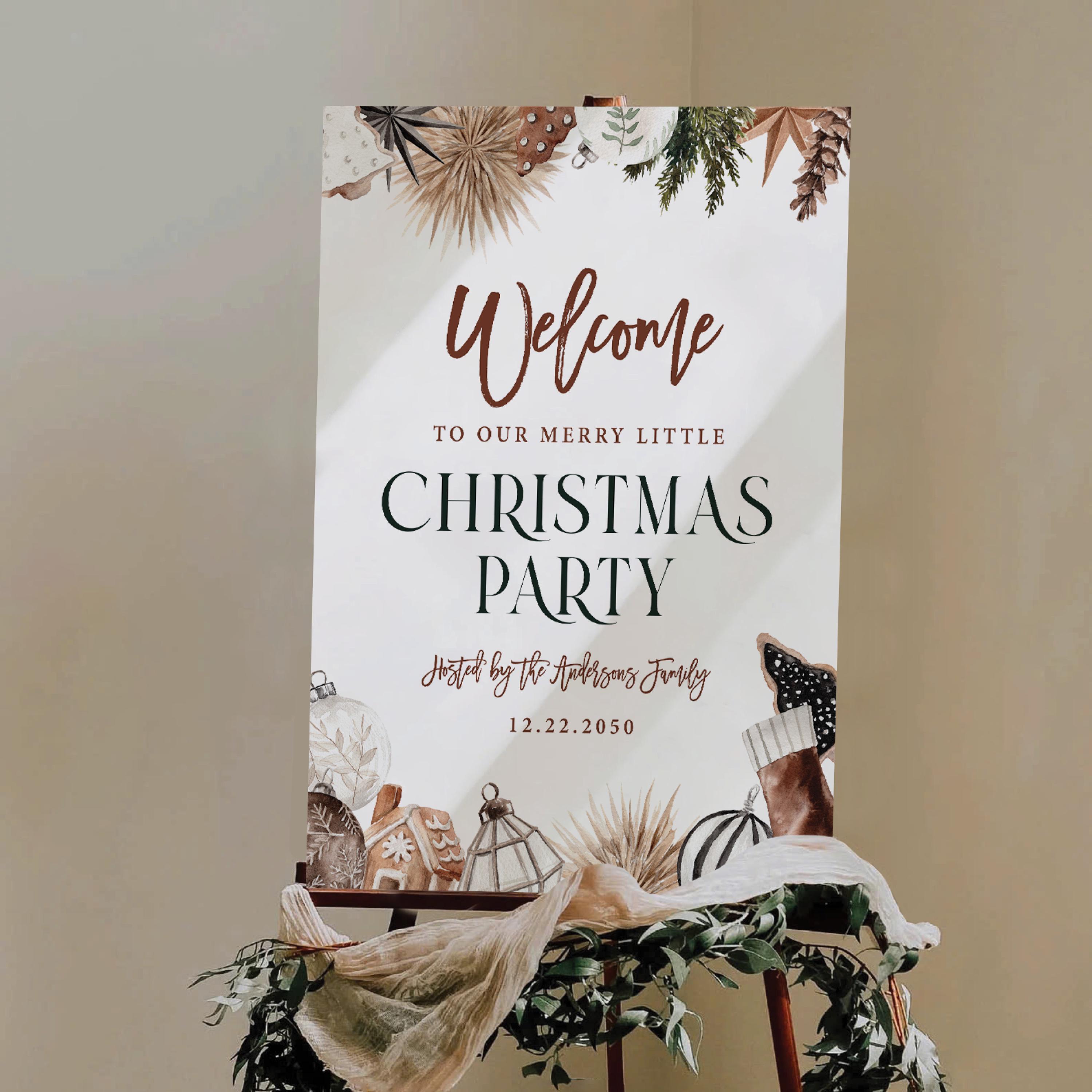 Christmas Party Welcome Sign – designed in a rustic and cozy style, featuring warm neutral tones with pine leaves, gingerbread, and festive Christmas decorations. This welcome sign makes the perfect accent for your family Christmas gathering, bringing warmth and holiday cheer to your space.