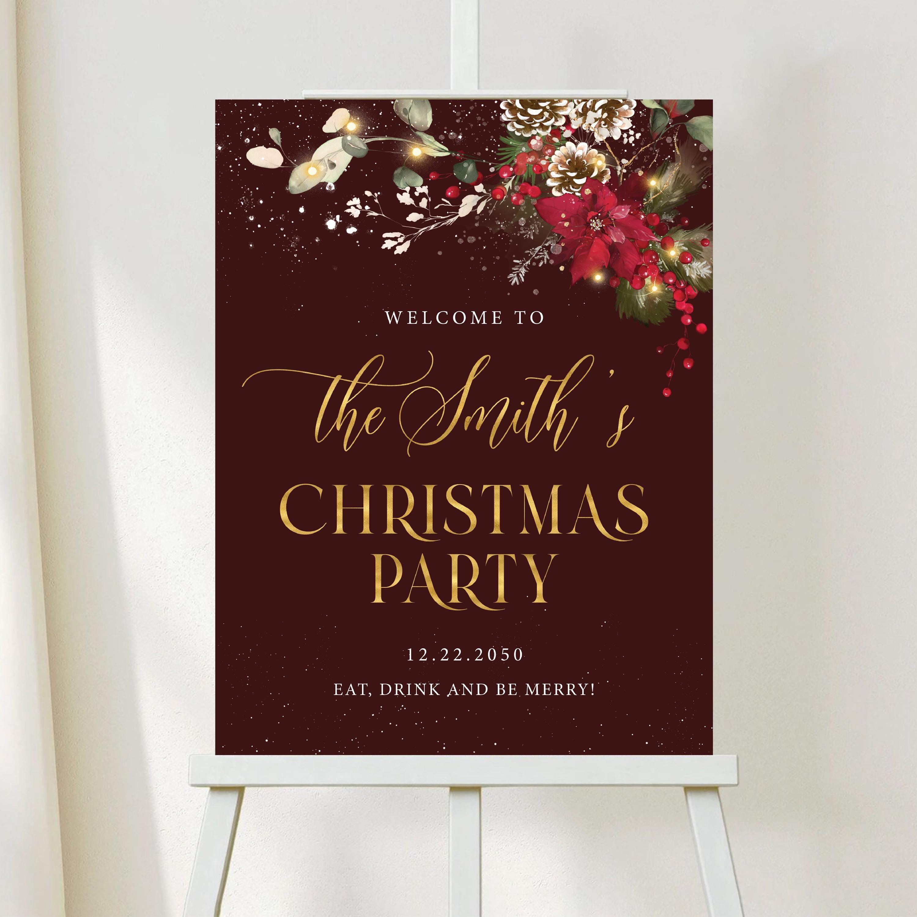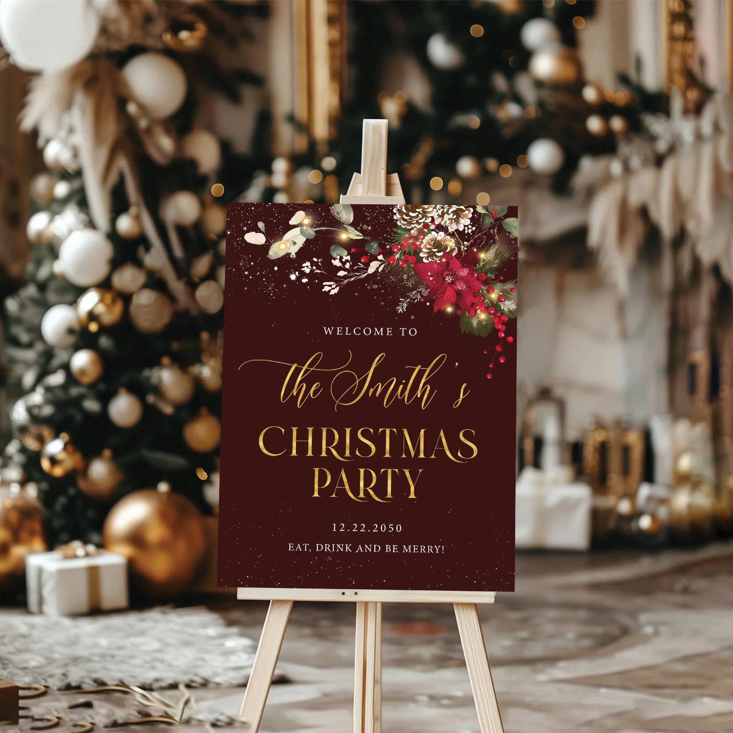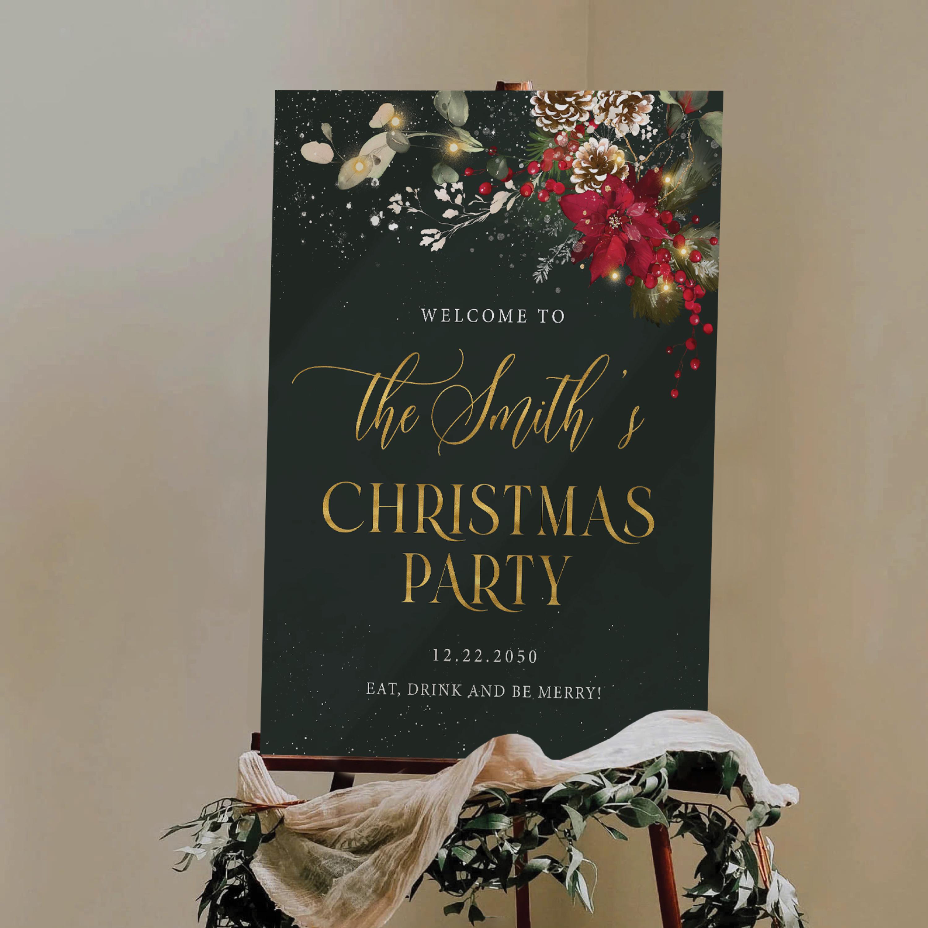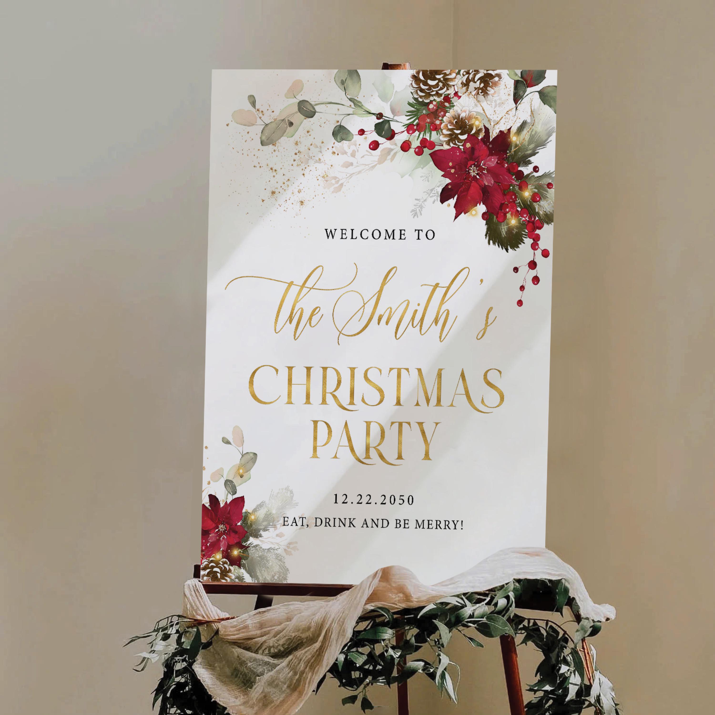 Christmas Party Welcome Sign – a elegant and festive design featuring gold accents, poinsettias, pine leaves, and red berries, bringing a warm and joyful holiday vibe. This welcome sign is a perfect statement piece for your family or company Christmas celebration, adding a touch of sophistication and seasonal charm to your event. The design can be personalized with your family name, event date, and custom message, making it a truly special addition to your Christmas party décor.