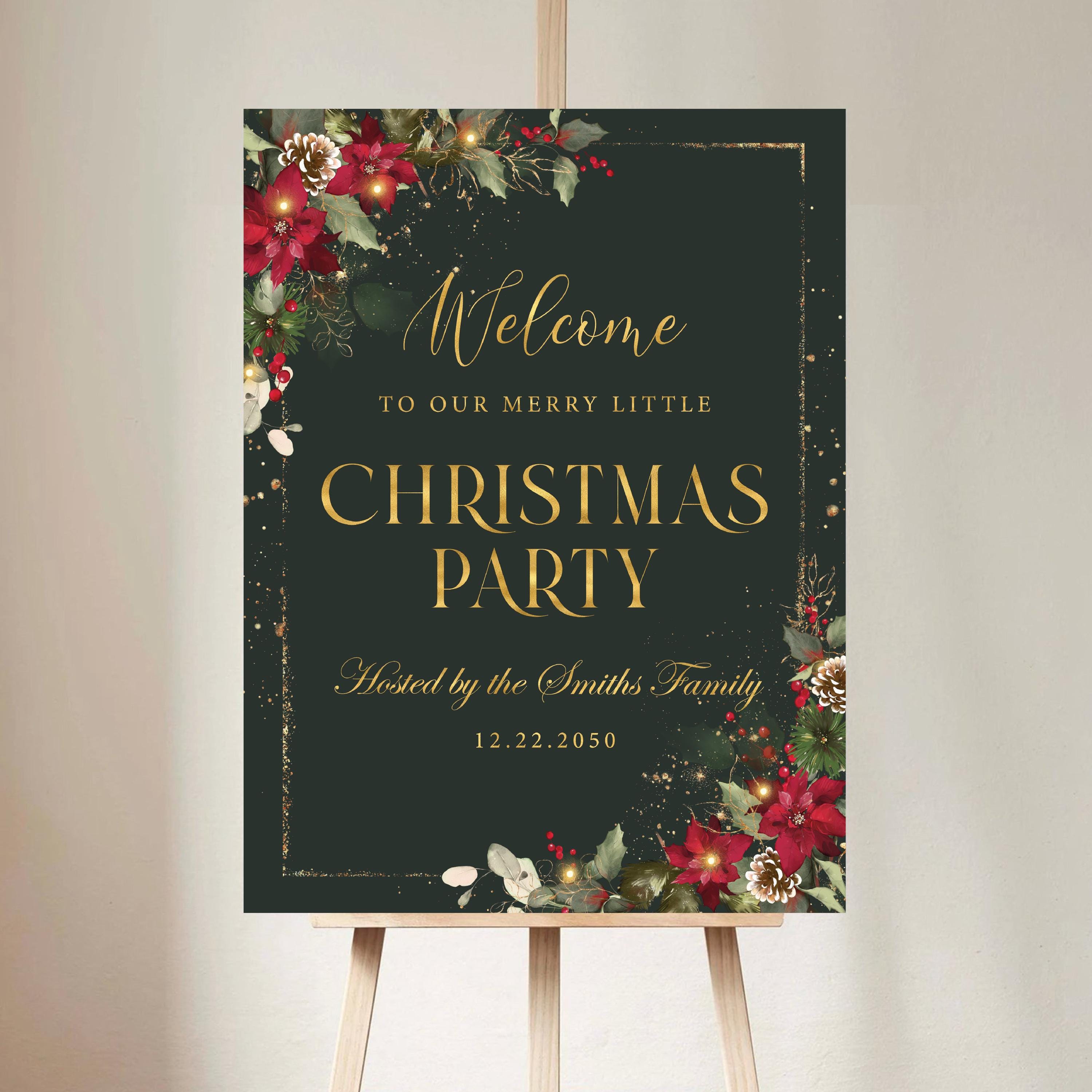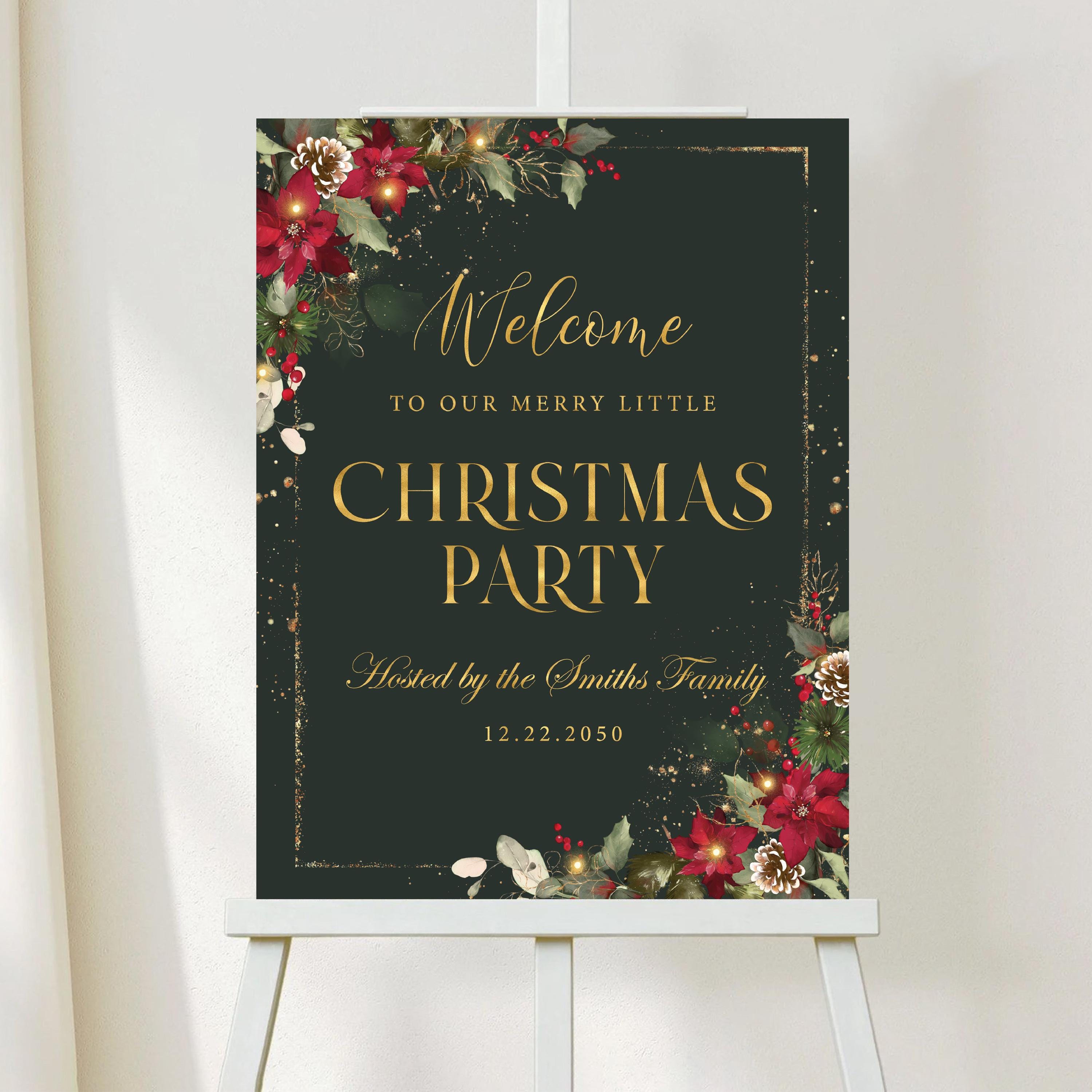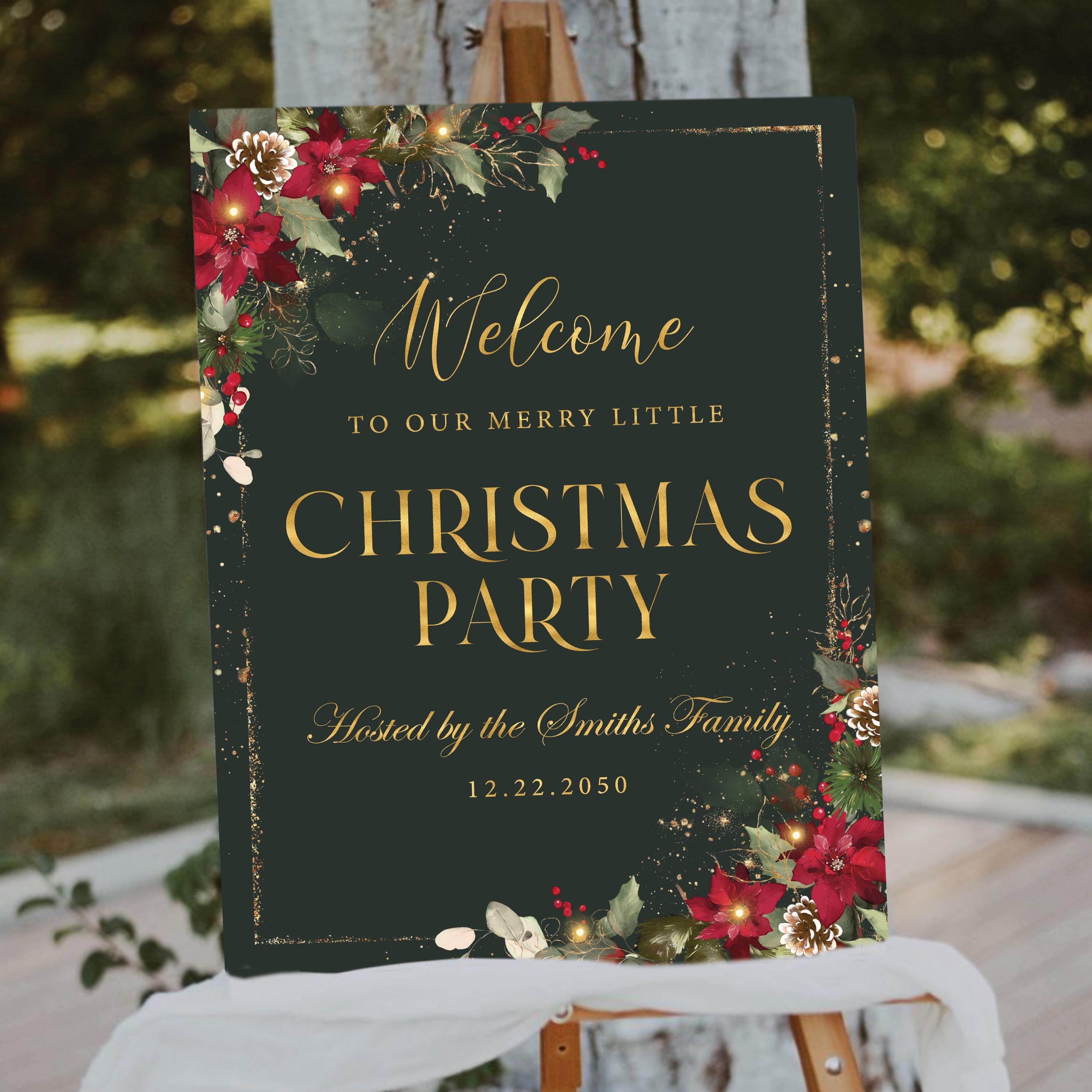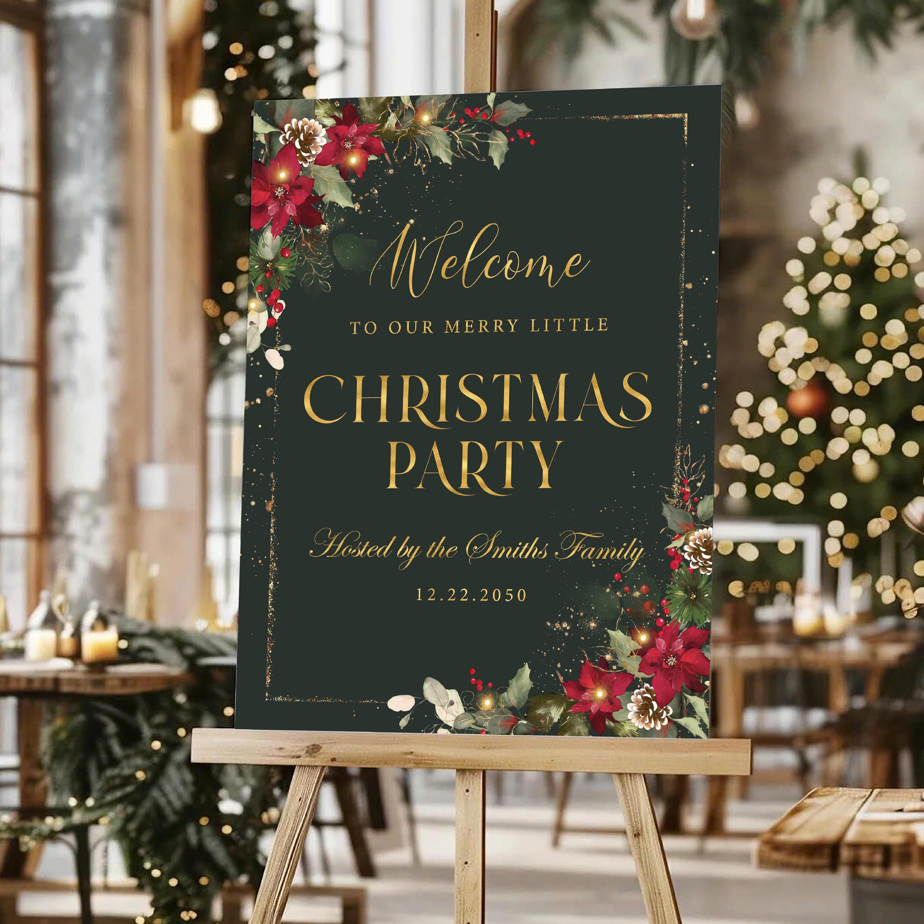 Christmas Party Welcome Sign – a luxurious and festive design featuring deep green tones with gold lettering, poinsettias, pinecones, and holly berries. This elegant sign adds a warm and joyful touch to your holiday celebration. This sign can be personalized with your event details and is available as a printed product or a digital file, making it perfect for any Christmas gathering.