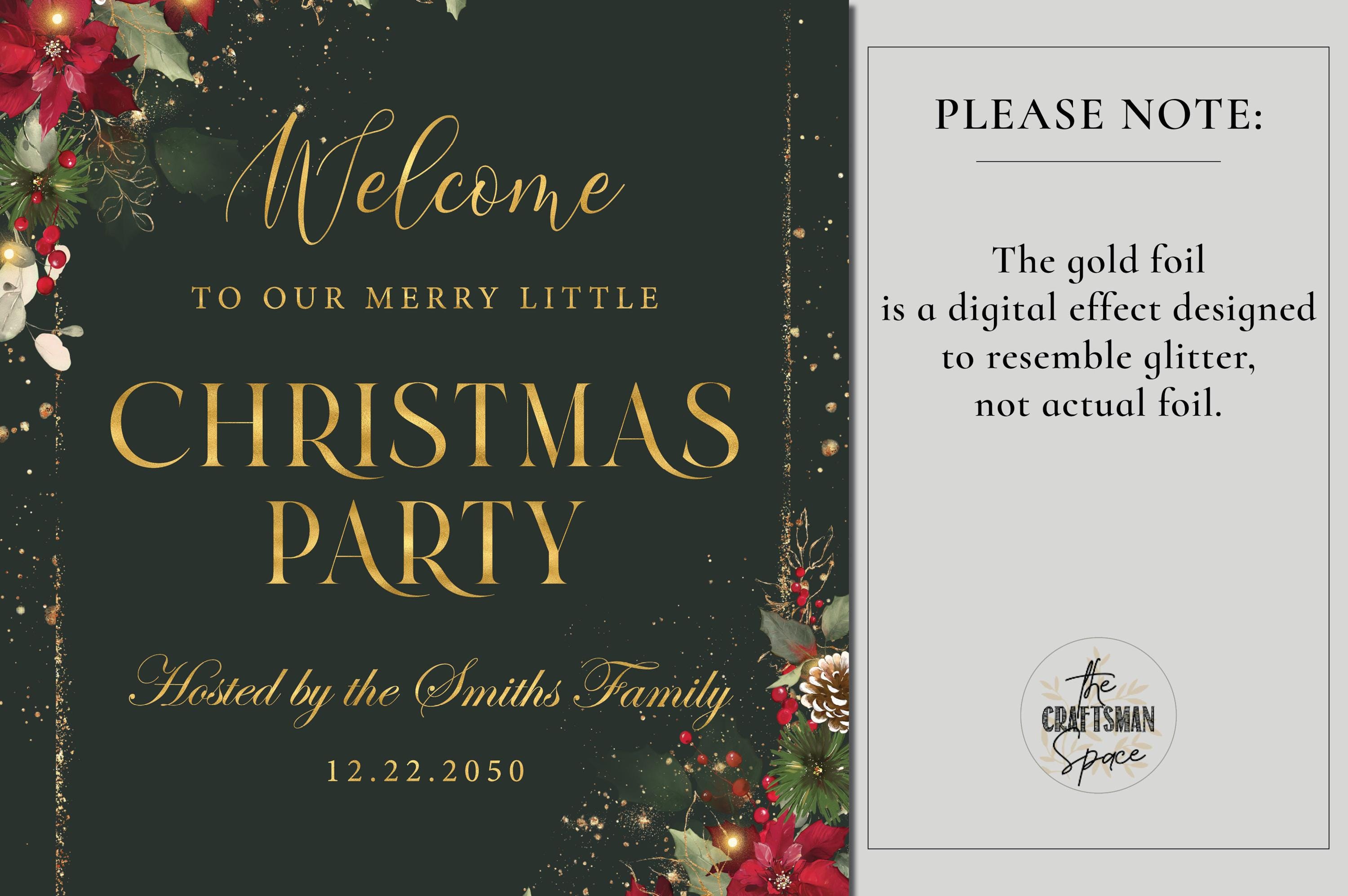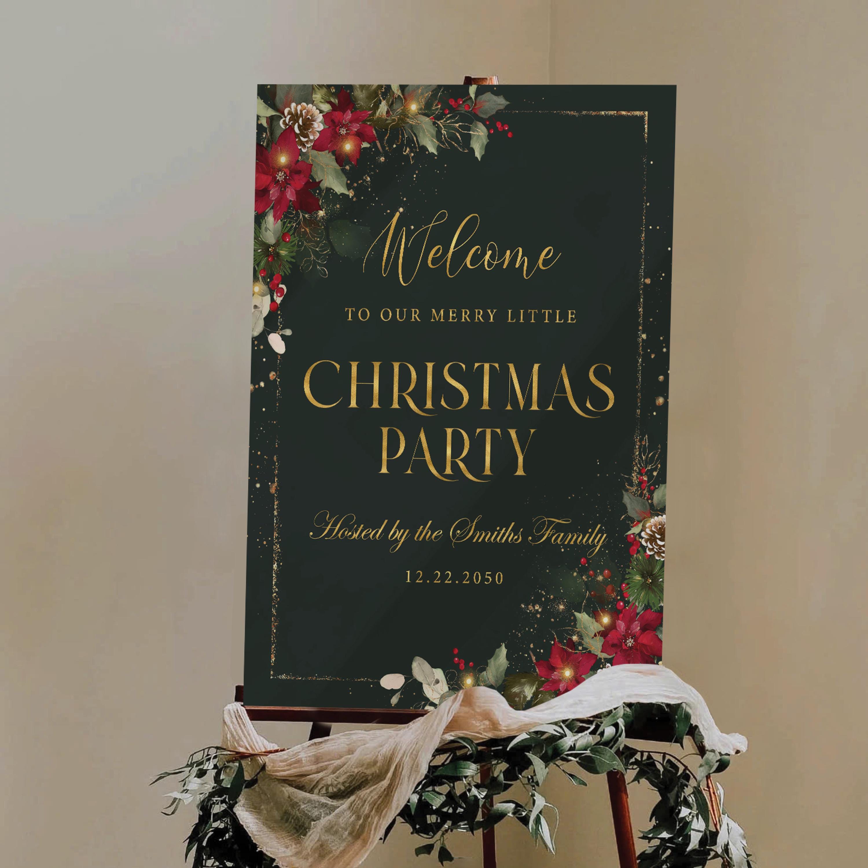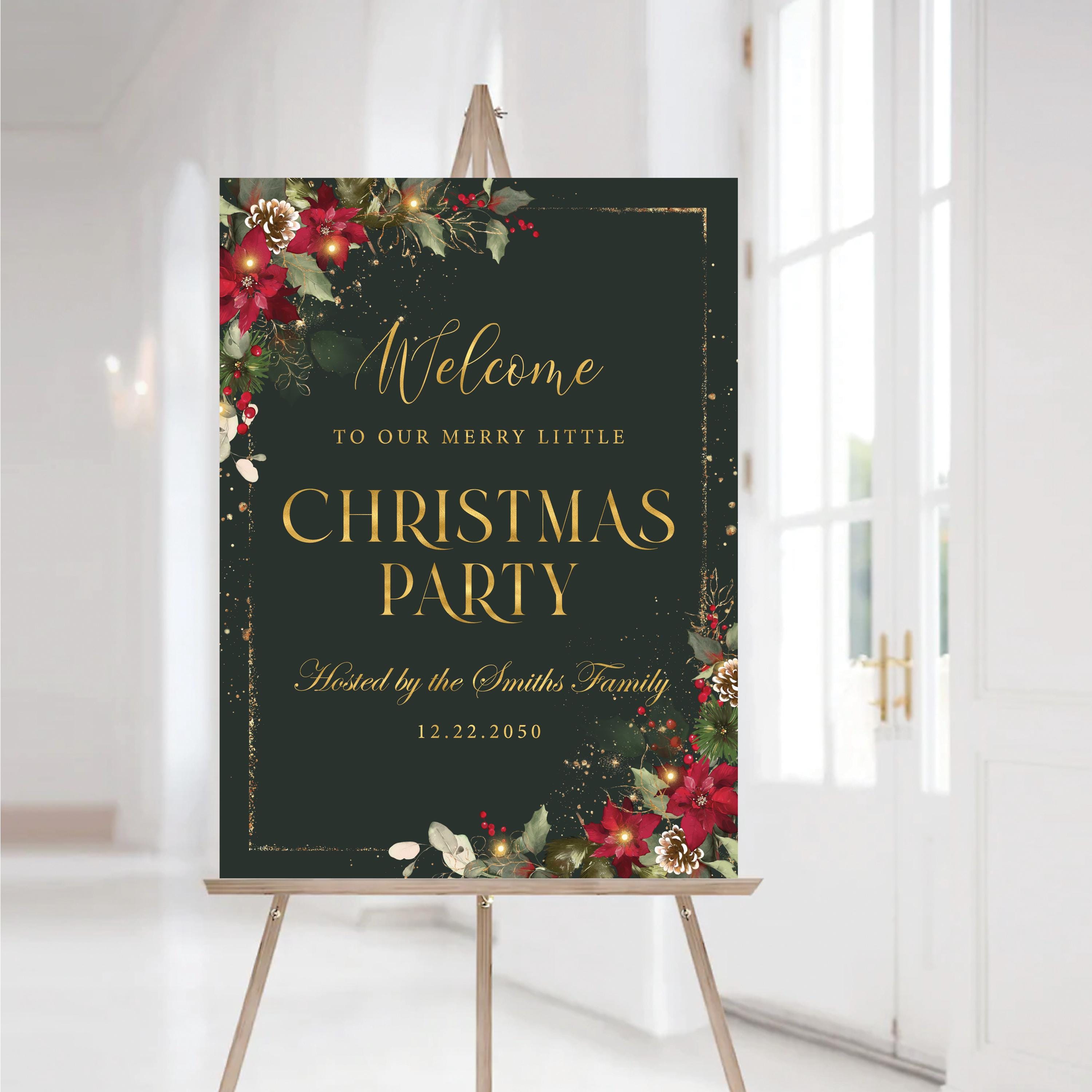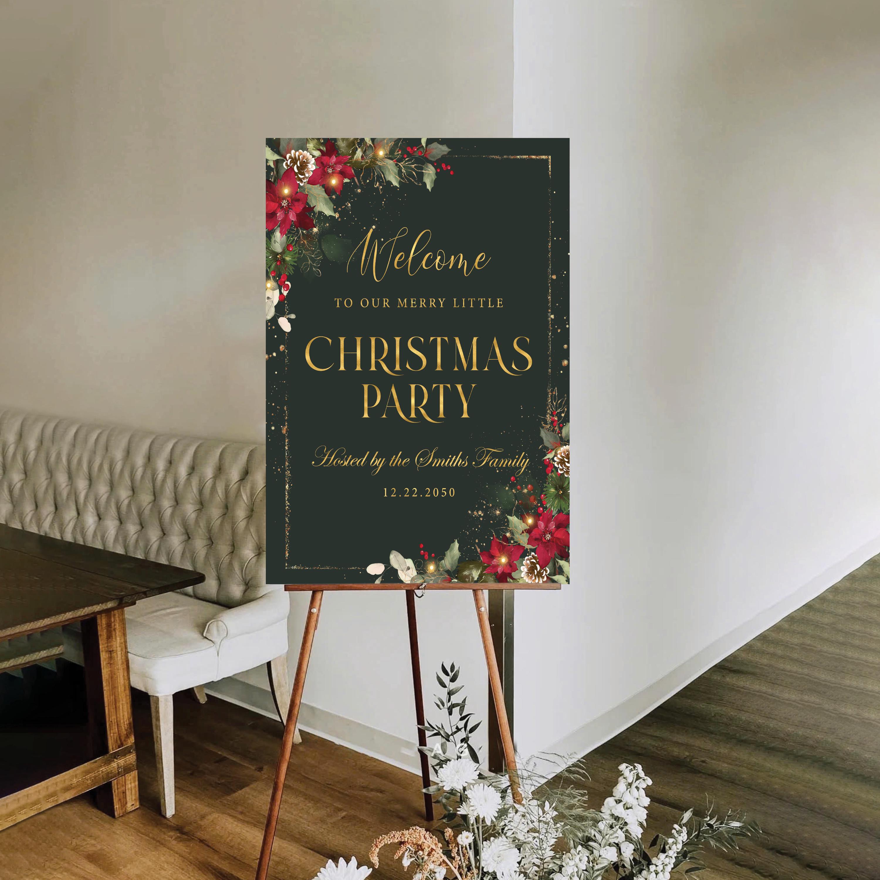 Christmas Party Welcome Sign – a luxurious and festive design featuring deep green tones with gold lettering, poinsettias, pinecones, and holly berries. This elegant sign adds a warm and joyful touch to your holiday celebration. This sign can be personalized with your event details and is available as a printed product or a digital file, making it perfect for any Christmas gathering.