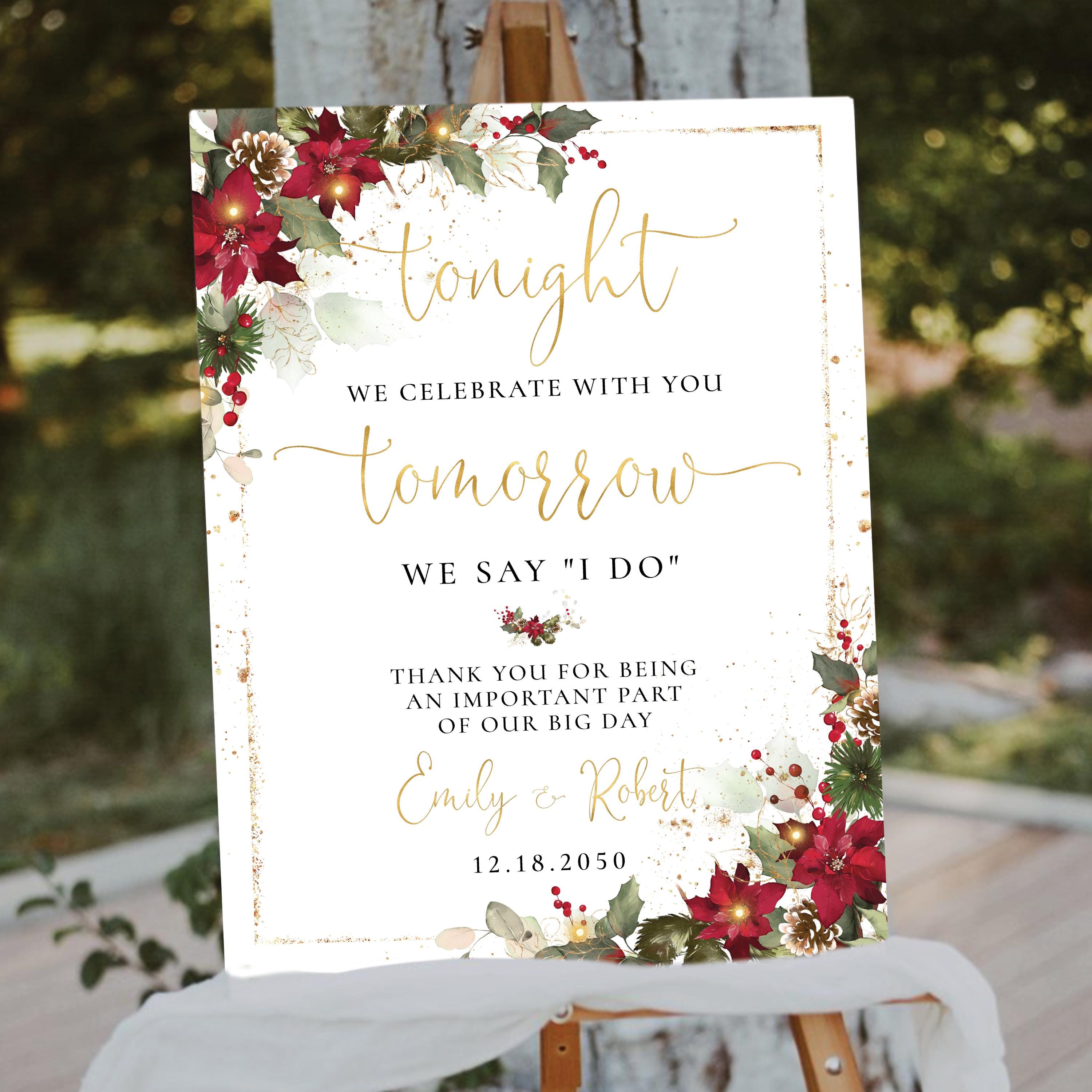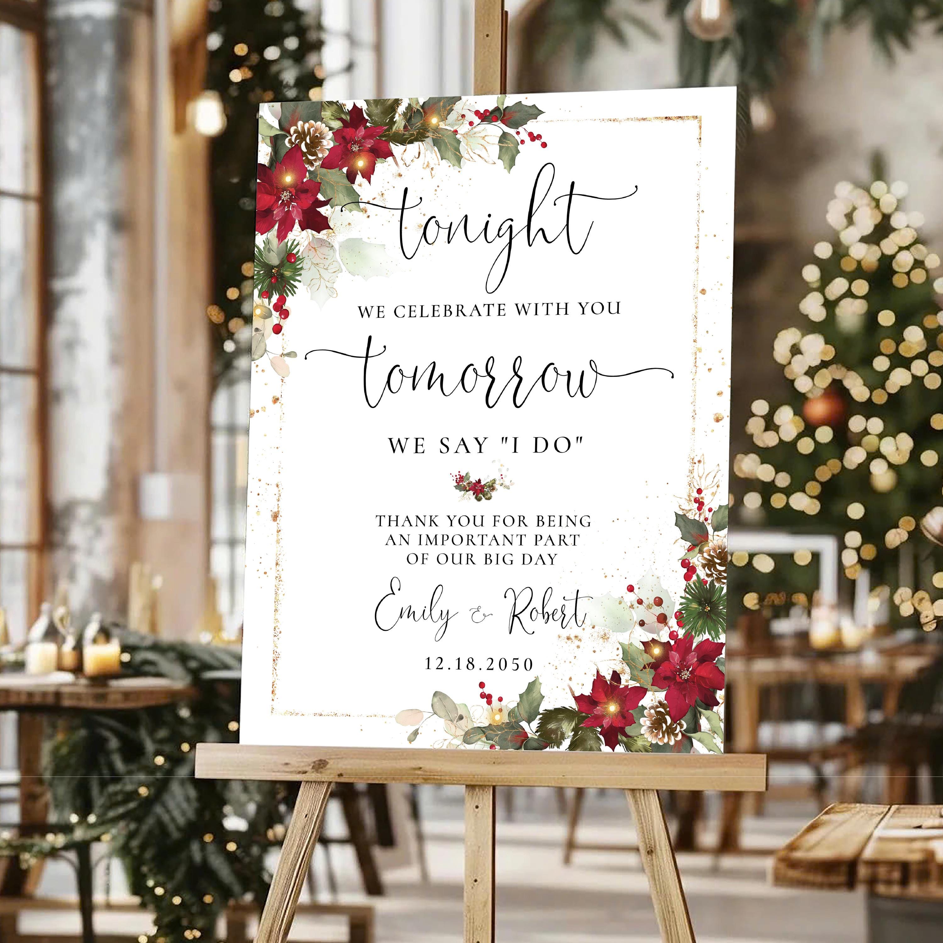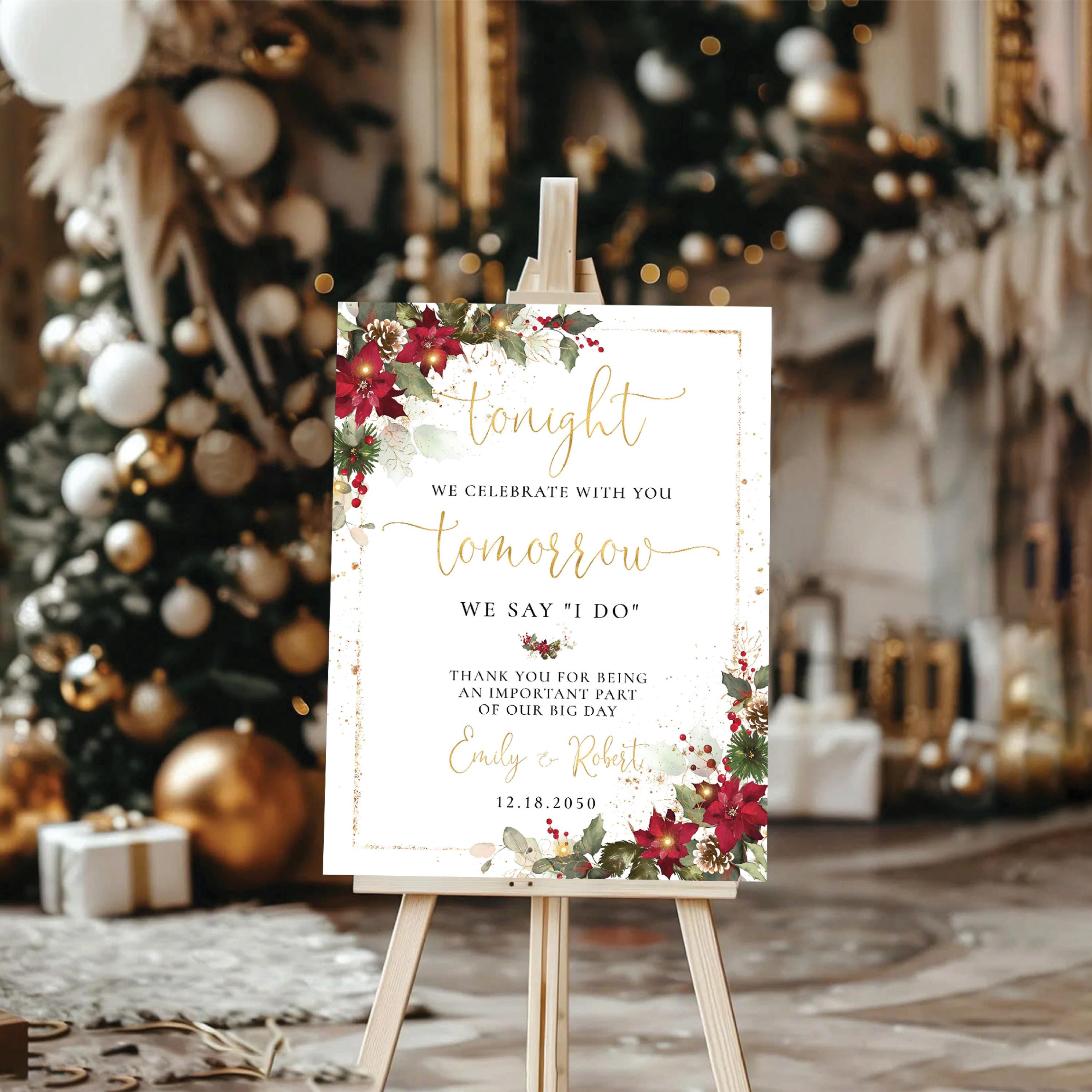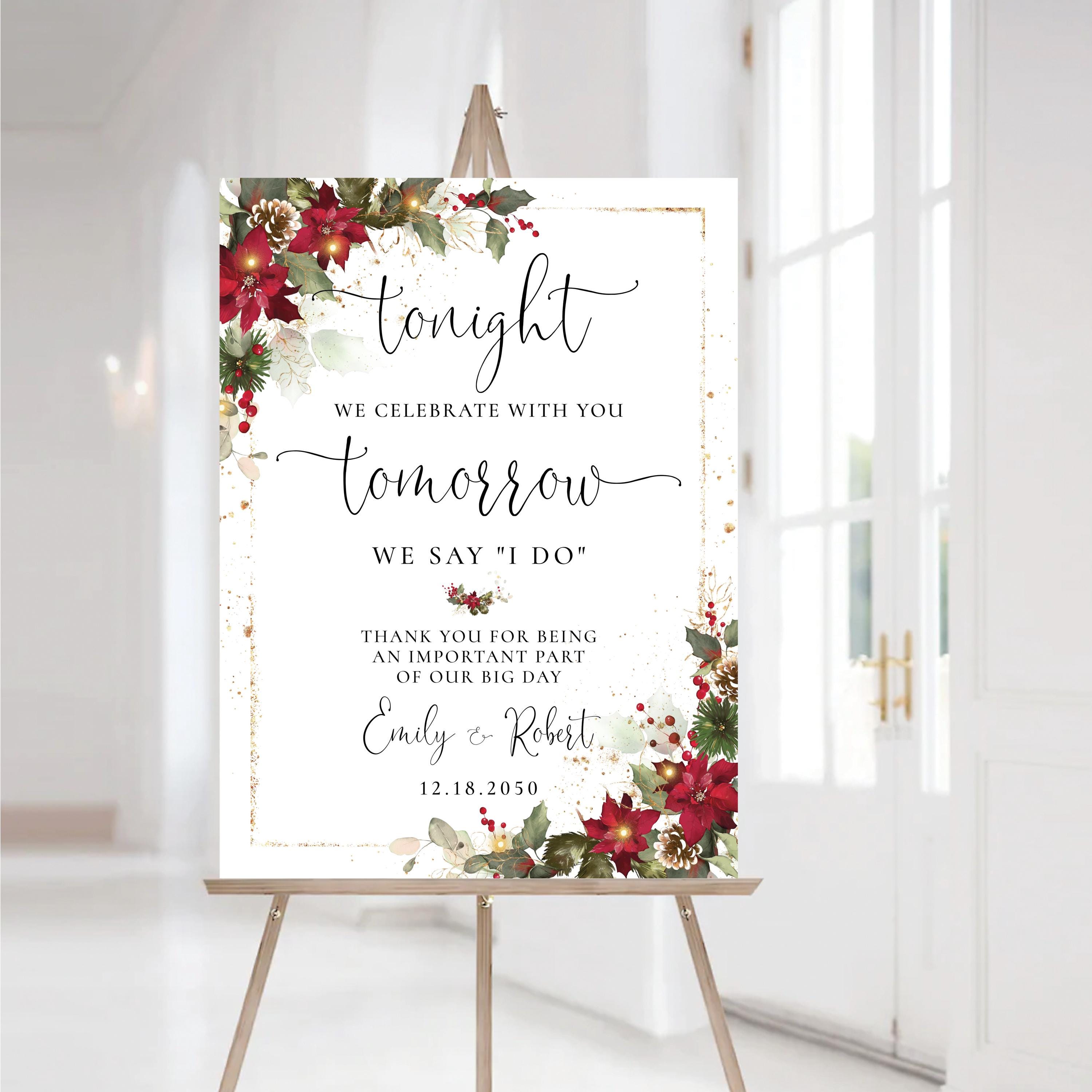 Christmas Rehearsal Dinner Welcome Sign features elegant handwritten fonts, highlighted with vibrant red poinsettias and sparkling lights. The design is accented with a luxurious gold frame, adding warmth and sophistication. This welcome sign can be personalized with your party details, creating a festive and memorable Christmas atmosphere from the very first glance.
