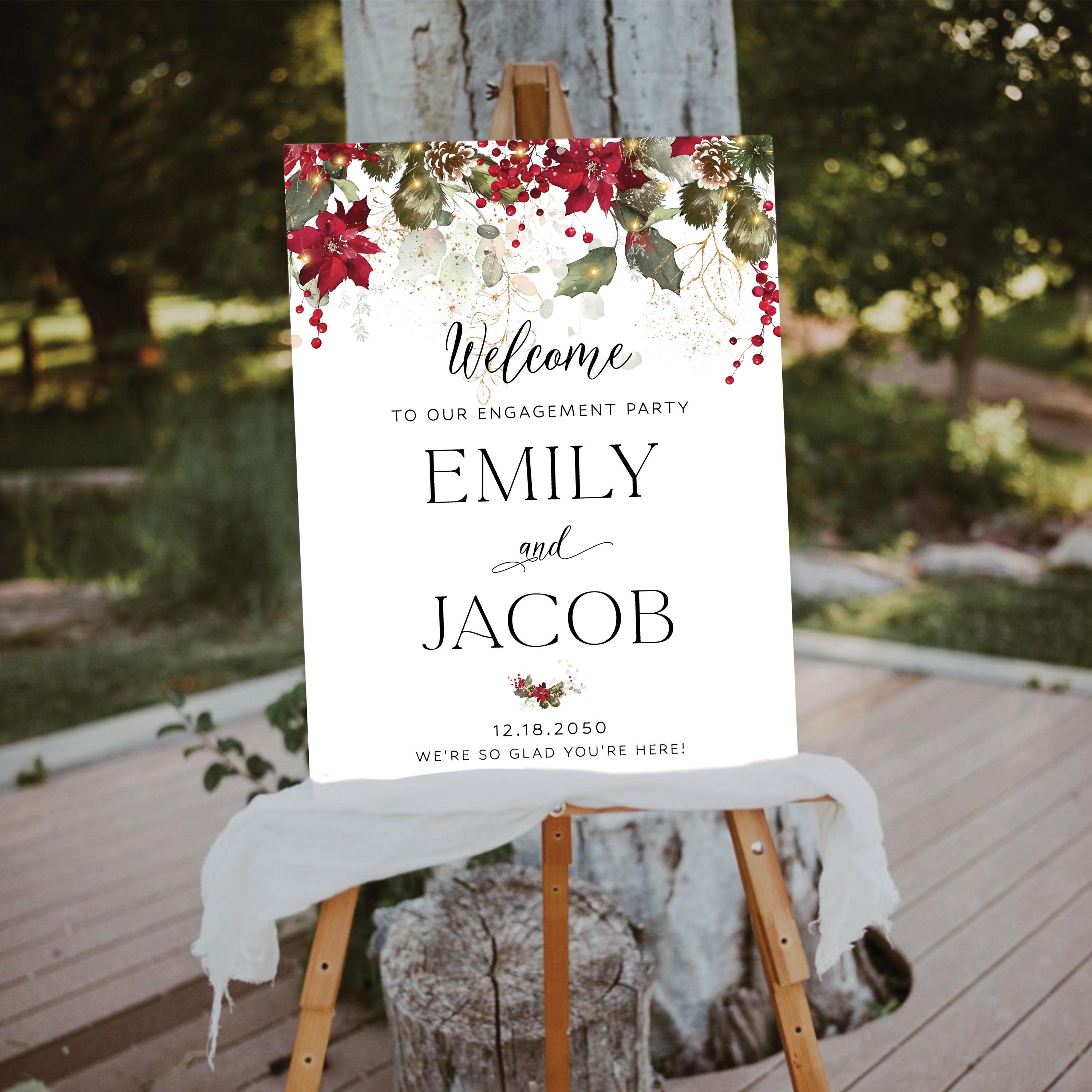 Featuring rich red poinsettias, holly berries, pinecones, and sparkling gold accents, this design beautifully blends holiday warmth with timeless elegance — perfect for a cozy winter engagement party. This welcome sign can be personalized with your party details, ideal for adding a touch of seasonal magic to your special day.
