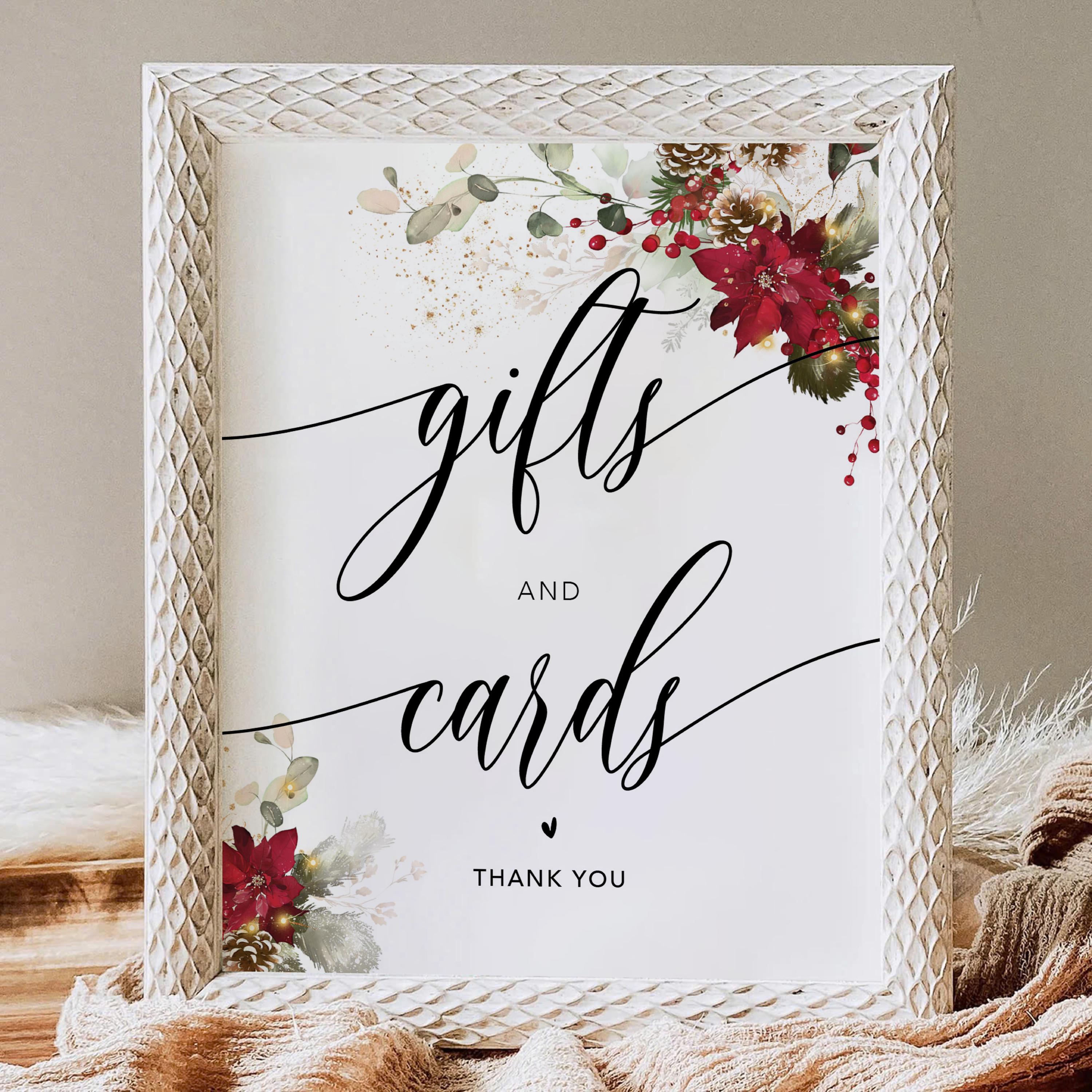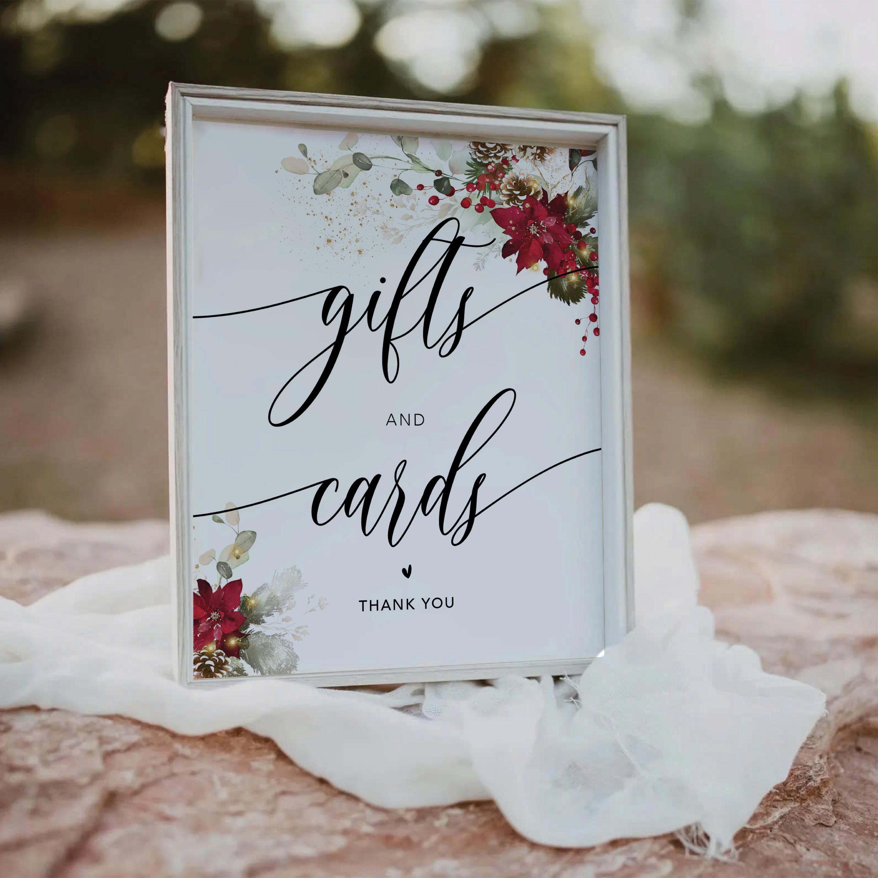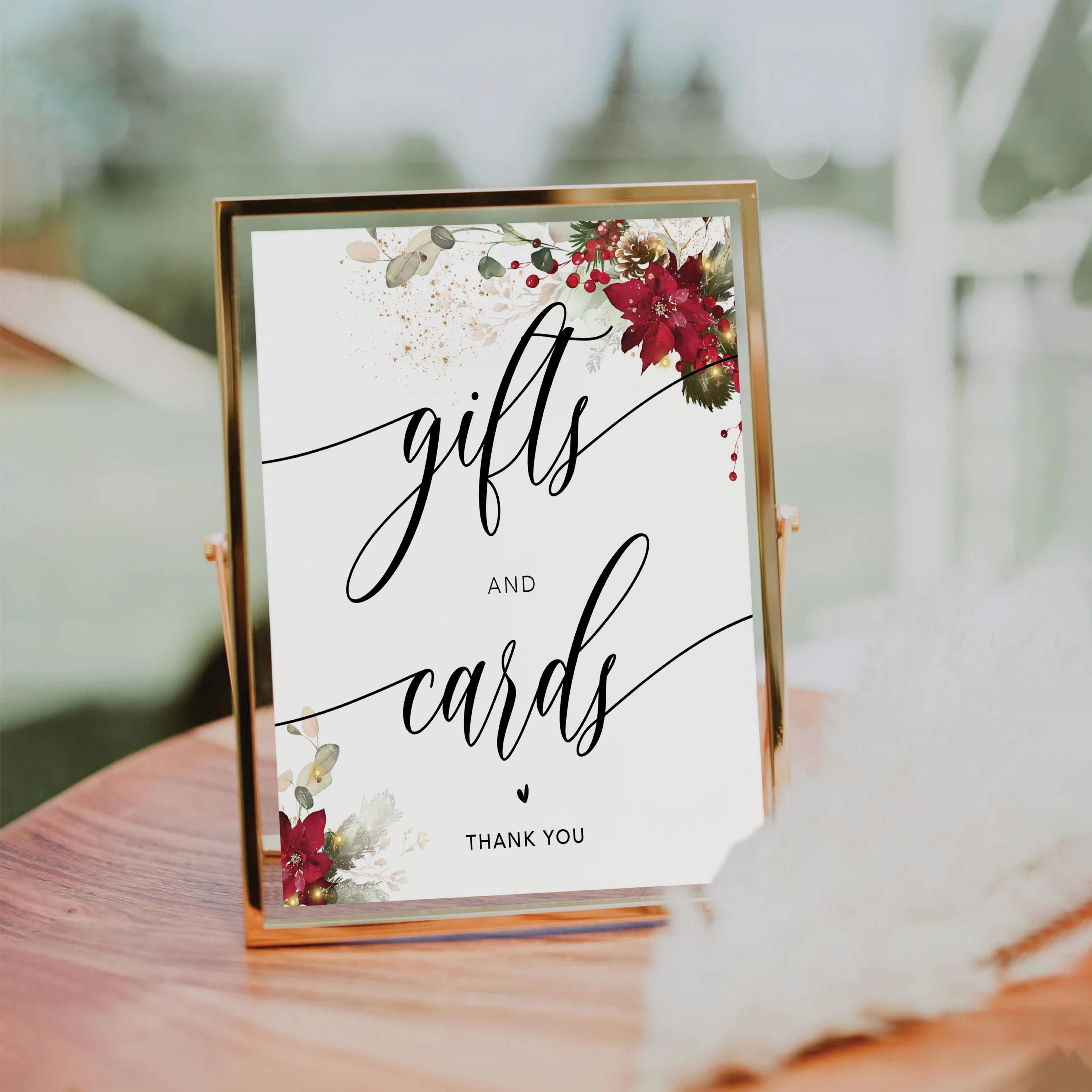 This Poinsettia Cards and Gifts Sign features a beautiful holiday floral design, perfect for Christmas parties, winter weddings, holiday showers, or seasonal gatherings. You can easily personalize it with your own details to match your event’s style and theme.
