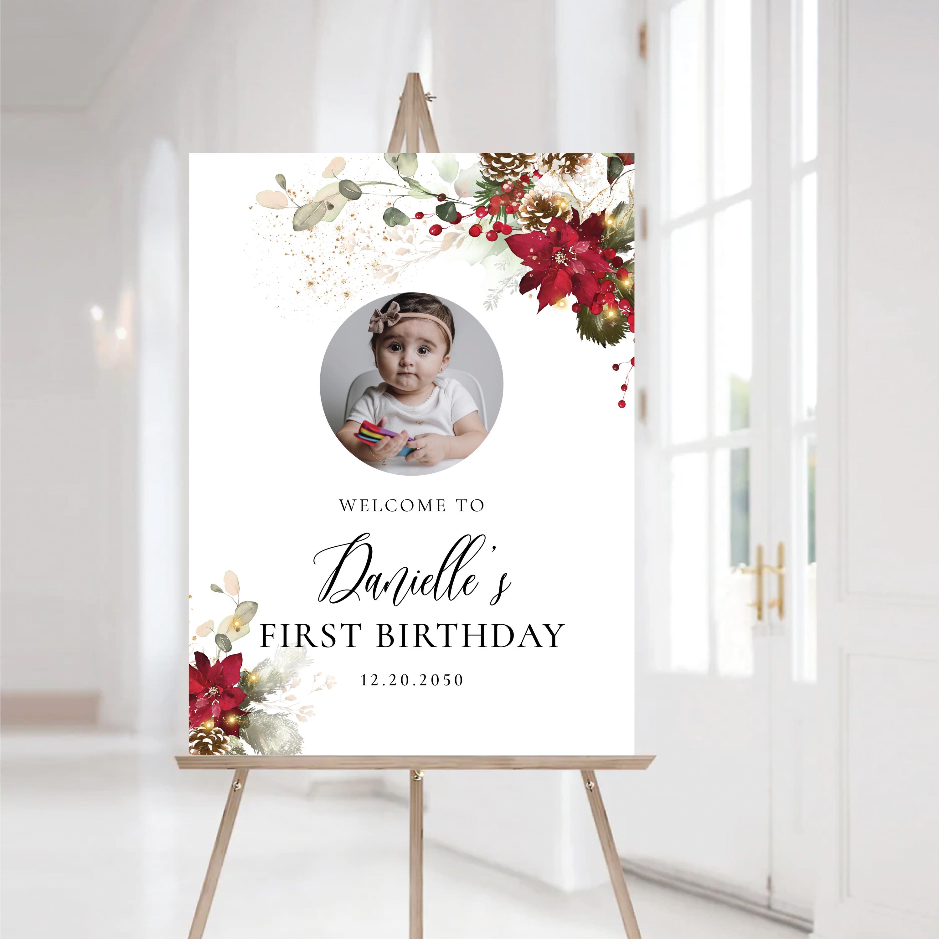 This Christmas Photo Birthday Welcome Sign features vibrant red poinsettias, perfect for celebrating a birthday during the holiday season. The design can be easily personalized with your own details, making your celebration warm, joyful, and uniquely yours.