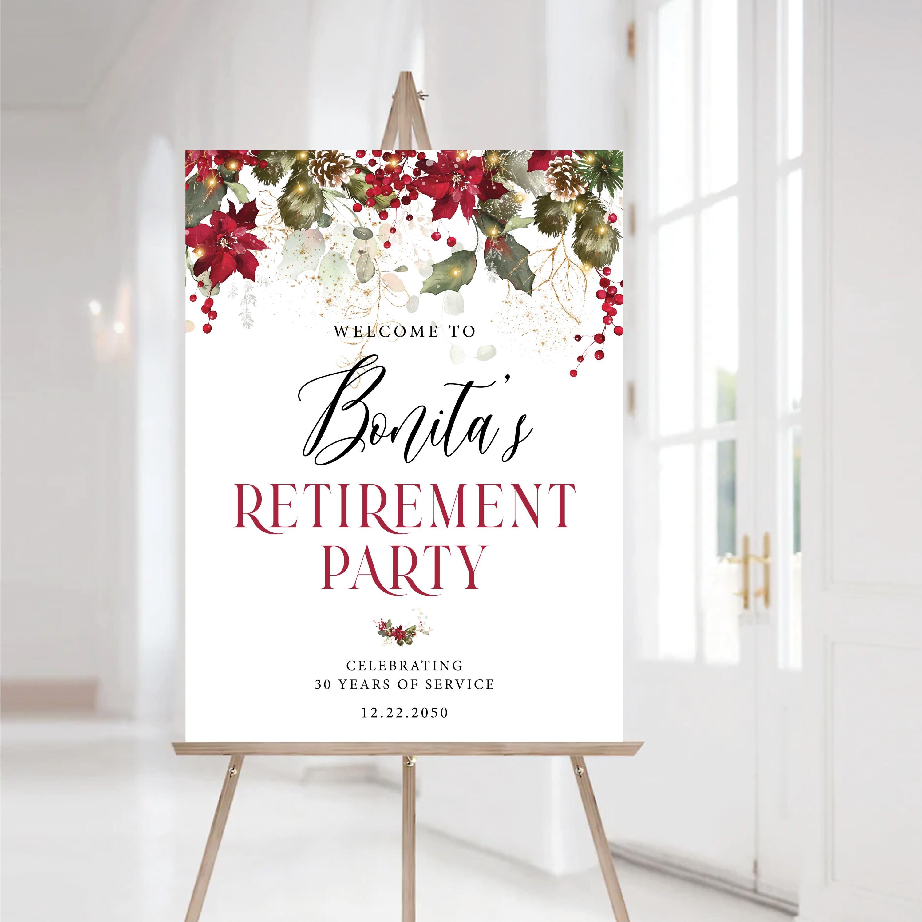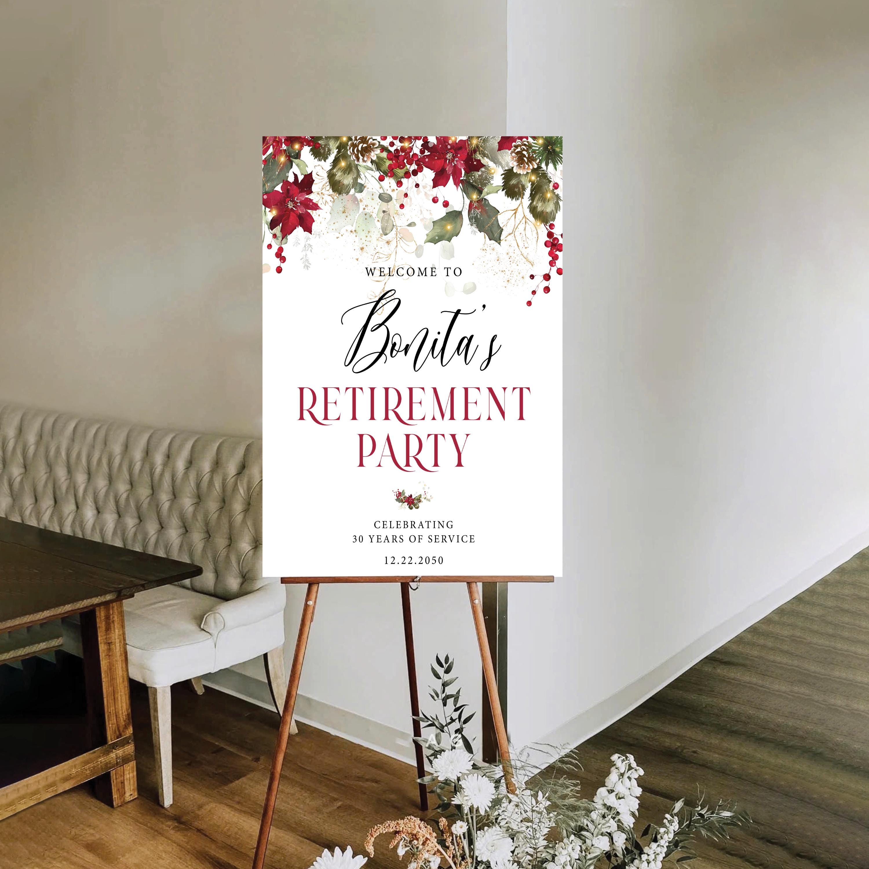 This Floral Retirement Party Welcome Sign features vibrant red poinsettias, adding a cheerful and elegant touch to your celebration. Easily personalize it with your own party details to create a warm and memorable welcome for the guest of honor.