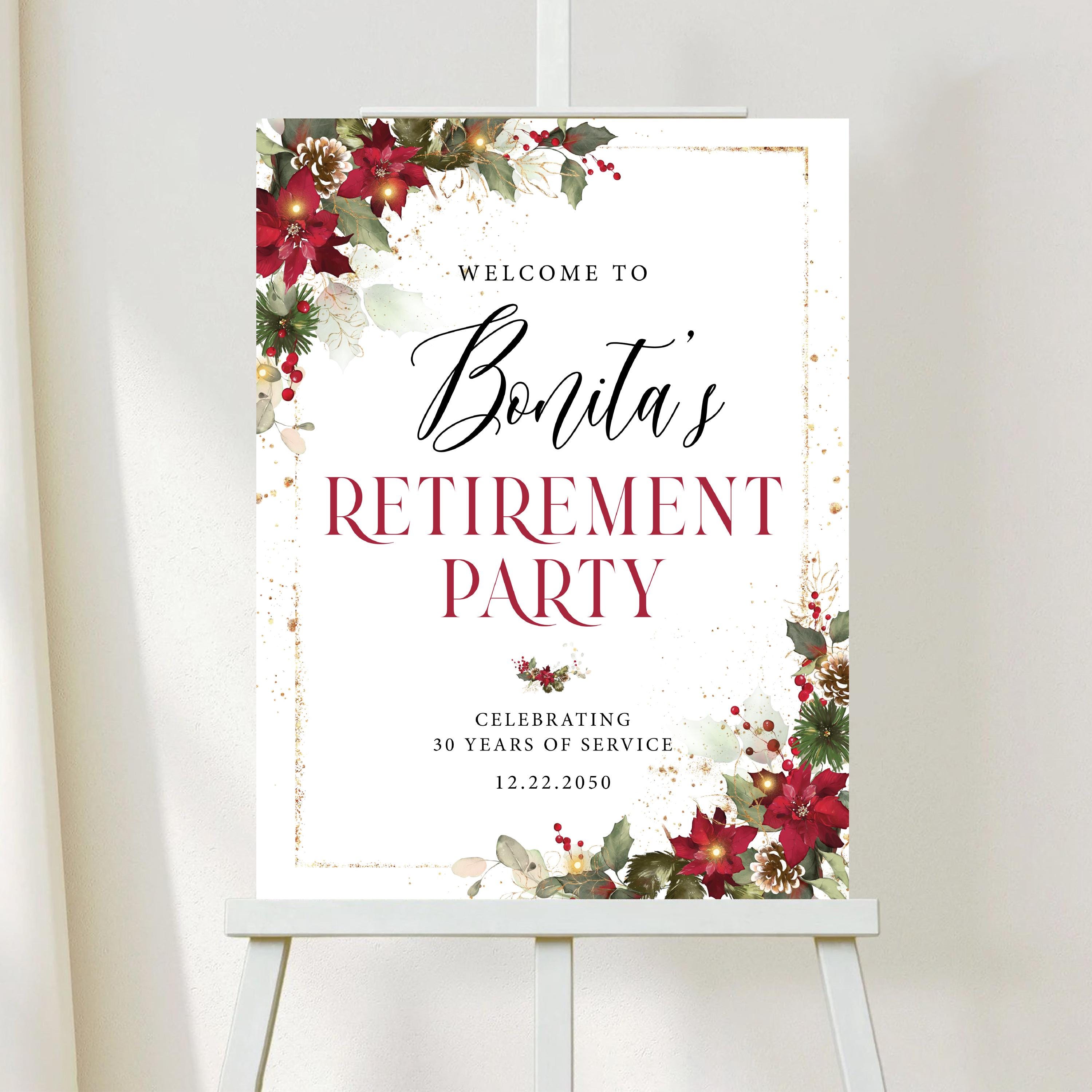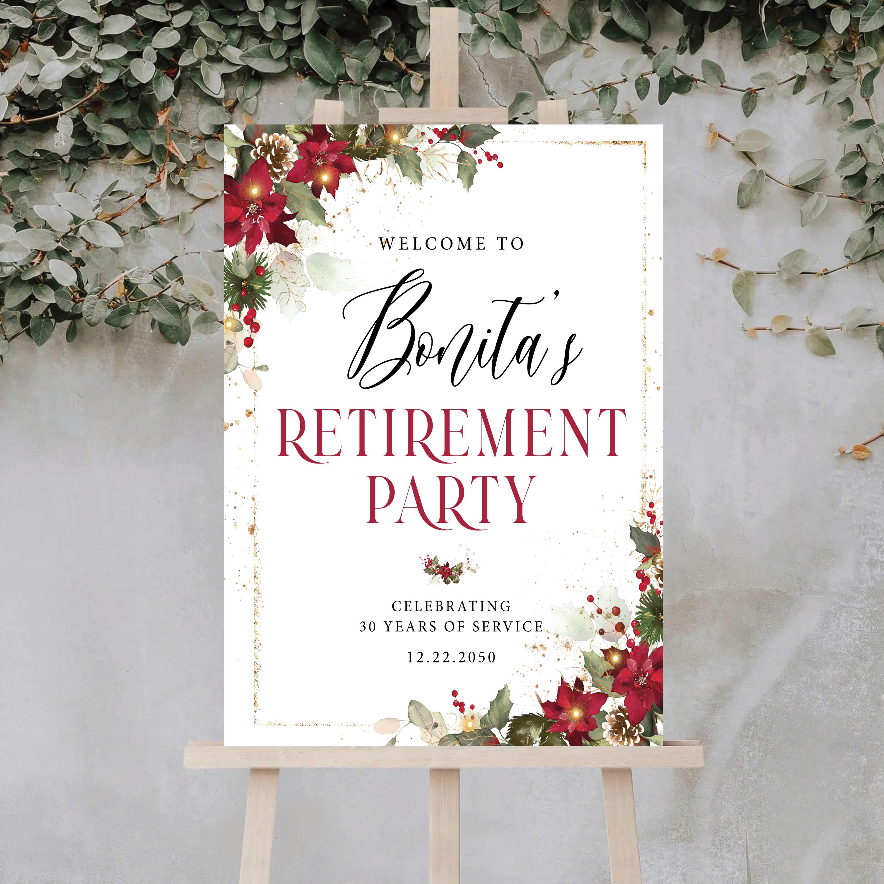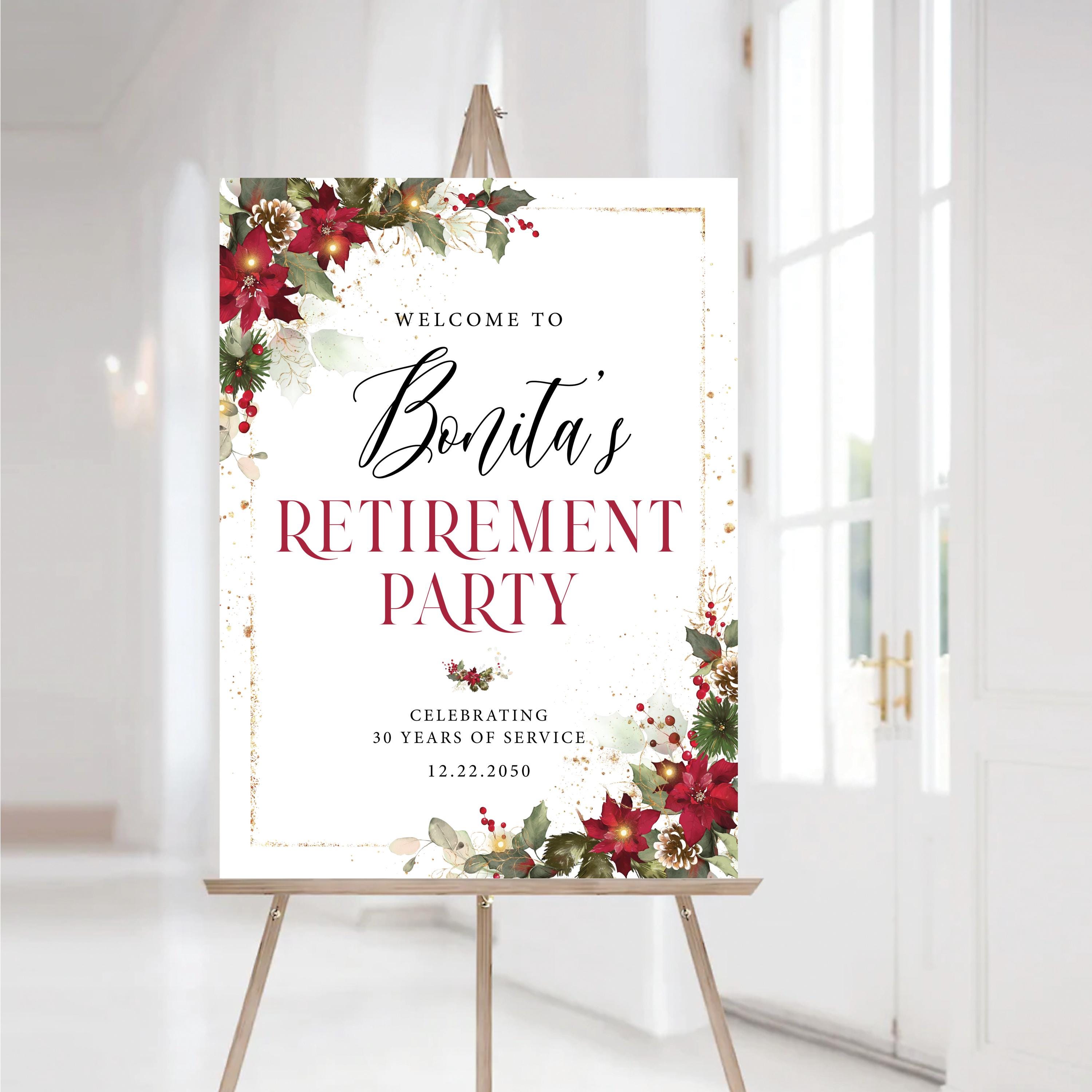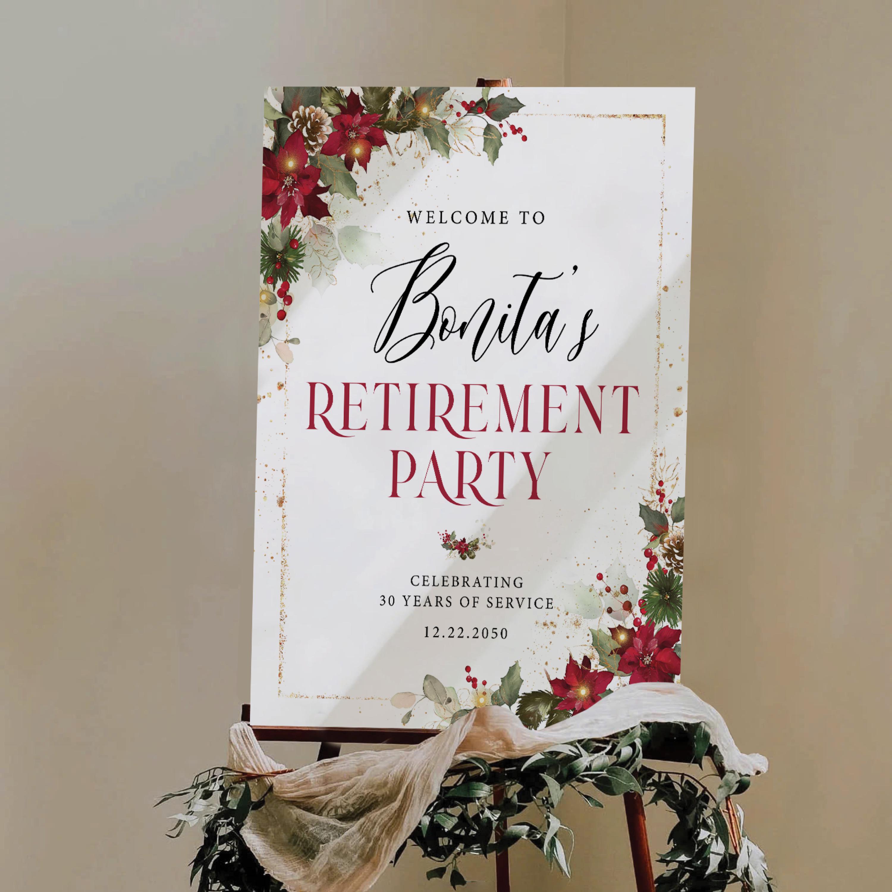 This Floral Retirement Party Welcome Sign features vibrant red poinsettias, adding a cheerful and elegant touch to your celebration. Easily personalize it with your own party details to create a warm and memorable welcome for the guest of honor.