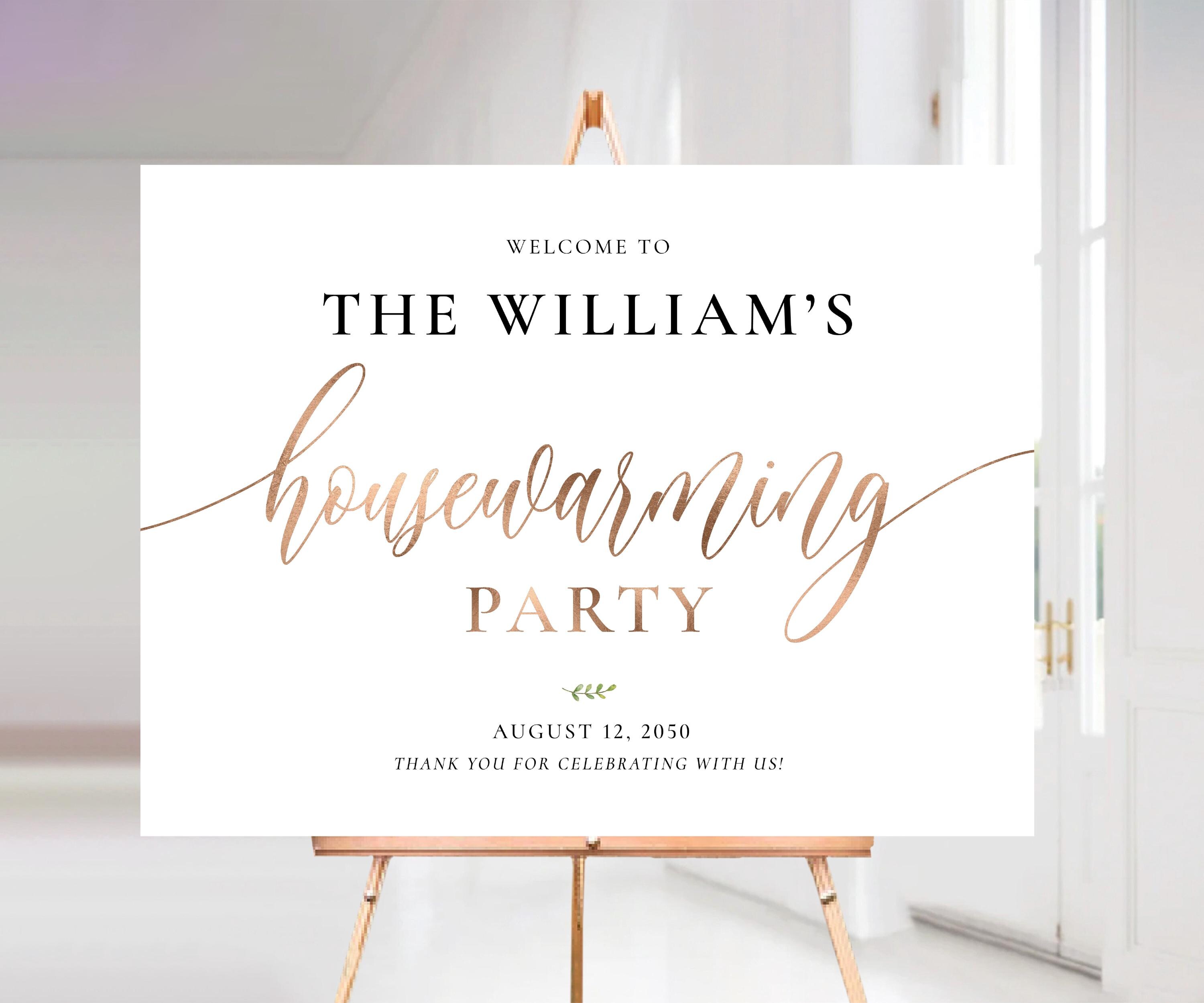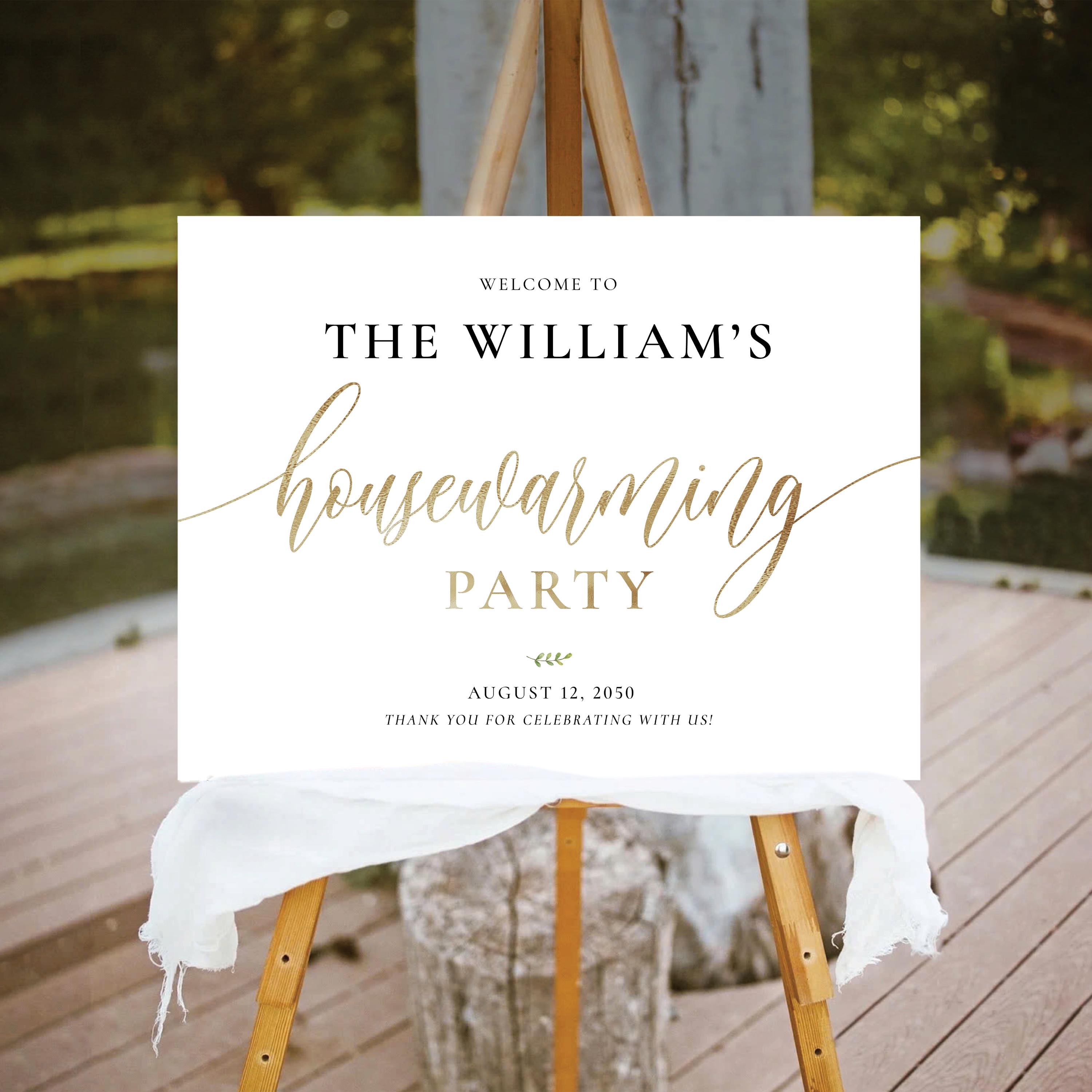 Modern Housewarming Party Welcome Sign. A stylish design that combines elegant handwritten script with clean modern fonts. Personalized with your party details, this welcome sign adds a contemporary and personal touch to your special gathering.