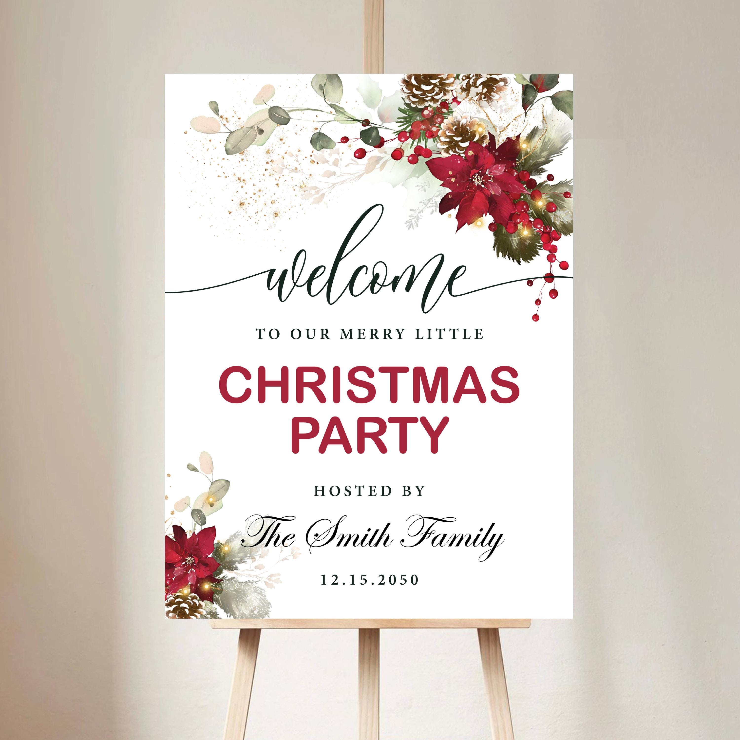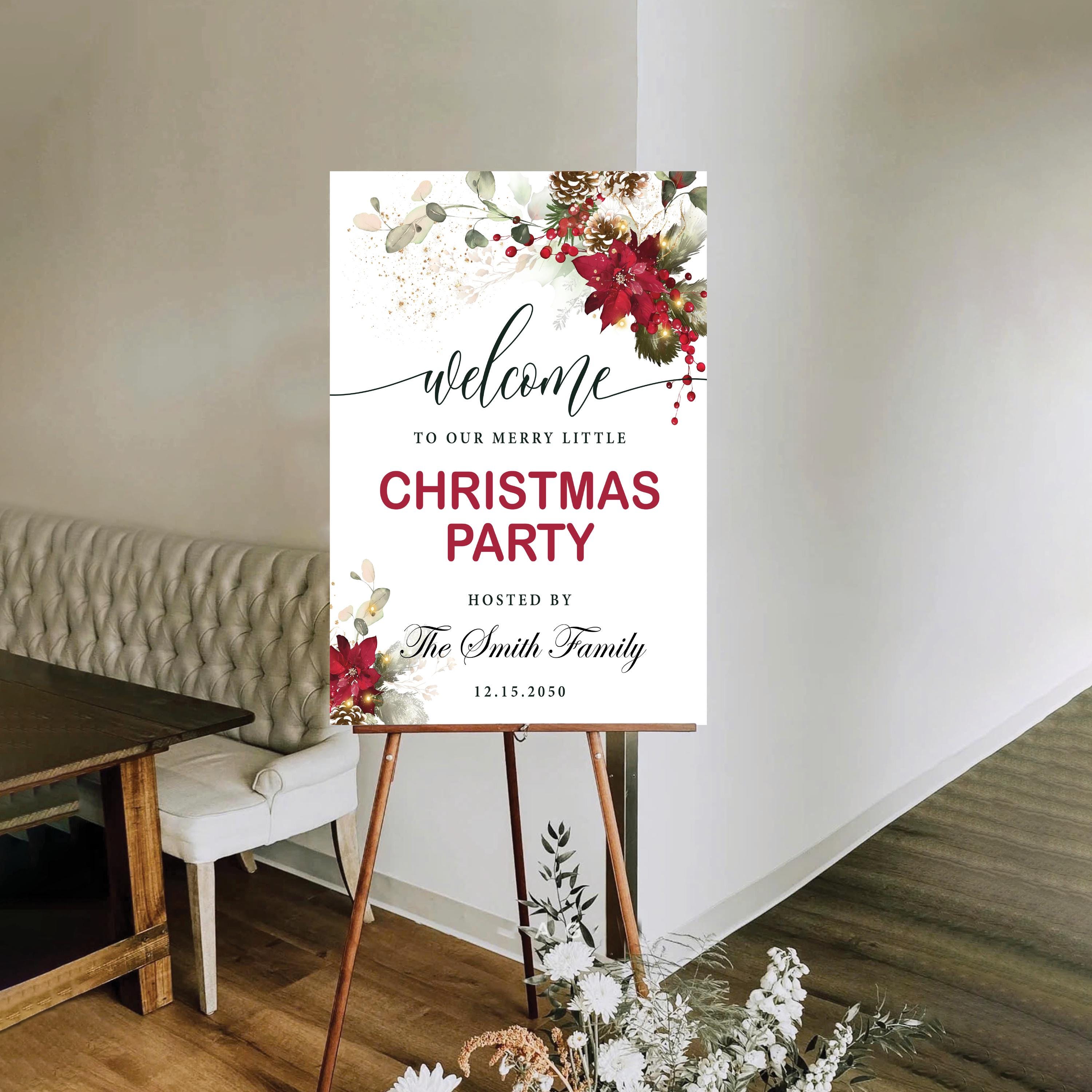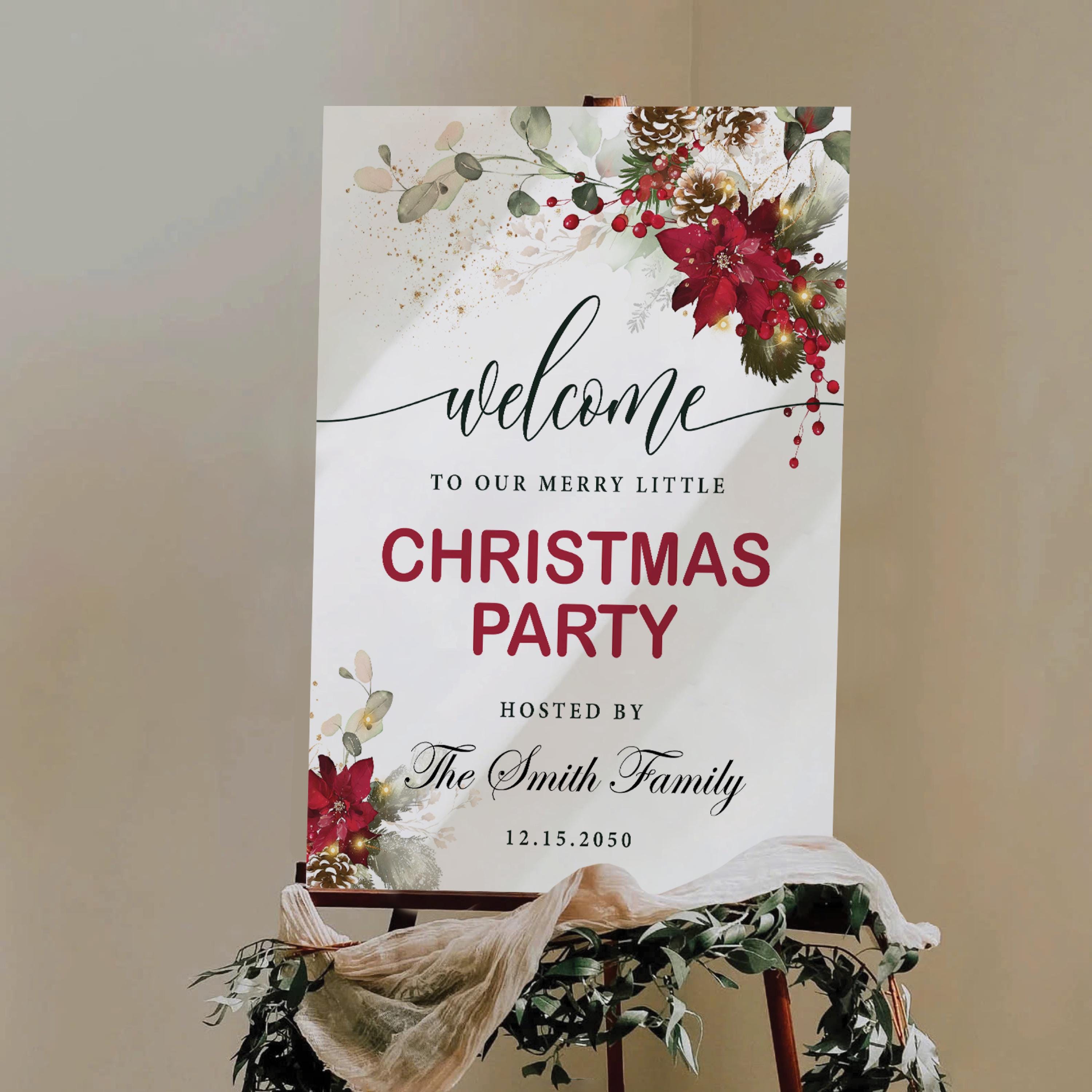 Red Floral Christmas Party Welcome Sign - Add a touch of festive elegance to your holiday celebration with this beautiful Christmas Party Welcome Sign. Designed with lush red poinsettias, berries, pinecones, and soft golden accents, this sign creates a warm and joyful first impression for your guests. Fully customizable with your event details, it is available as both a printed sign or a digital file, making it the perfect addition to any Christmas party or winter gathering.