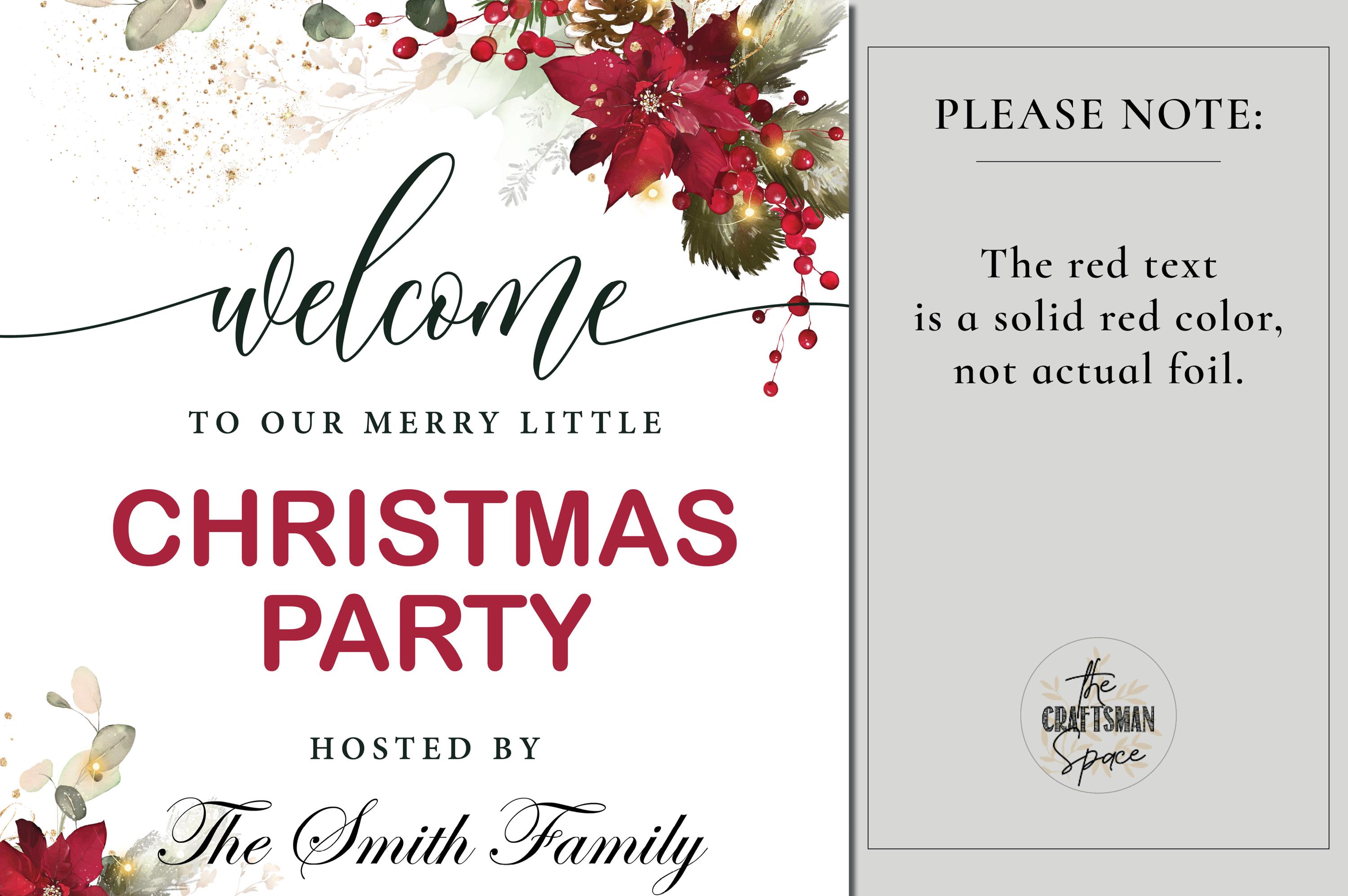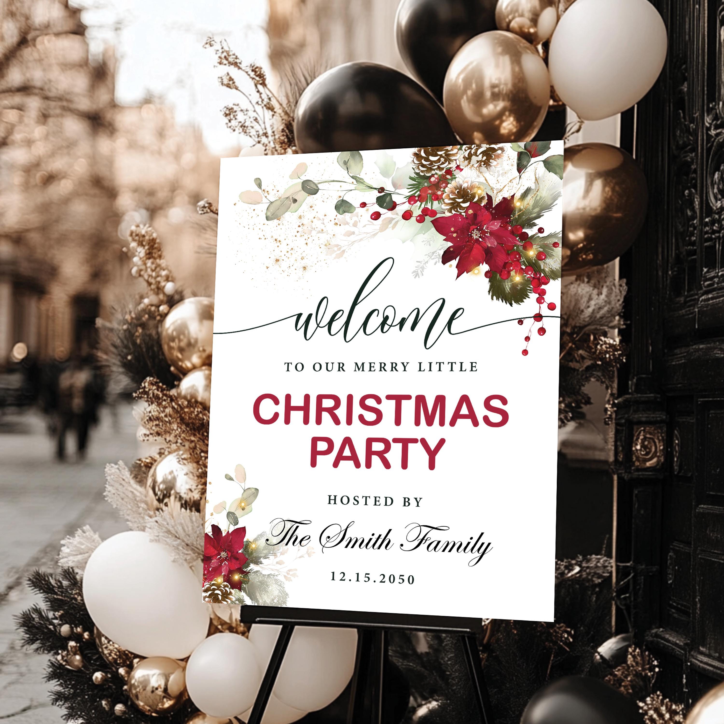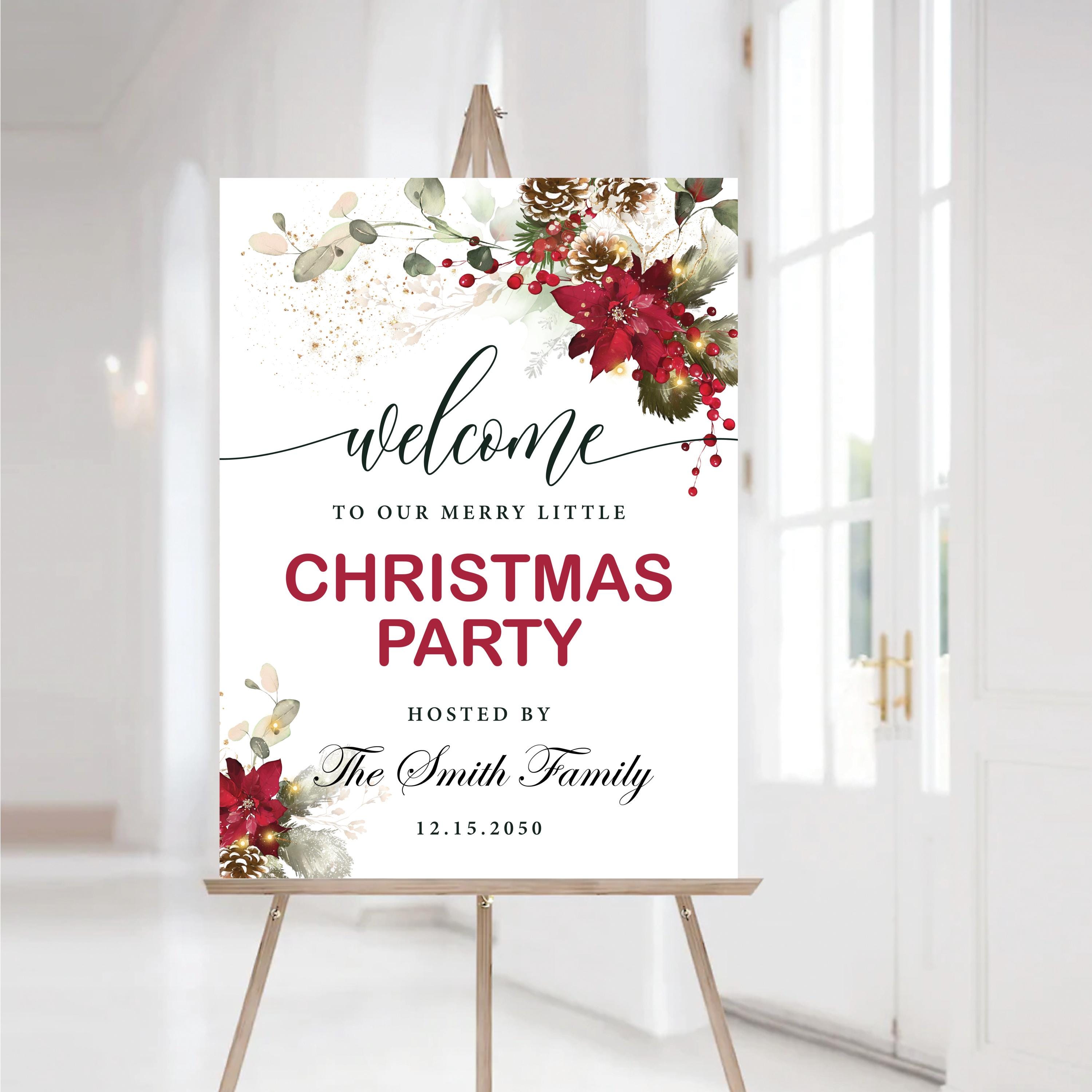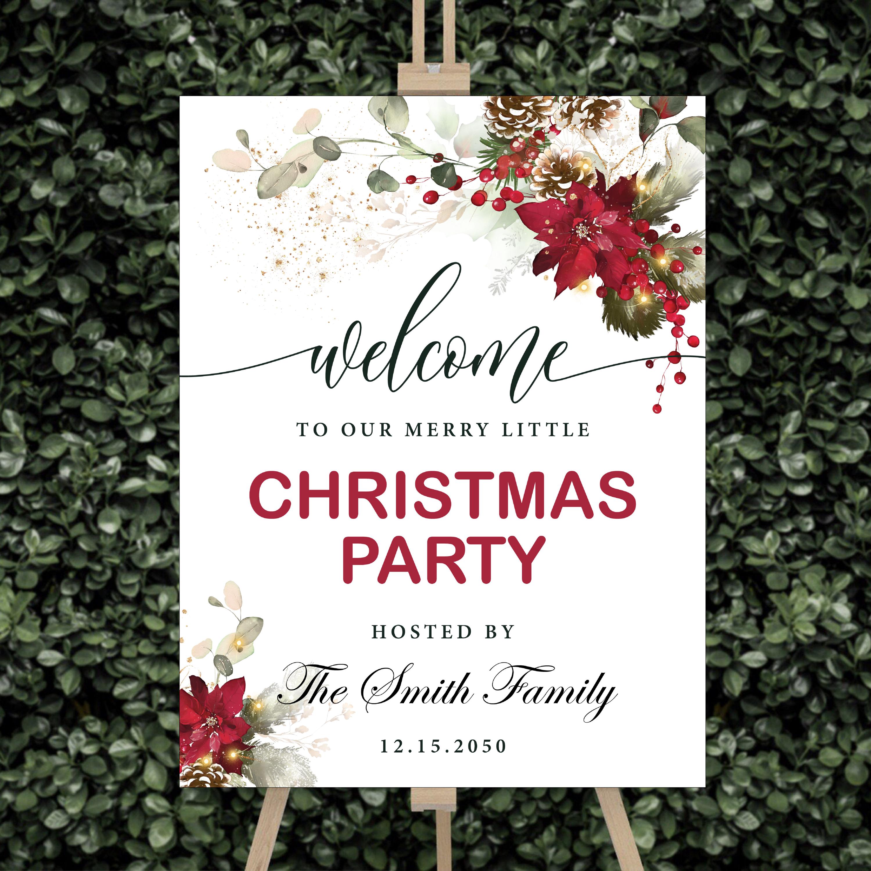 Red Floral Christmas Party Welcome Sign - Add a touch of festive elegance to your holiday celebration with this beautiful Christmas Party Welcome Sign. Designed with lush red poinsettias, berries, pinecones, and soft golden accents, this sign creates a warm and joyful first impression for your guests. Fully customizable with your event details, it is available as both a printed sign or a digital file, making it the perfect addition to any Christmas party or winter gathering.