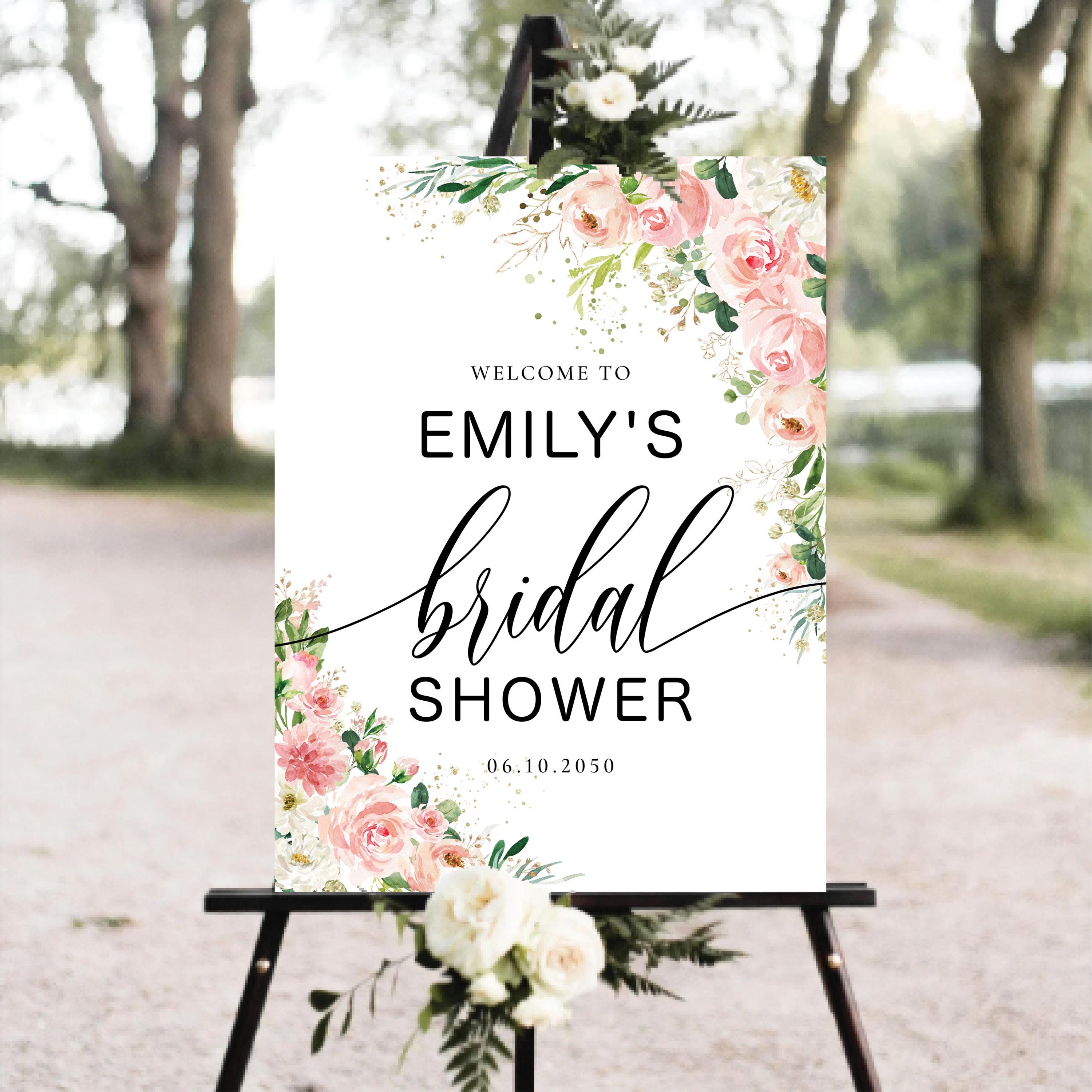 Blush Pink Floral Bridal Shower Welcome Sign – a charming welcome sign featuring soft blush florals paired with delicate green leaves and elegant typography, perfect for adding a romantic and natural touch to your bridal shower celebration.