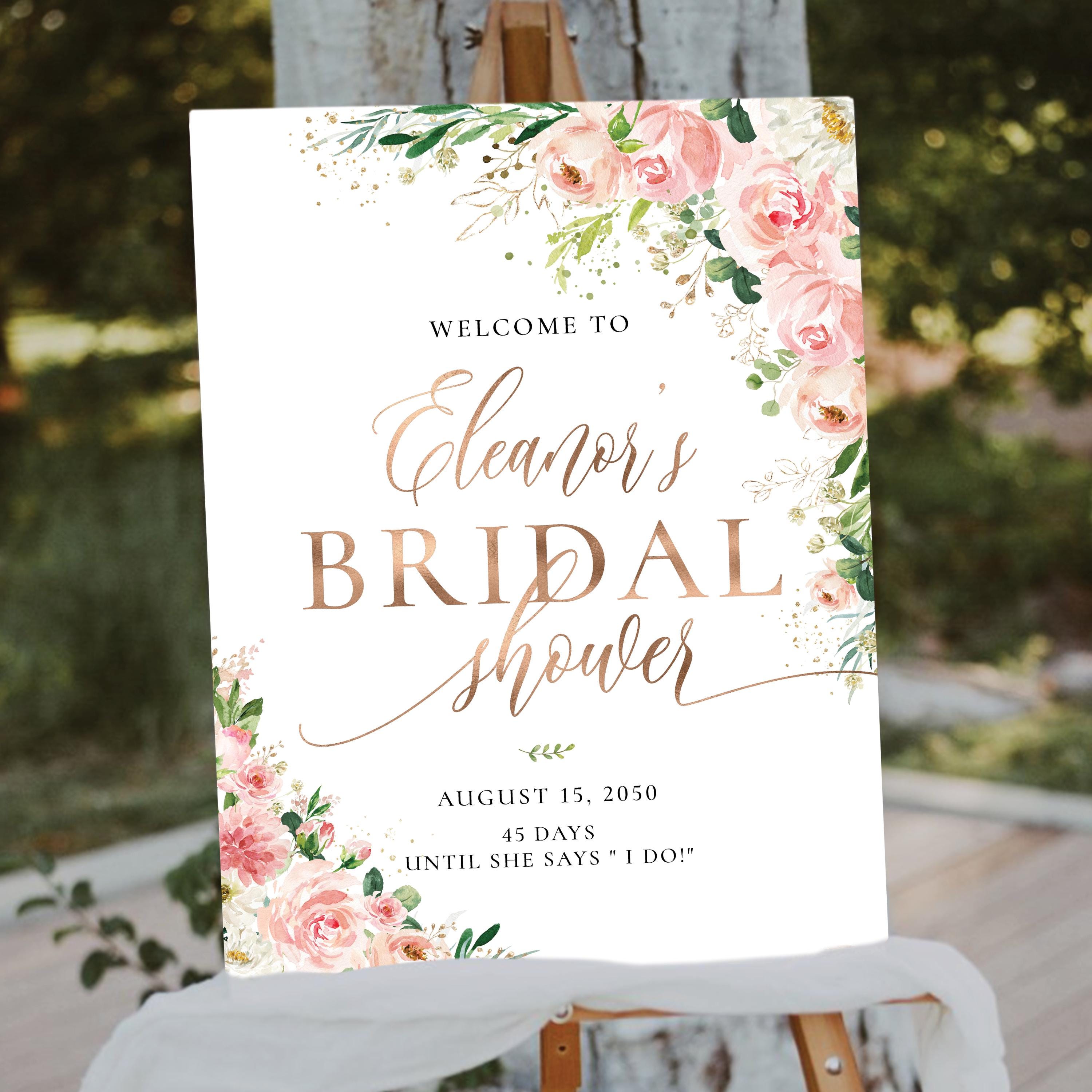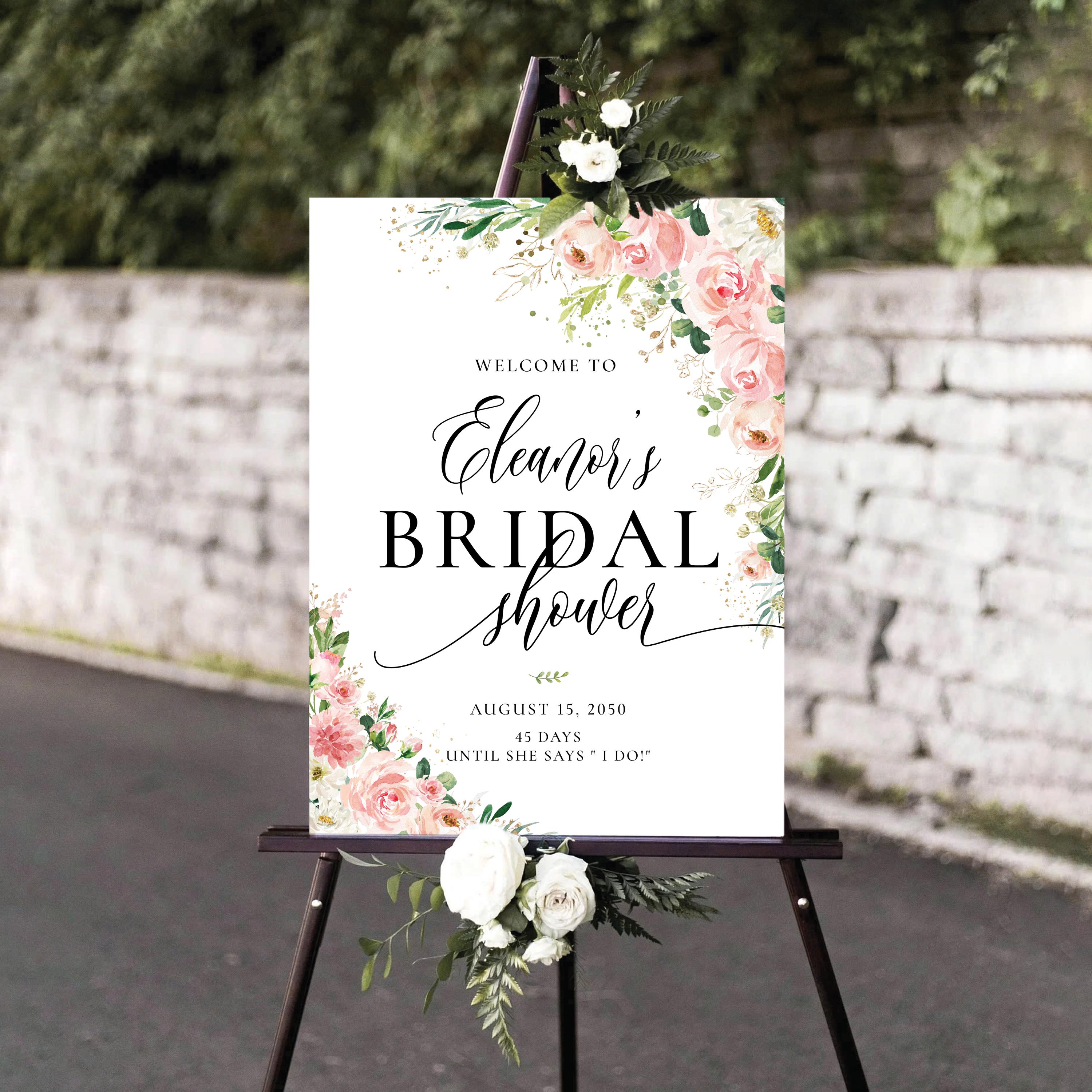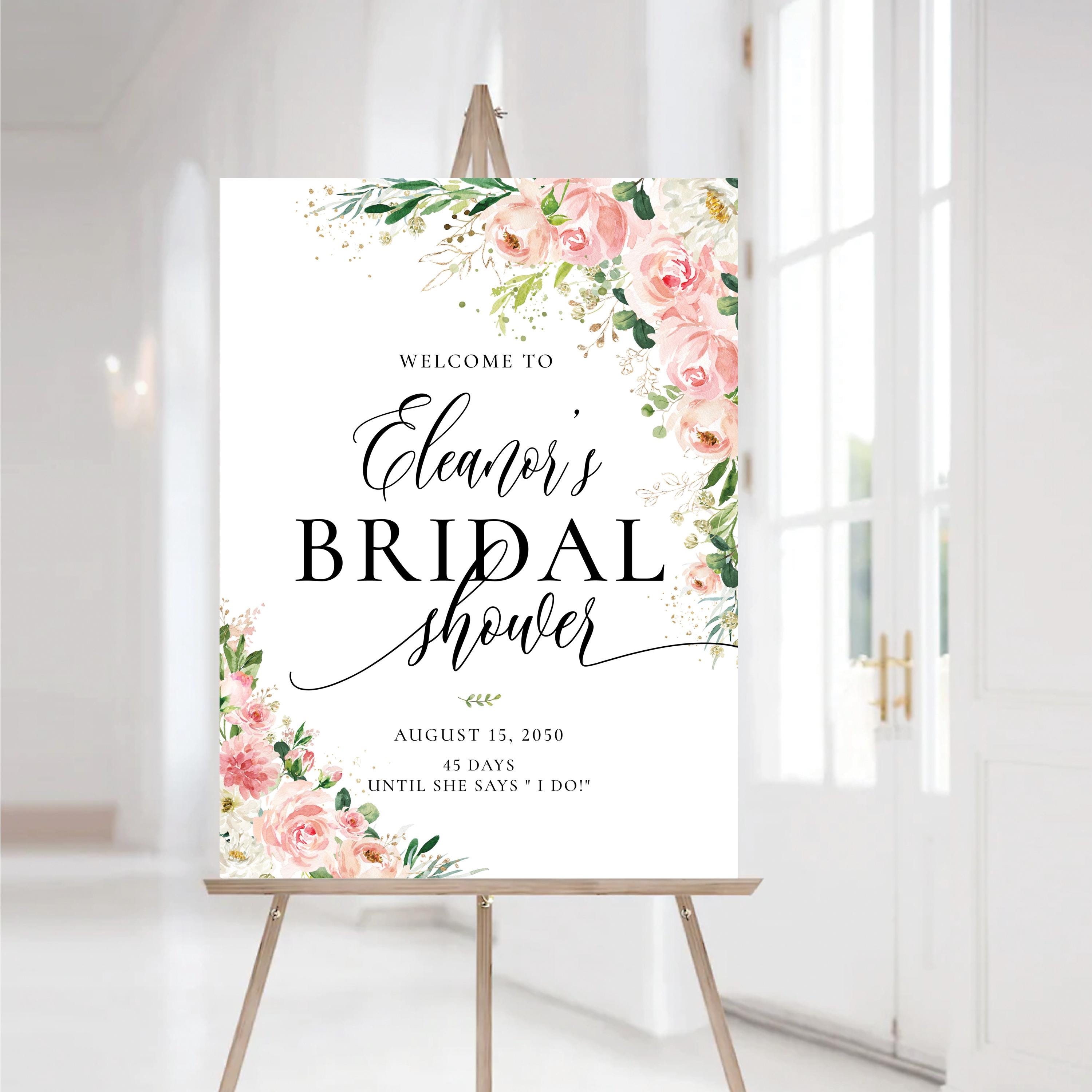 Blush Pink Floral Bridal Shower Welcome Sign – a charming welcome sign featuring soft blush florals paired with delicate green leaves and elegant typography, perfect for adding a romantic and natural touch to your bridal shower celebration.
