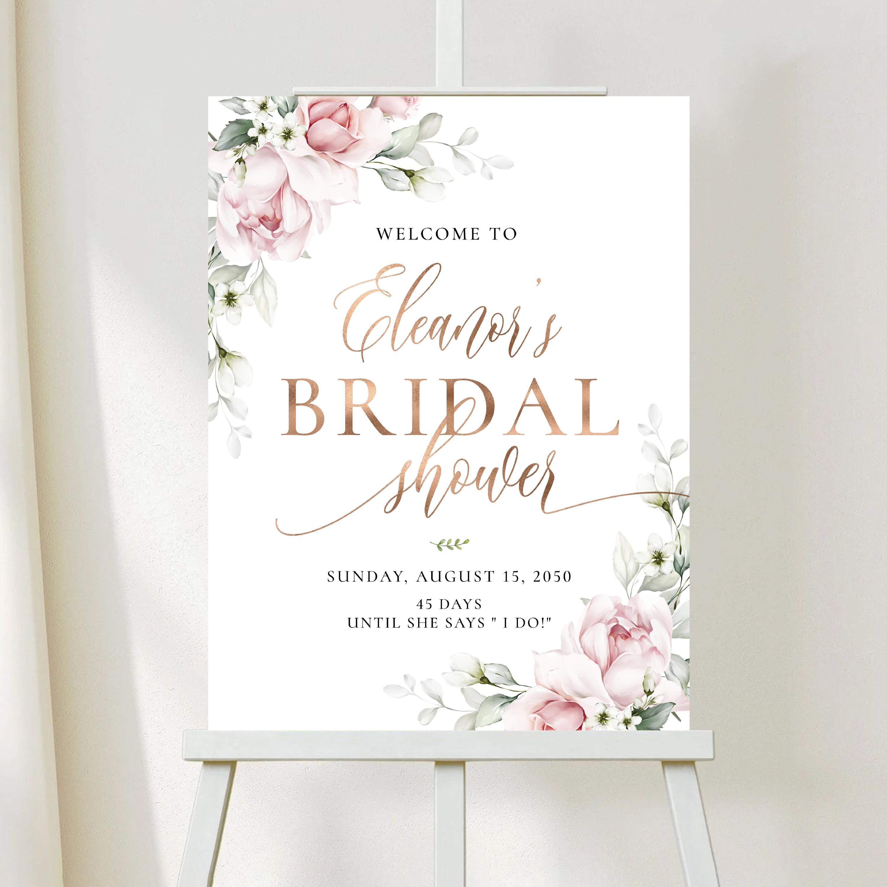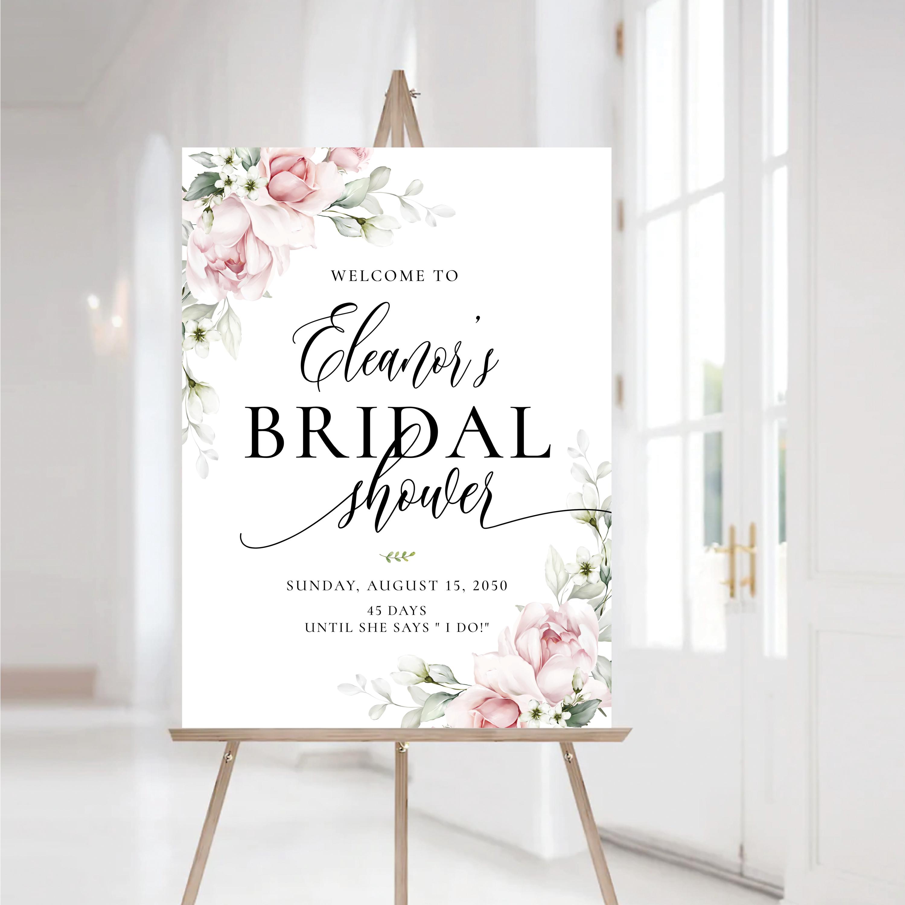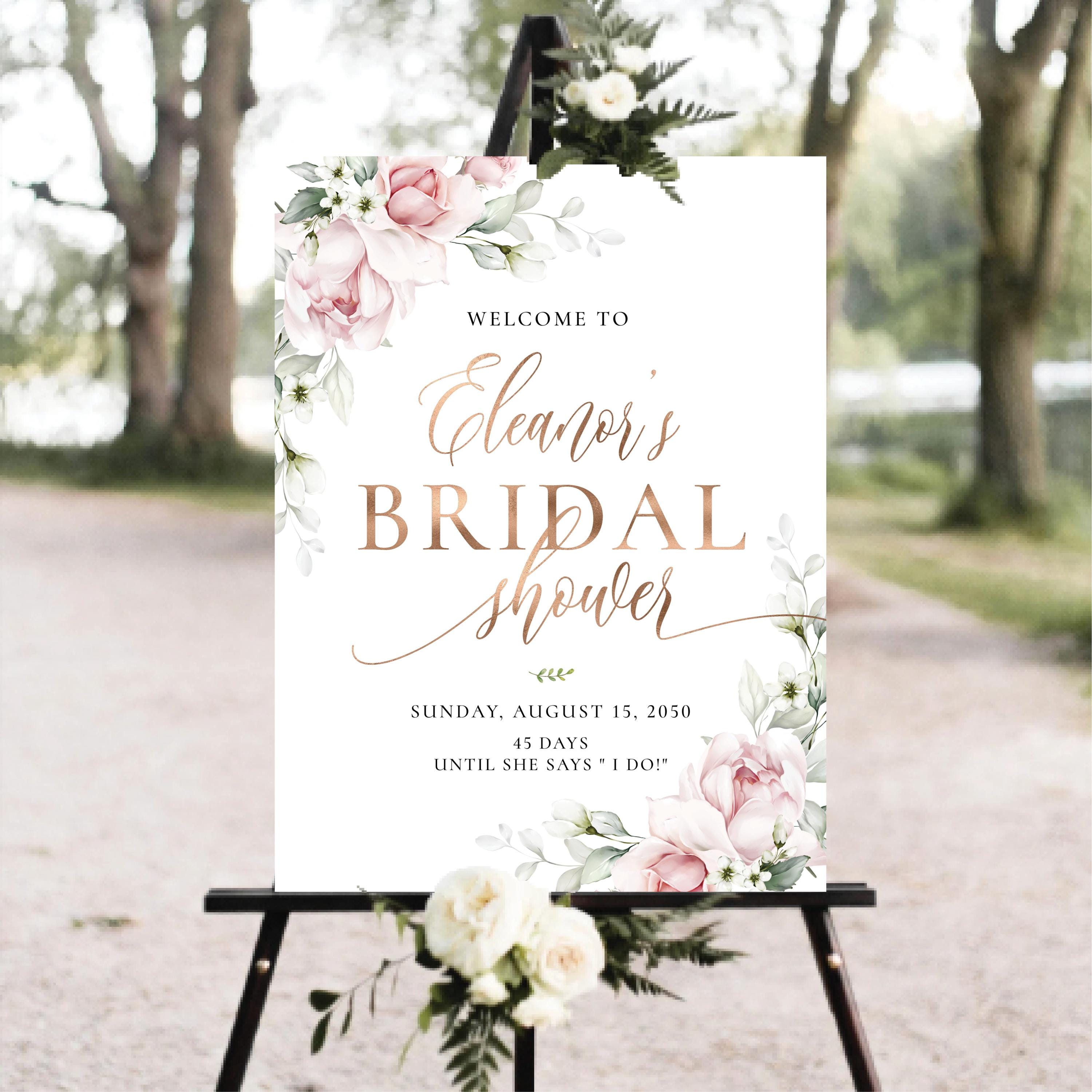 This bridal shower welcome sign features a soft blush pink palette paired with elegant sage green accents, creating a feminine and refined look. The handwritten-style fonts add a touch of modern elegance. All party details can be fully personalized to fit your event. This is a perfect digital file to print and display at your special Bridal Shower celebration.