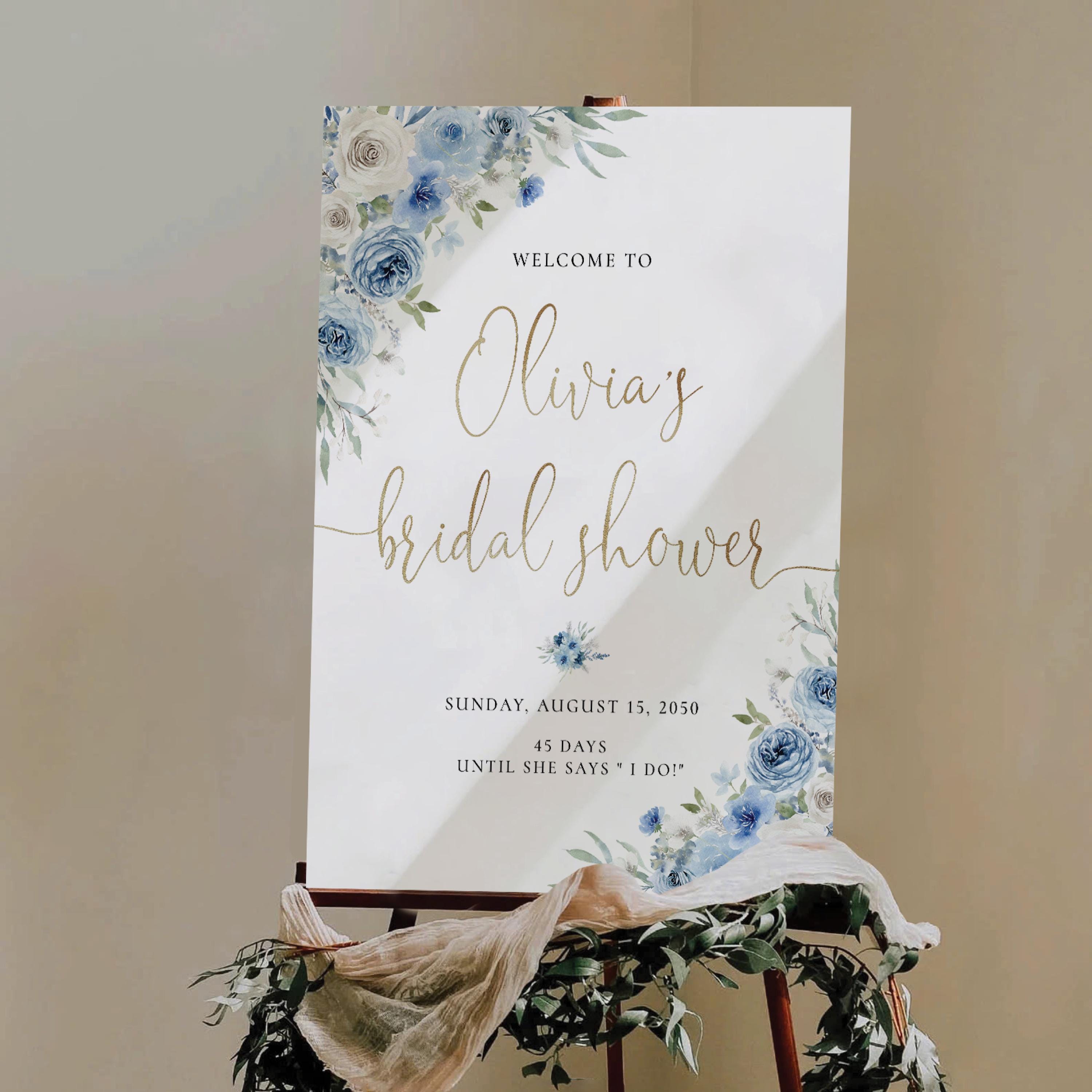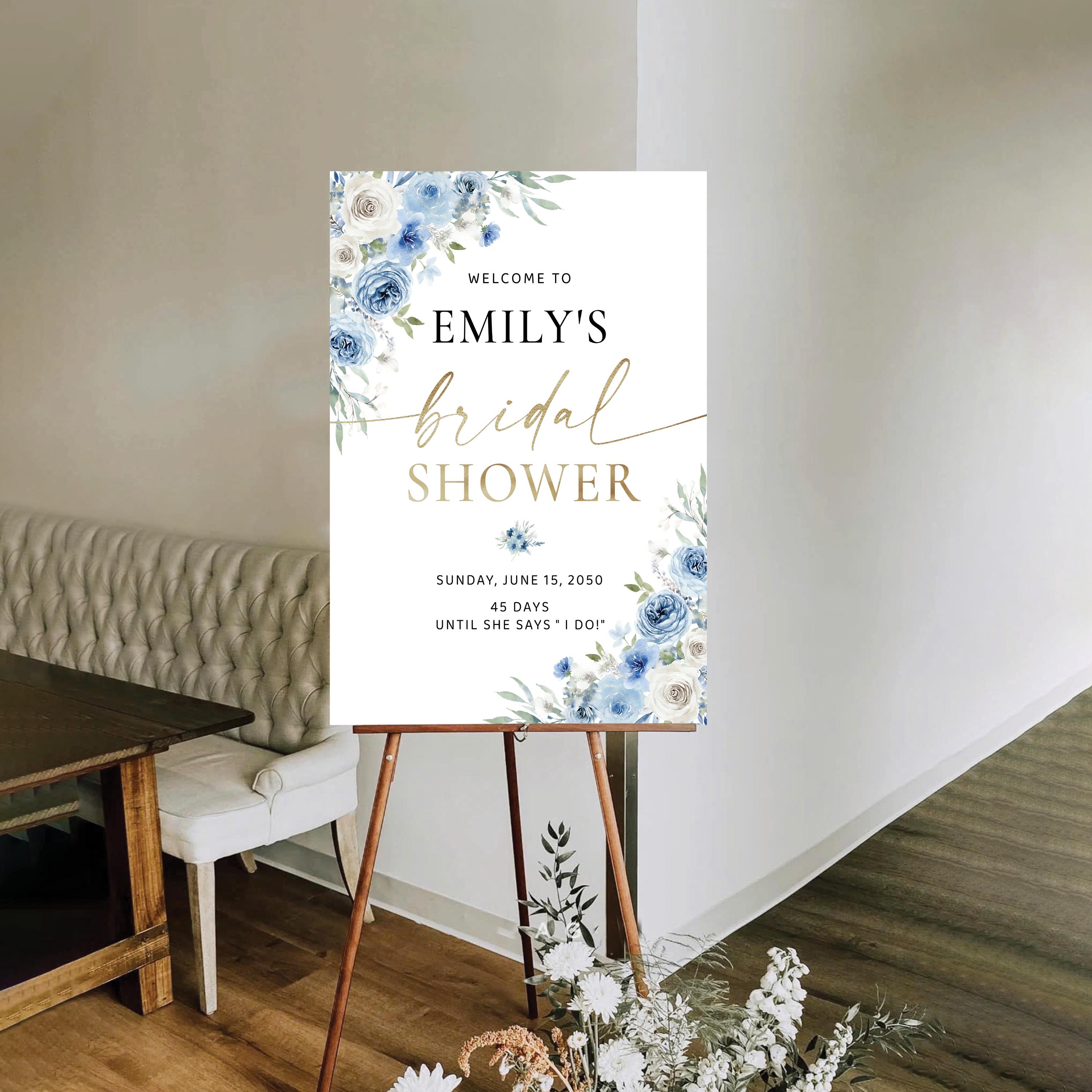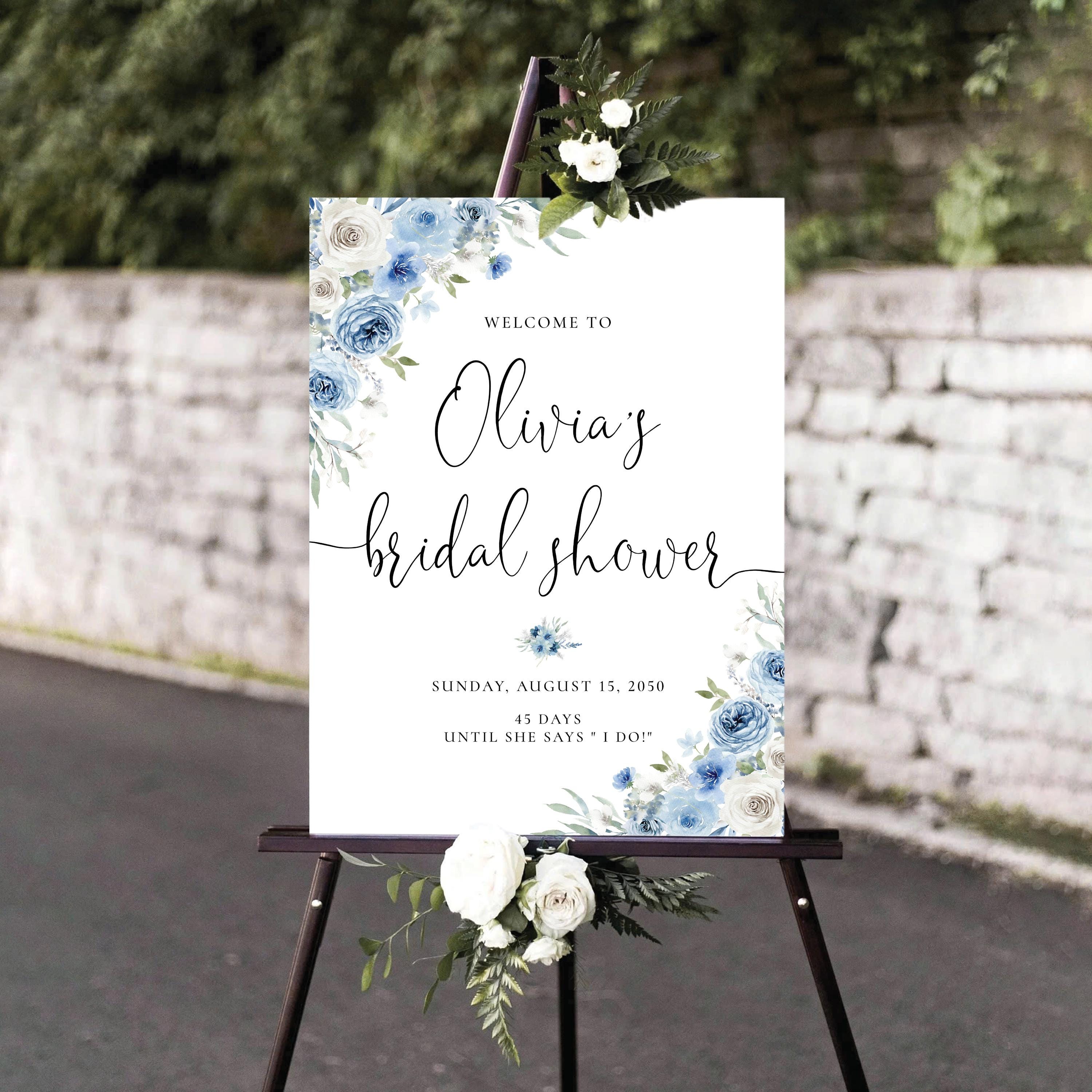Welcome your guests with this romantic bridal shower sign, featuring a delicate mix of dusty blue and ivory florals. Personalized with your event details and designed with an elegant script font, it's the perfect finishing touch for a soft and sophisticated celebration.