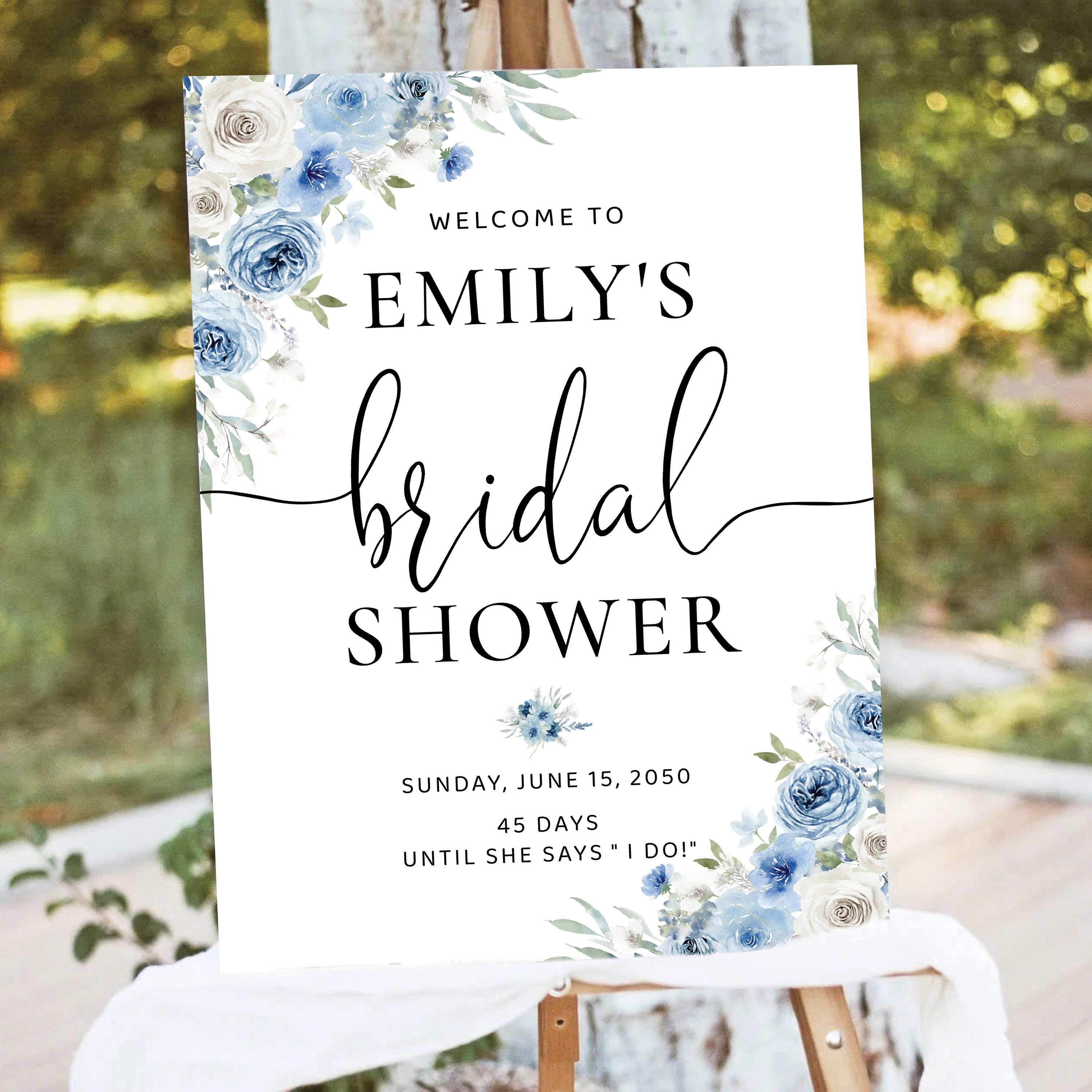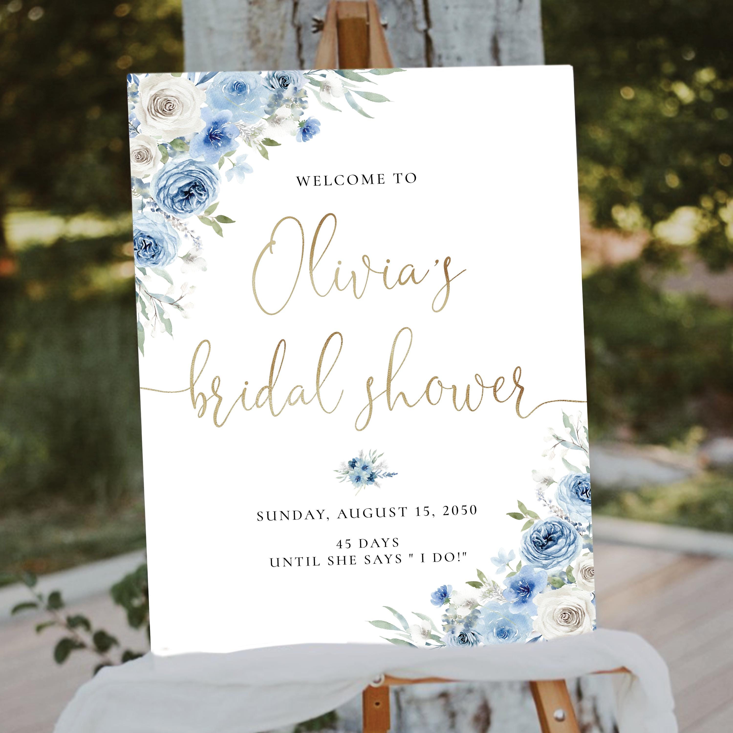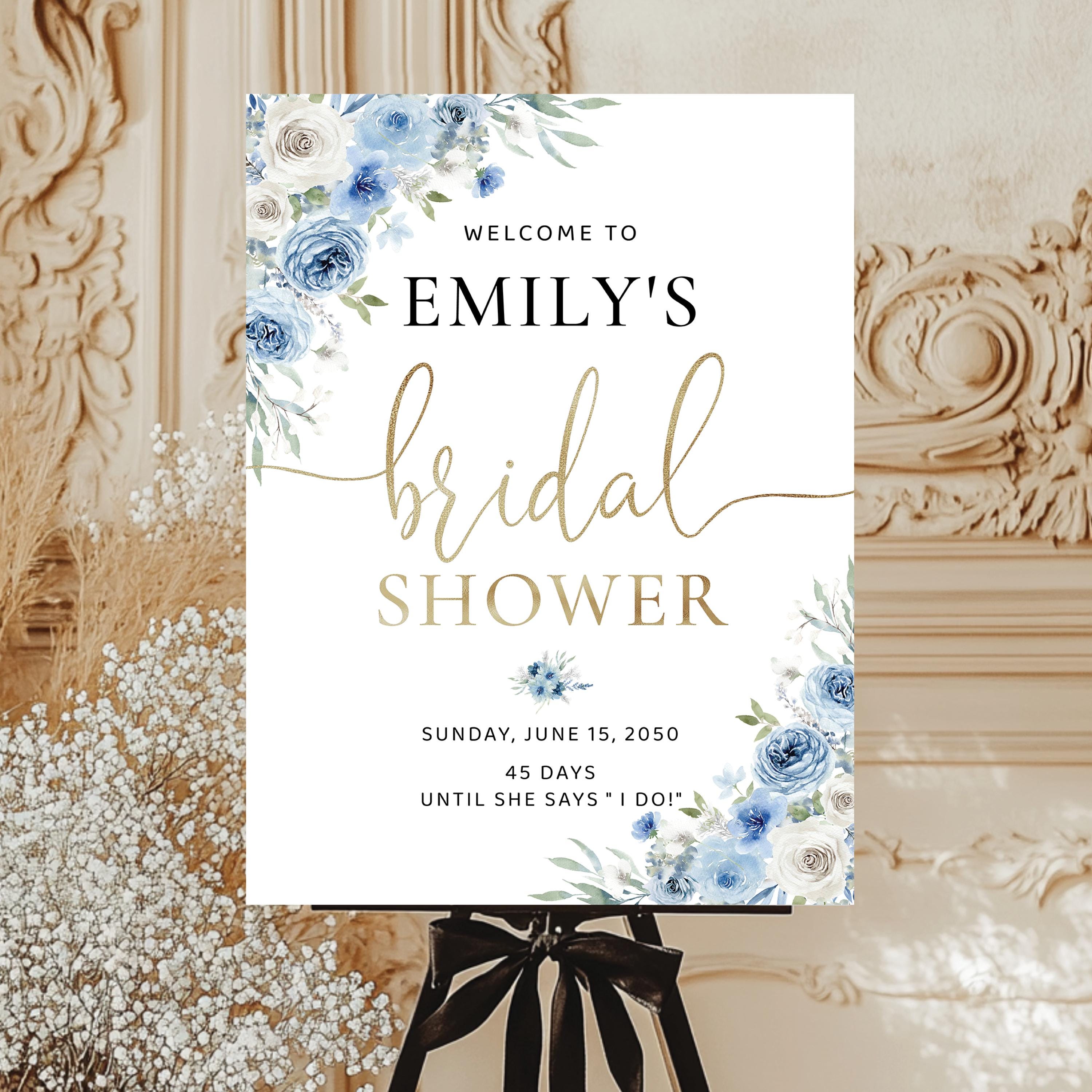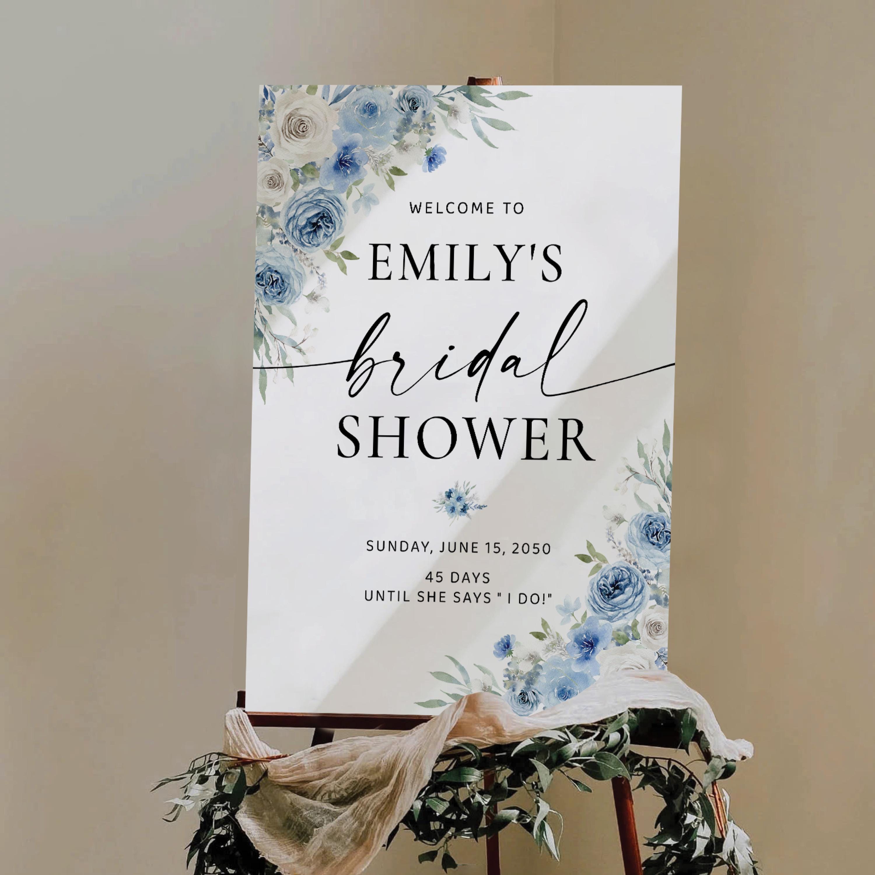 Welcome your guests with this romantic bridal shower sign, featuring a delicate mix of dusty blue and ivory florals. Personalized with your event details and designed with an elegant script font, it's the perfect finishing touch for a soft and sophisticated celebration.