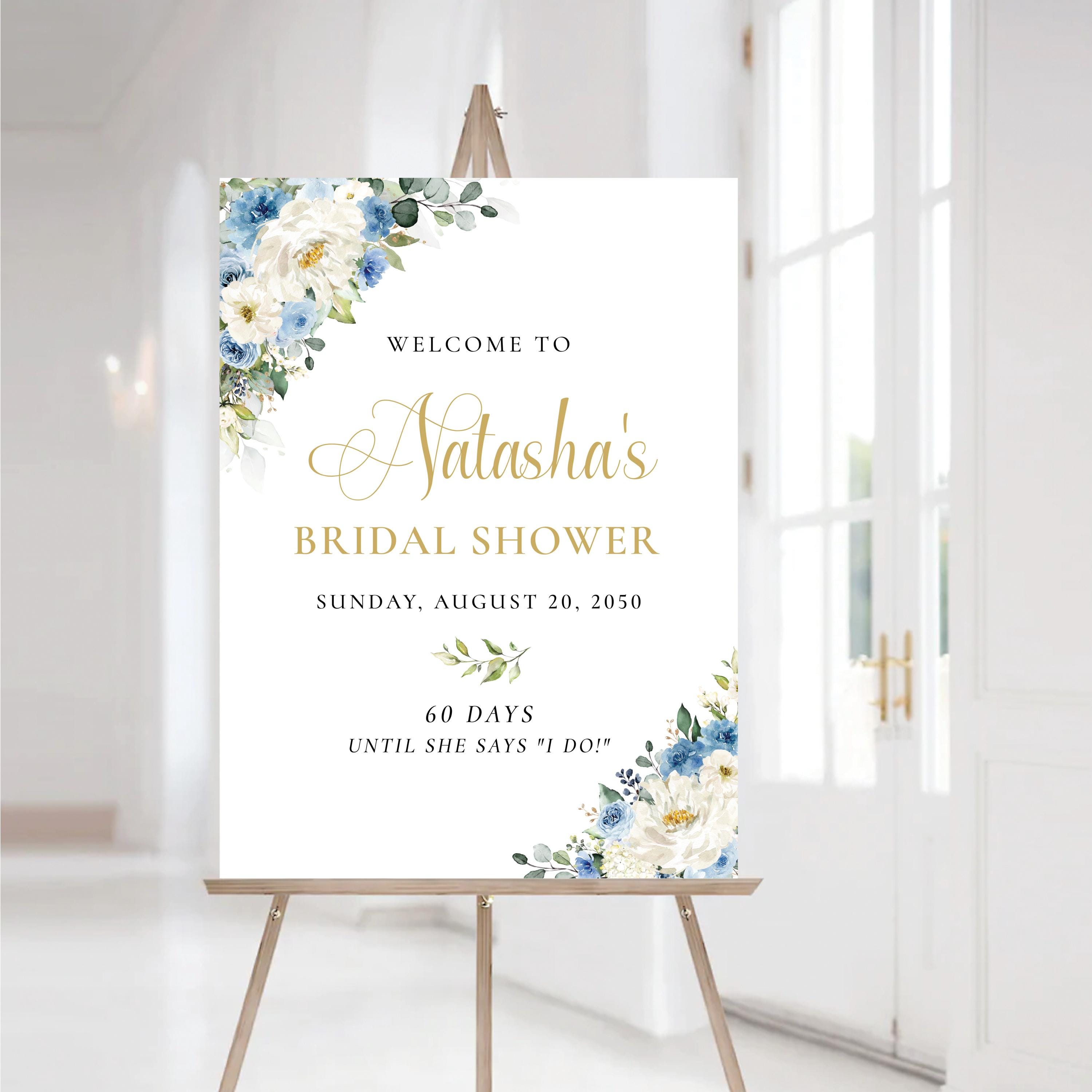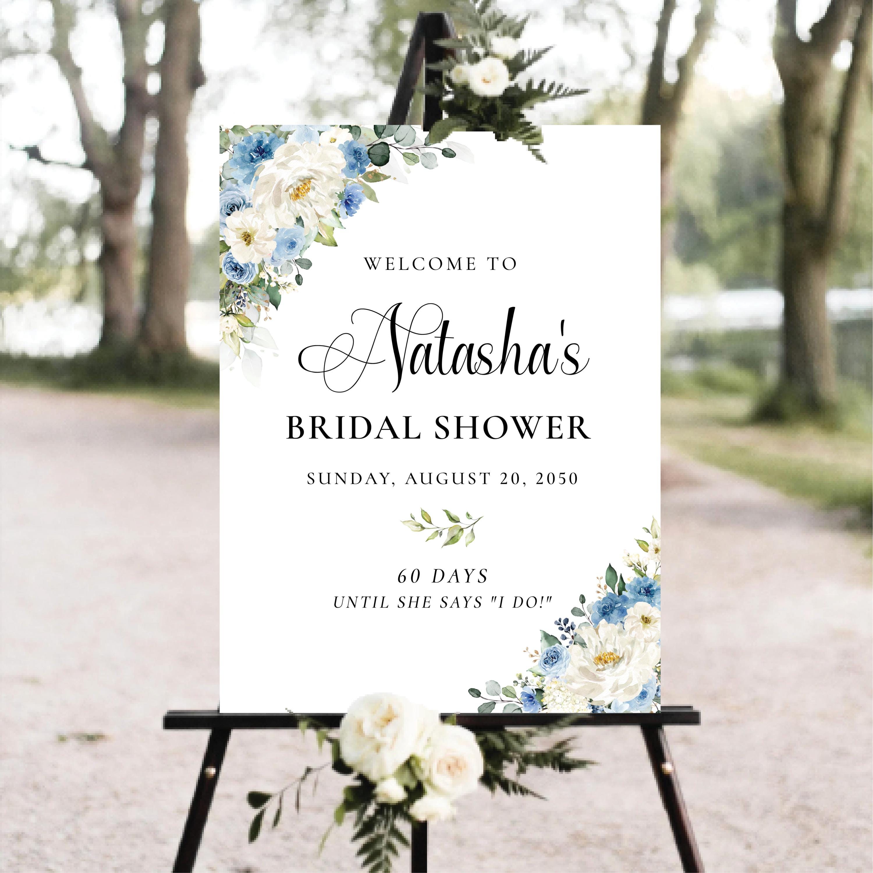 Welcome your guests with this romantic bridal shower sign, featuring a delicate mix of dusty blue and white florals. Personalized with your event details and designed with an elegant script font, it's the perfect finishing touch for a soft and sophisticated celebration.