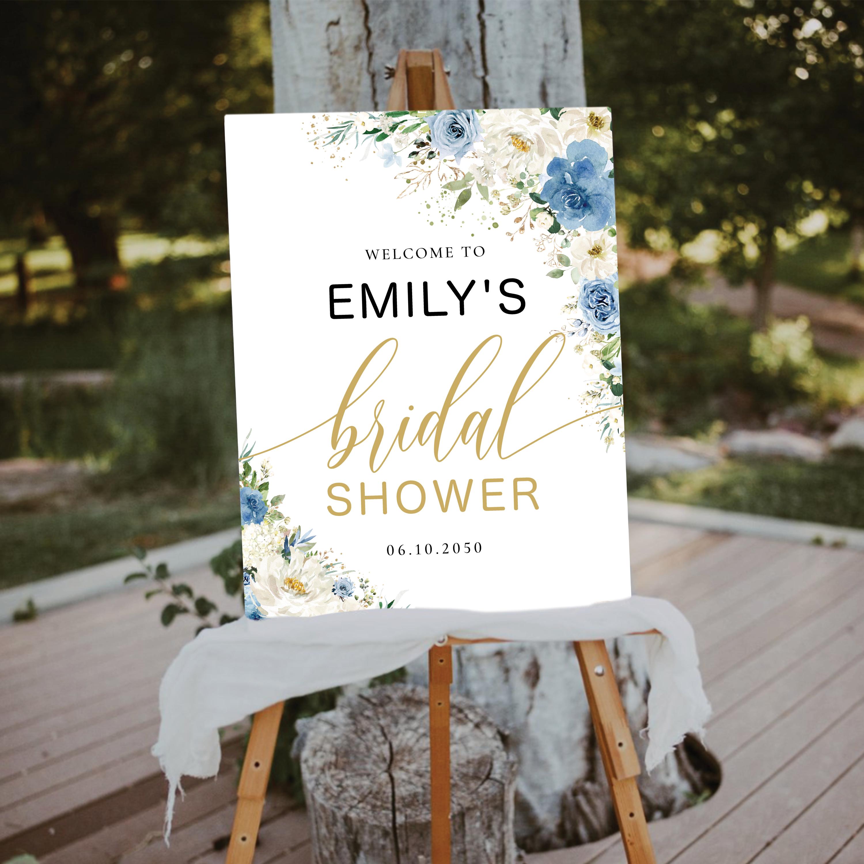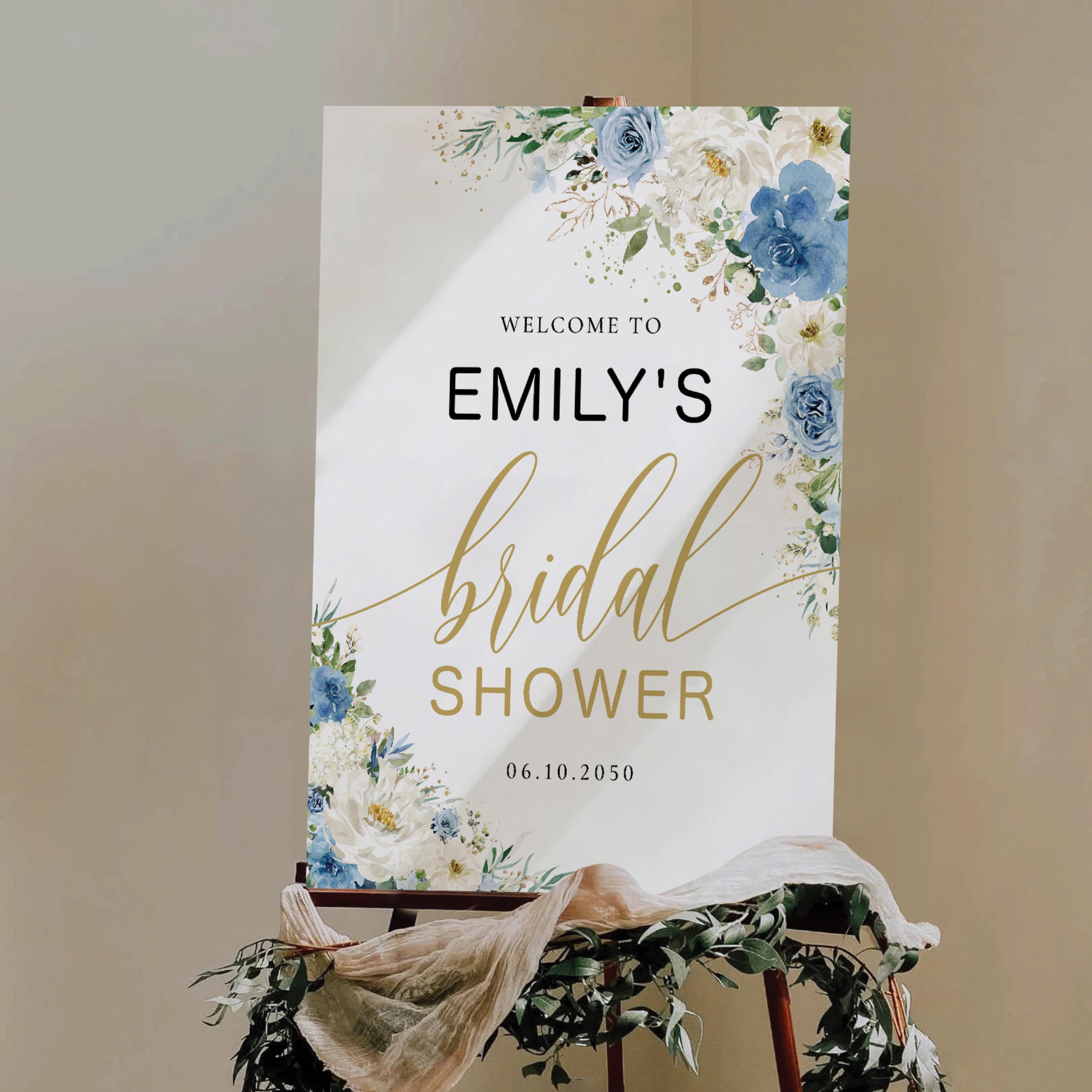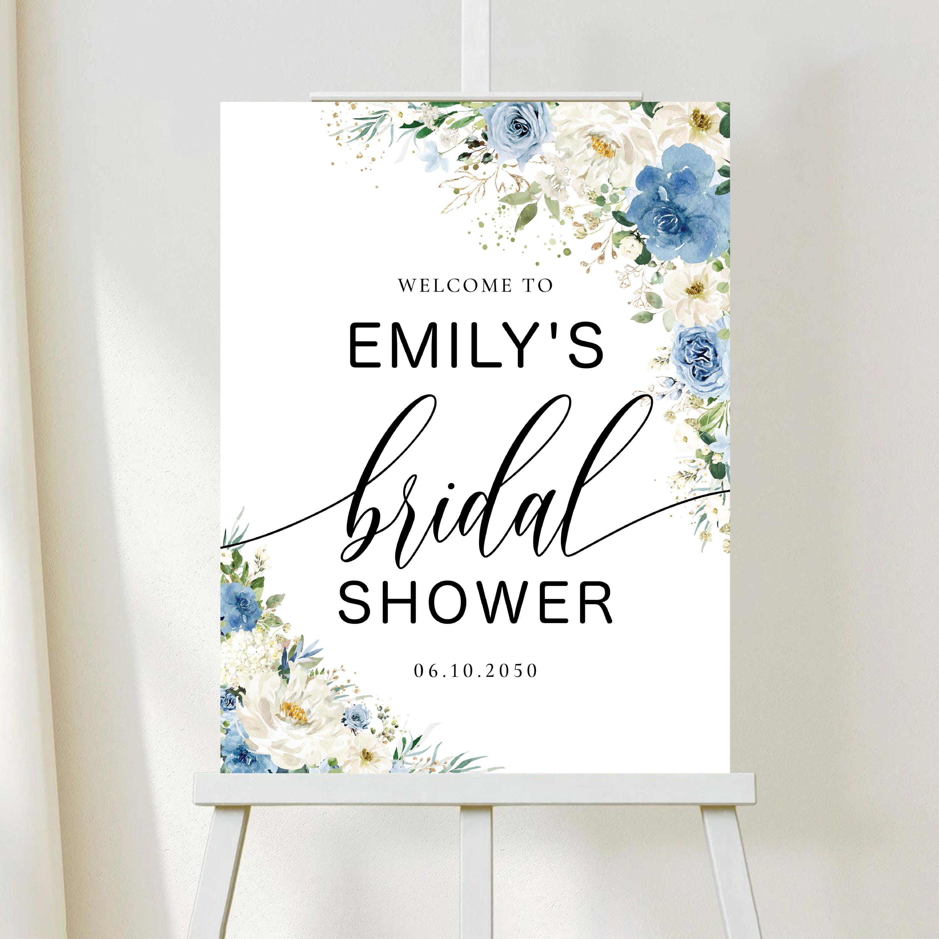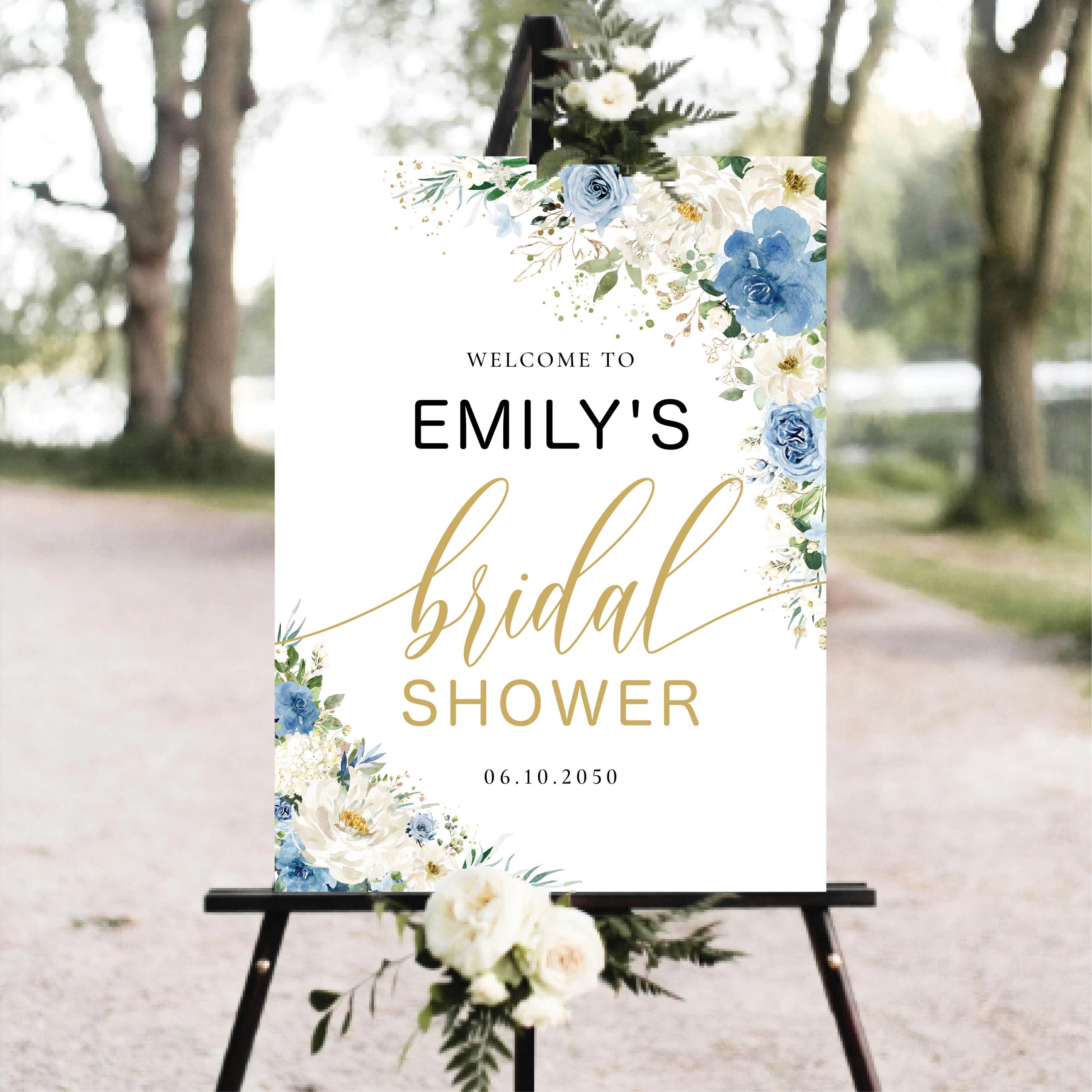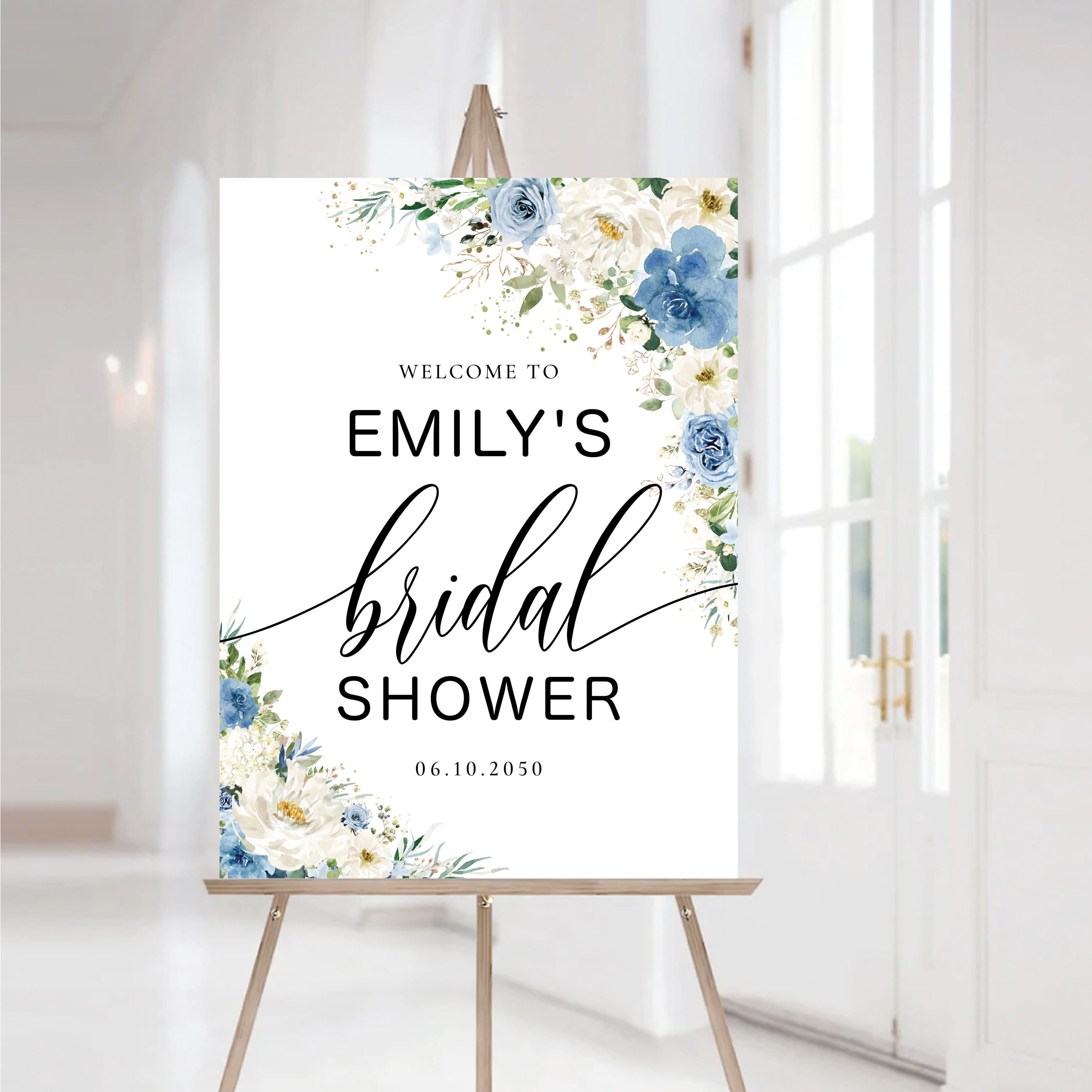 Welcome your guests with this romantic bridal shower sign, featuring a delicate mix of dusty blue and white florals. Personalized with your event details and designed with an elegant script font, it's the perfect finishing touch for a soft and sophisticated celebration.