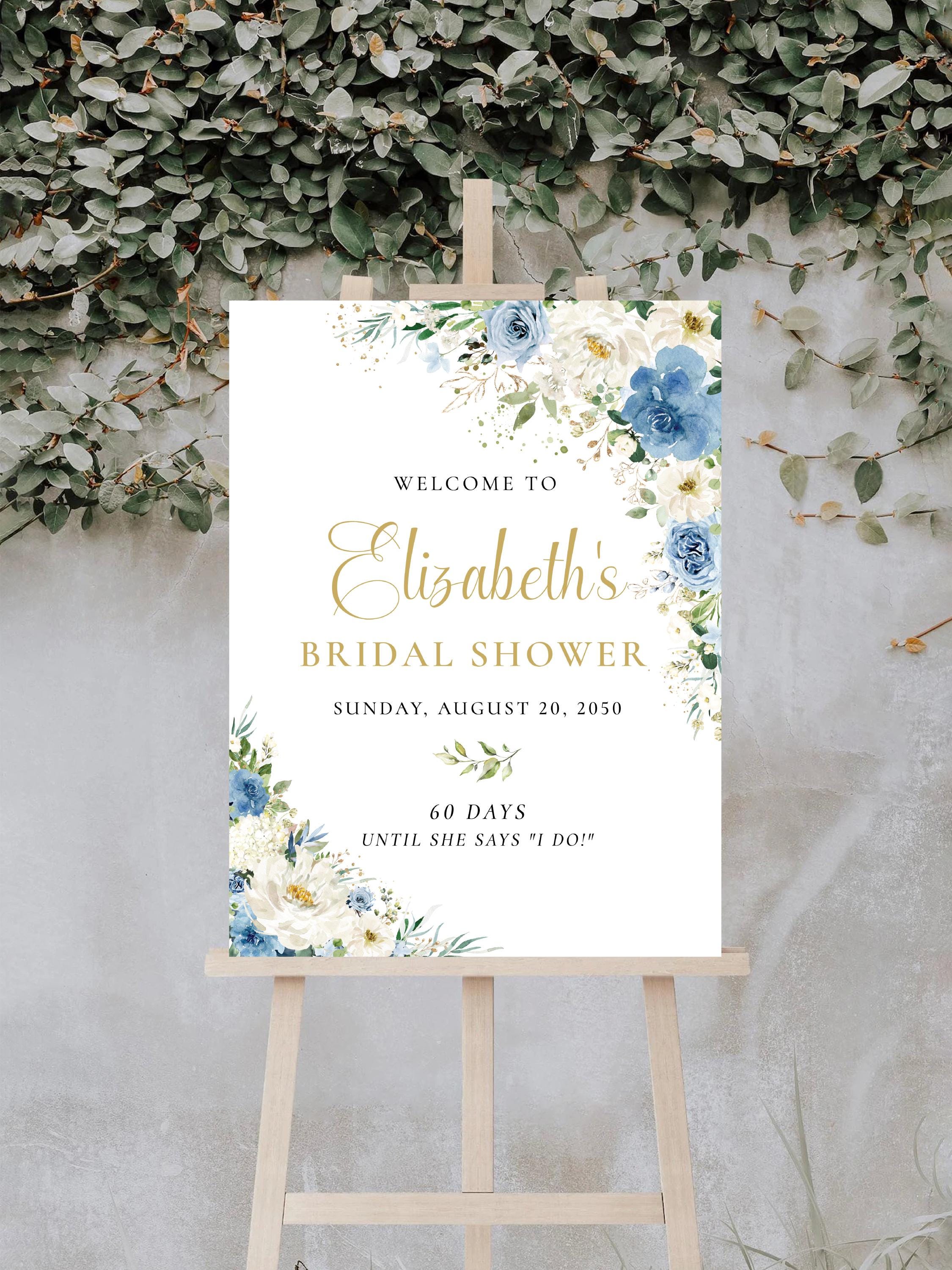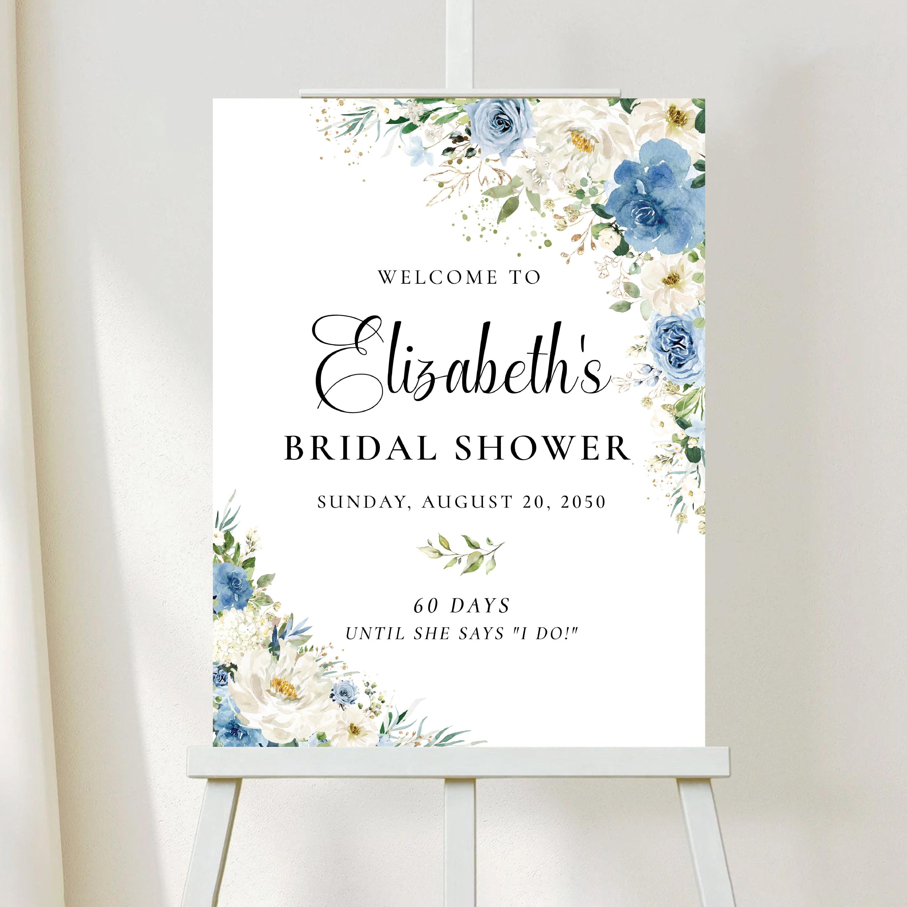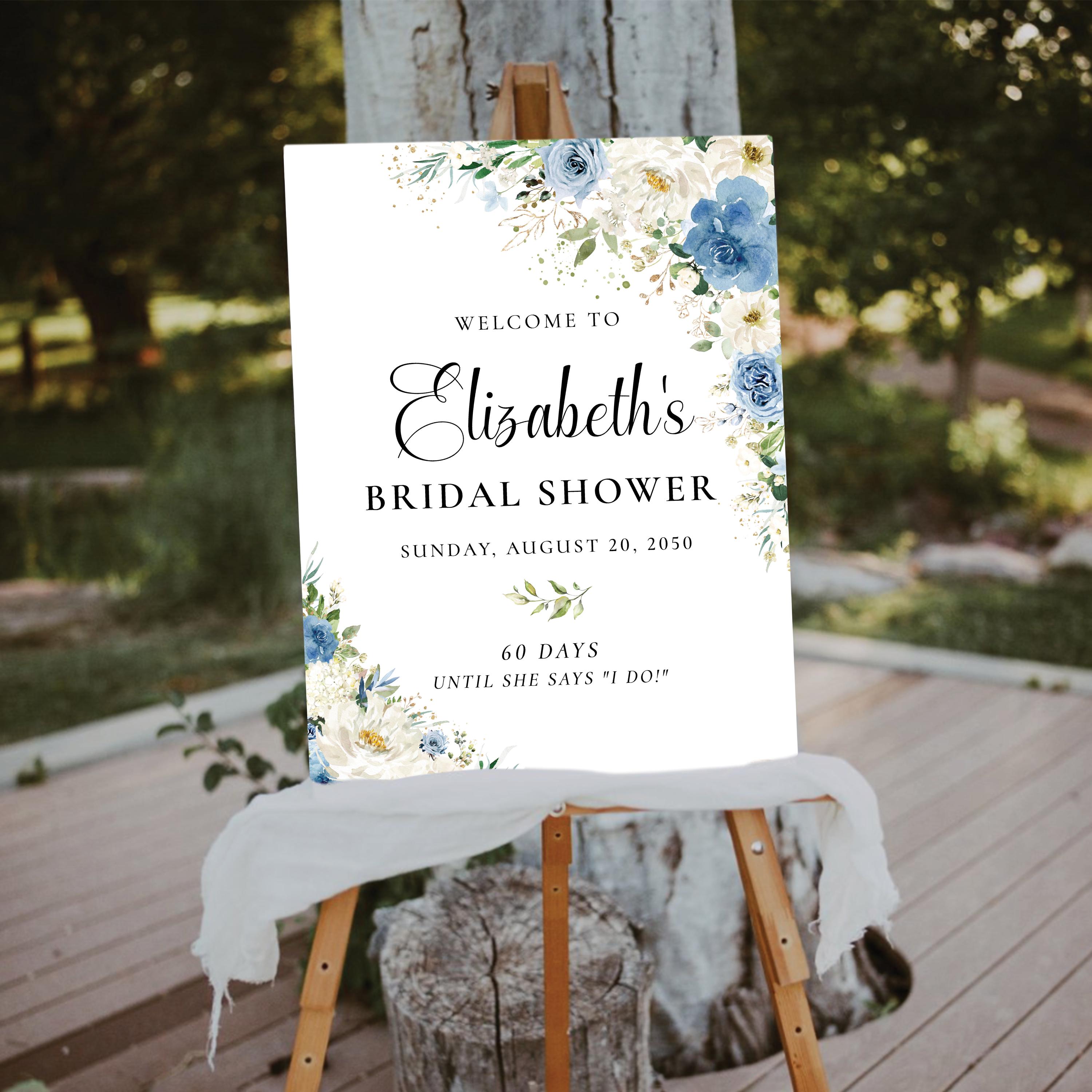 Welcome your guests with this romantic bridal shower sign, featuring a delicate mix of dusty blue and white florals. Personalized with your event details and designed with an elegant script font, it's the perfect finishing touch for a soft and sophisticated celebration.