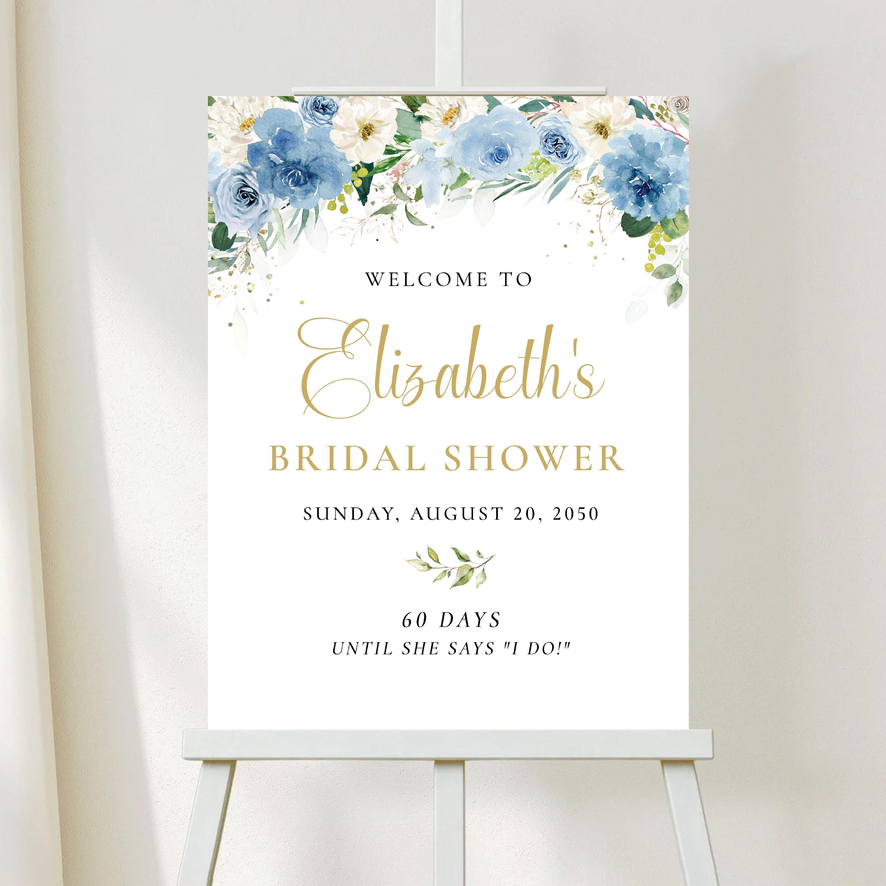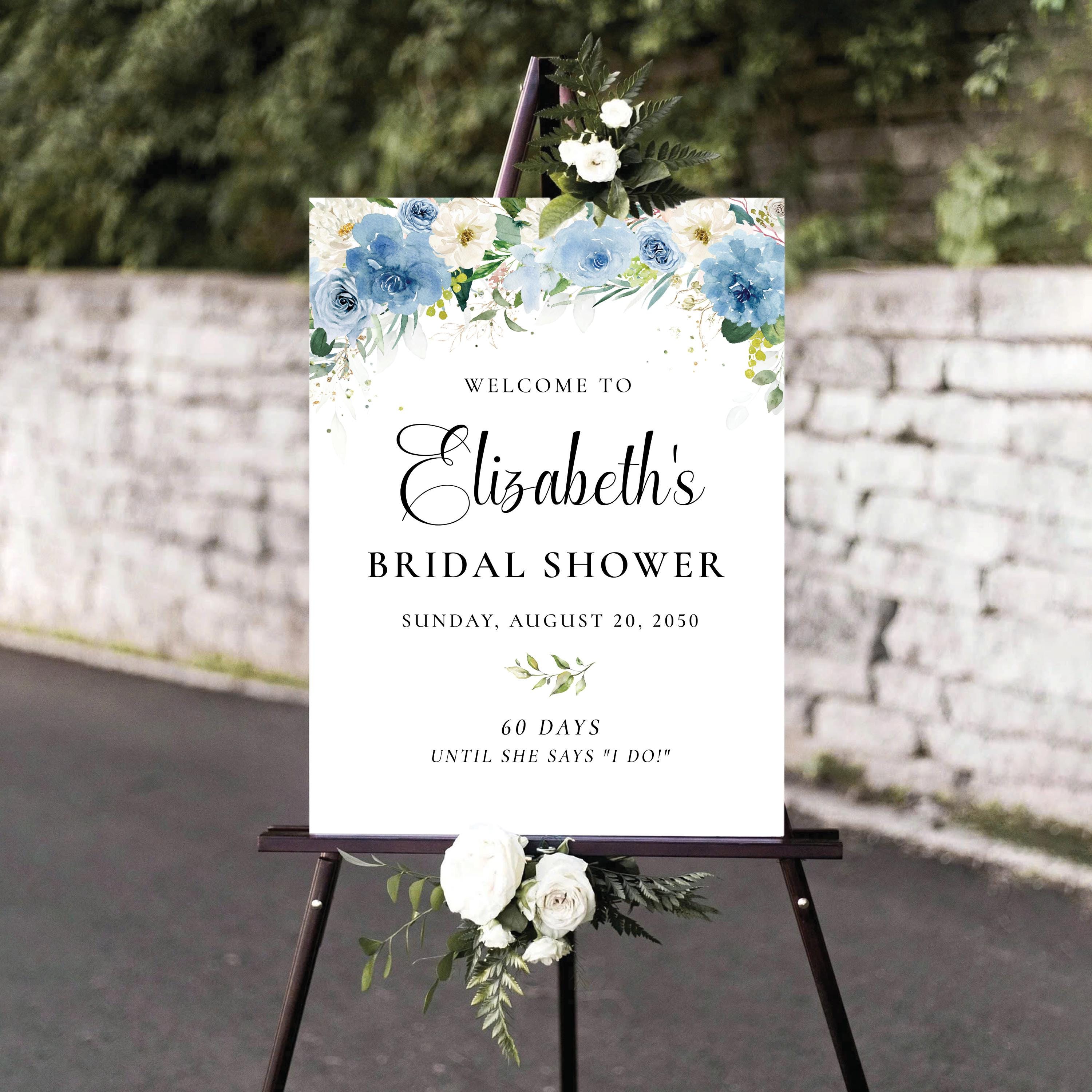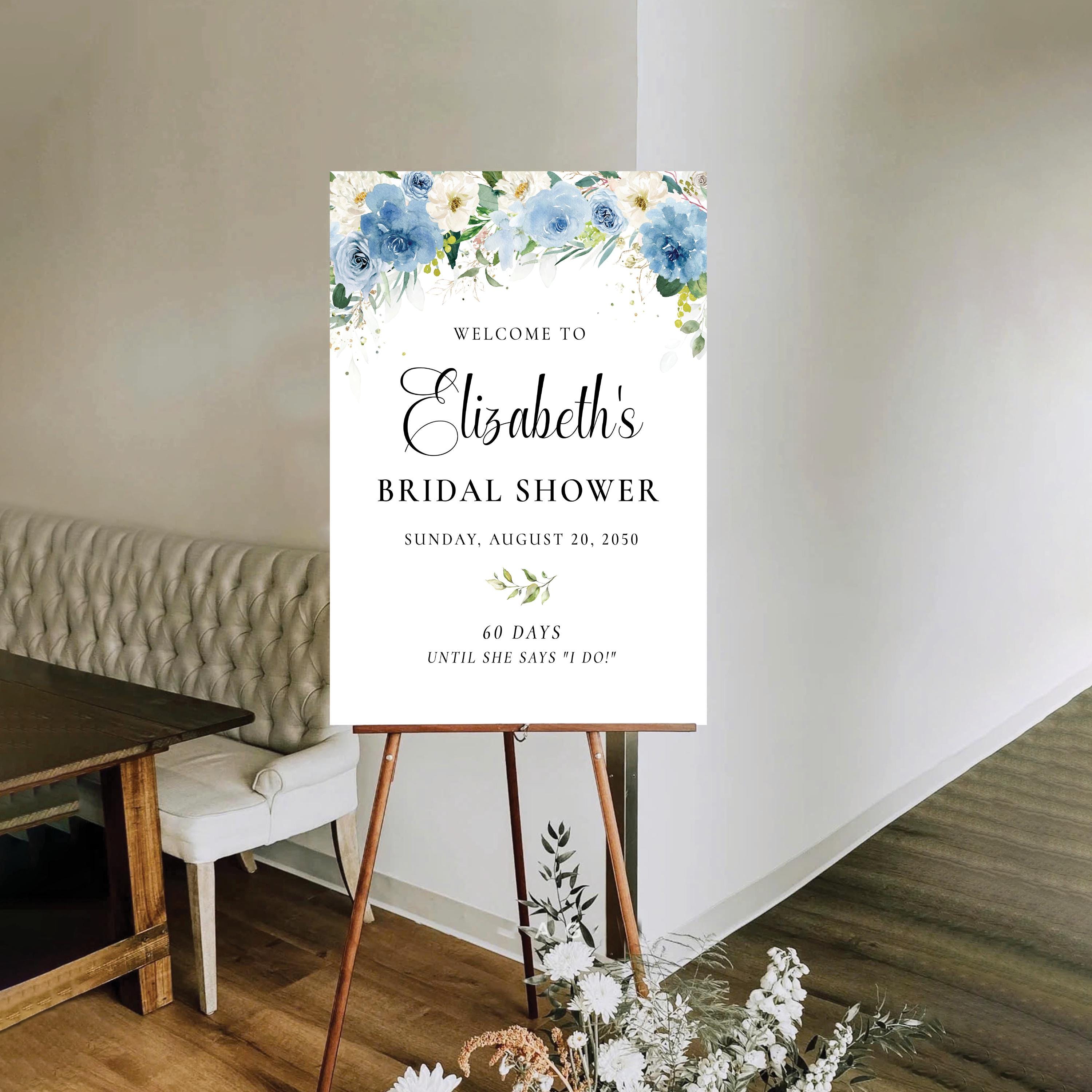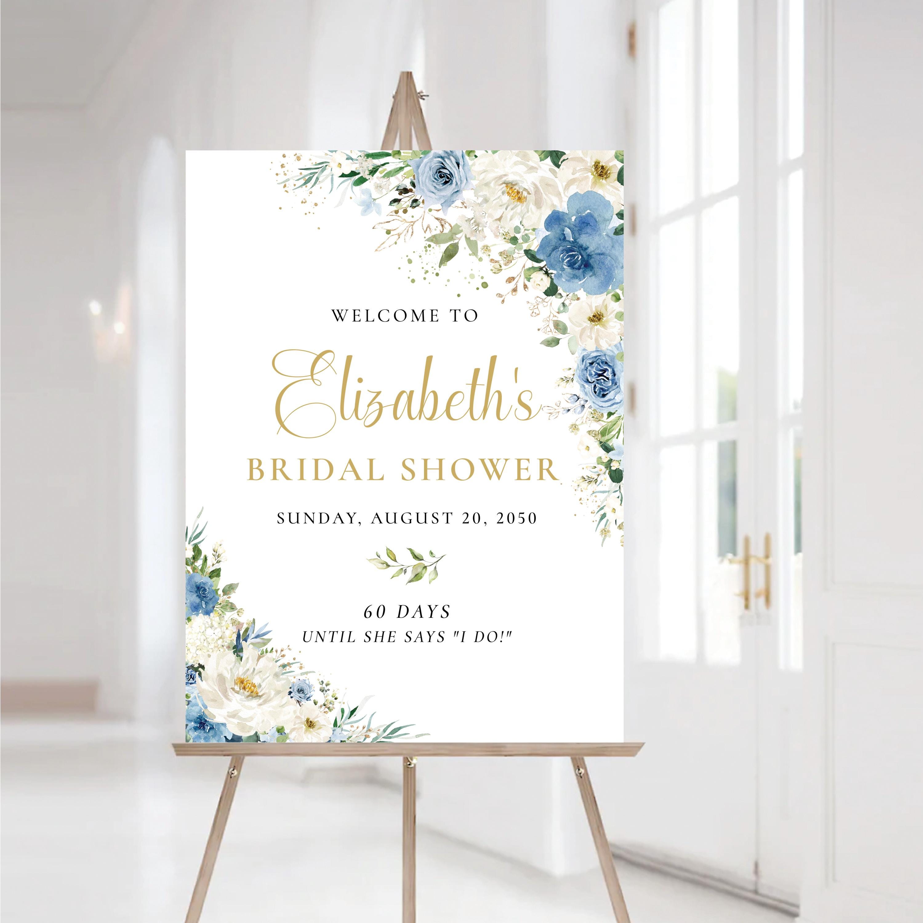Welcome your guests with this romantic bridal shower sign, featuring a delicate mix of dusty blue and white florals. Personalized with your event details and designed with an elegant script font, it's the perfect finishing touch for a soft and sophisticated celebration.
