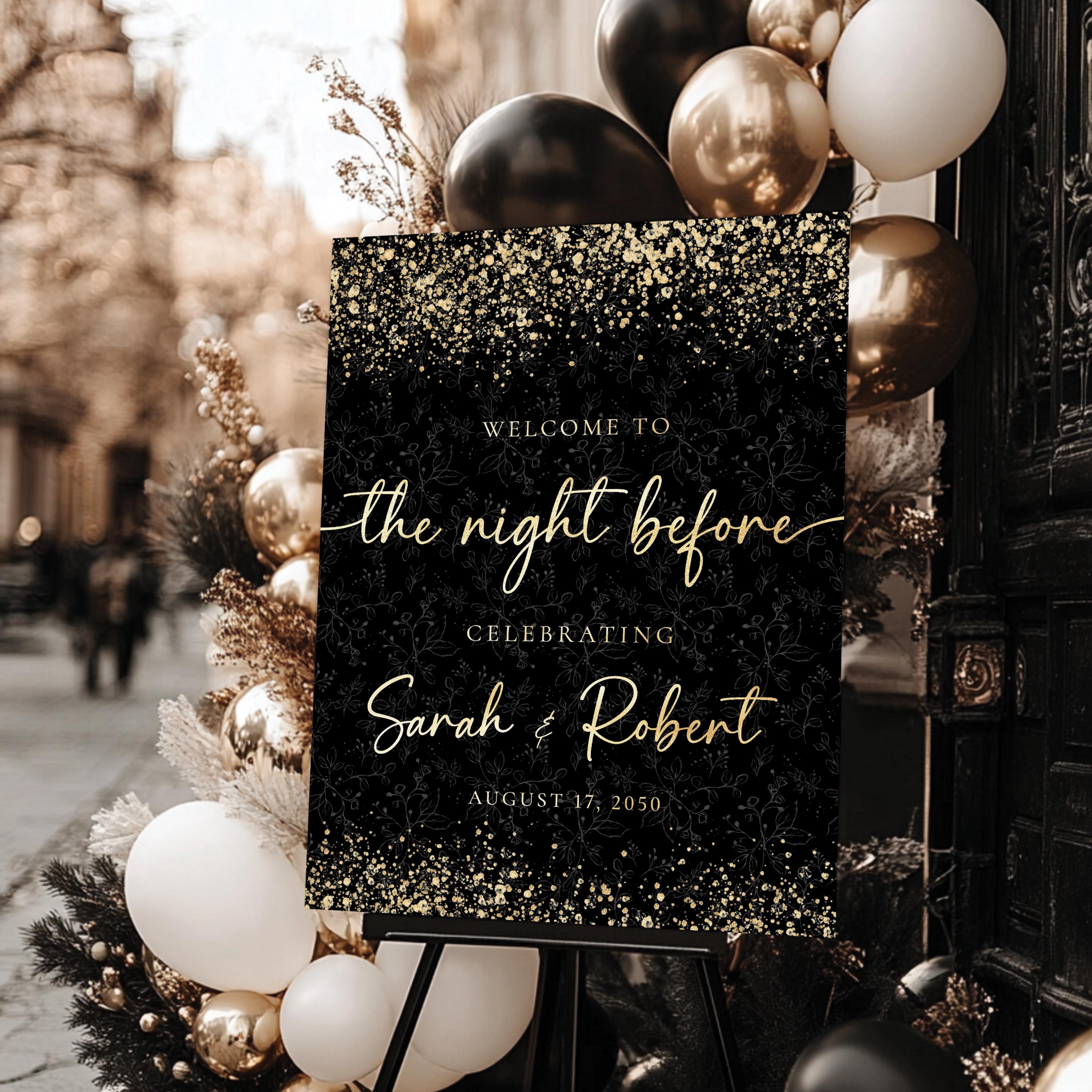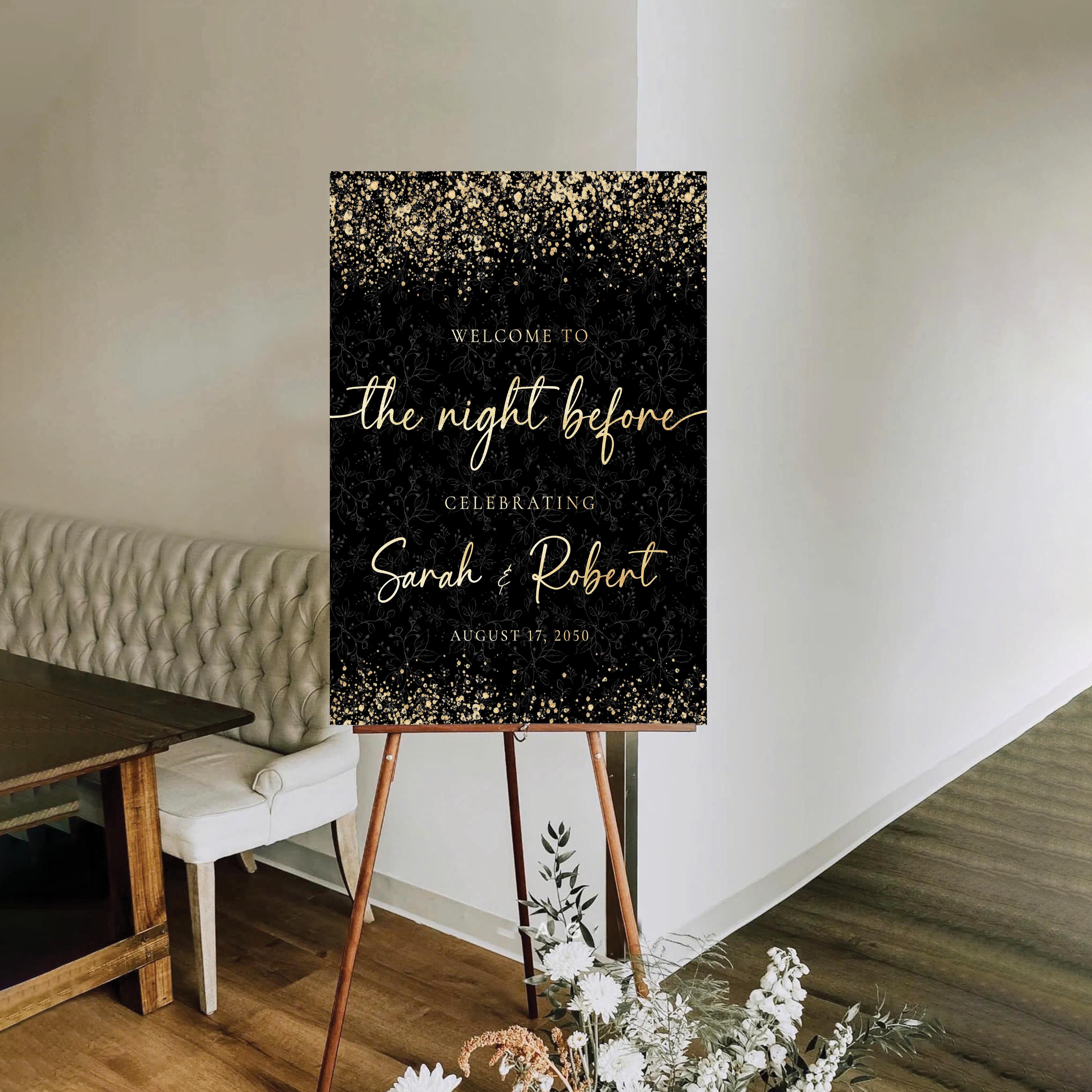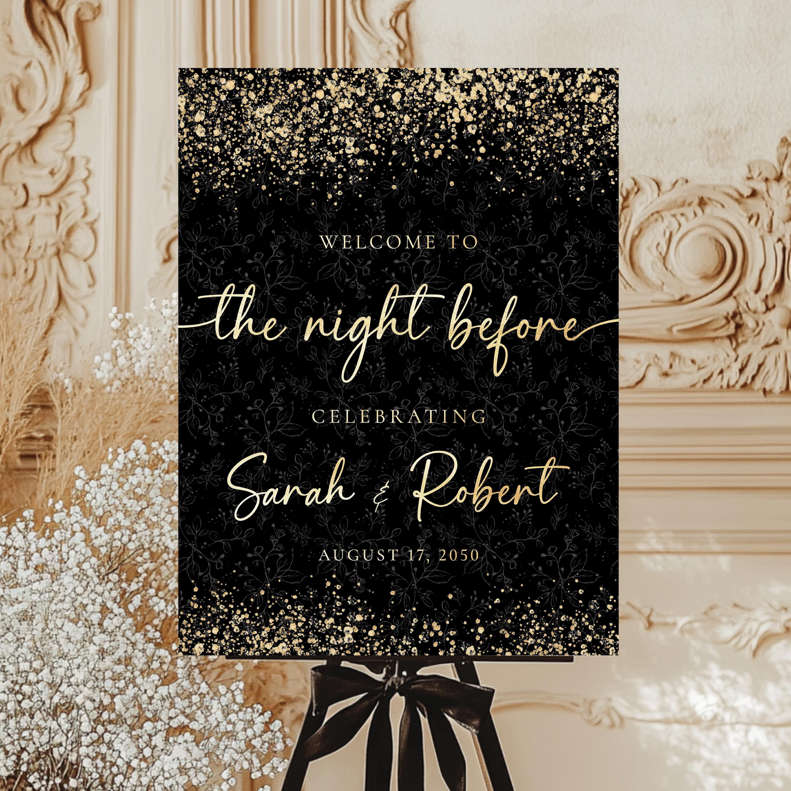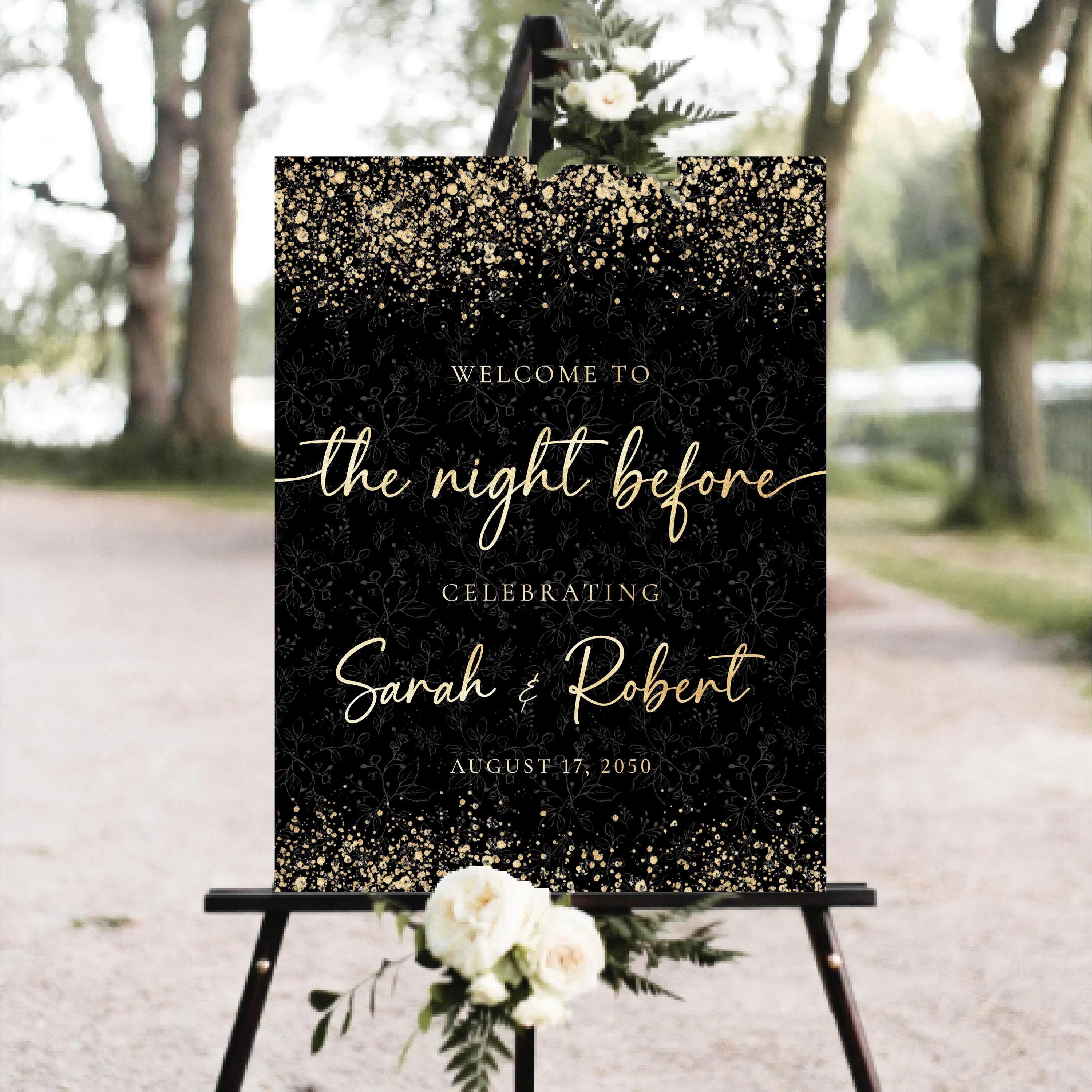 Modern Rehearsal Dinner Welcome Sign is a modern and elegant welcome sign design, featuring a striking black background accented with shimmering gold confetti. The design uses a soft, refined handwritten font that creates a warm and inviting atmosphere for your event. The product is available as a printed sign or a digital file and can be fully personalized with your event details, helping you make a unique impression and welcome your guests in a stylish and professional way.