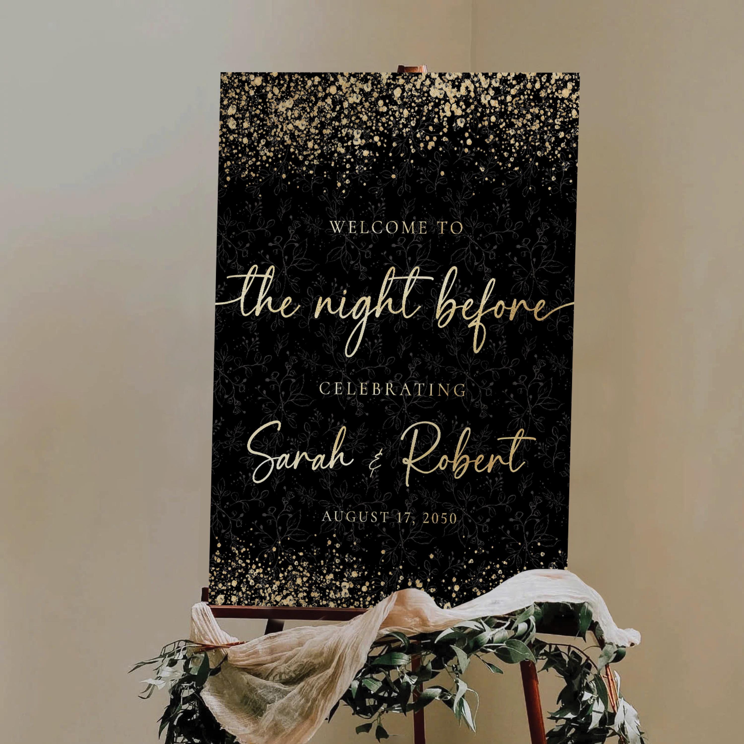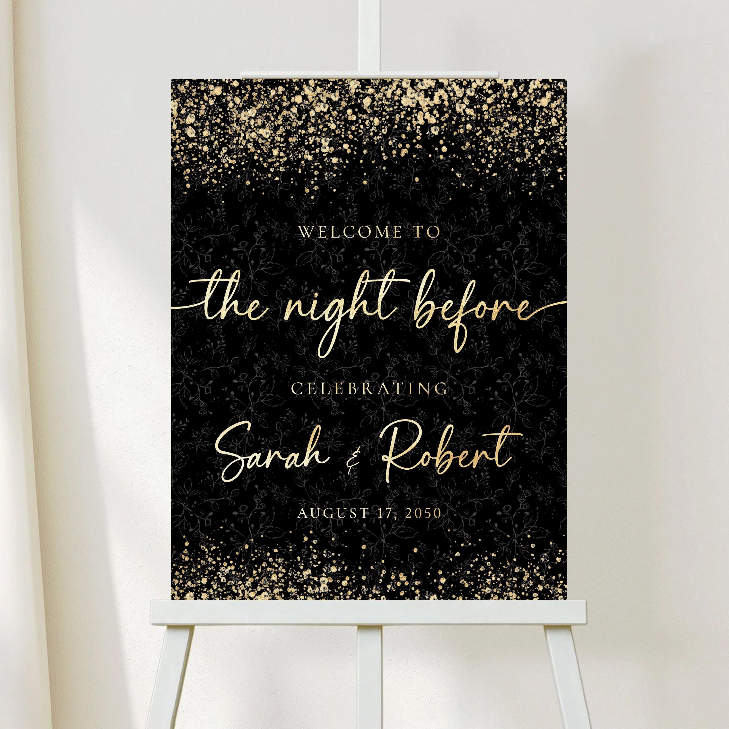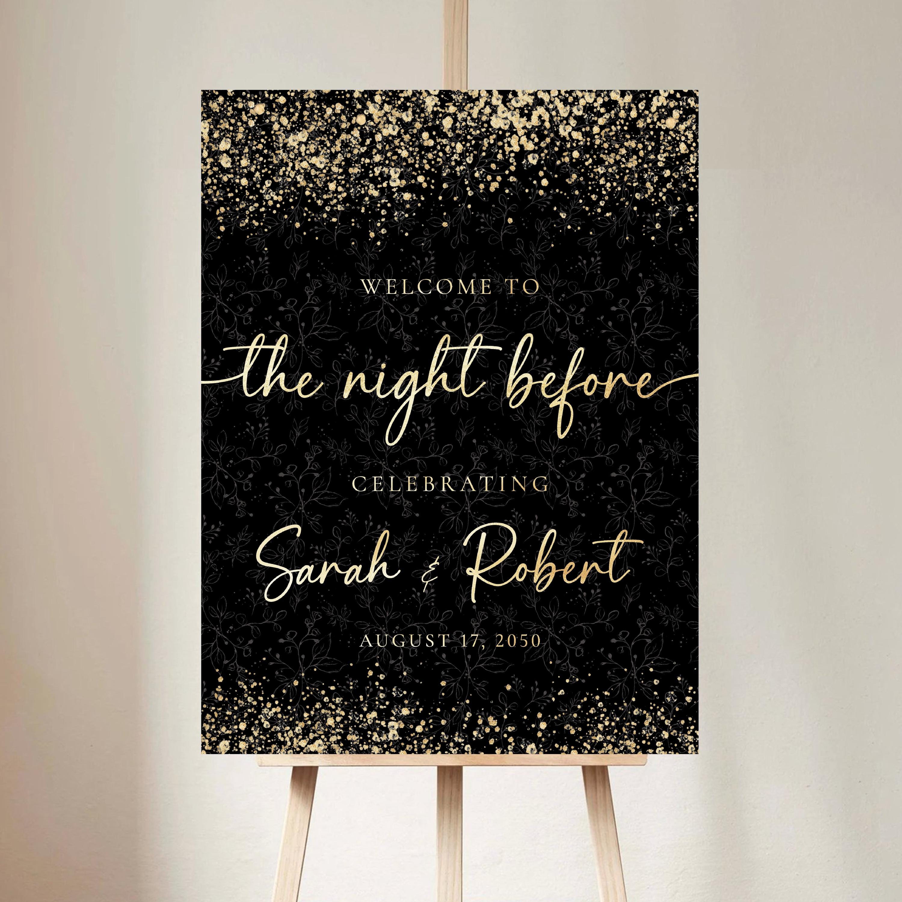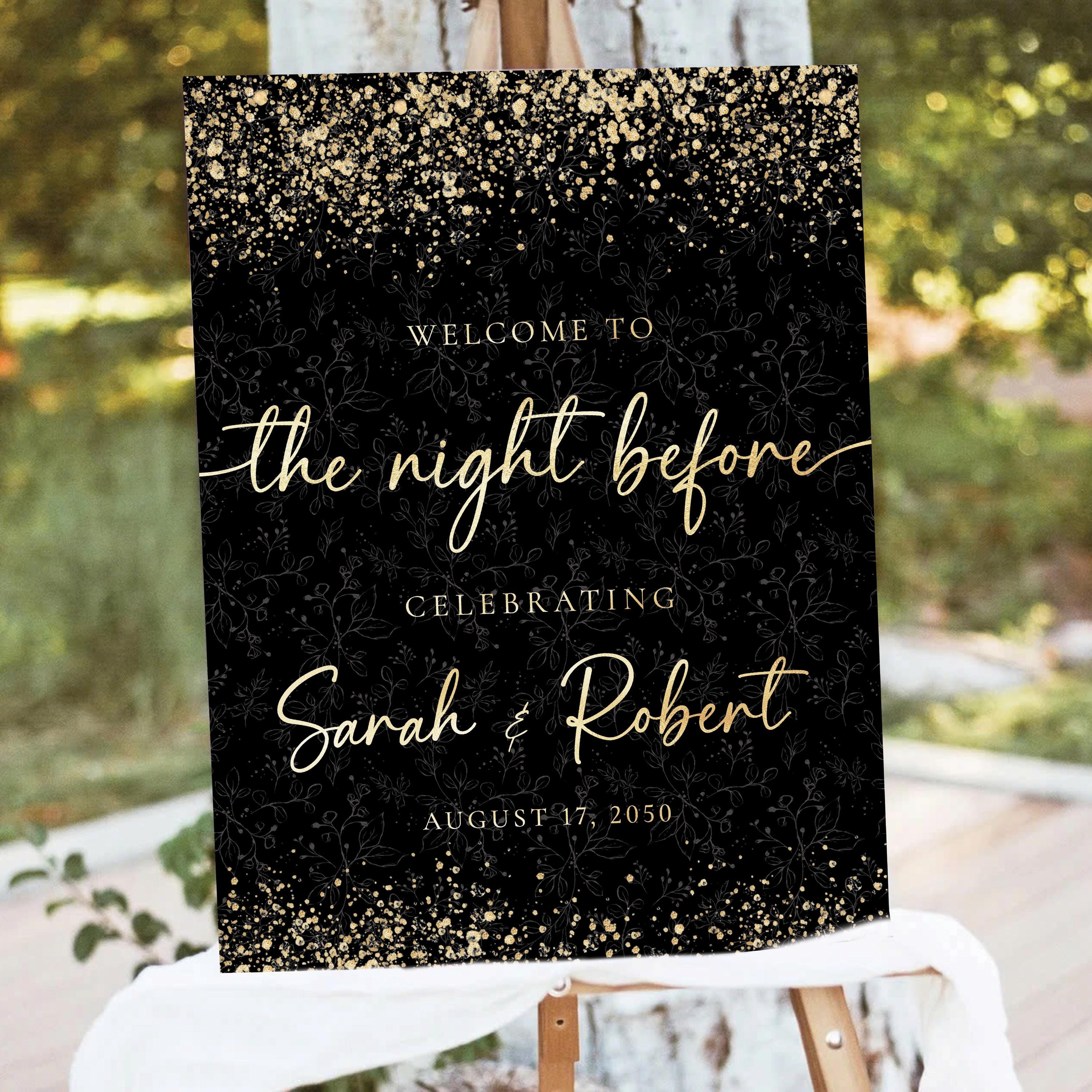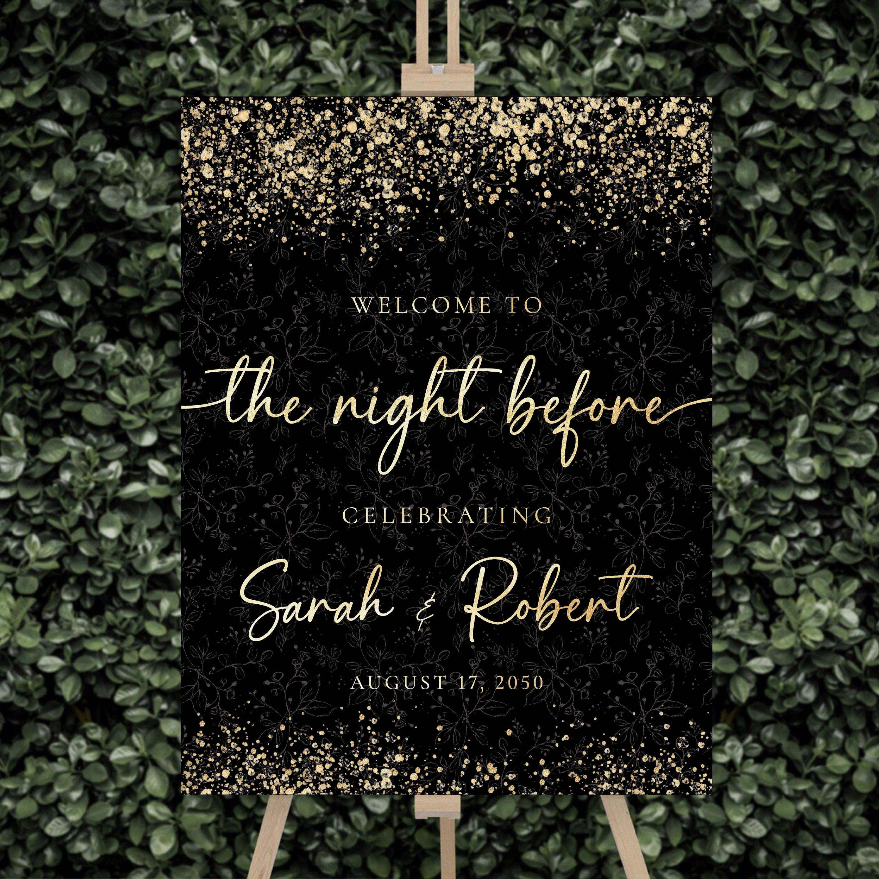 Modern Rehearsal Dinner Welcome Sign is a modern and elegant welcome sign design, featuring a striking black background accented with shimmering gold confetti. The design uses a soft, refined handwritten font that creates a warm and inviting atmosphere for your event. The product is available as a printed sign or a digital file and can be fully personalized with your event details, helping you make a unique impression and welcome your guests in a stylish and professional way.