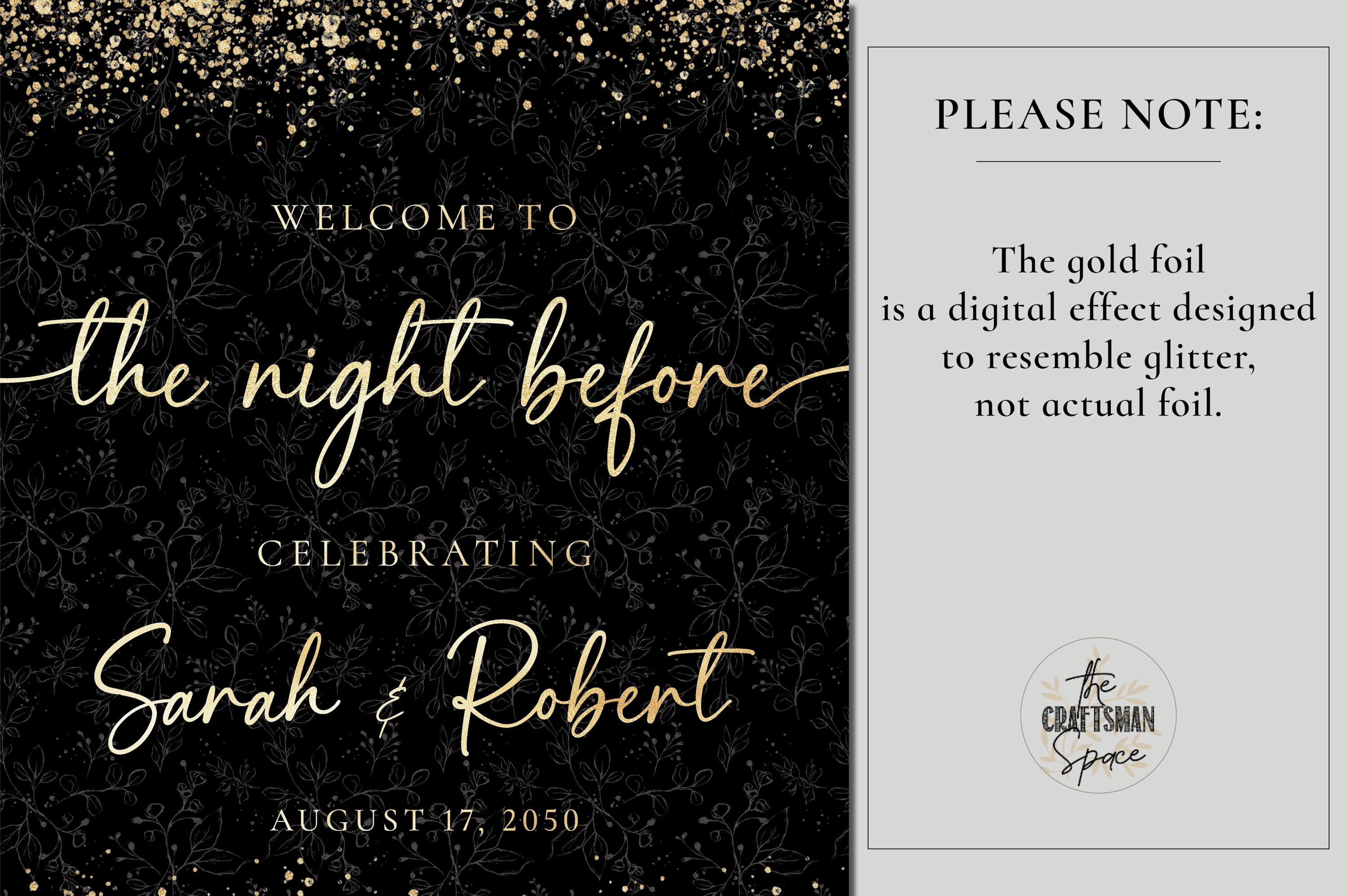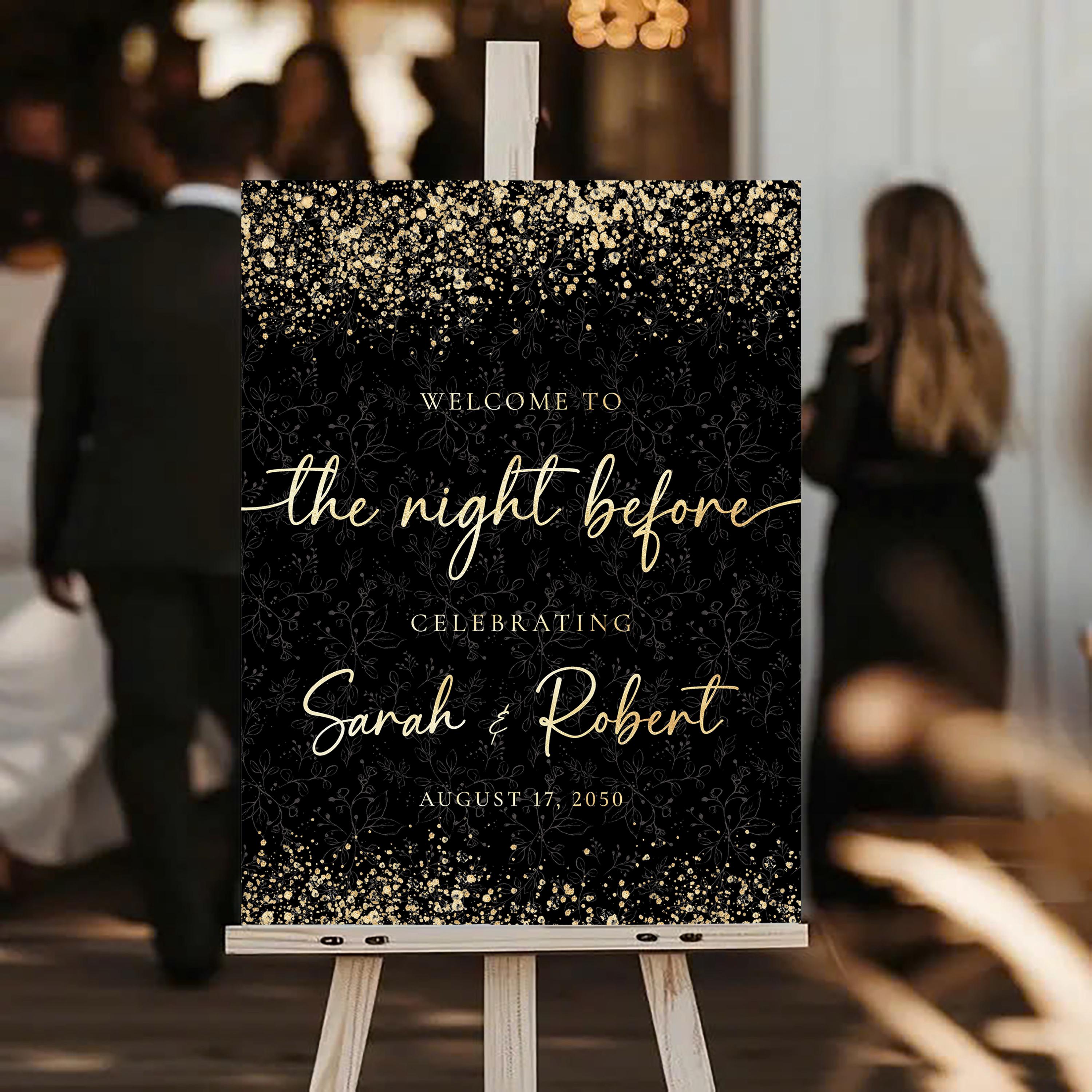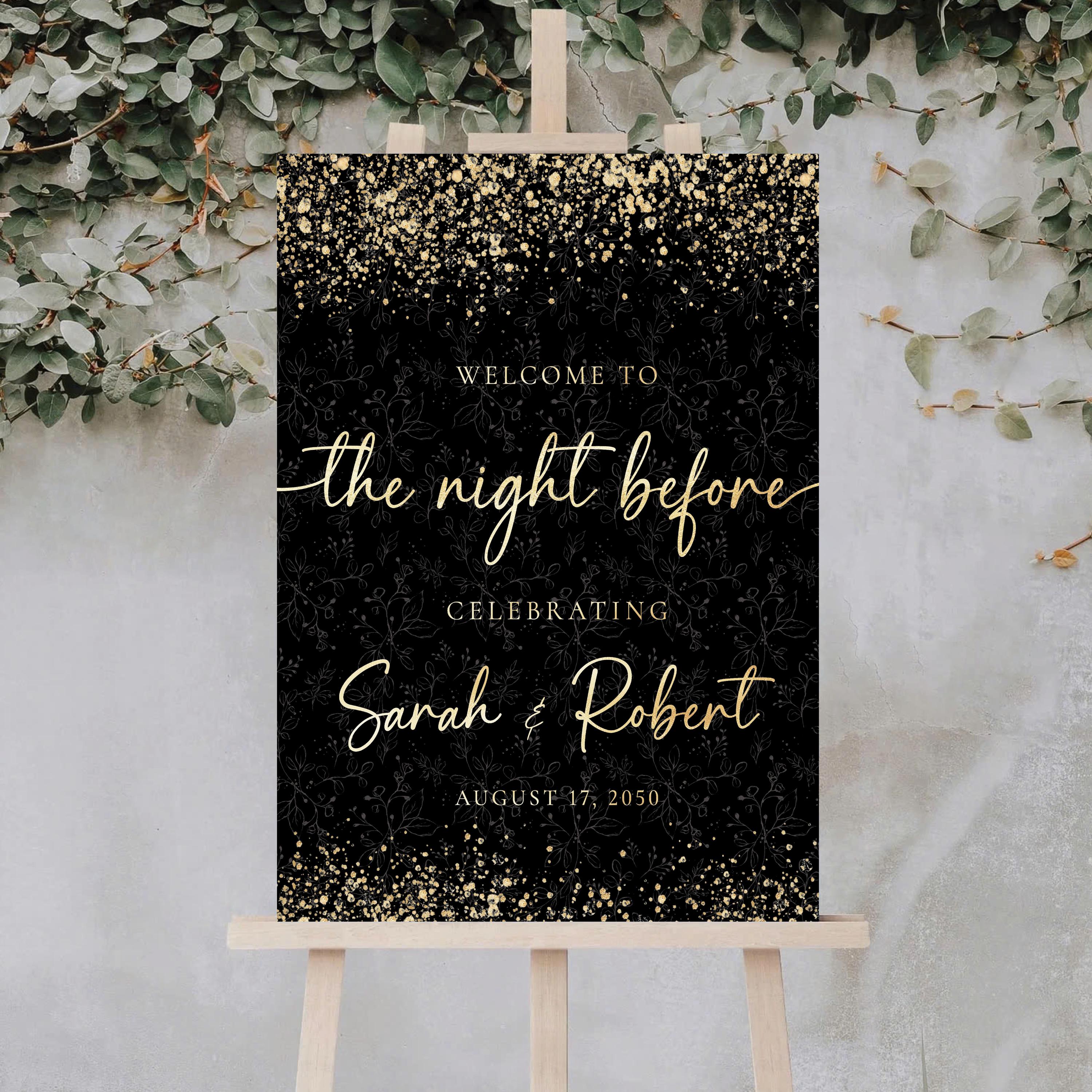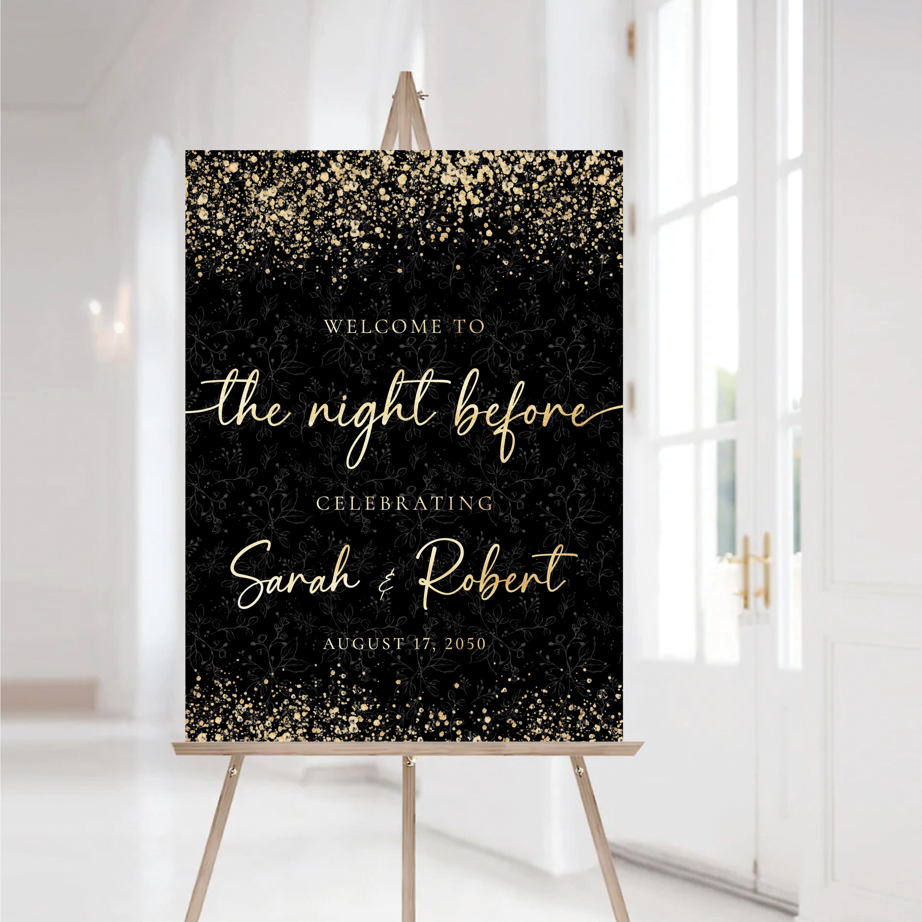 Modern Rehearsal Dinner Welcome Sign is a modern and elegant welcome sign design, featuring a striking black background accented with shimmering gold confetti. The design uses a soft, refined handwritten font that creates a warm and inviting atmosphere for your event. The product is available as a printed sign or a digital file and can be fully personalized with your event details, helping you make a unique impression and welcome your guests in a stylish and professional way.