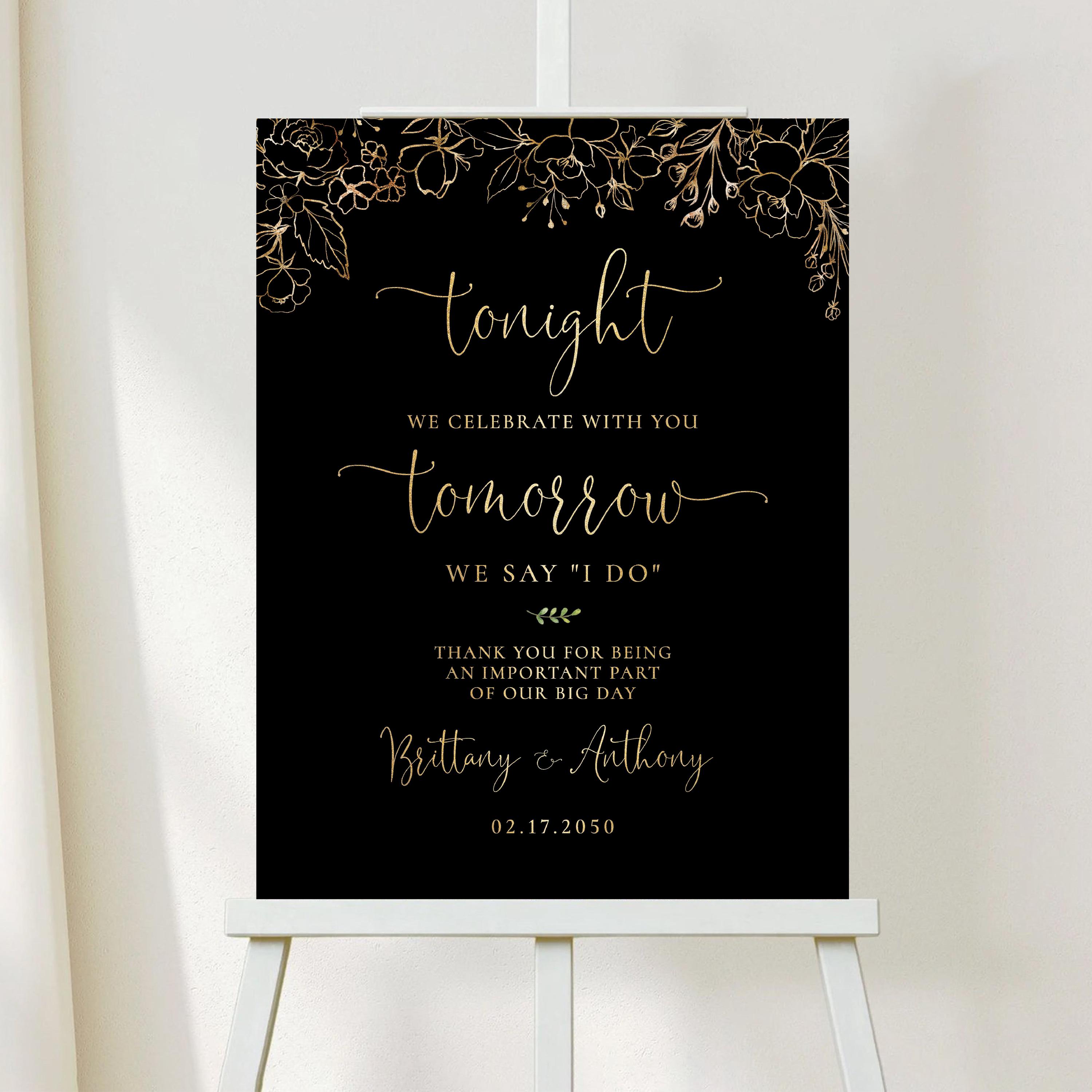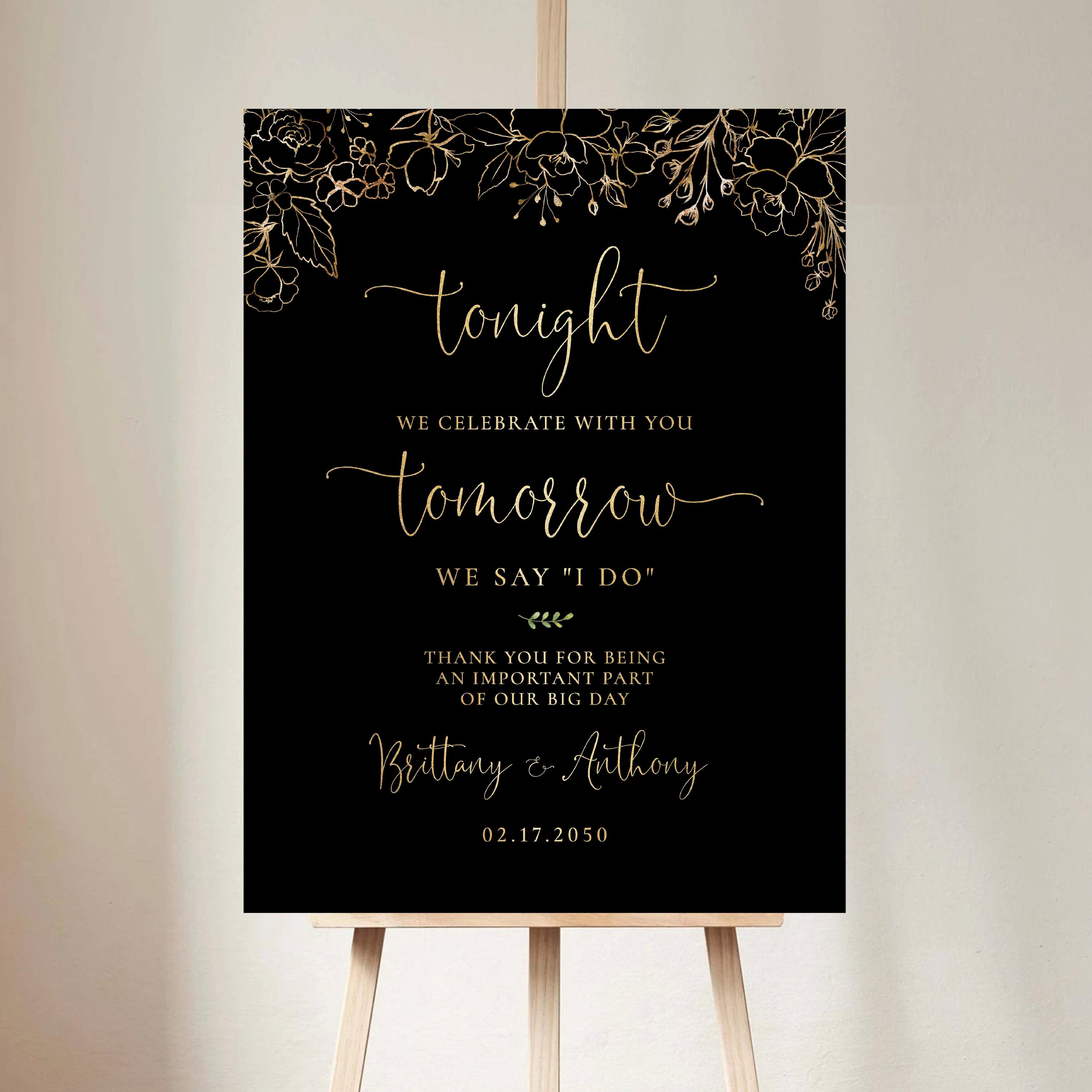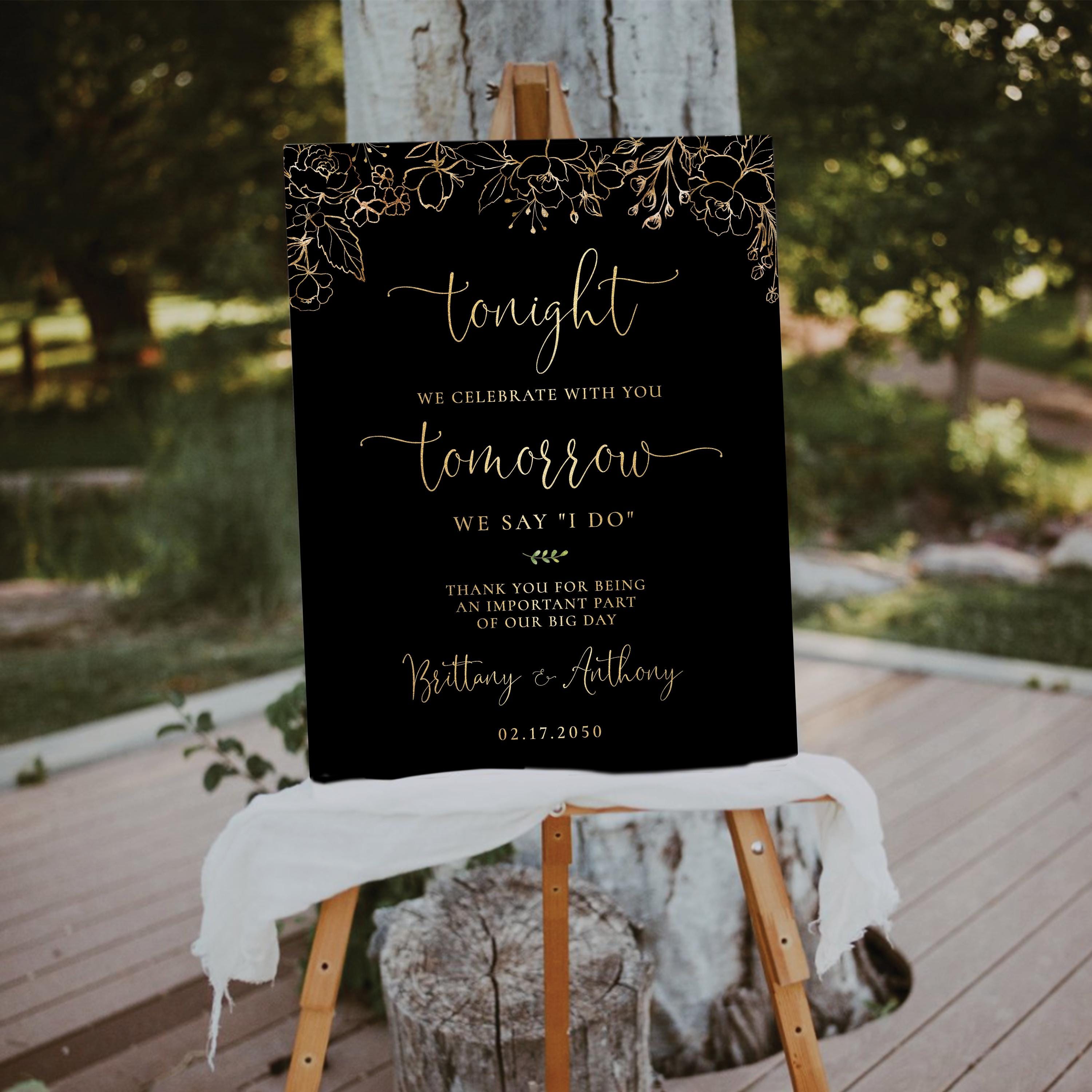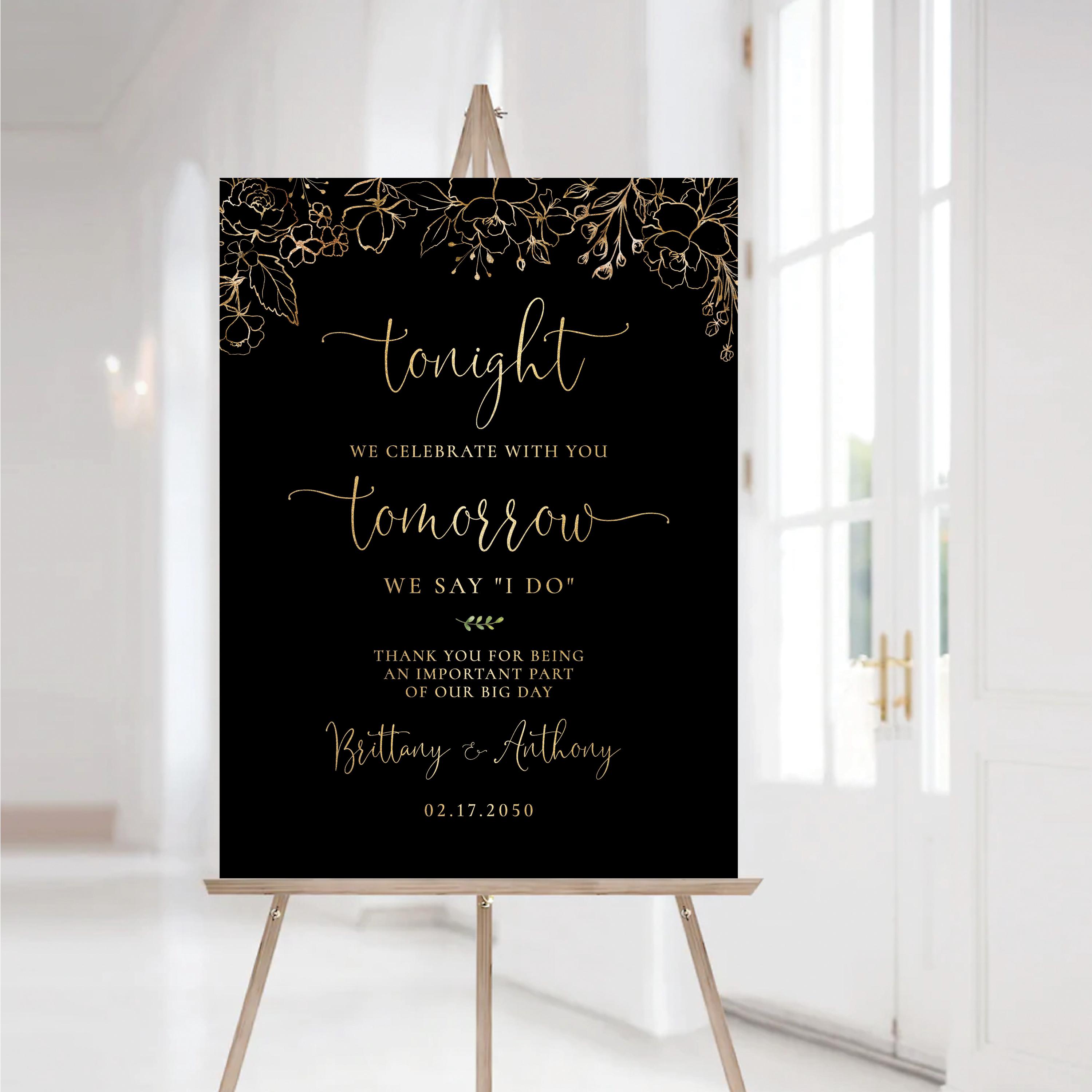 This modern rehearsal dinner welcome sign features a beautiful handwritten script font with a black and gold floral design. Available as a printed sign or a digital file, it can be fully personalized with your event details to perfectly match your special day.