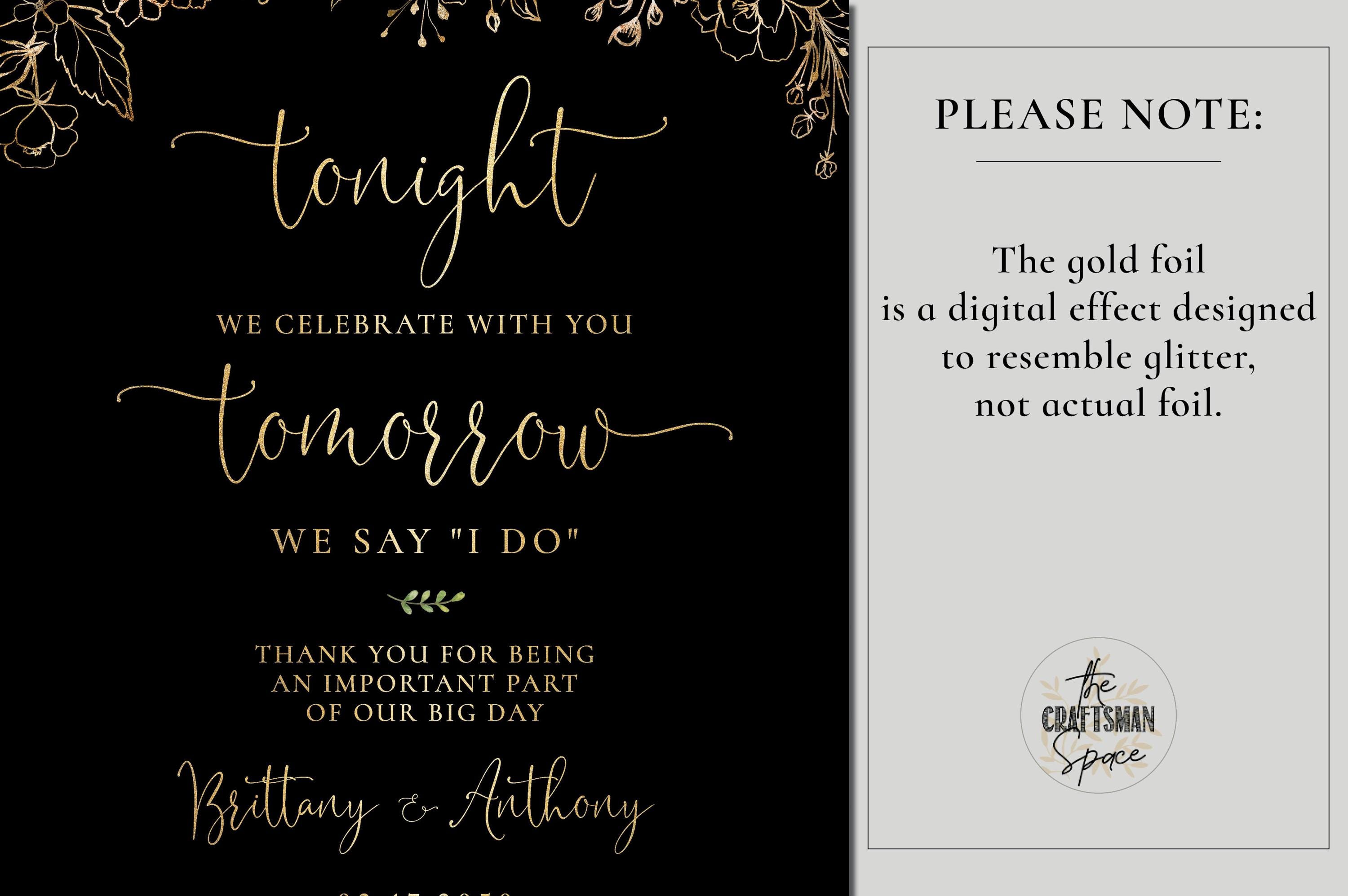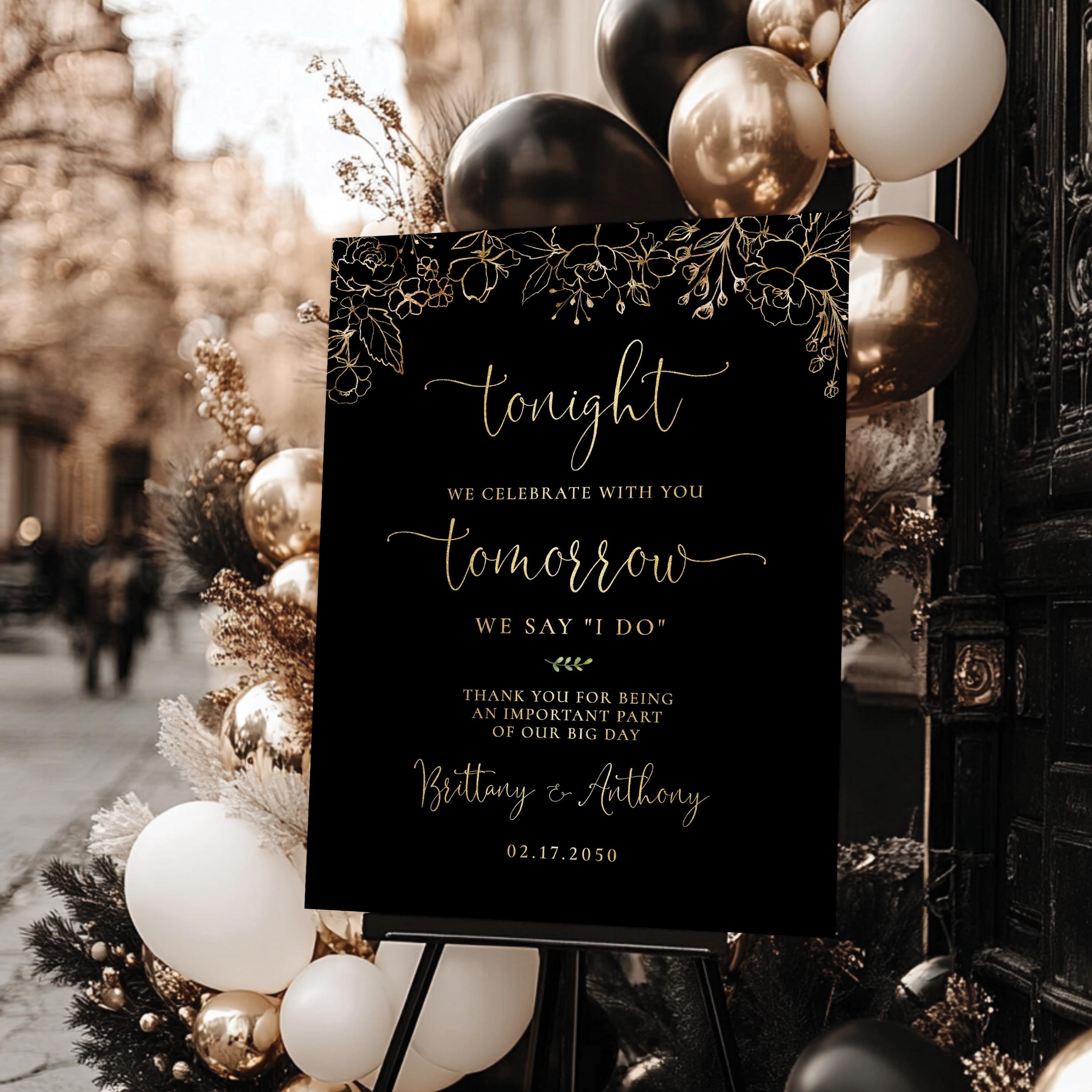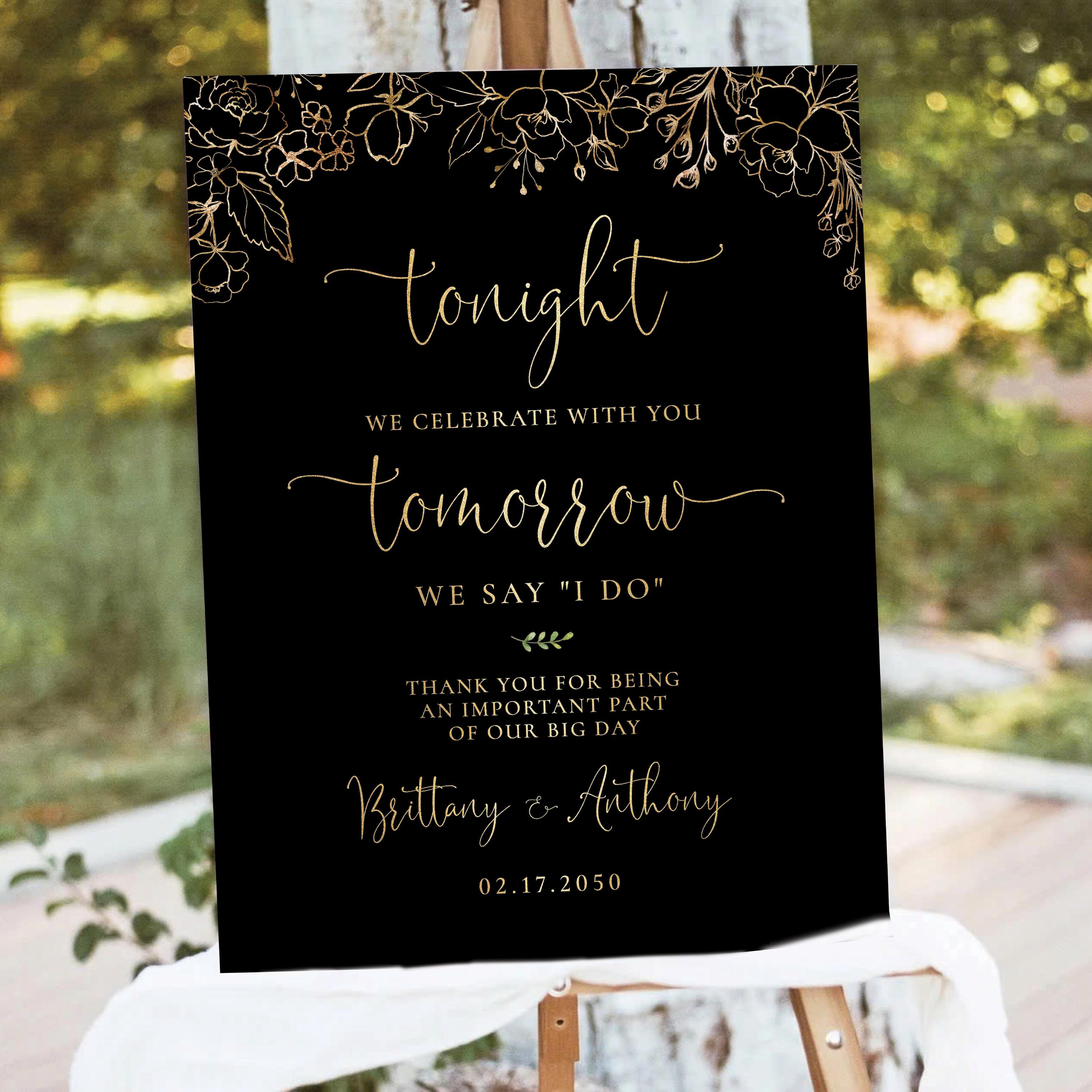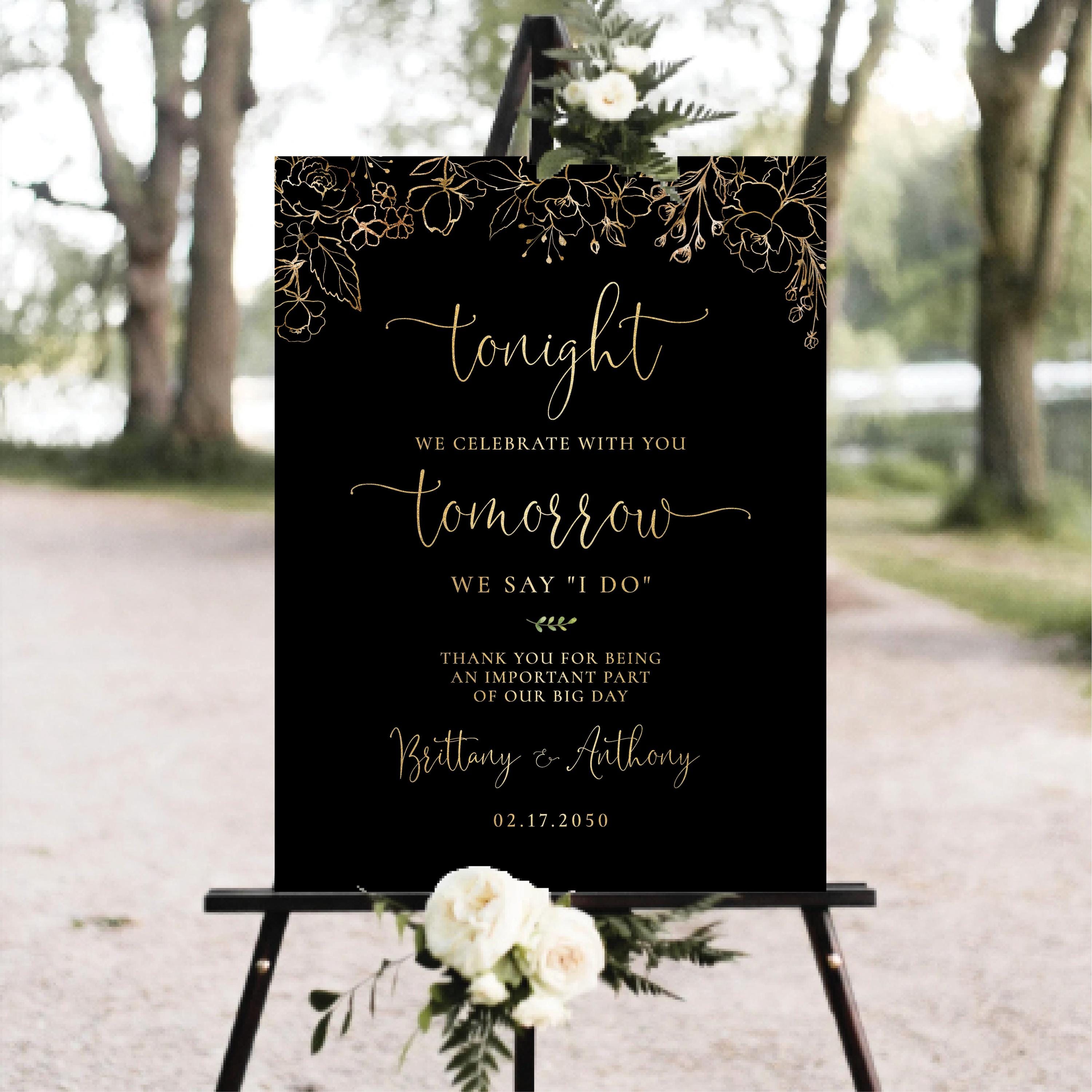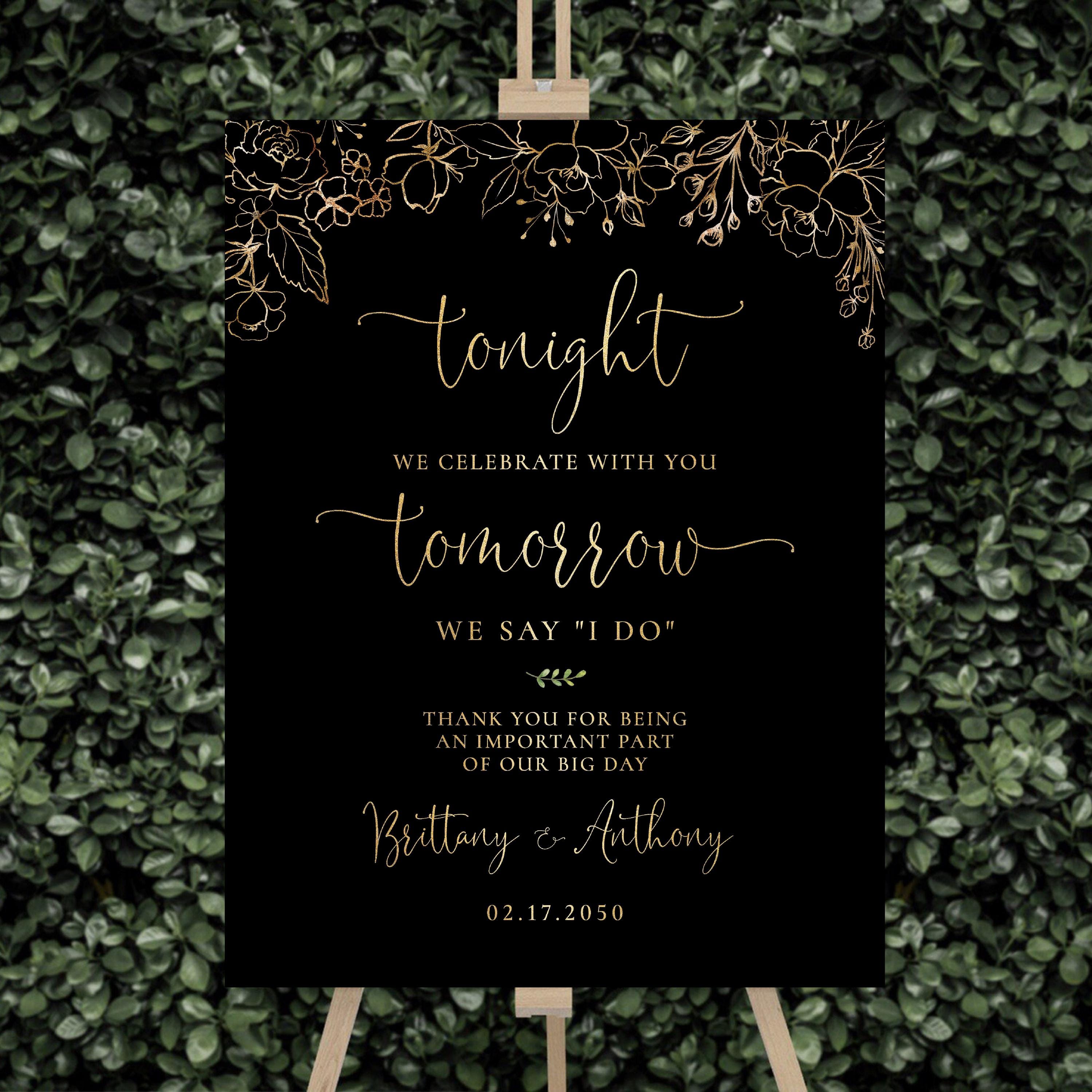 This modern rehearsal dinner welcome sign features a beautiful handwritten script font with a black and gold floral design. Available as a printed sign or a digital file, it can be fully personalized with your event details to perfectly match your special day.