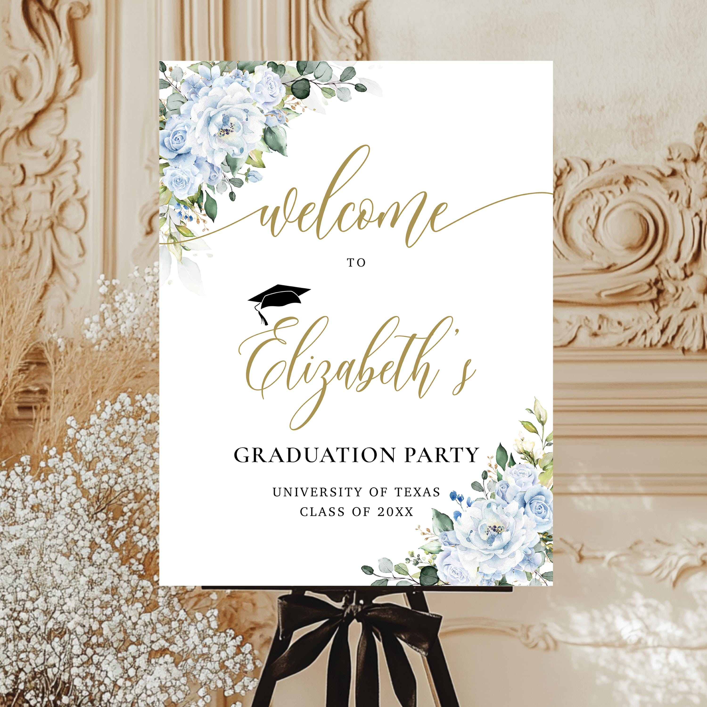 Designed with delicate light blue flowers, soft green leaves, and a handwritten-style font, this sign creates a fresh and refined look for your graduation celebration. Personalized with your event details, it’s the perfect way to add a thoughtful and memorable touch to your special day.