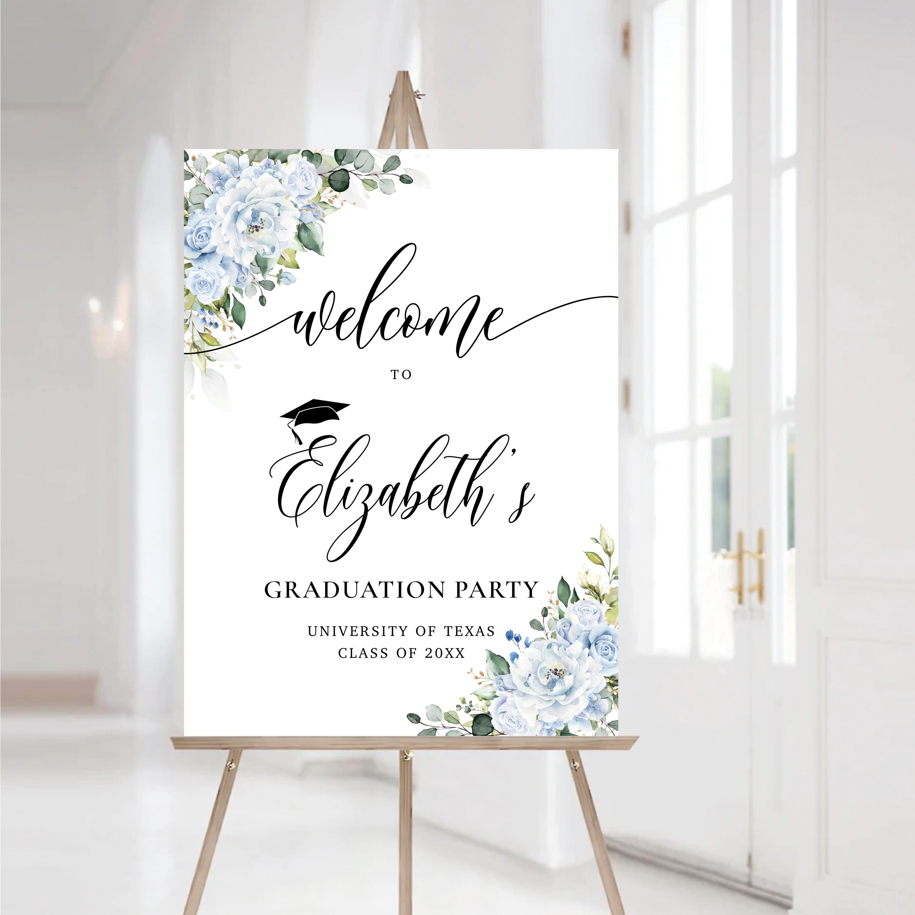 Welcome your guests with elegance using this Blue Floral Graduation Party Welcome Sign.