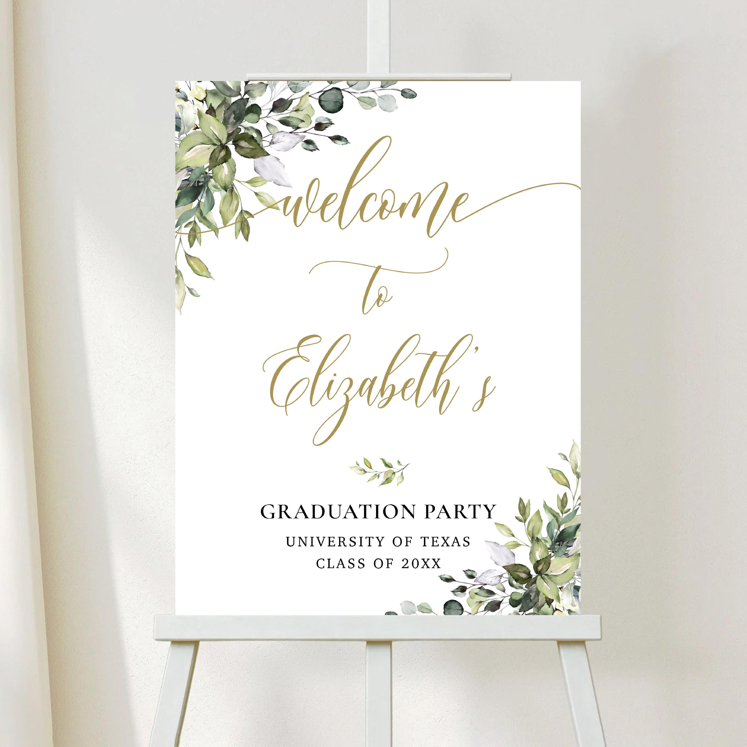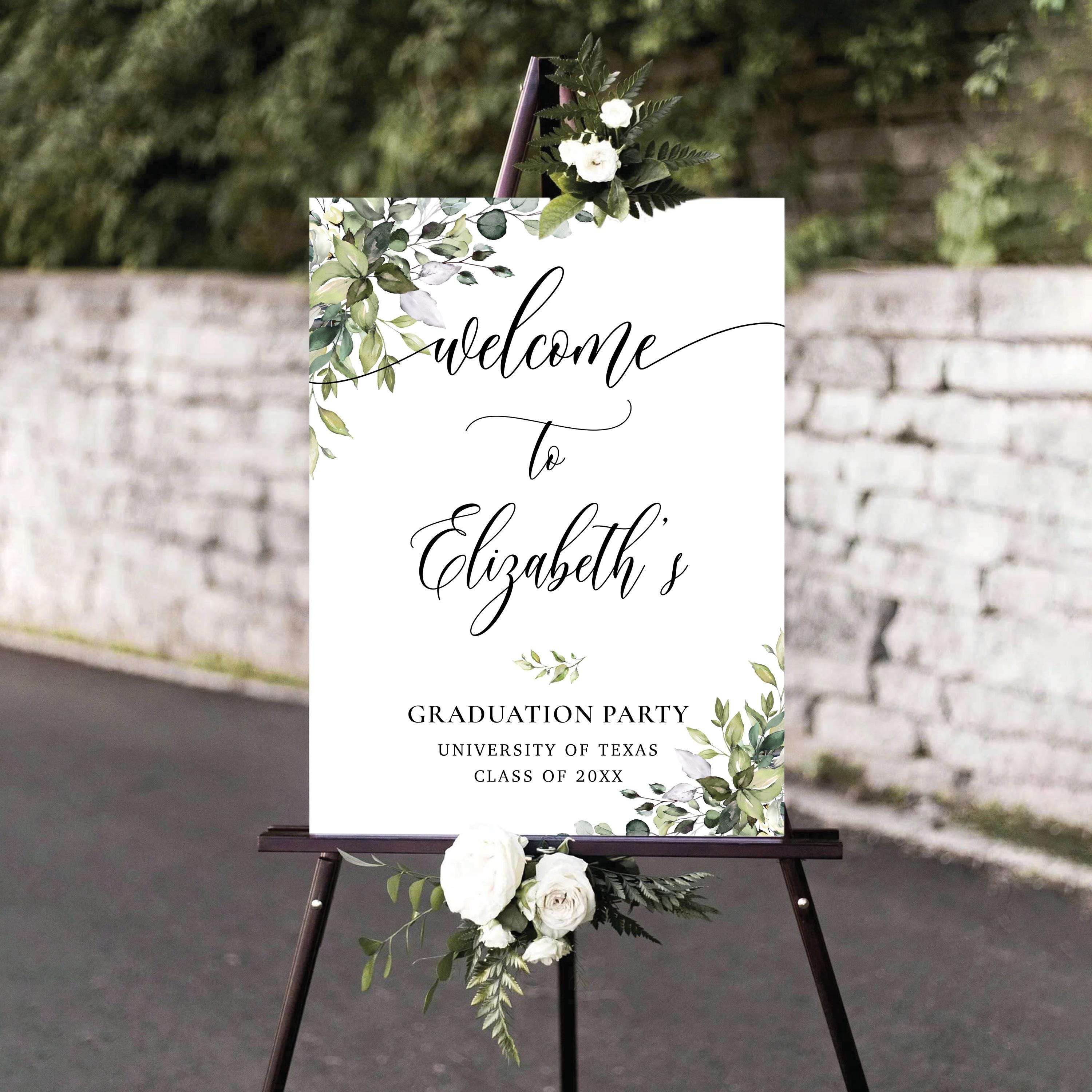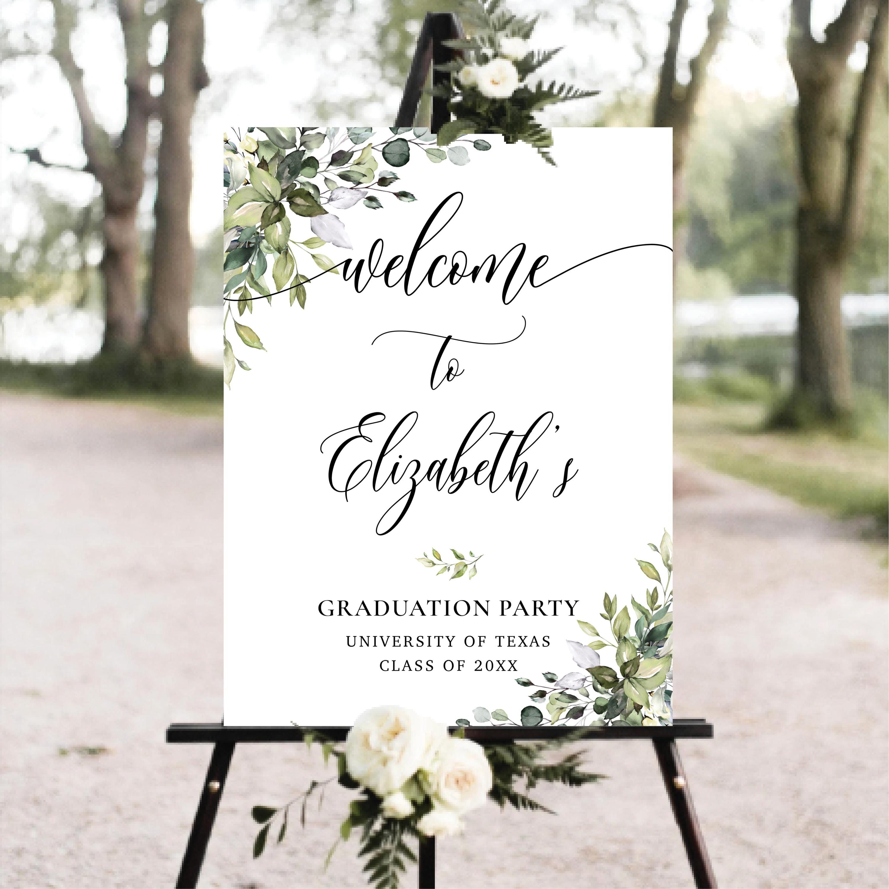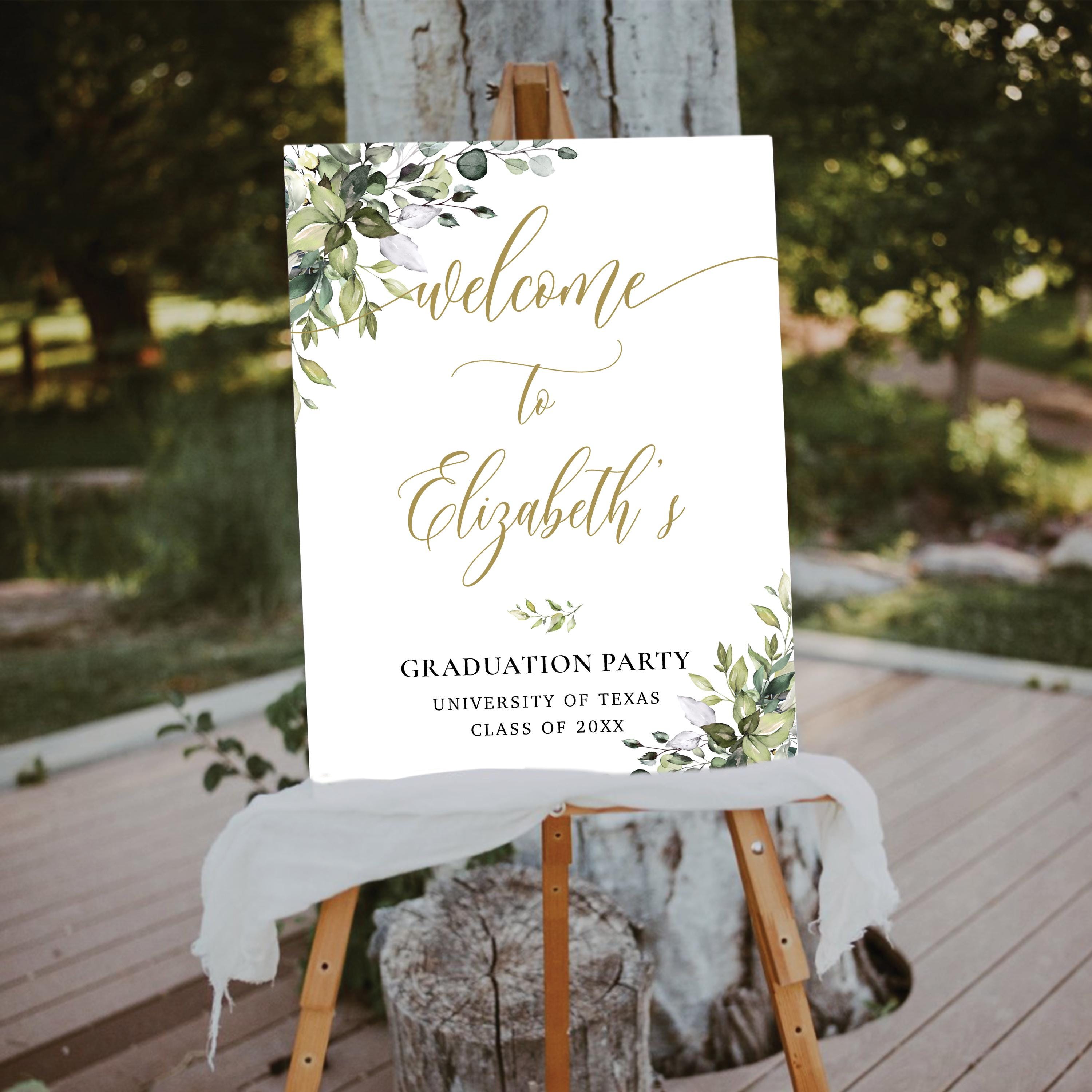 Designed with elegant greenery details and a soft handwritten-style font, this sign adds a fresh, modern touch to your graduation celebration. Fully personalized with your event details, it’s the perfect way to create a warm and memorable first impression for your special day.