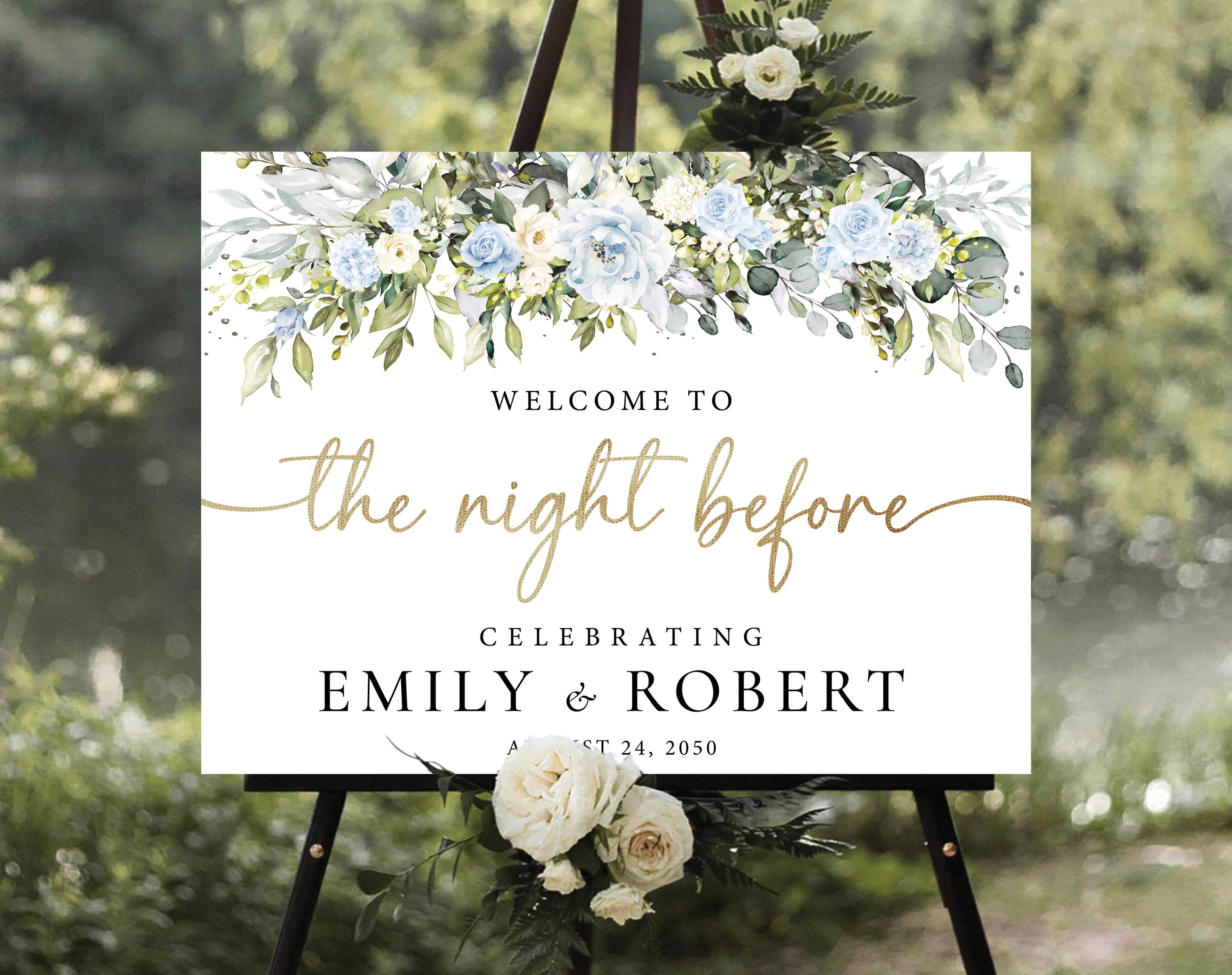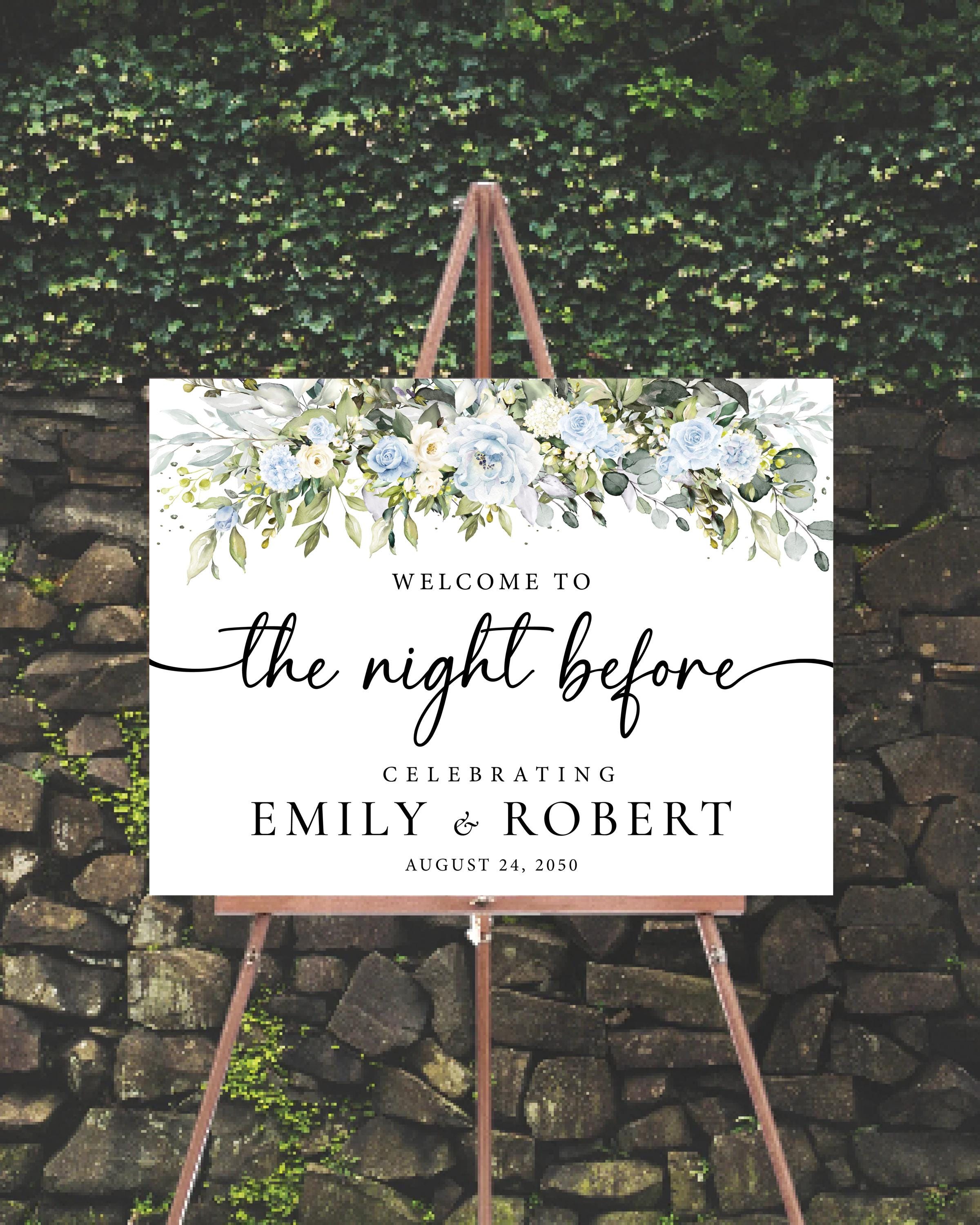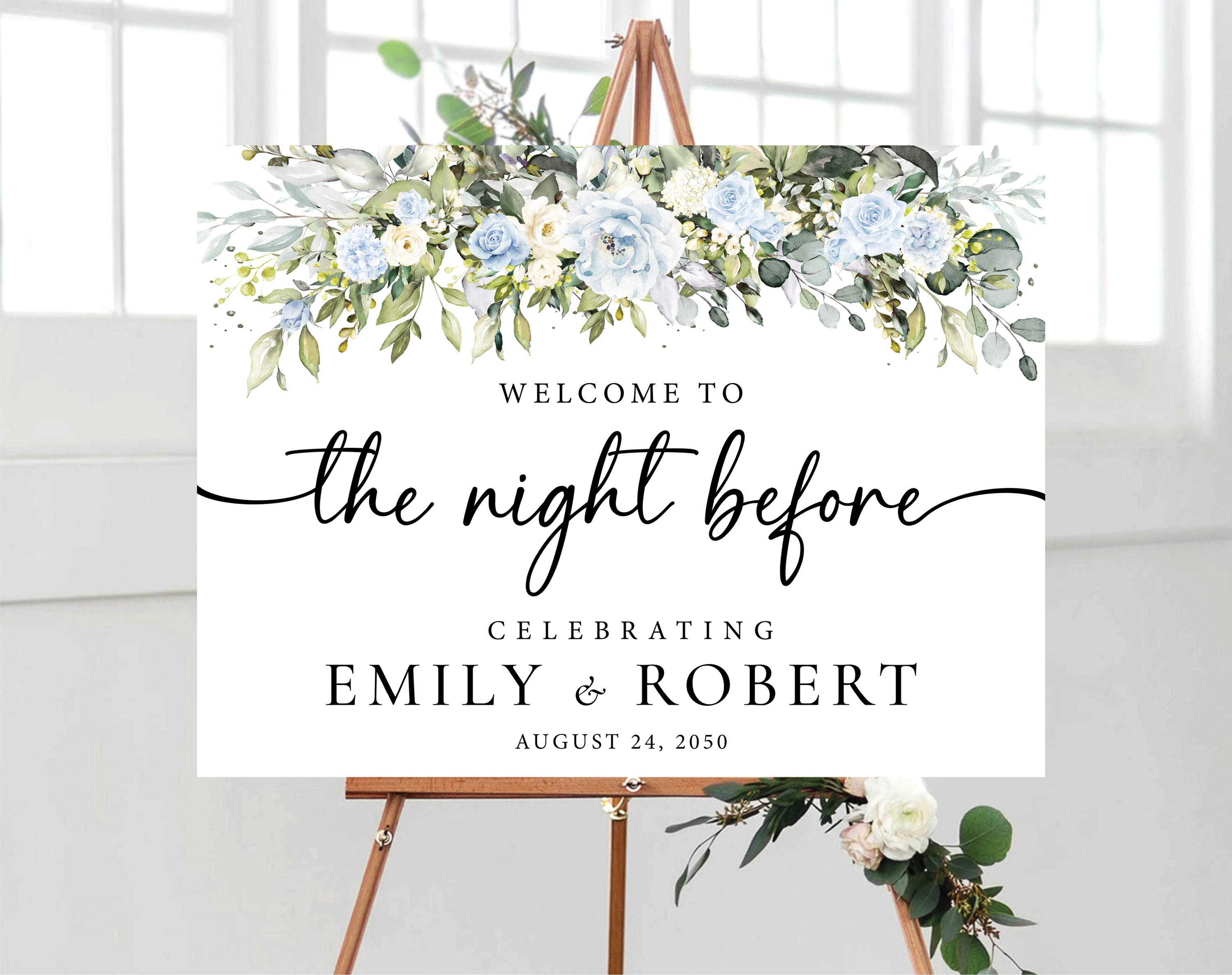 Welcome your guests with this elegant Floral Rehearsal Dinner Welcome Sign, featuring delicate light blue and white flowers with soft greenery accents. The beautiful handwritten-style font adds a romantic and personal touch, perfect for garden, greenery, or classic wedding themes. This design can be personalized with your event details, making it a charming way to greet friends and family at your rehearsal dinner while creating a warm and memorable first impression.