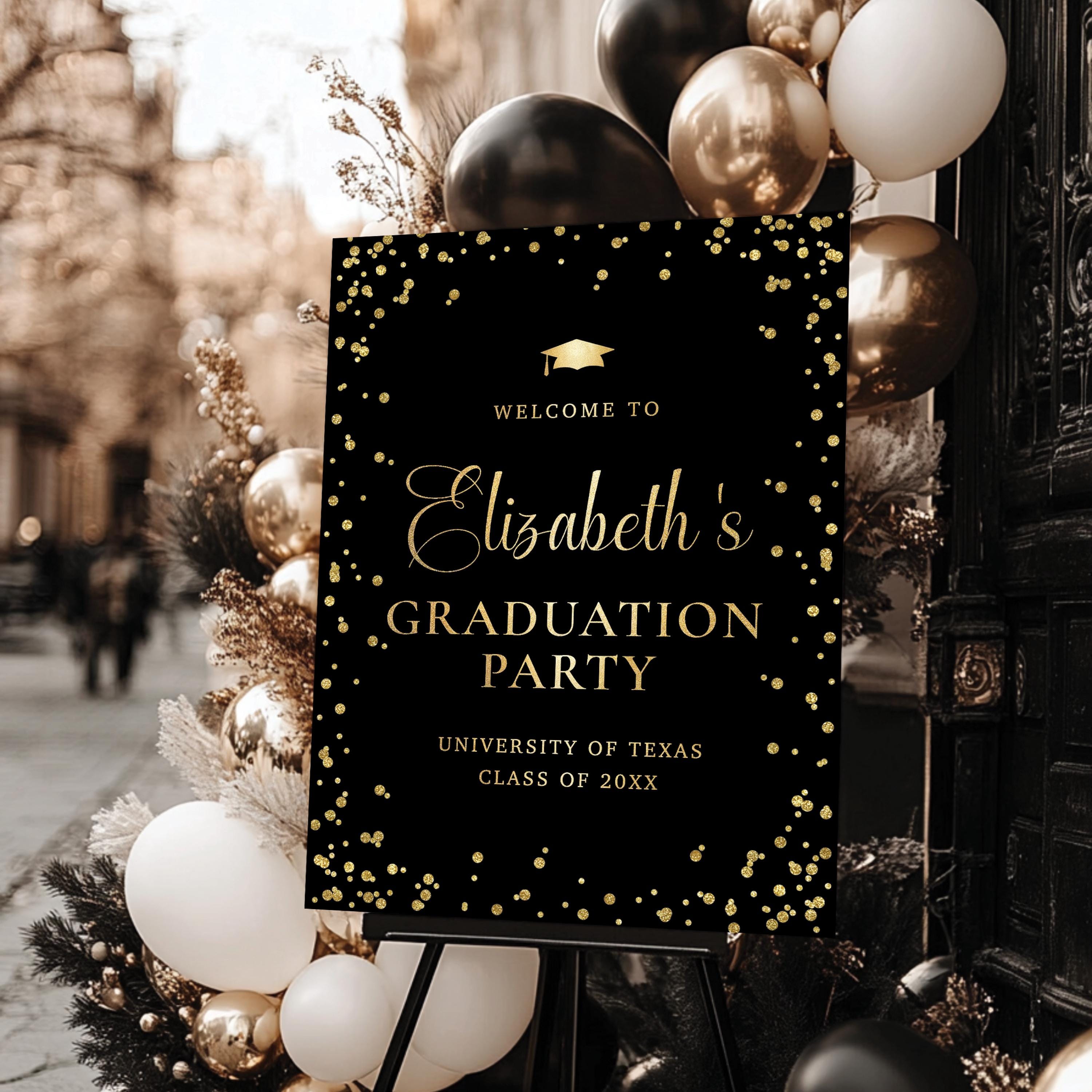 Celebrate your special day with this elegant Modern Graduation Welcome Sign, featuring a stylish black background with gold confetti accents and a beautiful handwritten-style font. This design adds a festive and sophisticated touch to your graduation party decor.