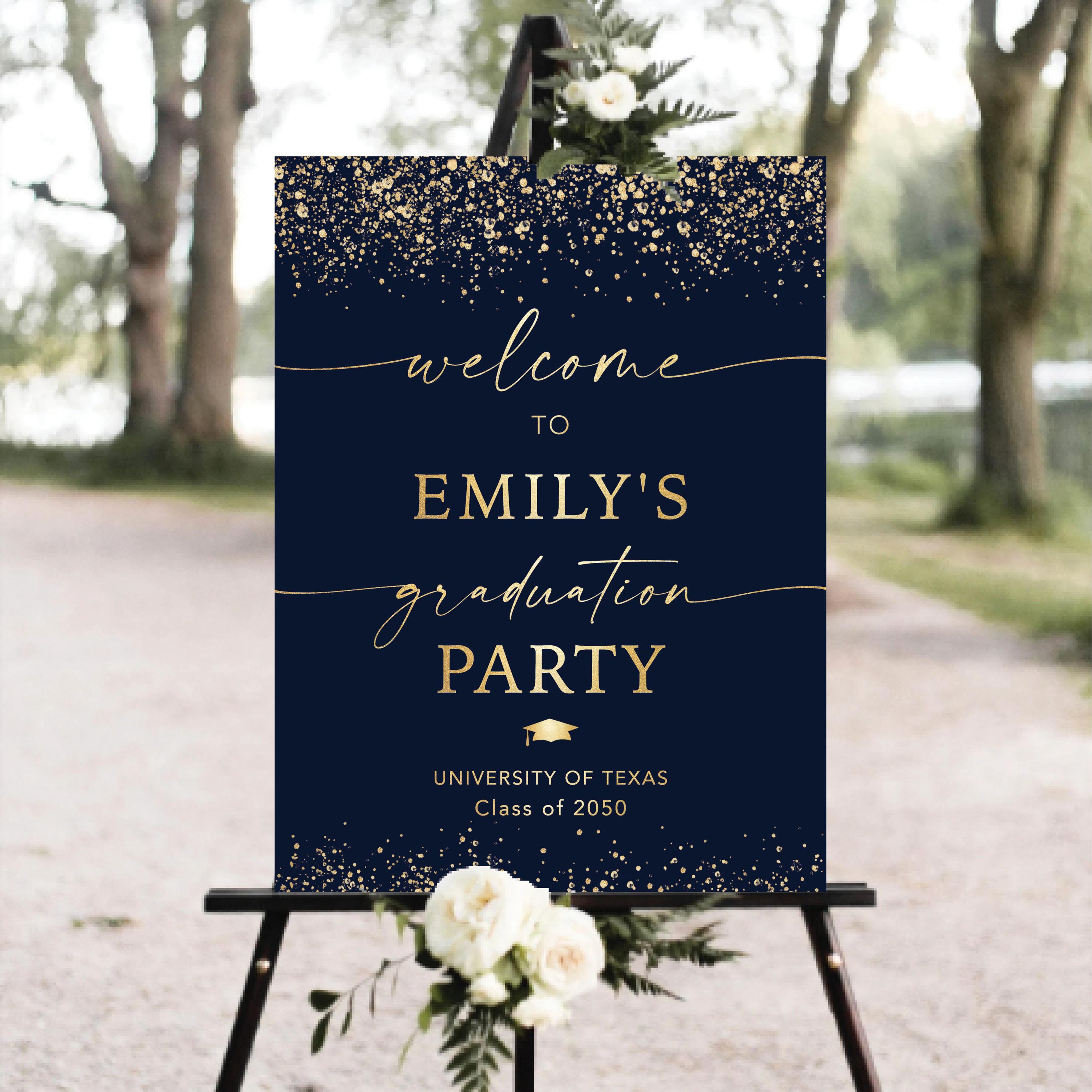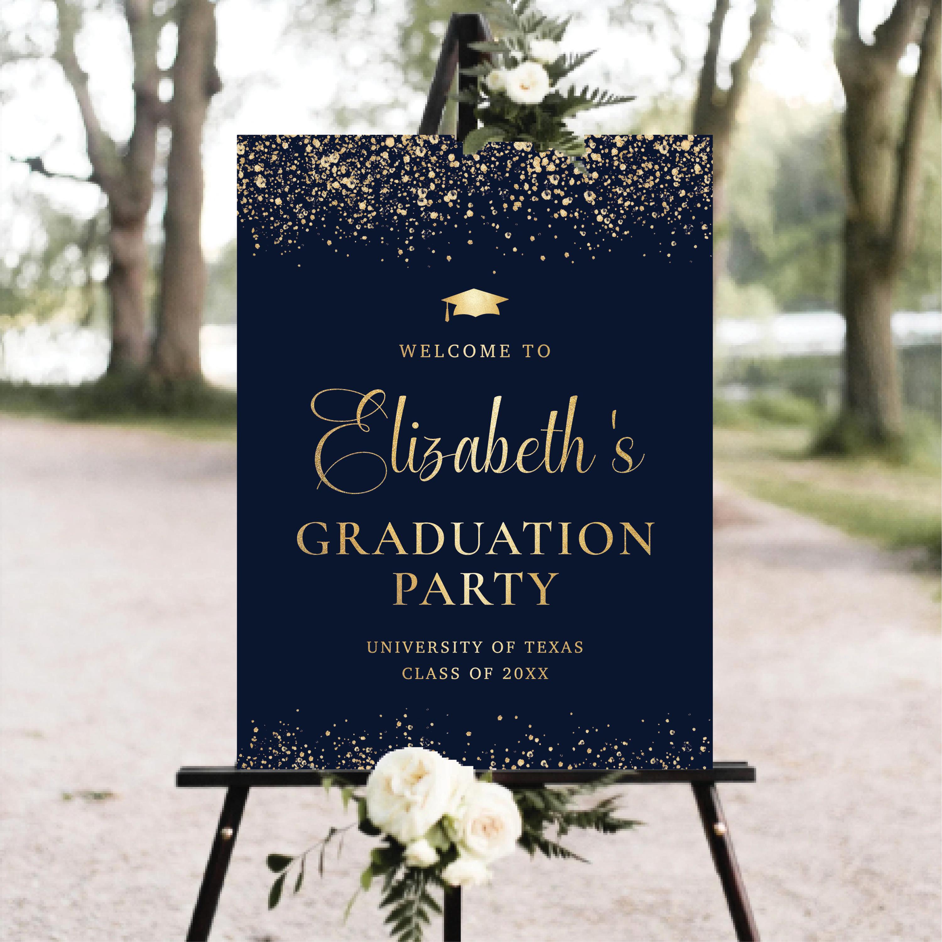 Celebrate your special day with this elegant Modern Graduation Welcome Sign, featuring a stylish blue navy background with gold confetti accents and a beautiful handwritten-style font. This design adds a festive and sophisticated touch to your graduation party decor.