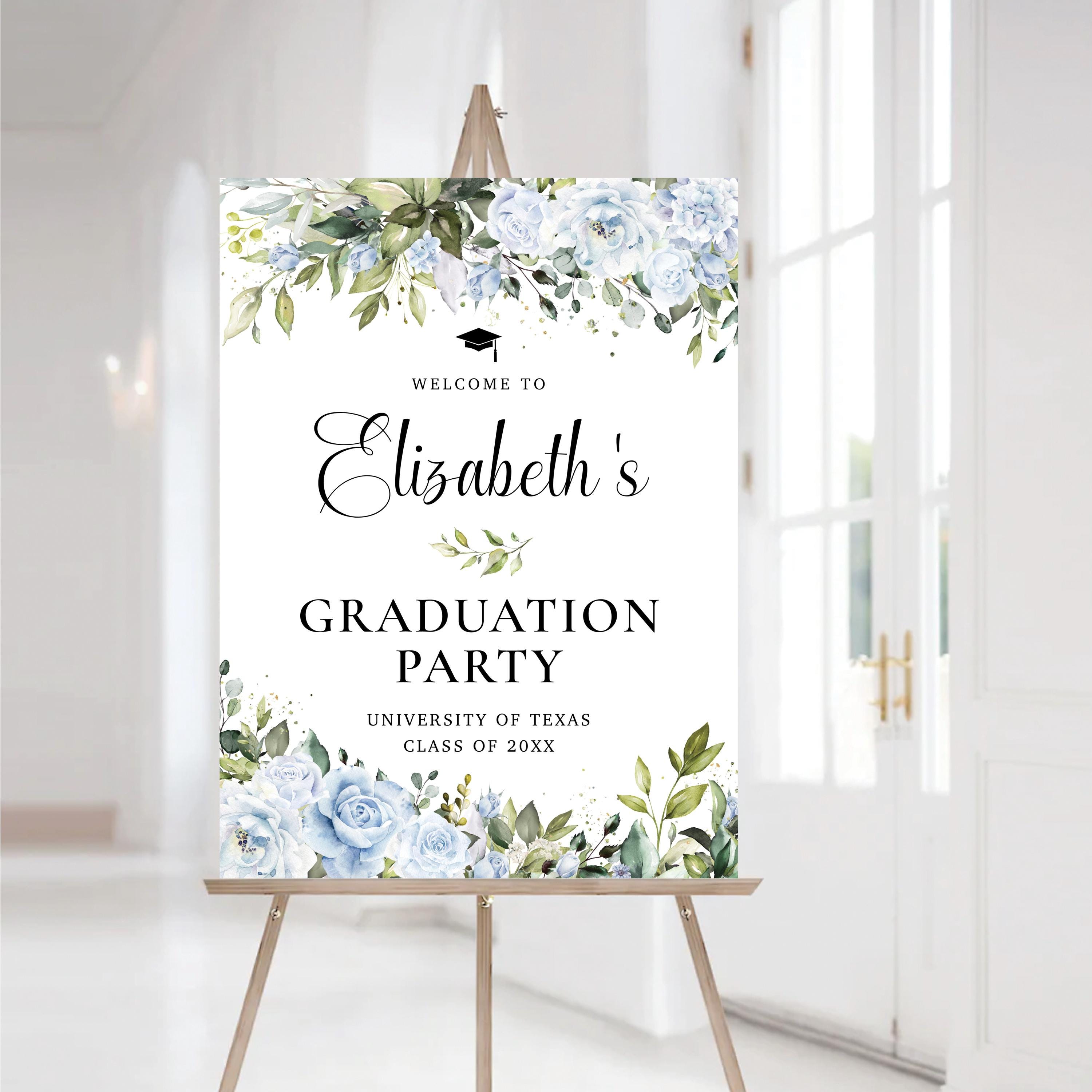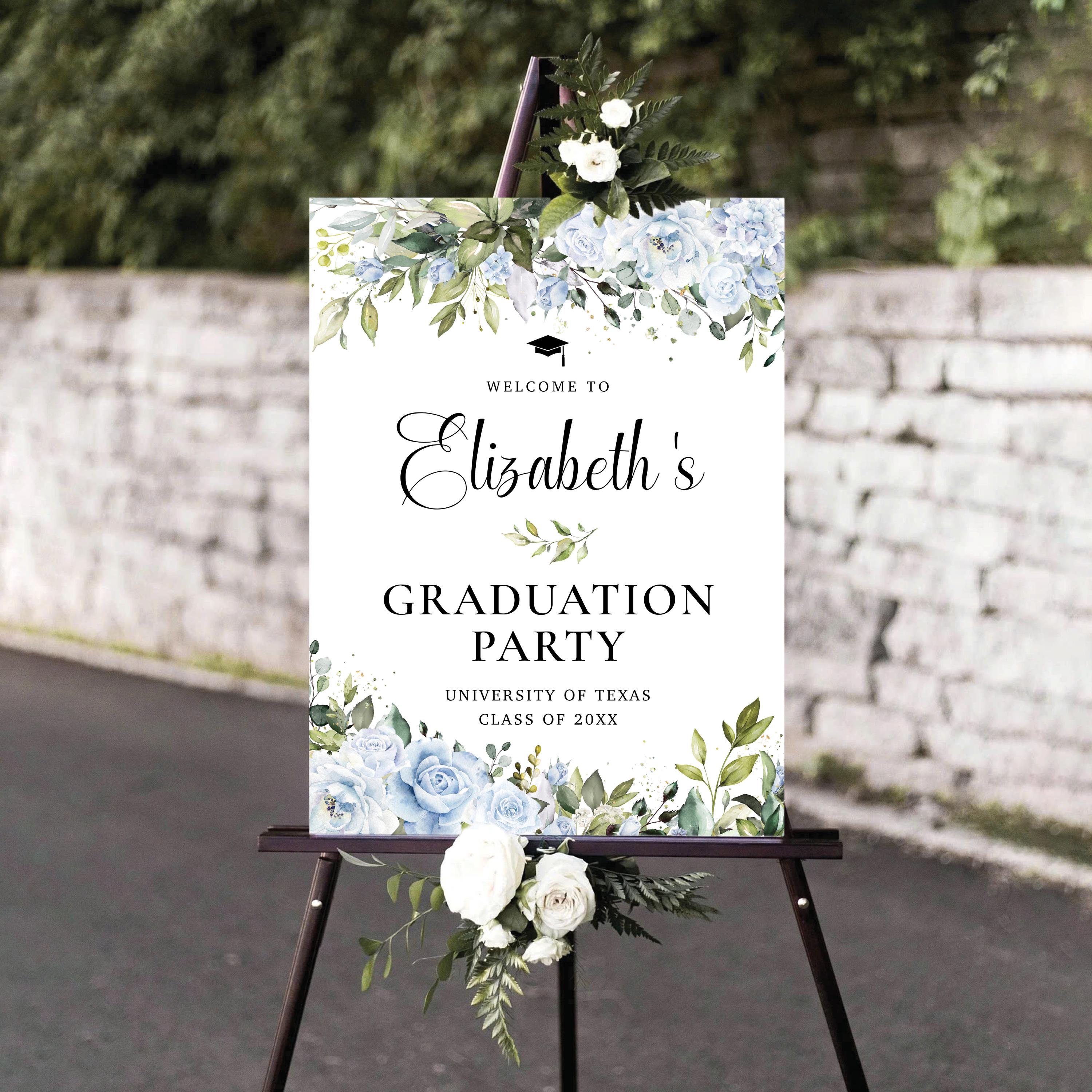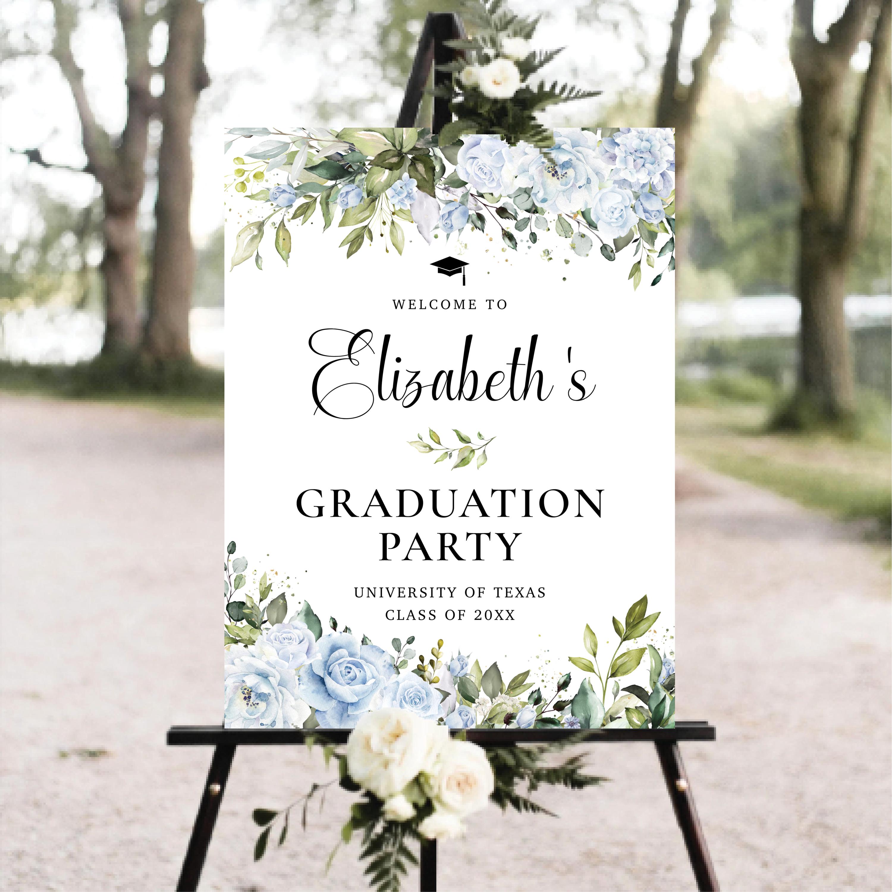 Designed with delicate light blue flowers, soft green leaves, and a handwritten-style font, this sign creates a fresh and refined look for your graduation celebration. Personalized with your event details, it’s the perfect way to add a thoughtful and memorable touch to your special day.