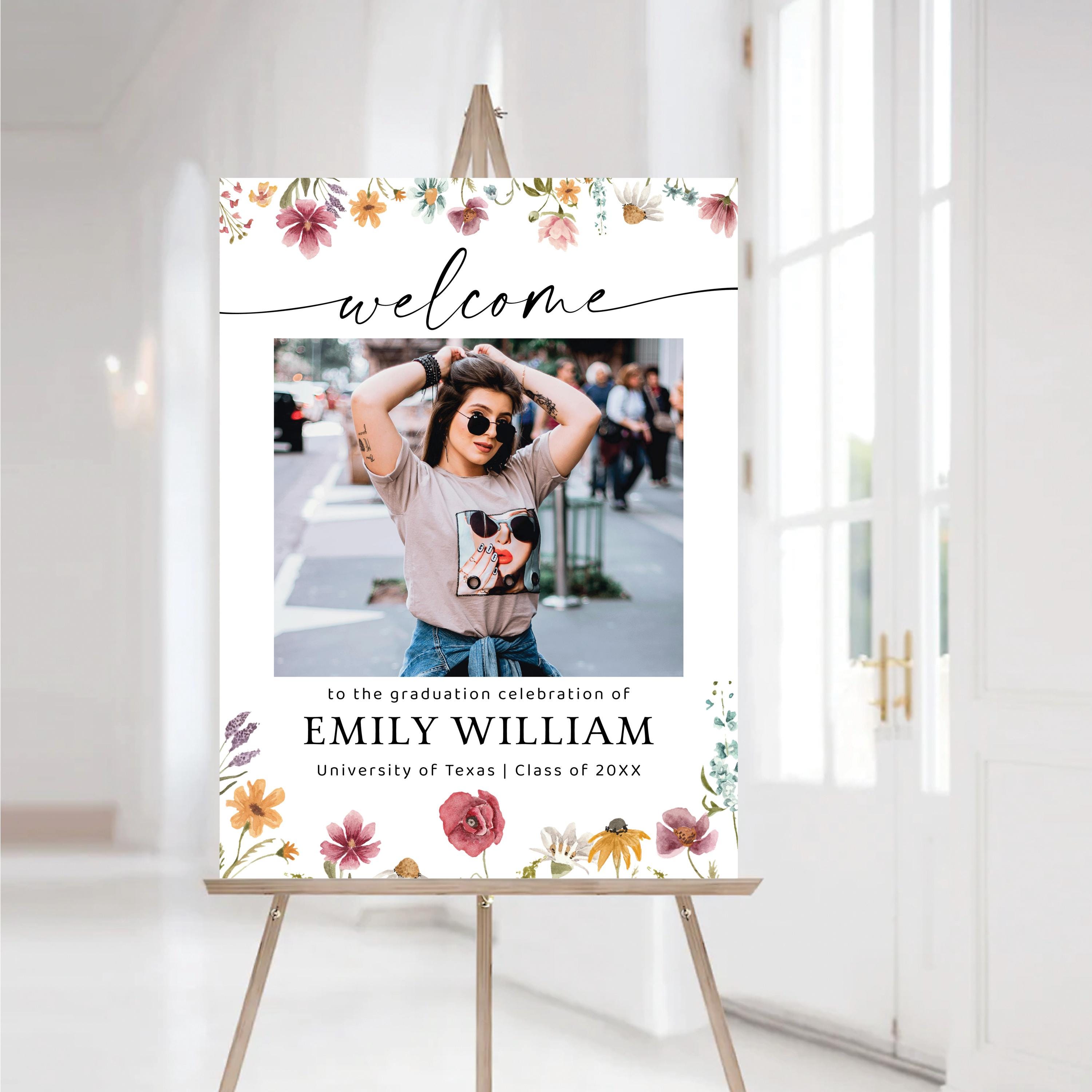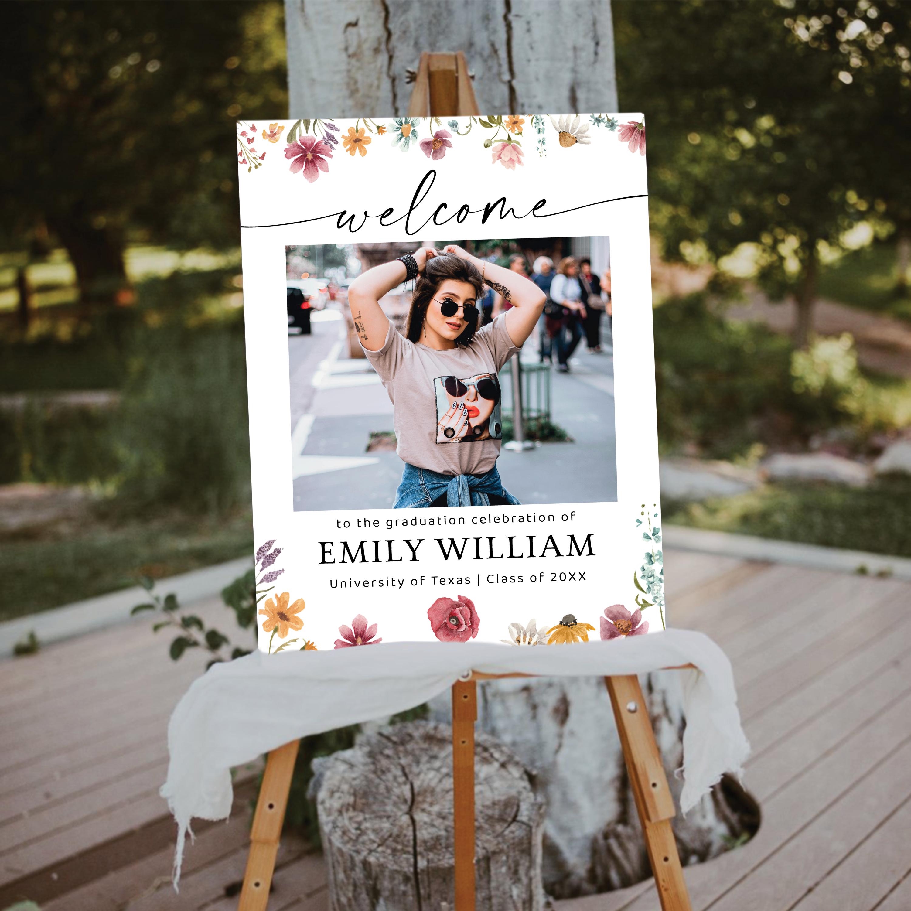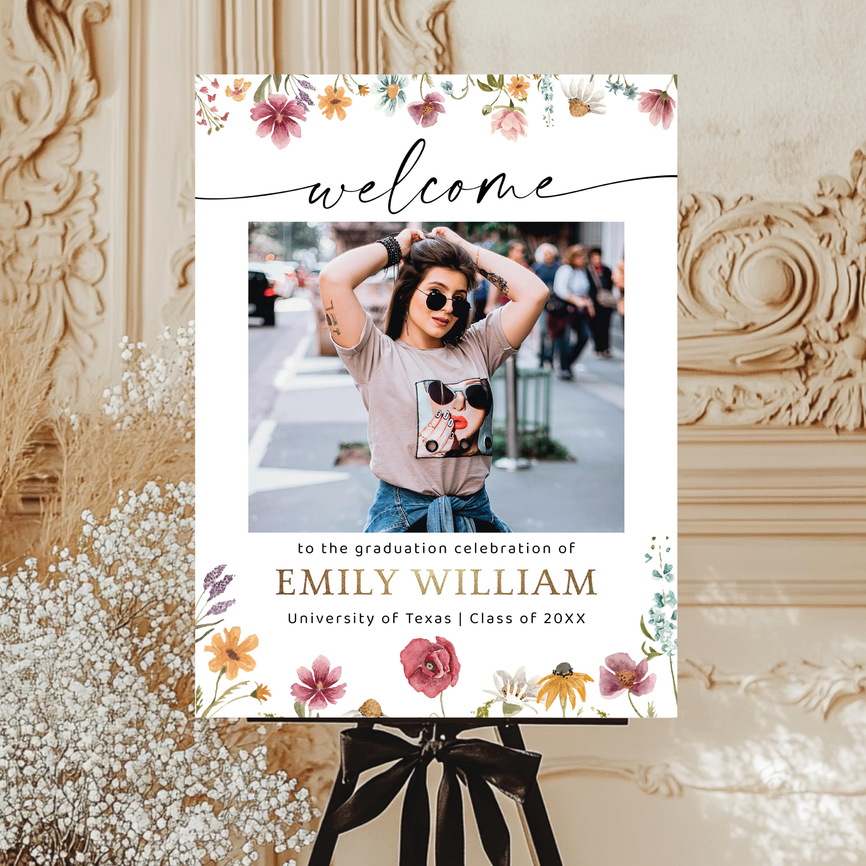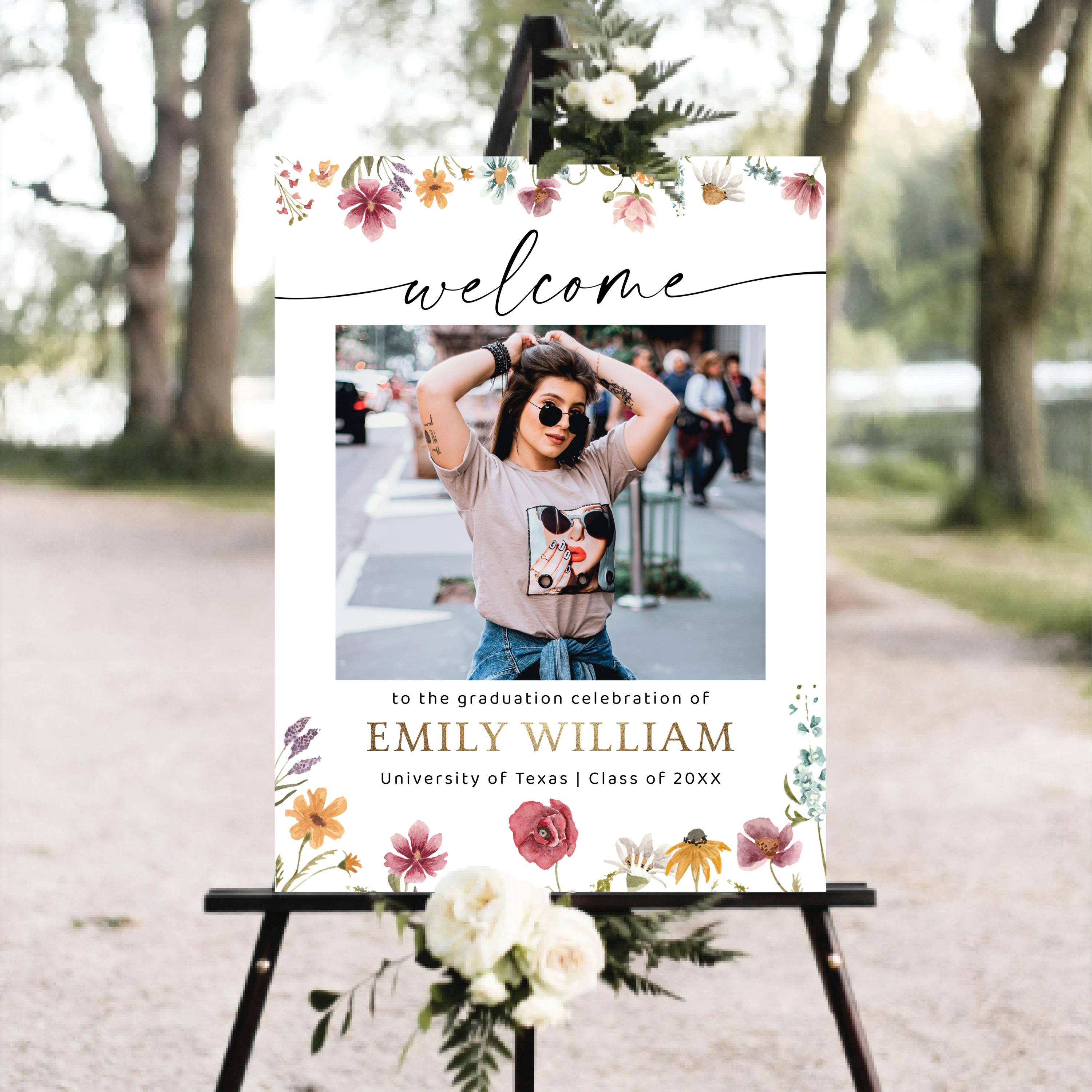 Wildflower Graduation Welcome Sign with Photo is a charming graduation welcome sign featuring a natural wildflower design paired with a personalized photo as the focal point. The soft floral details create a fresh, light, and elegant look, making it perfect for a variety of event styles. Fully customizable with your event details, this sign adds a personal touch and helps capture memorable moments from your special day.