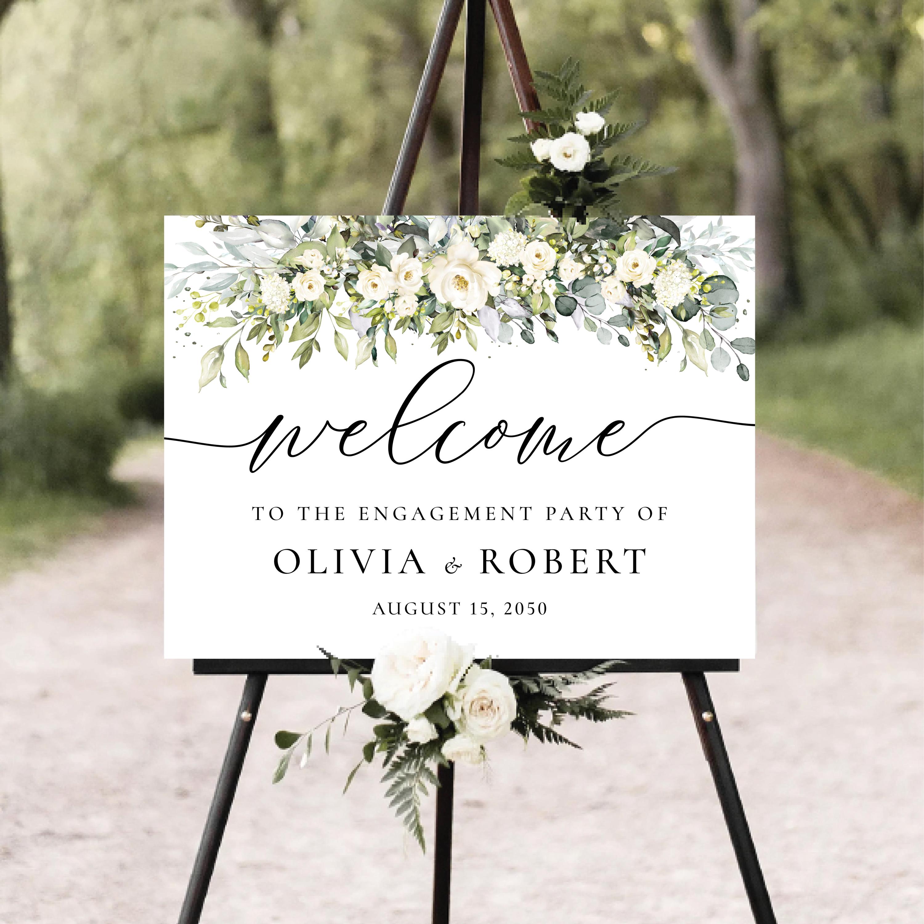 Welcome your guests with timeless elegance using this Floral Engagement Party Welcome Sign. Featuring soft white flowers and lush greenery, paired with delicate handwritten-style fonts, this design brings a natural and romantic charm to your special celebration. Fully personalized with your details, it’s the perfect way to create a warm and stylish first impression.