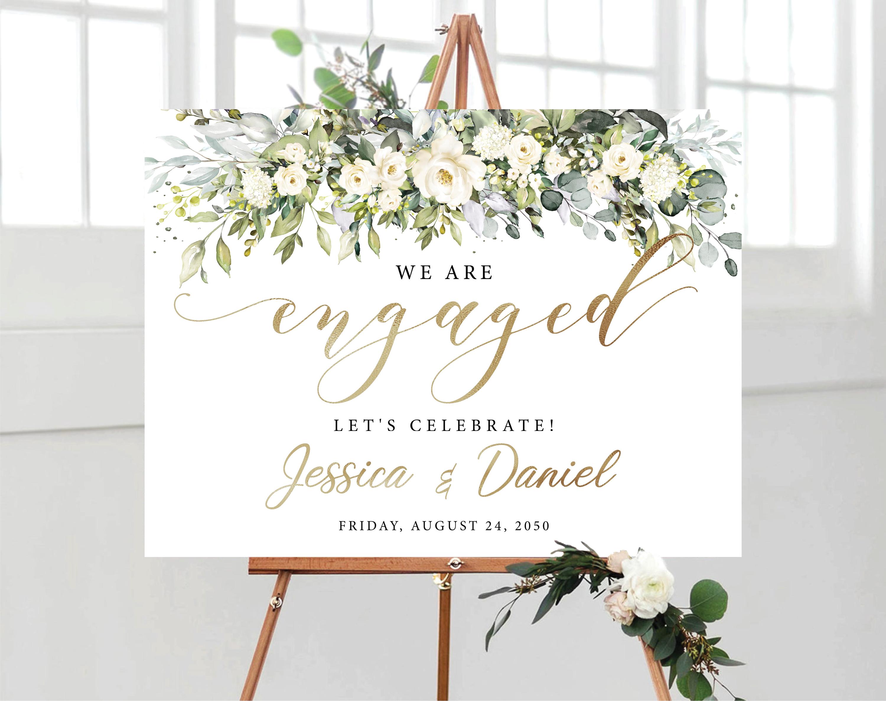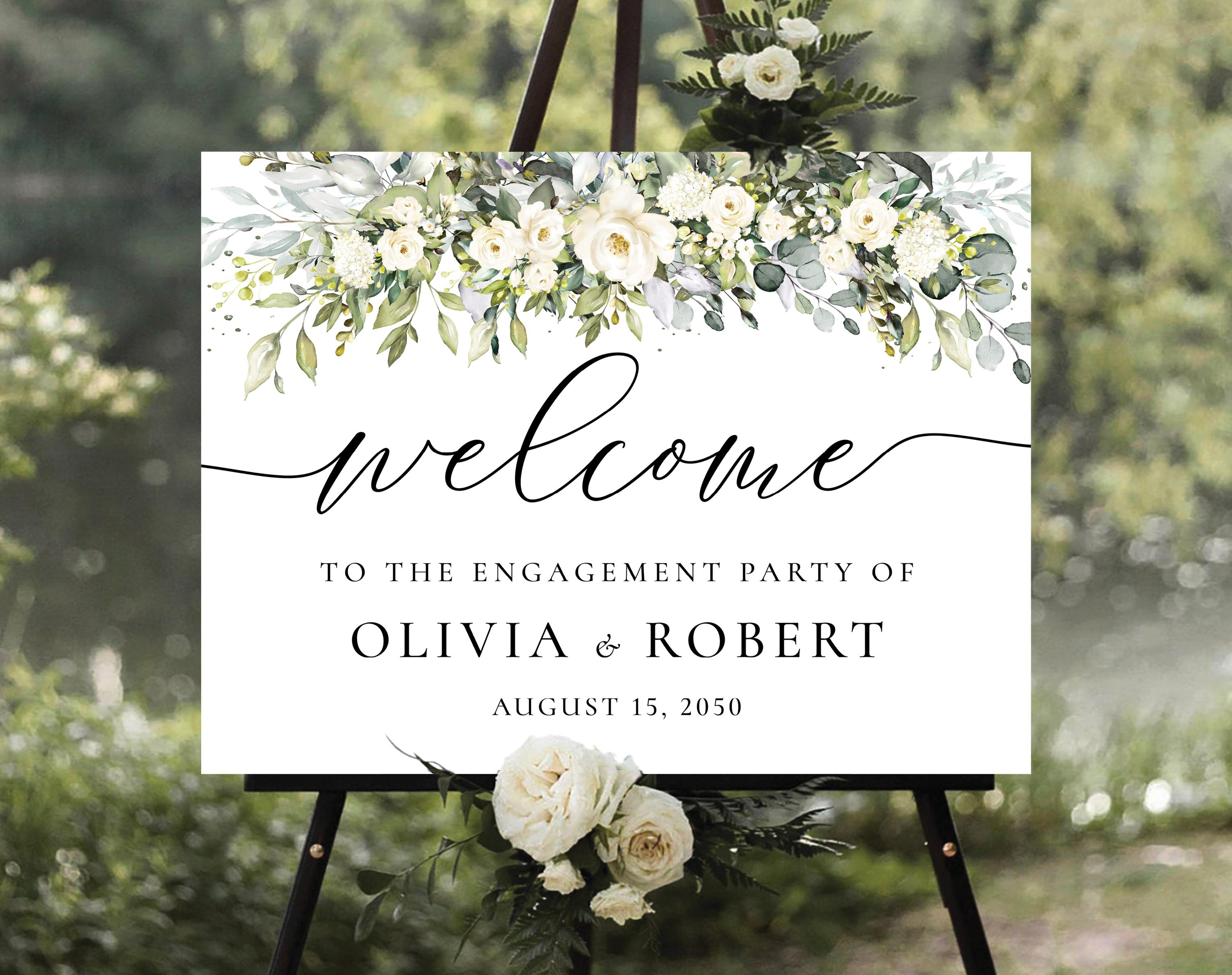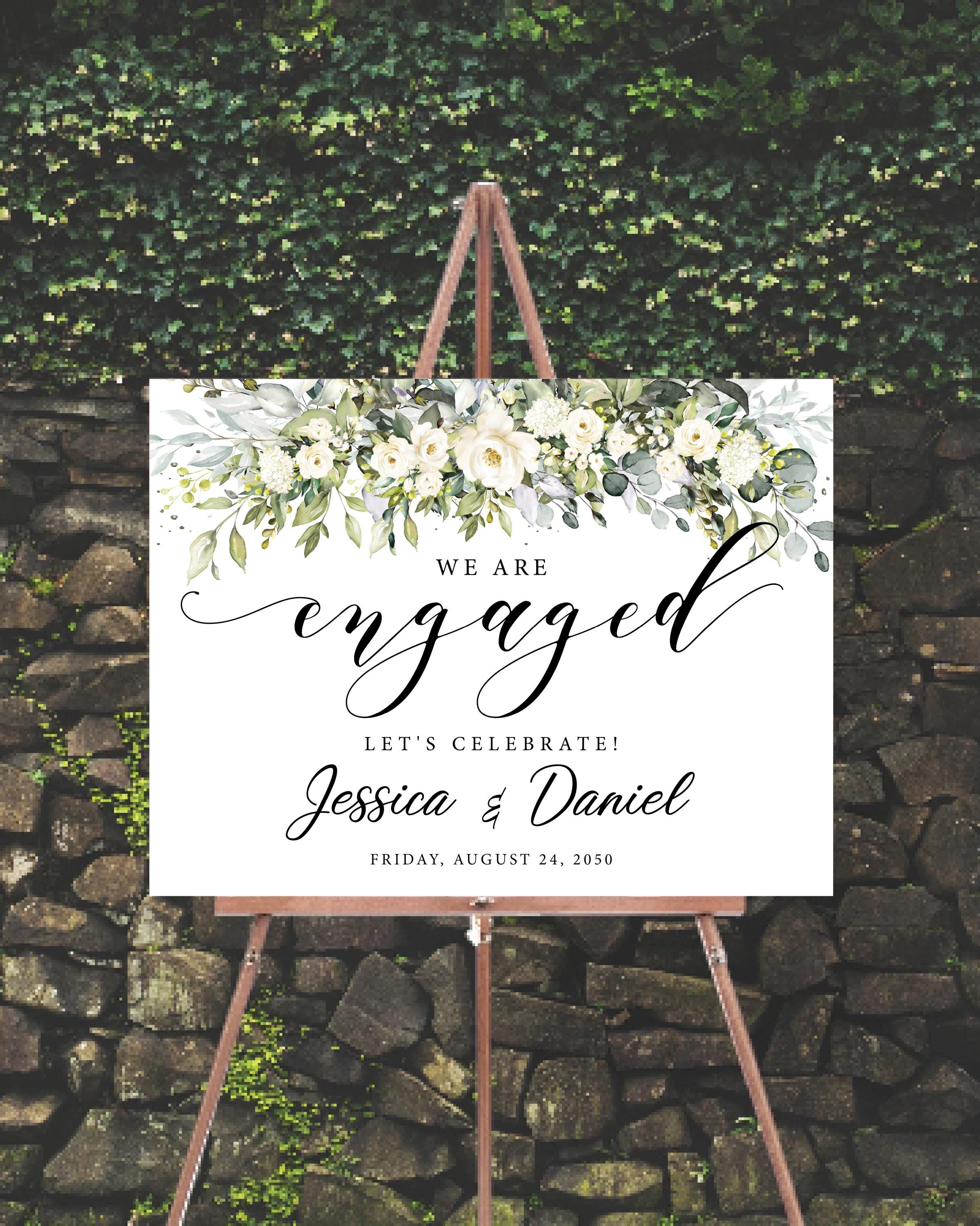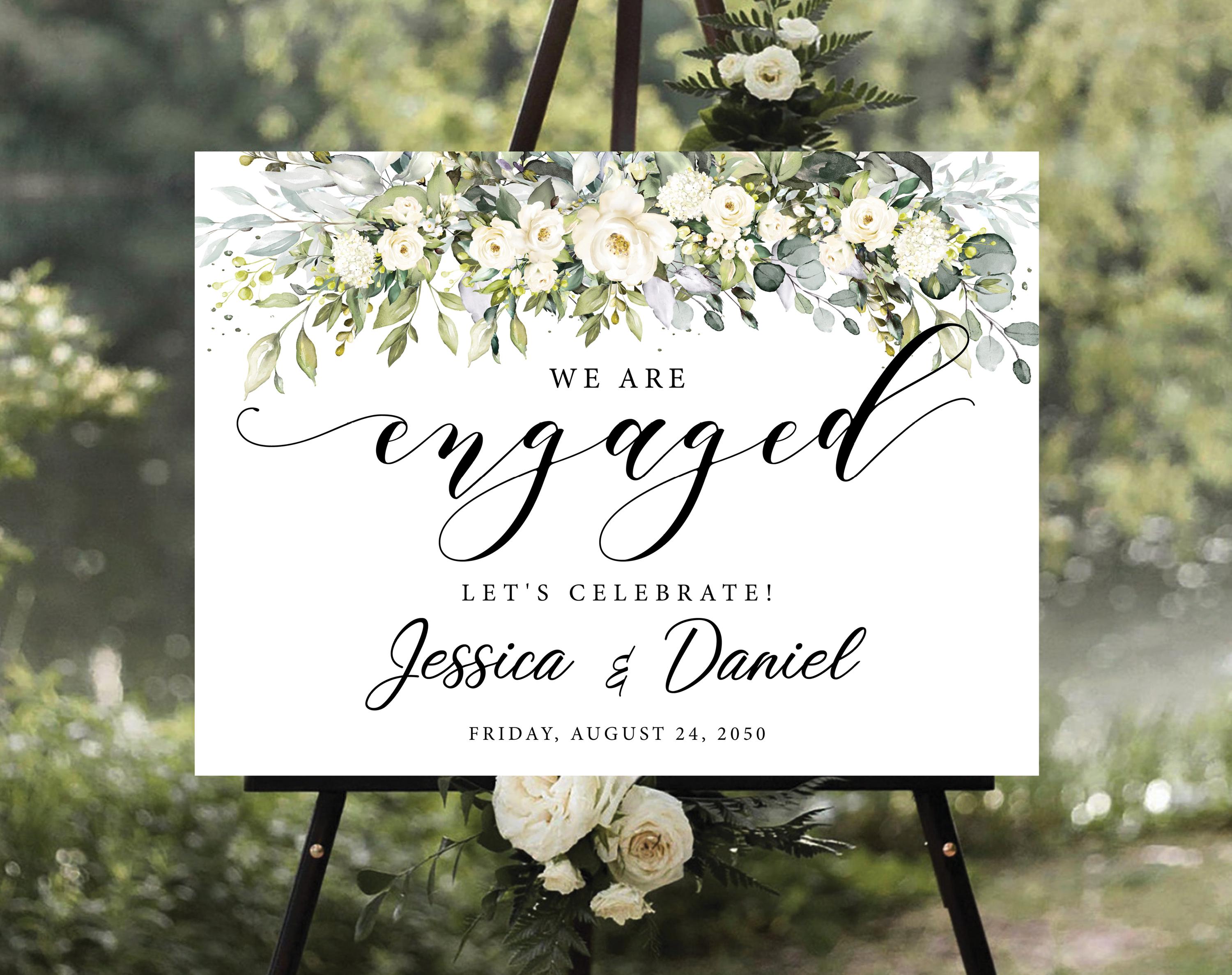 White Floral We are Engaged Welcome Sign, Greenery Engagement Party Poster (Digital Printable)