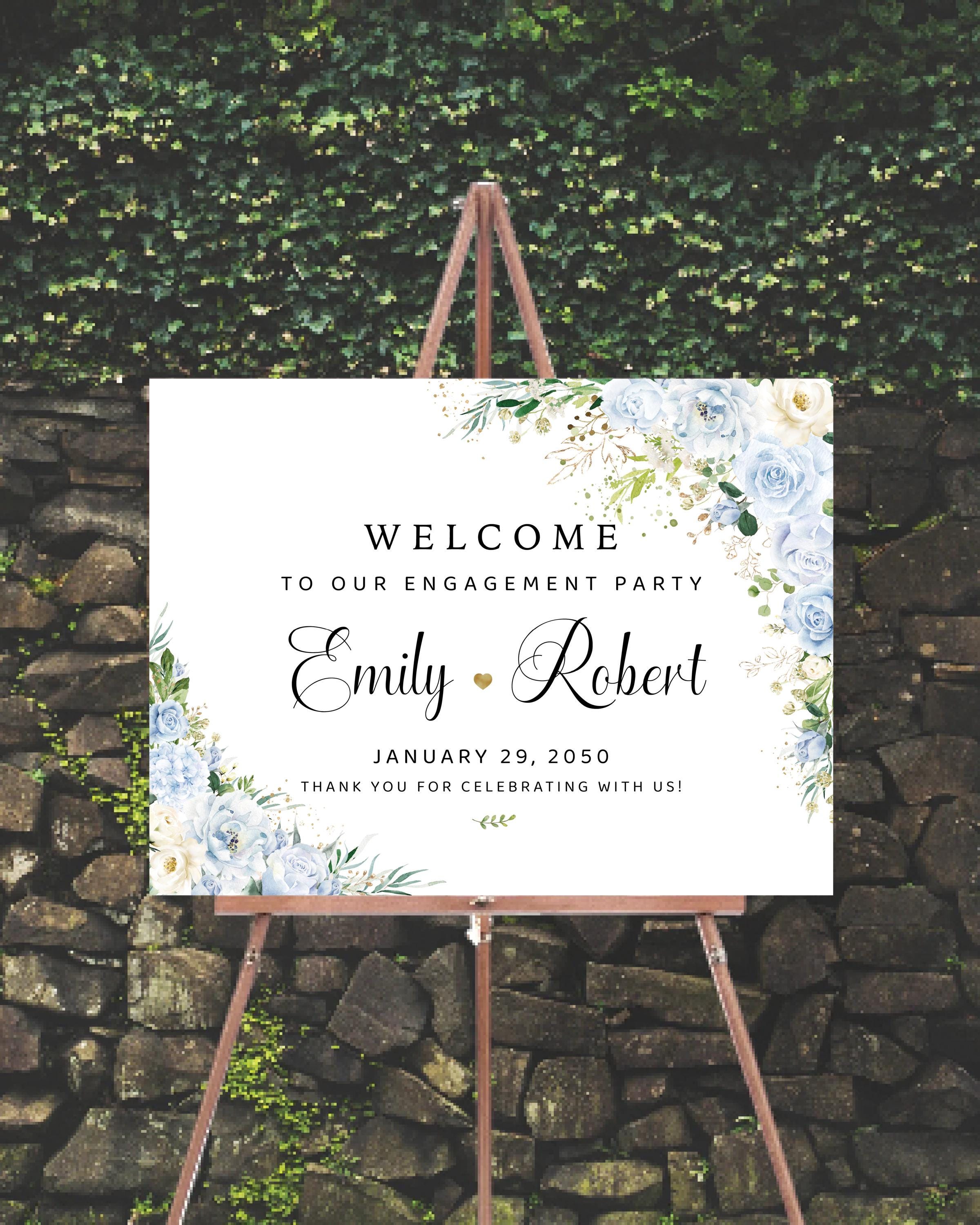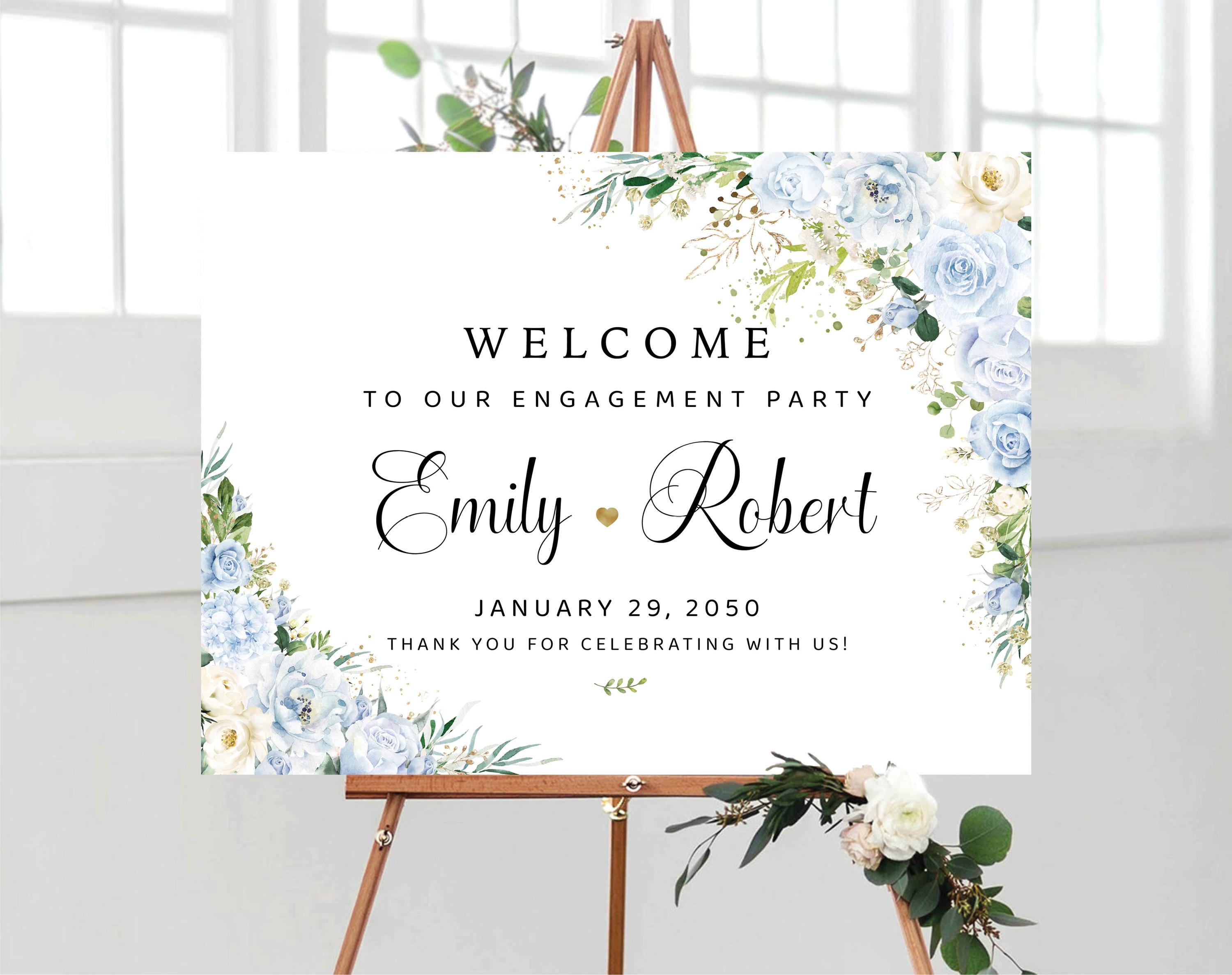 Welcome your guests with timeless elegance using this Blue Floral Engagement Party Welcome Sign. Featuring soft Light Blue flowers and lush greenery, paired with delicate handwritten-style fonts, this design brings a natural and romantic charm to your special celebration. Fully personalized with your details, it’s the perfect way to create a warm and stylish first impression.